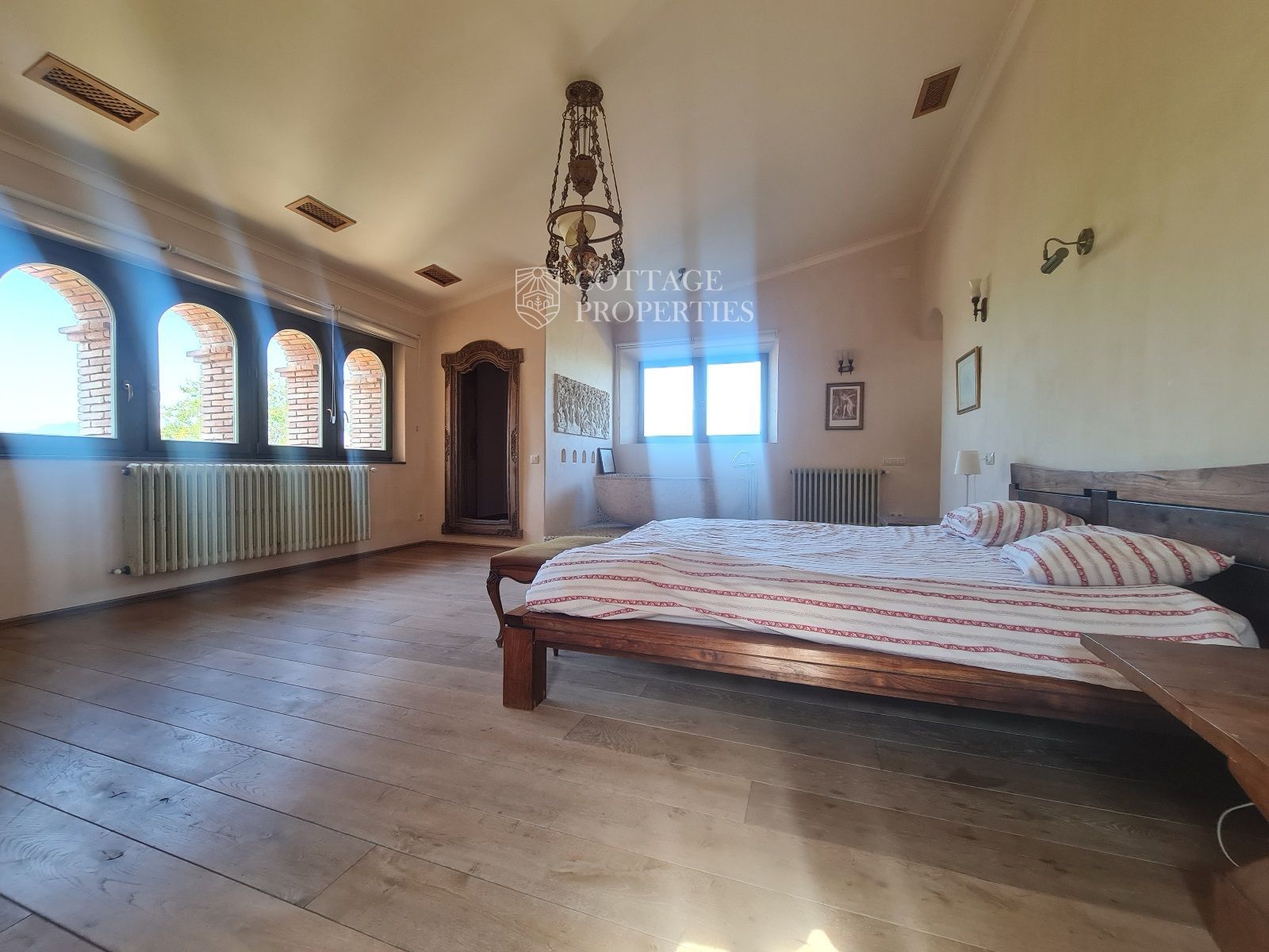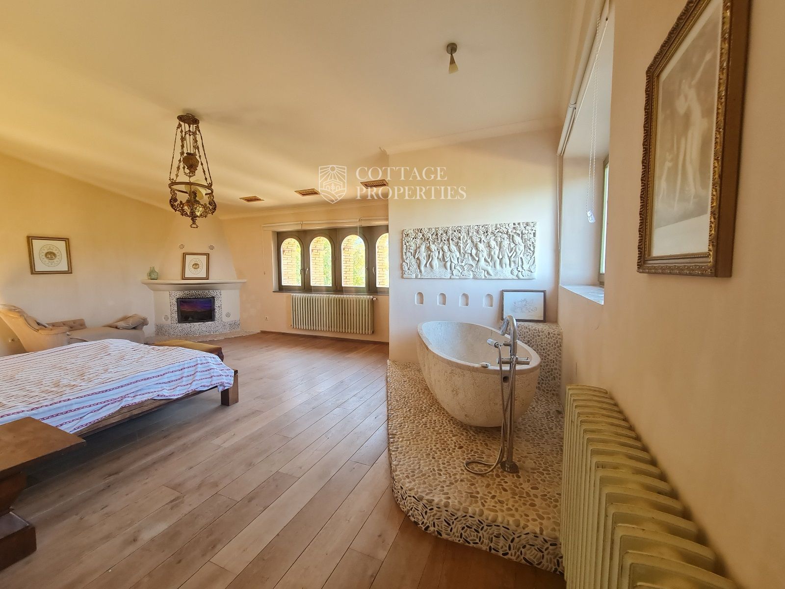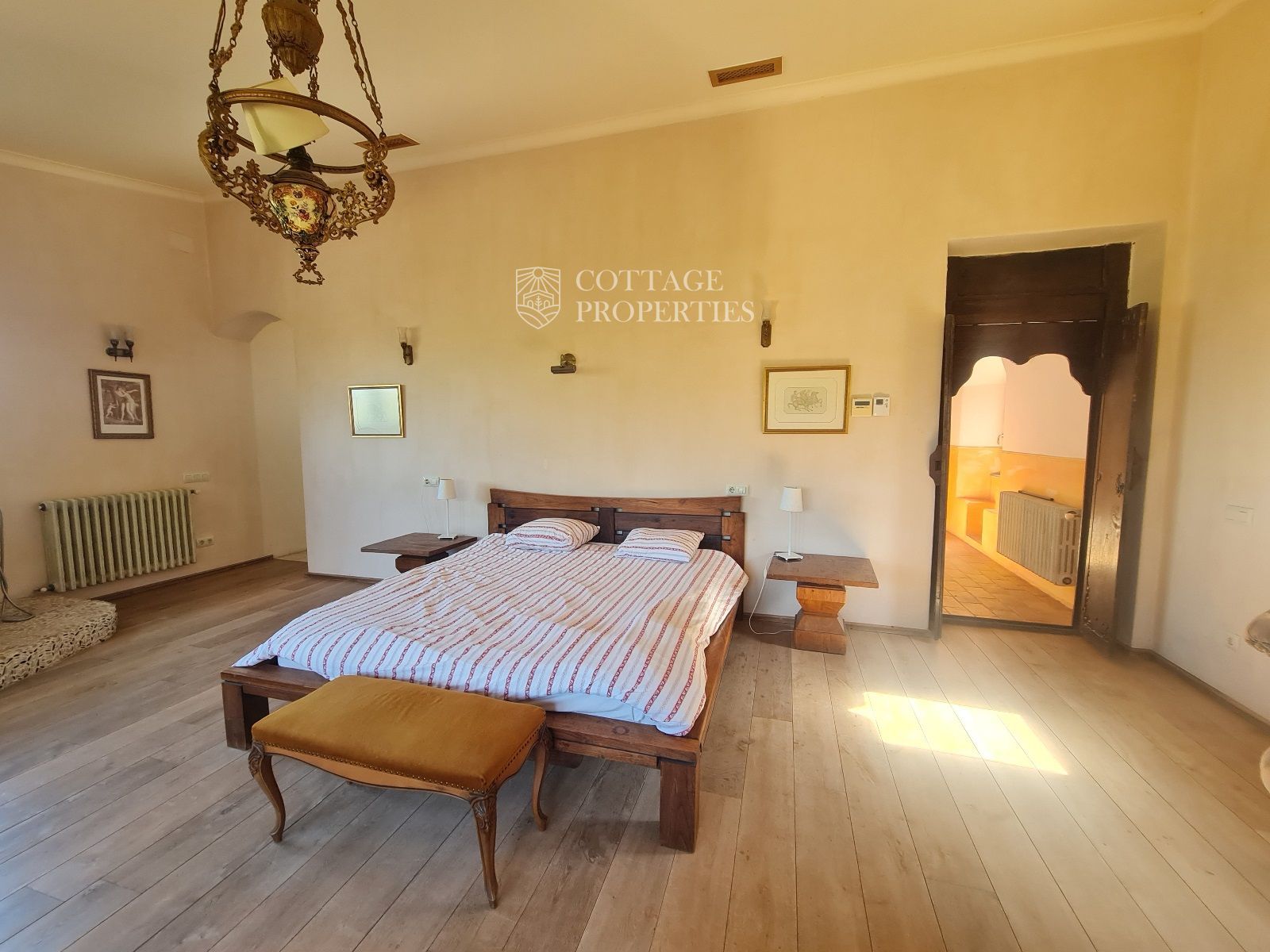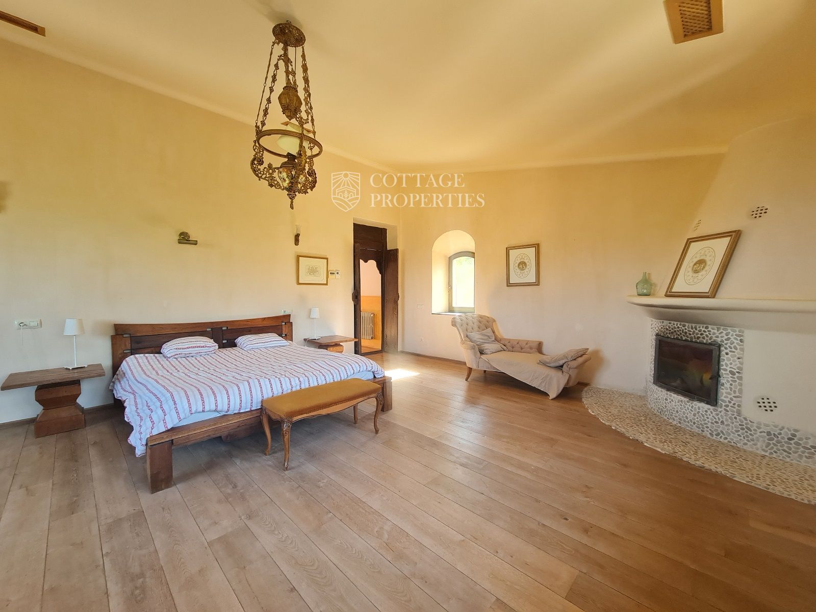 Segona Planta: Dormitori principal amb vestidor, armaris encastats, xemeneia i bany privat amb hammam i banyera de marbre. El dormitori ofereix magnífiques vistes fins als Pirineus.