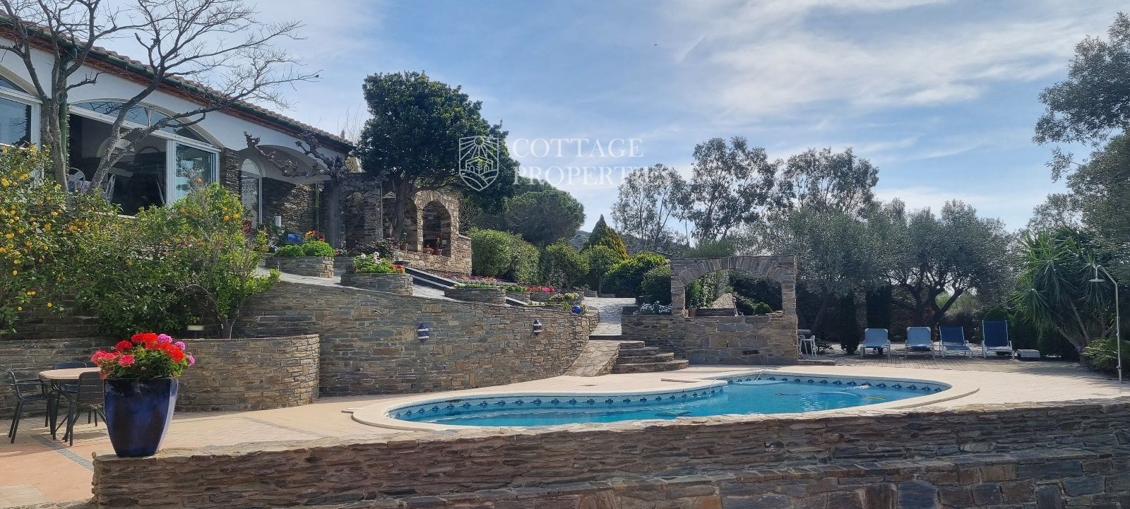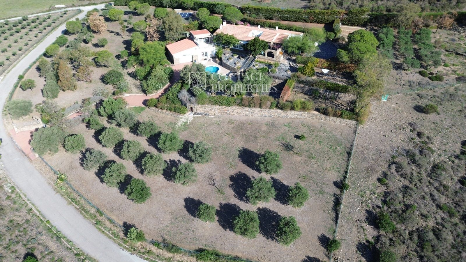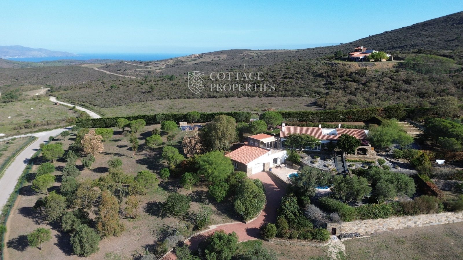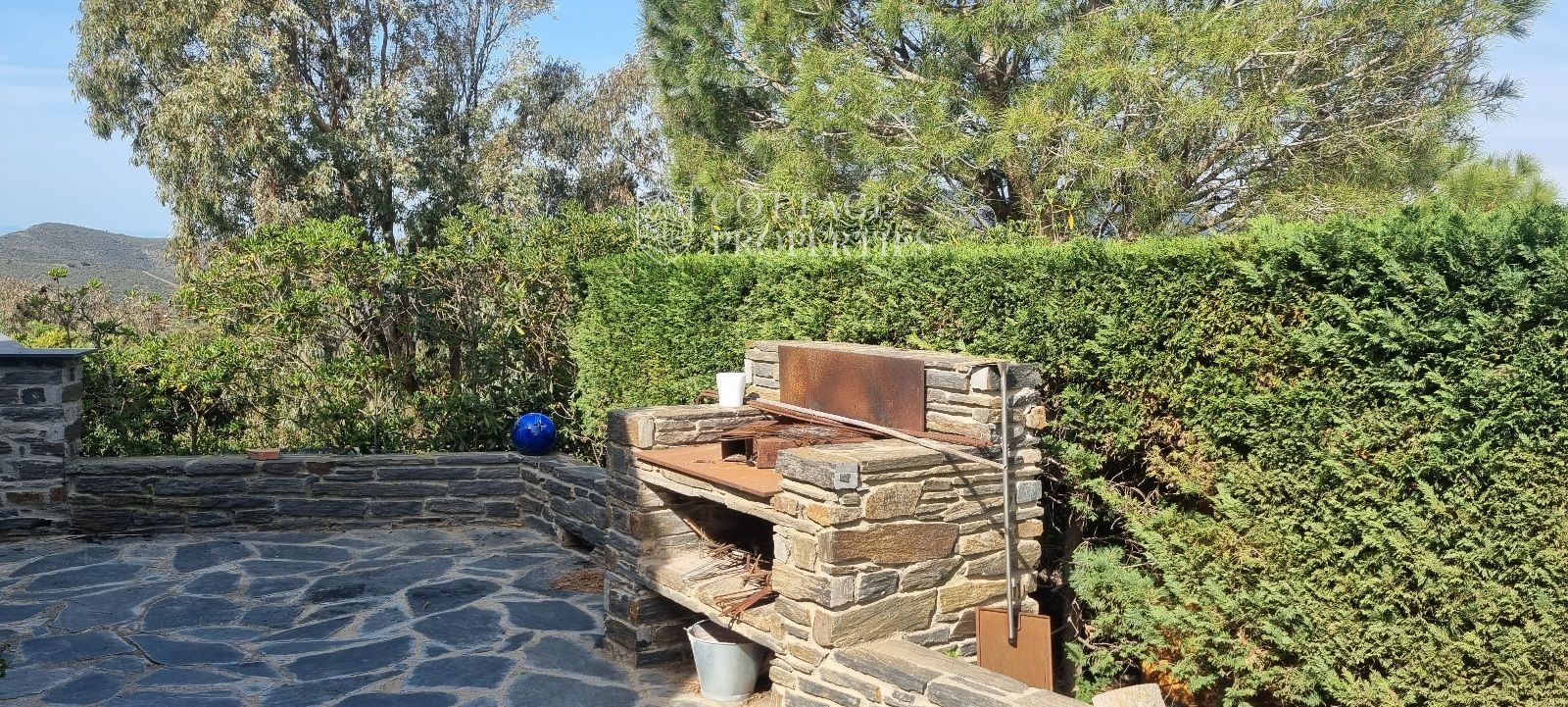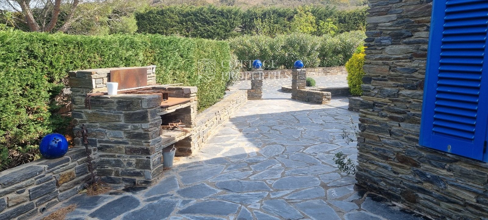 La casa es troba completament emmurallada amb murs de pedra i té dos accessos separats a través de portes automatitzades. Entre les comoditats addicionals s'inclouen una pista de petanca, un hort, un forn de pizza, una xemeneia i una piscina, tot envoltat per una parcel·la amb vegetació i vistes espectaculars.