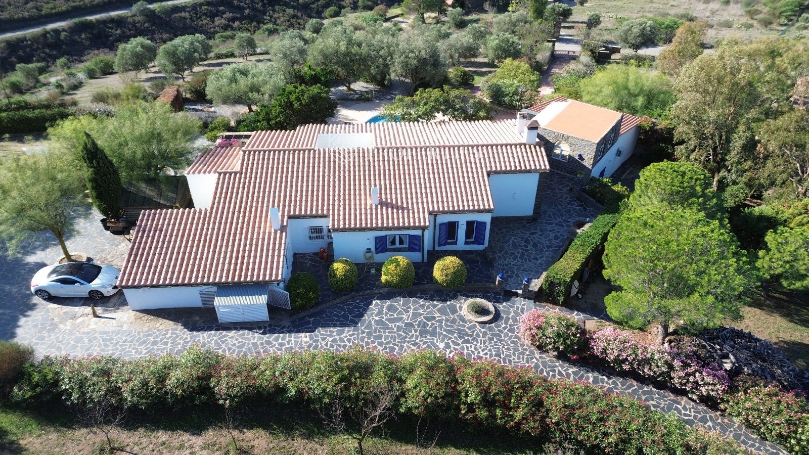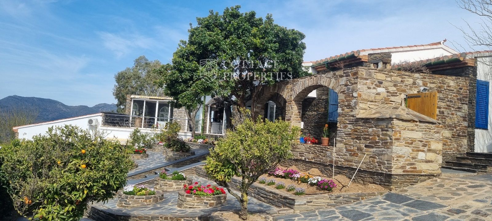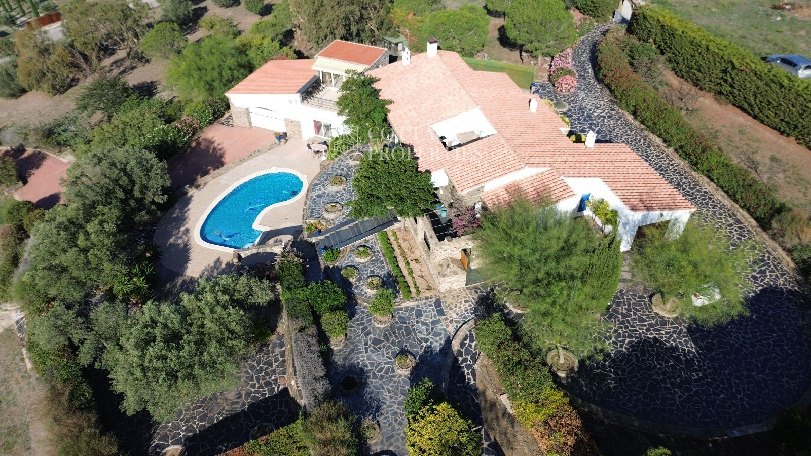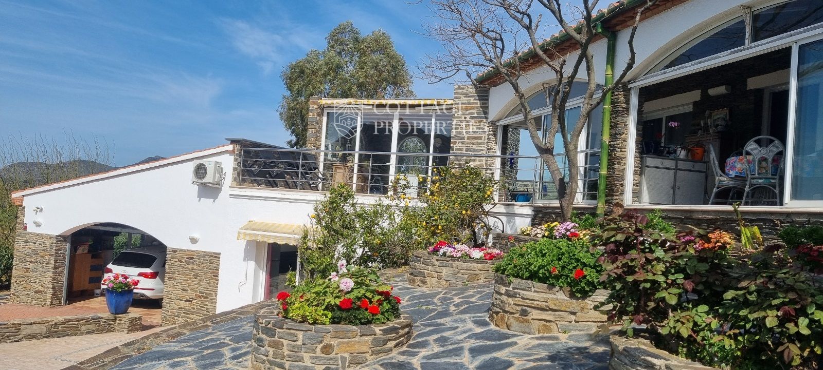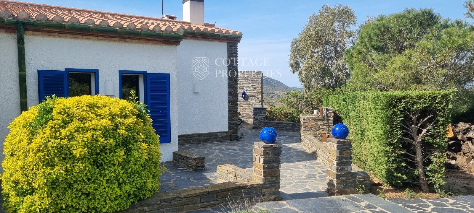 La casa es troba completament emmurallada amb murs de pedra i té dos accessos separats a través de portes automatitzades. Entre les comoditats addicionals s'inclouen una pista de petanca, un hort, un forn de pizza, una xemeneia i una piscina, tot envoltat per una parcel·la amb vegetació i vistes espectaculars.