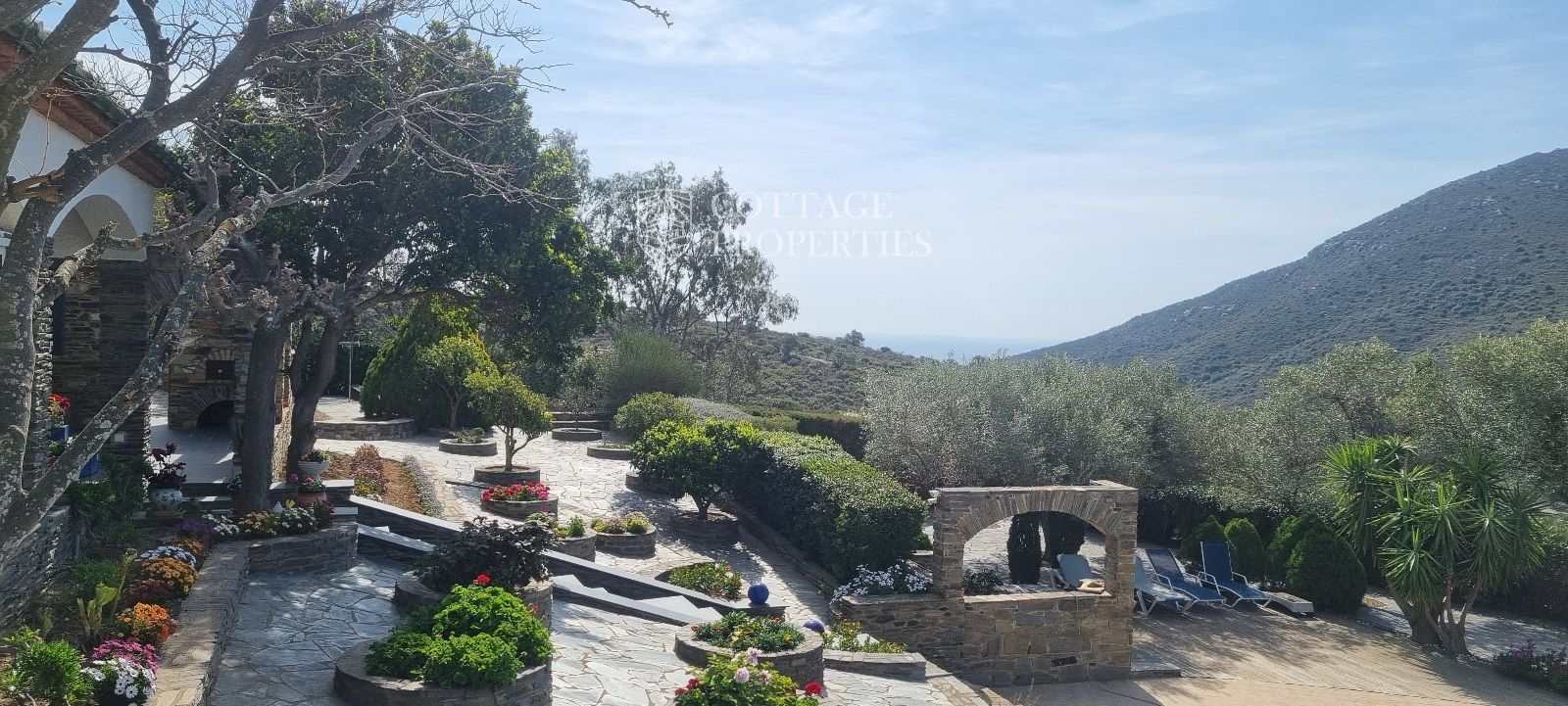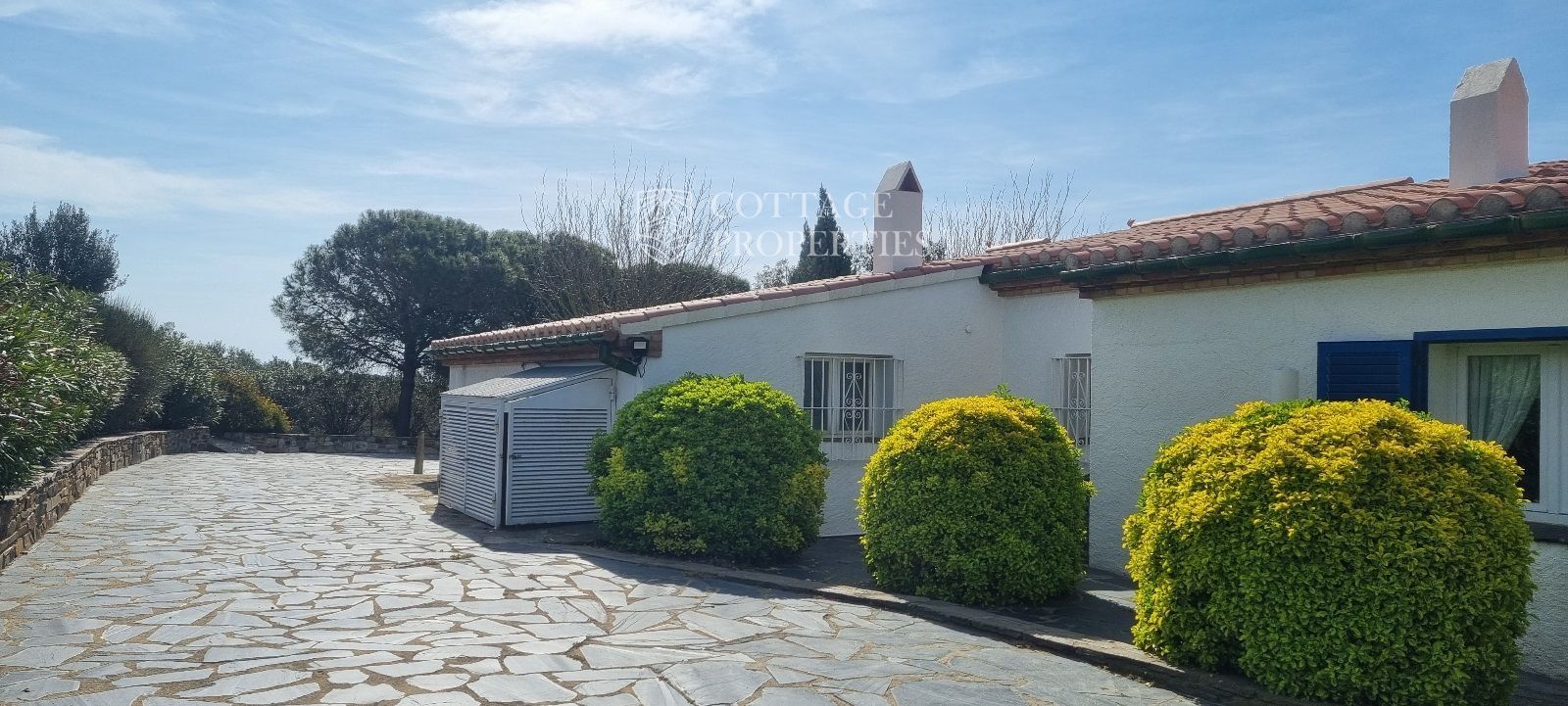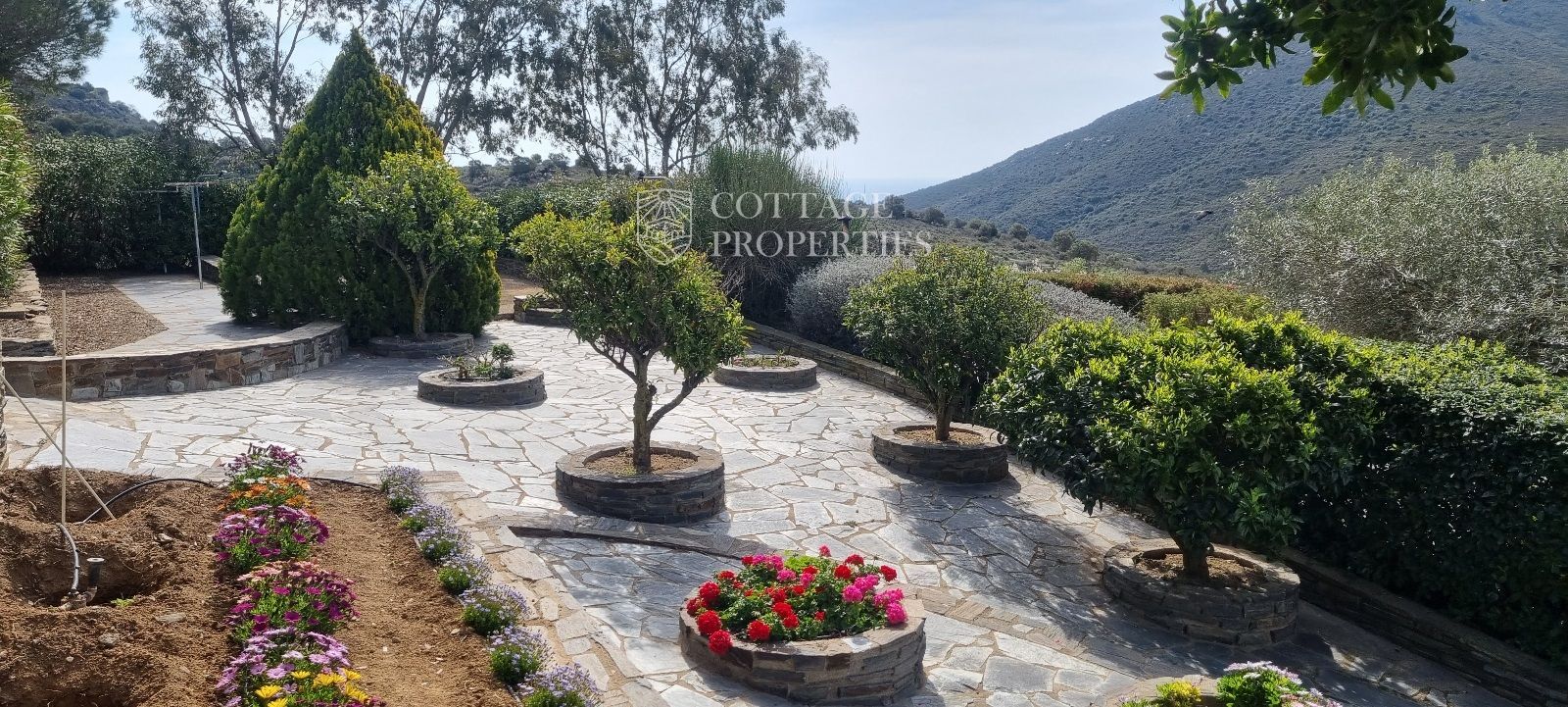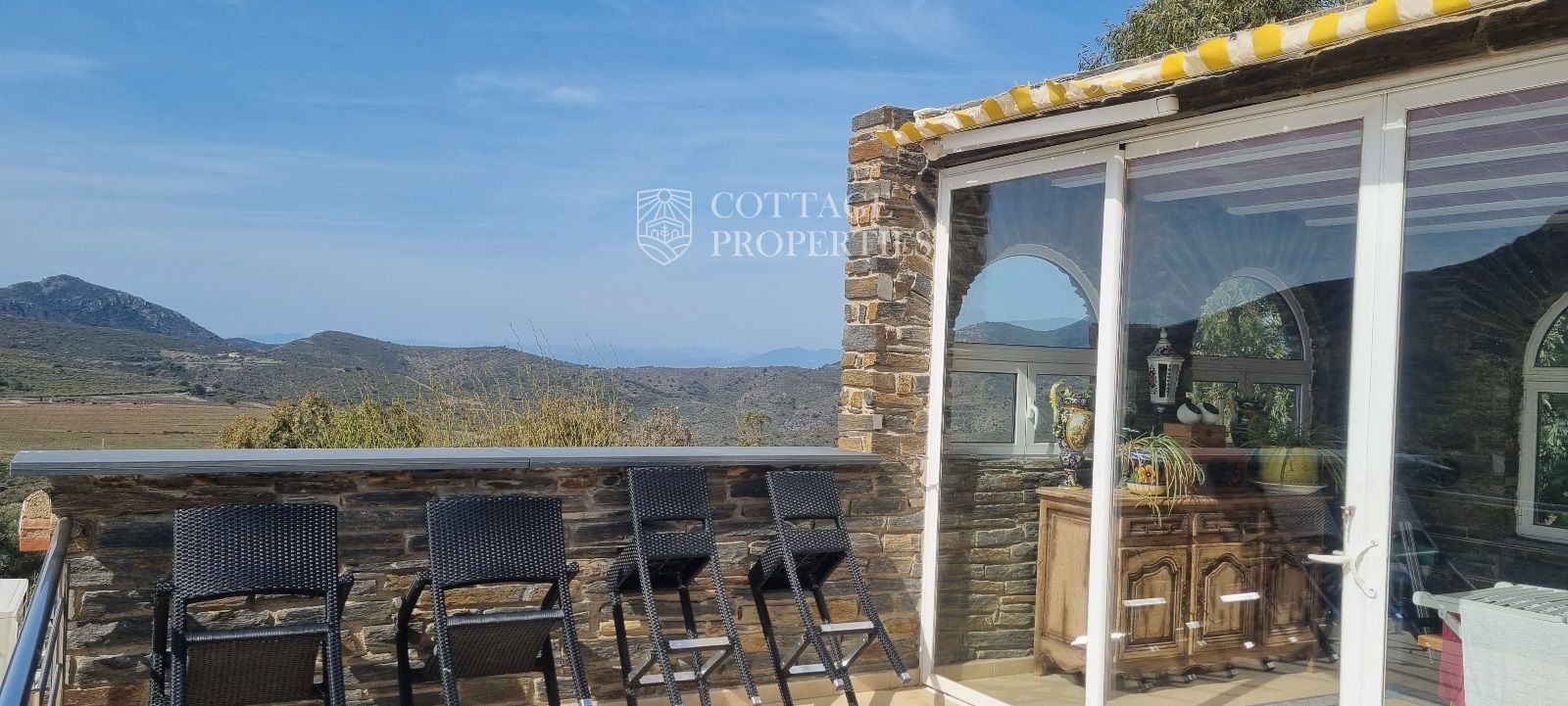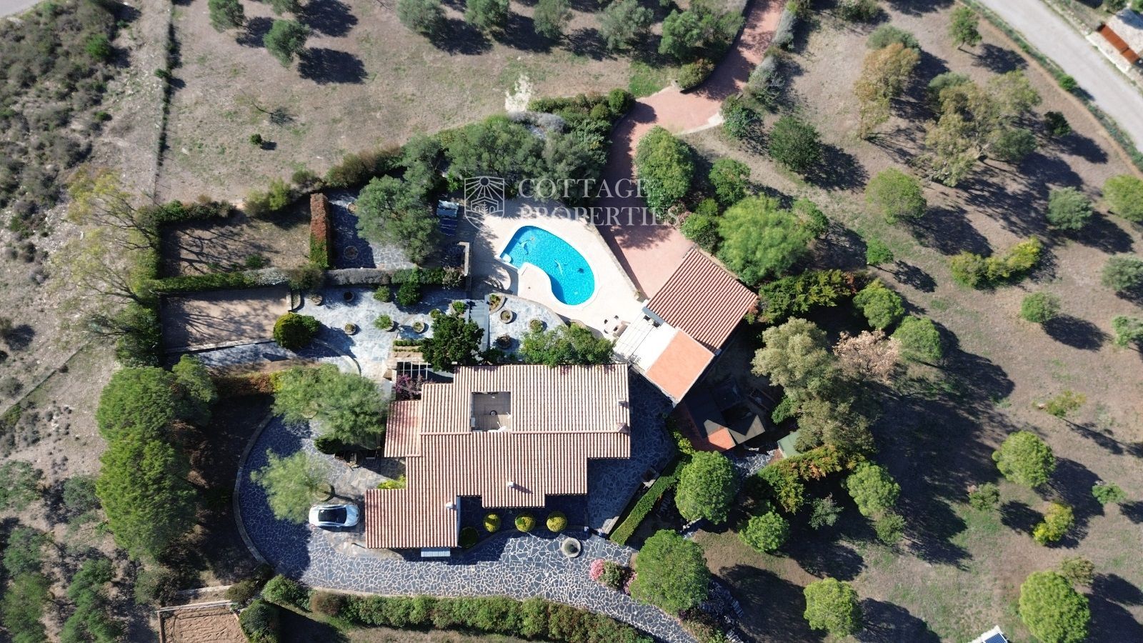 La casa es troba completament emmurallada amb murs de pedra i té dos accessos separats a través de portes automatitzades. Entre les comoditats addicionals s'inclouen una pista de petanca, un hort, un forn de pizza, una xemeneia i una piscina, tot envoltat per una parcel·la amb vegetació i vistes espectaculars.