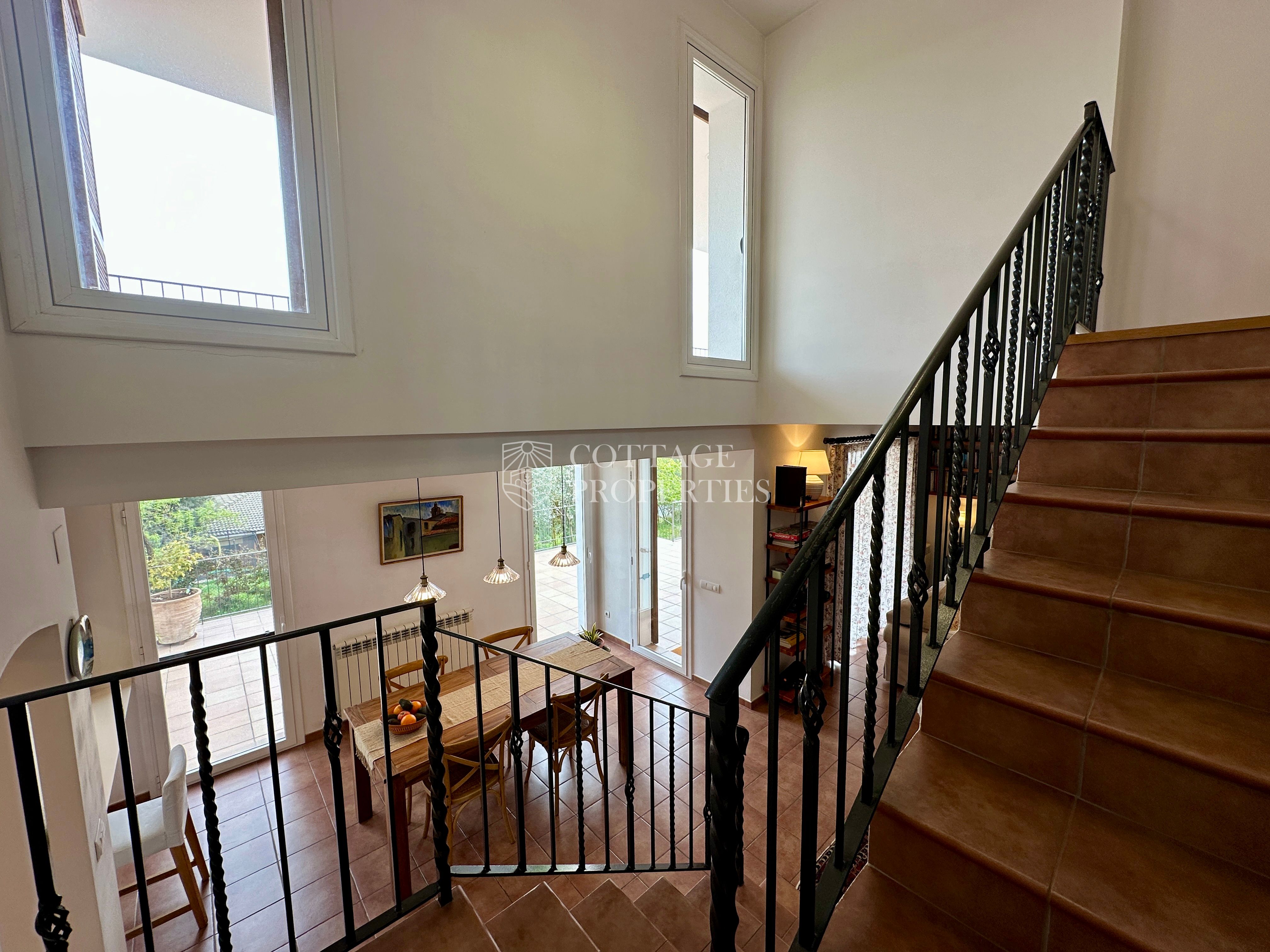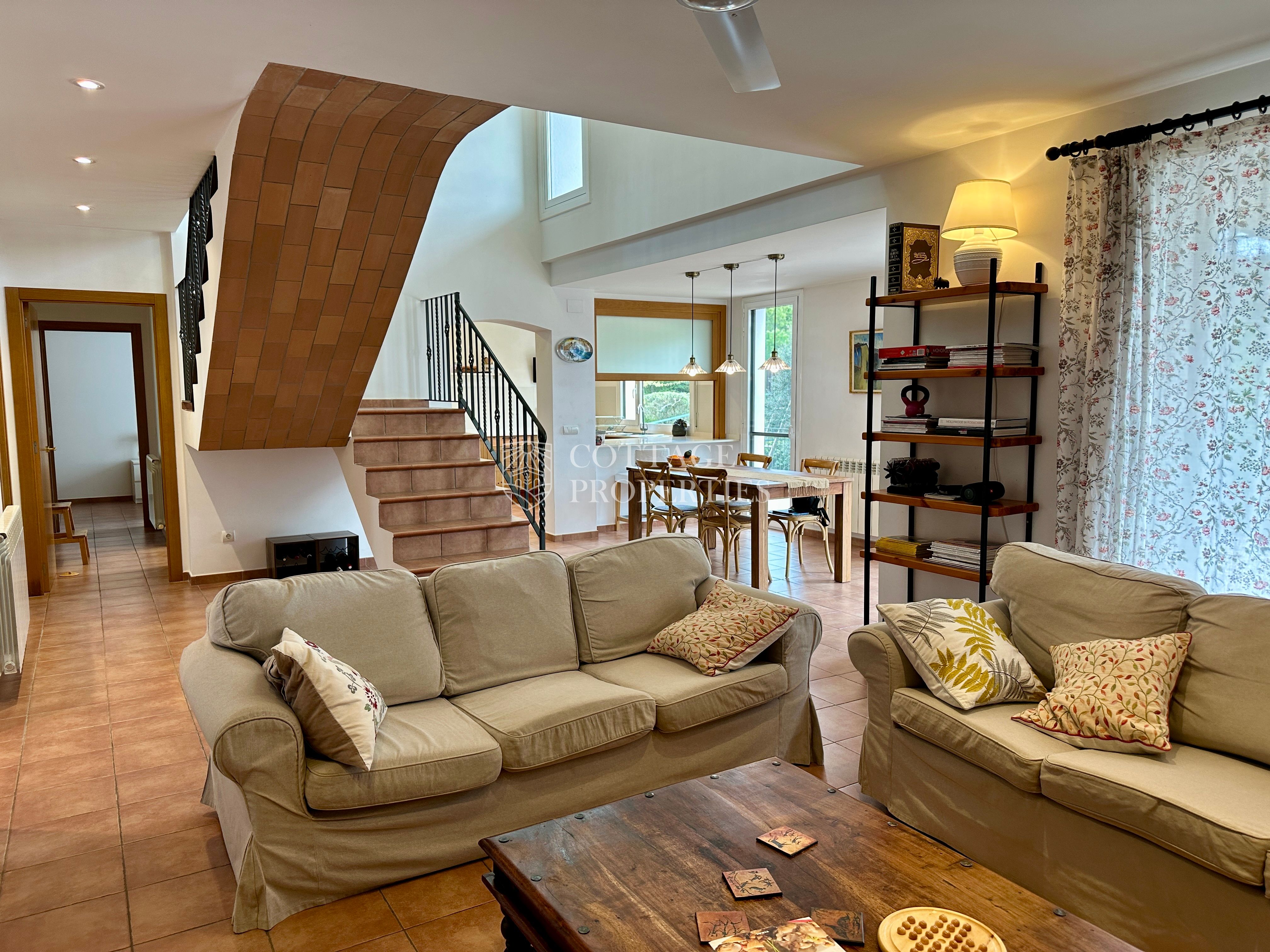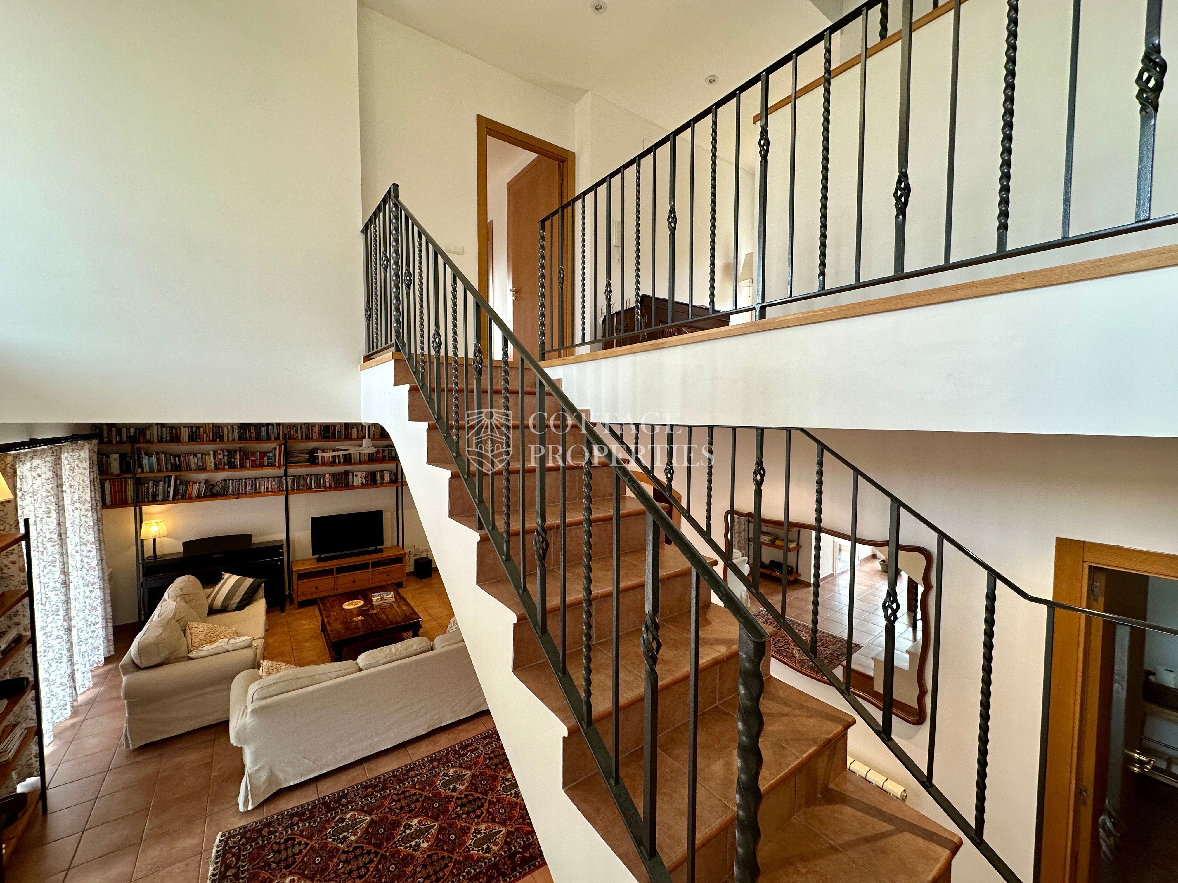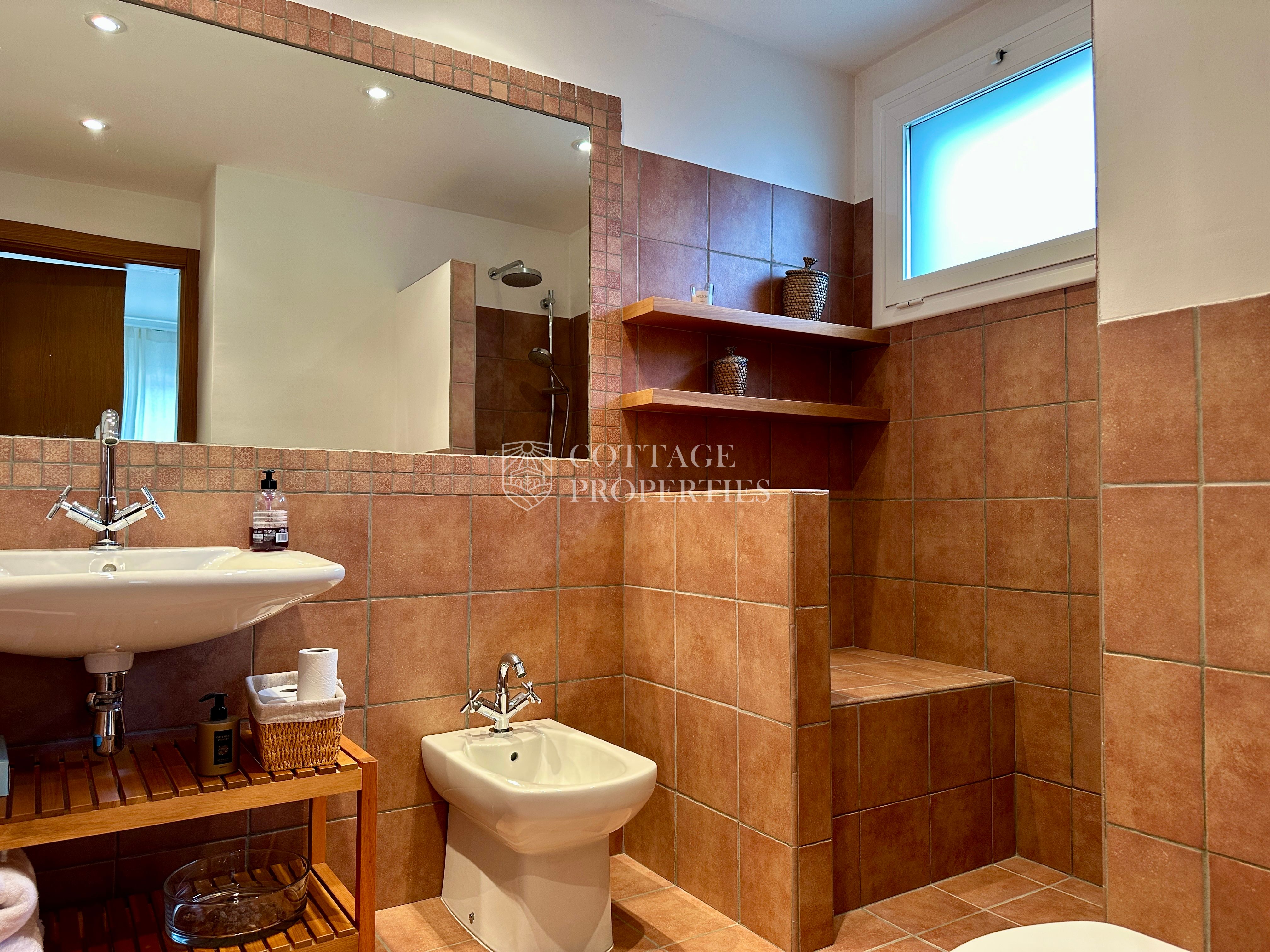 La propietat disposa de 5 dormitoris, incloent una suite principal, i un total de 4 banys complets i 3 lavabos, garantint comoditat per a tota la família i visitants. Des de les principals estances s’accedeix a diferents terrasses que ofereixen agradables vistes i espais exteriors per al descans. La planta superior afegeix versatilitat amb espais addicionals i accés a zones elevades amb vistes obertes.