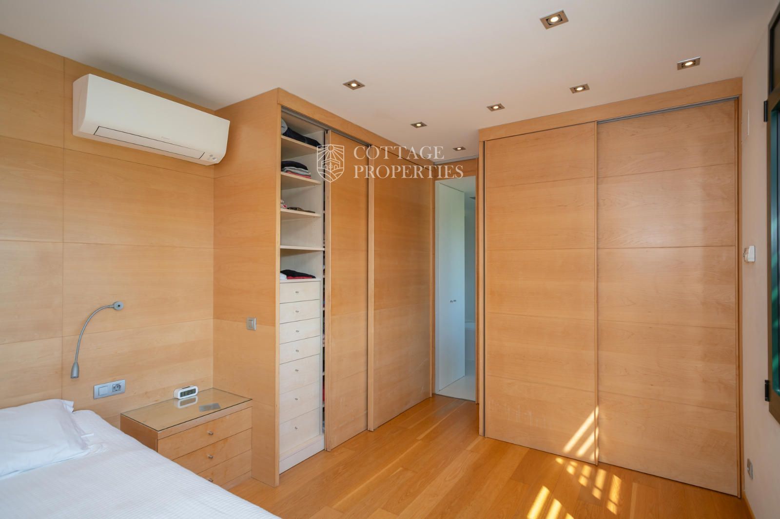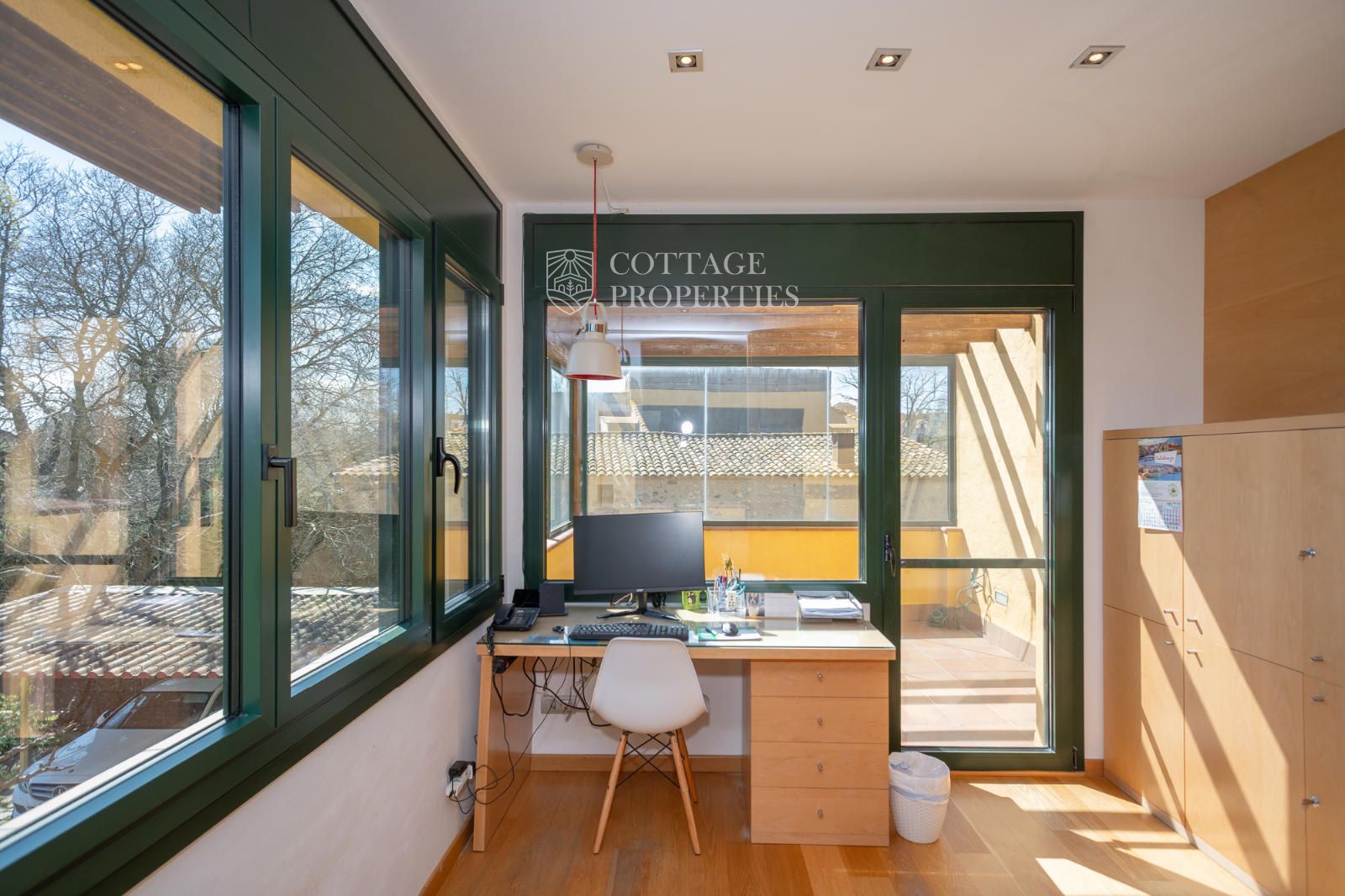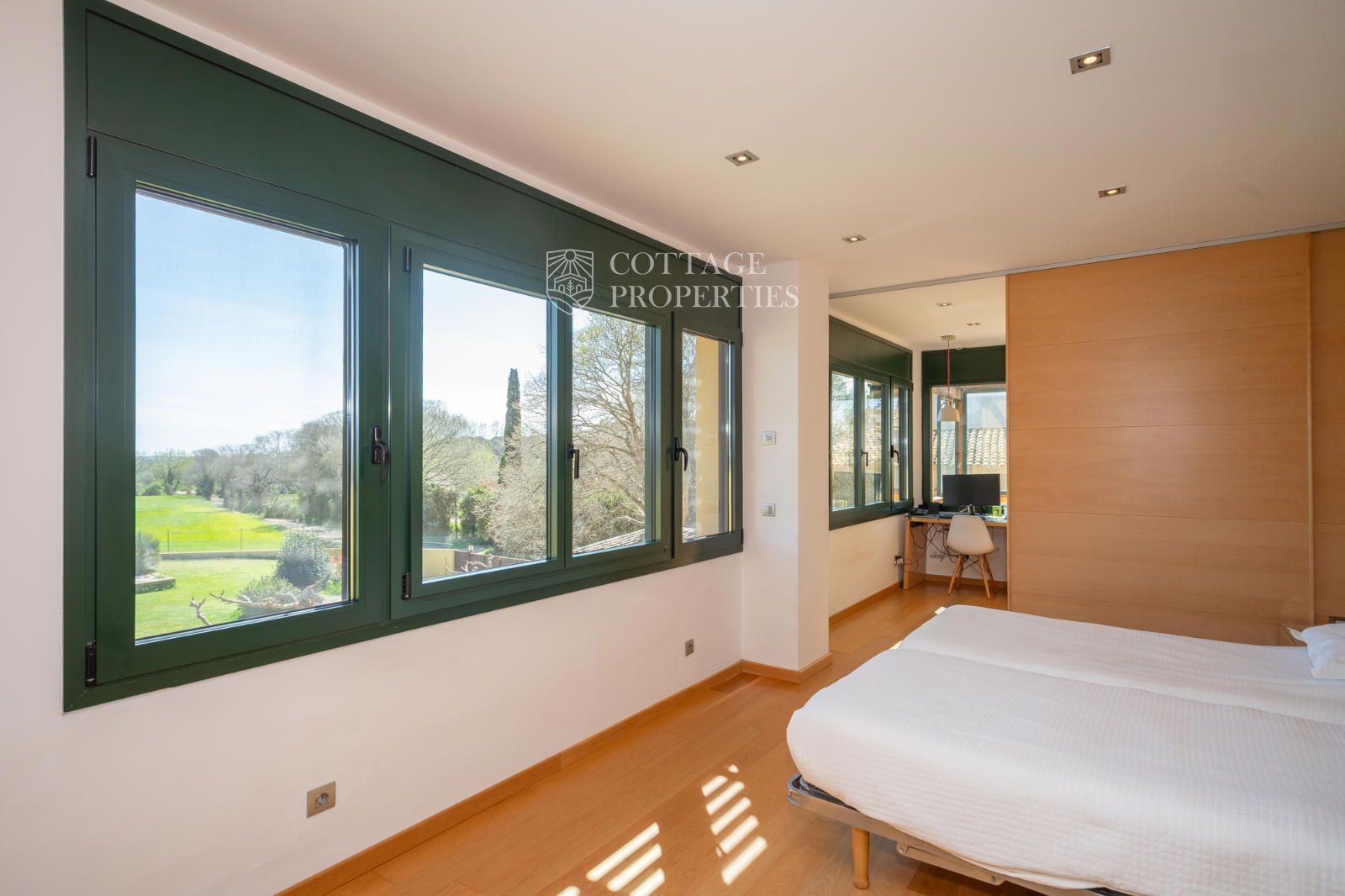 L'habitatge s'organitza al voltant d'un ampli rebedor amb escala de fusta i ascensor. A la planta baixa trobem una lluminosa zona de dia que integra saló, menjador i cuina de concepte obert, tot amb sortida directa al jardí i a la piscina coberta, que permet gaudir-la durant tot l'any. També hi ha un despatx privat ideal per teletreballar. La planta superior està destinada al descans, amb dues habitacions dobles que comparteixen una terrassa amb vistes, un bany complet i una zona de bugaderia. La suite principal disposa de terrassa privada i bany propi amb vistes espectaculars. A més, la casa compta amb un apartament de convidats independent amb saló, cuina, habitació doble i bany.