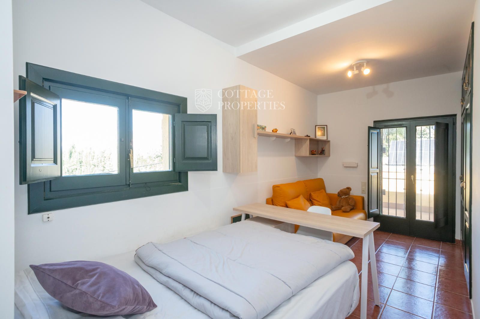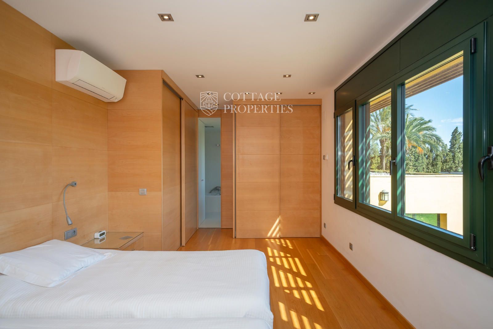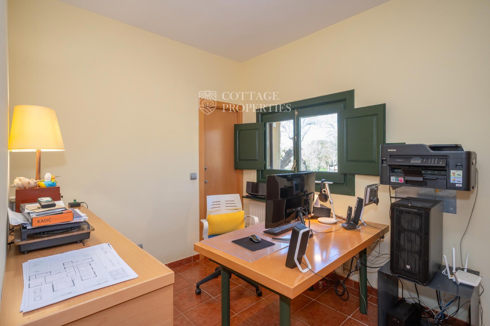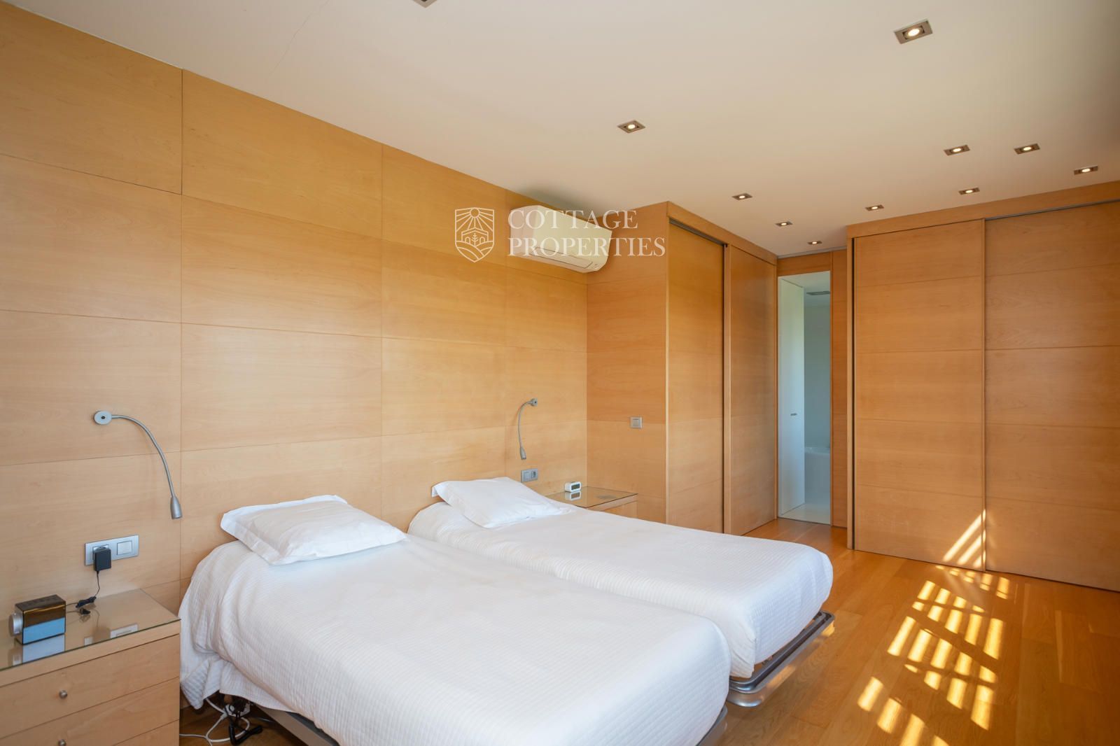 L'habitatge s'organitza al voltant d'un ampli rebedor amb escala de fusta i ascensor. A la planta baixa trobem una lluminosa zona de dia que integra saló, menjador i cuina de concepte obert, tot amb sortida directa al jardí i a la piscina coberta, que permet gaudir-la durant tot l'any. També hi ha un despatx privat ideal per teletreballar. La planta superior està destinada al descans, amb dues habitacions dobles que comparteixen una terrassa amb vistes, un bany complet i una zona de bugaderia. La suite principal disposa de terrassa privada i bany propi amb vistes espectaculars. A més, la casa compta amb un apartament de convidats independent amb saló, cuina, habitació doble i bany.