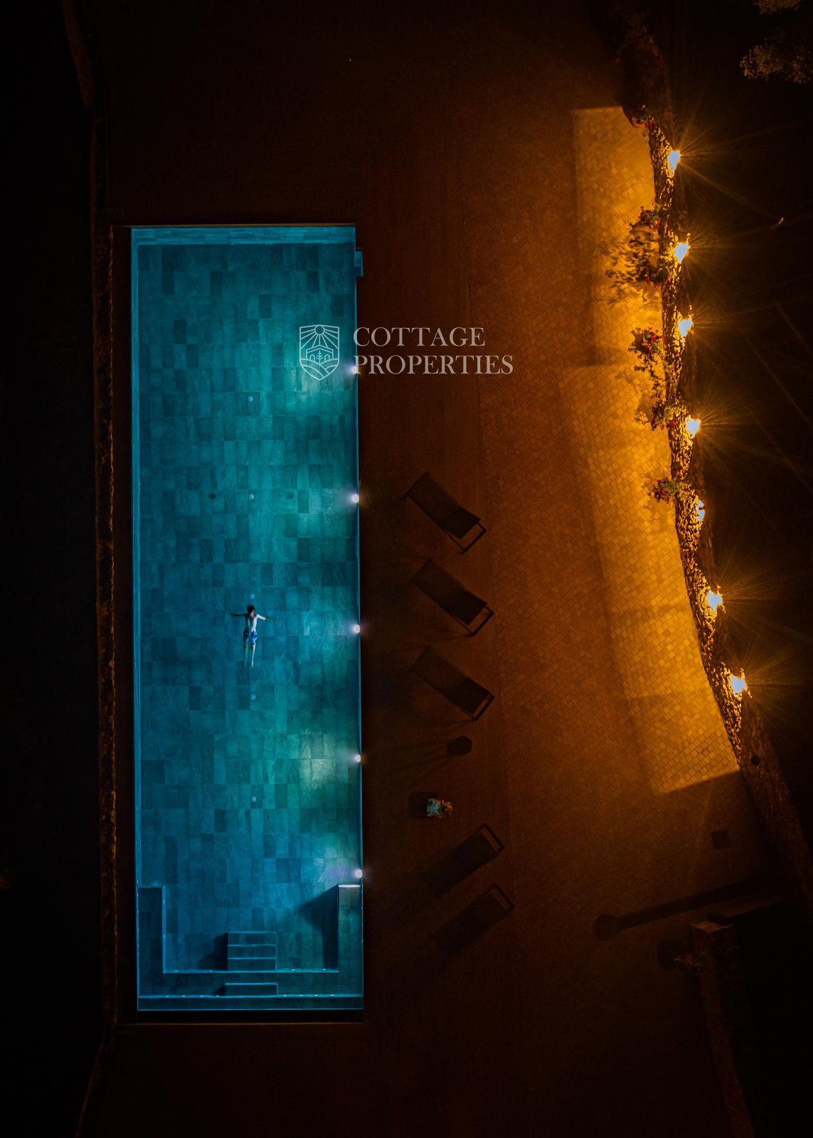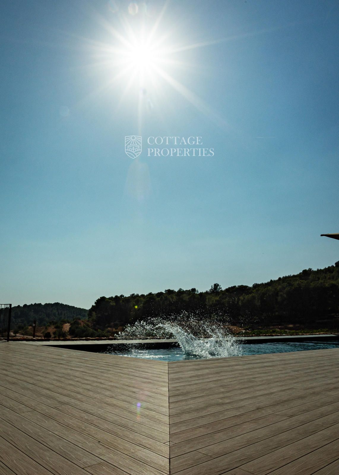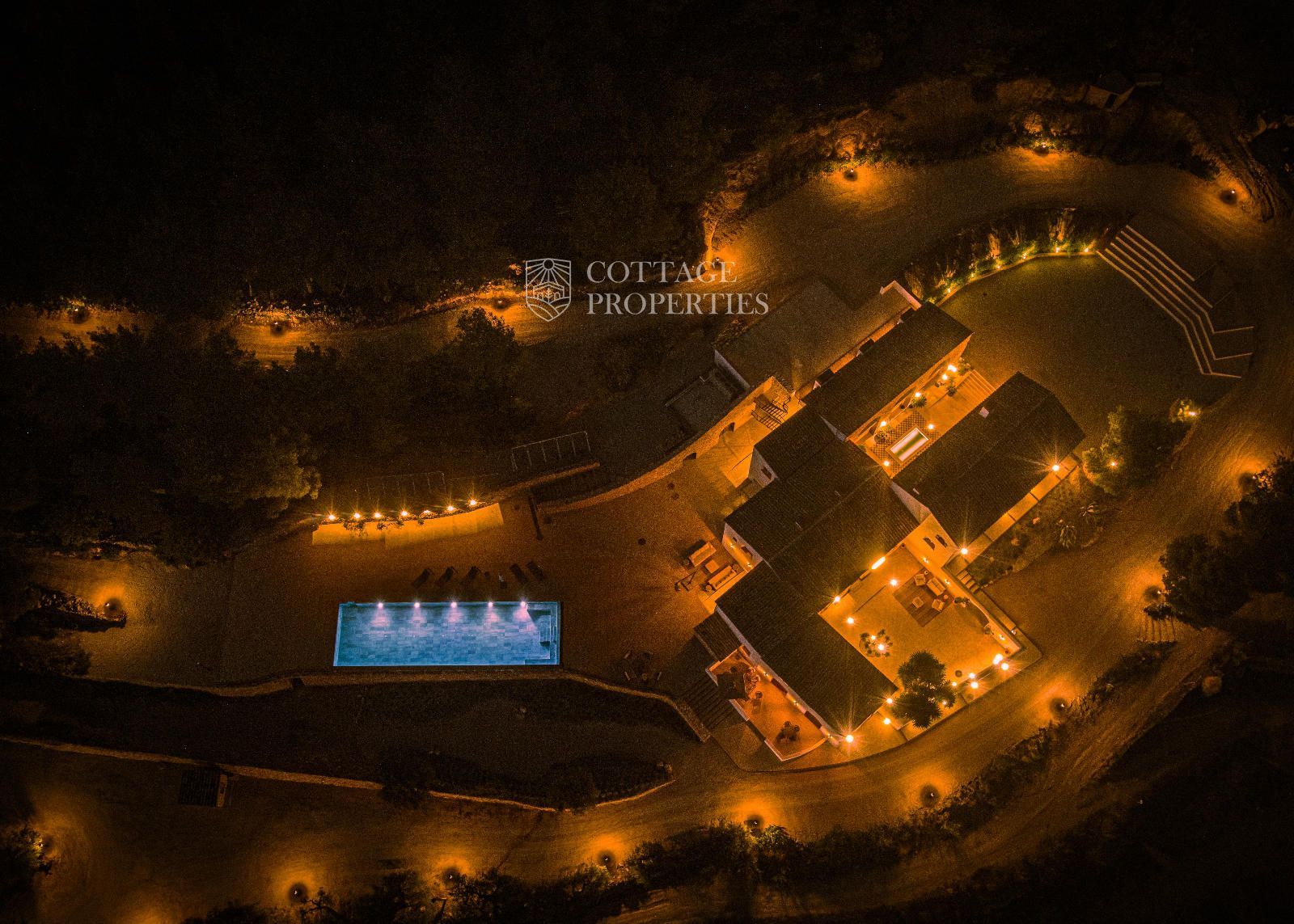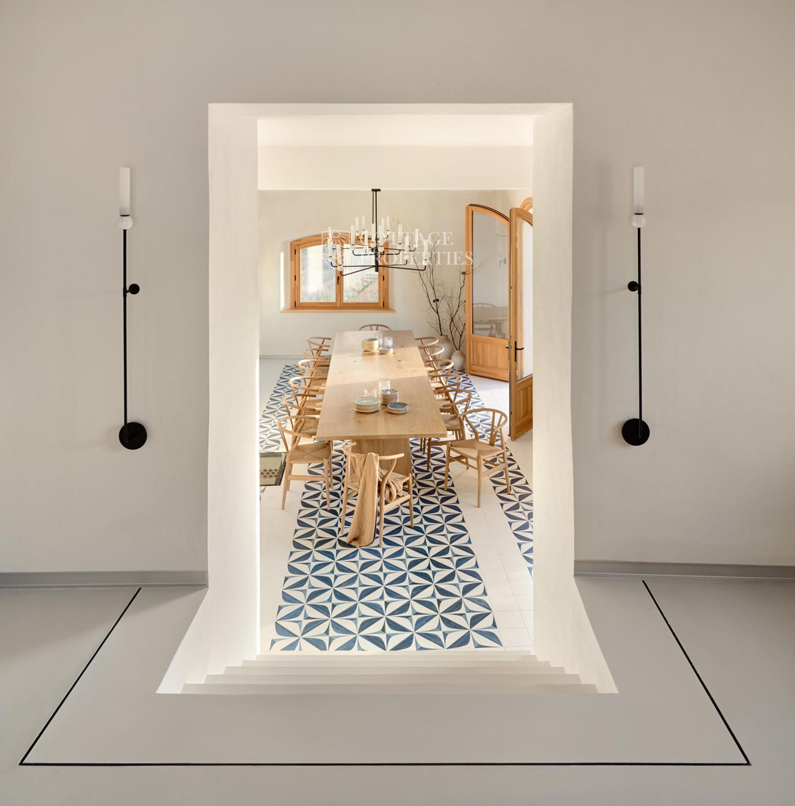 La propietat compta amb 7 suites dobles, 18 banys, ascensor, cuina industrial totalment equipada, un amfiteatre de 300 m² per a esdeveniments i garatge cobert. A la planta principal hi ha les zones comunes, incloent-hi un ampli saló-menjador amb accés directe a la terrassa principal i la zona de piscina, dissenyada amb cura per acollir celebracions a l'aire lliure. Cada espai ha estat pensat per oferir confort, elegància i funcionalitat.