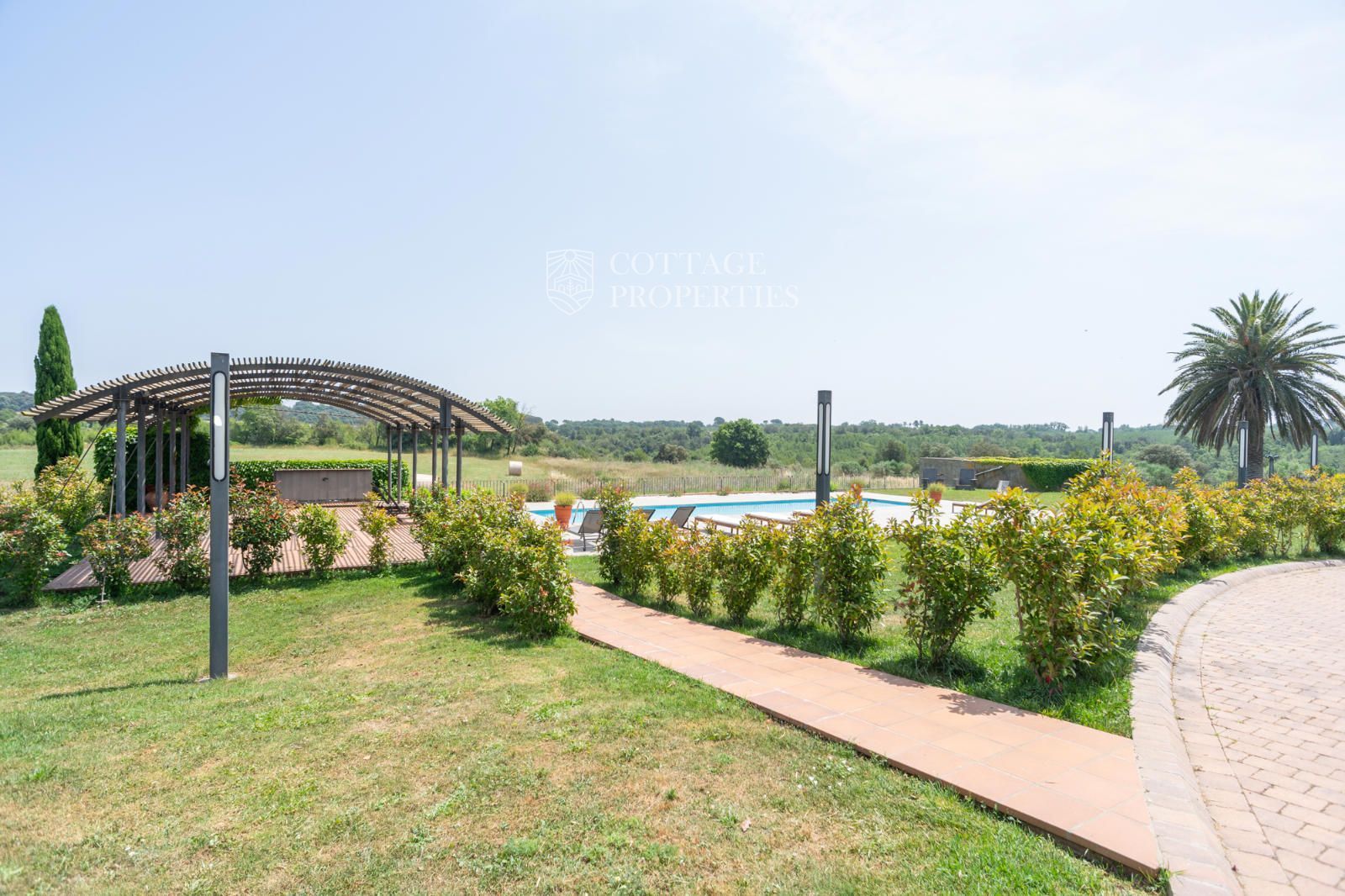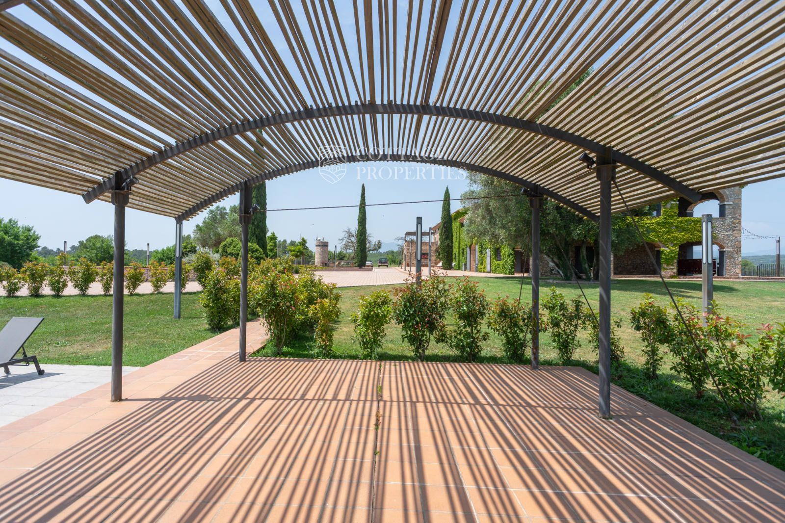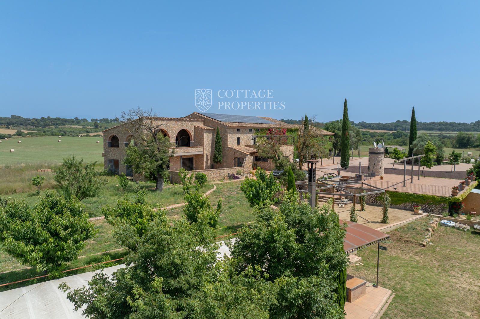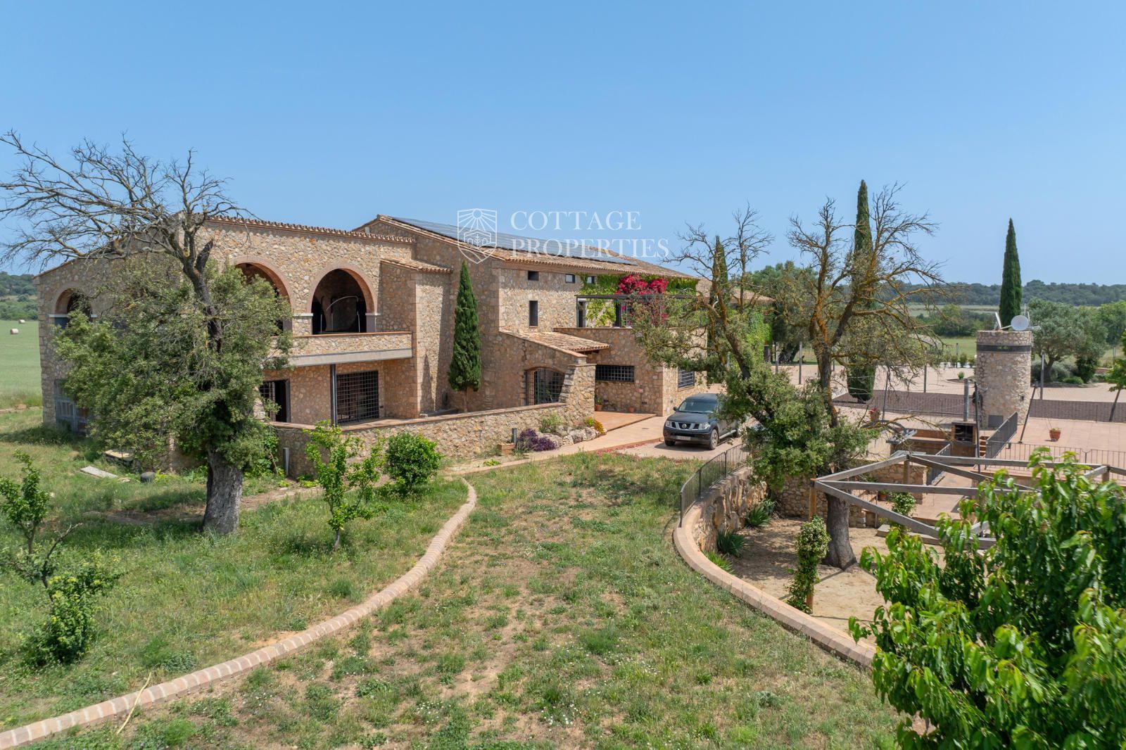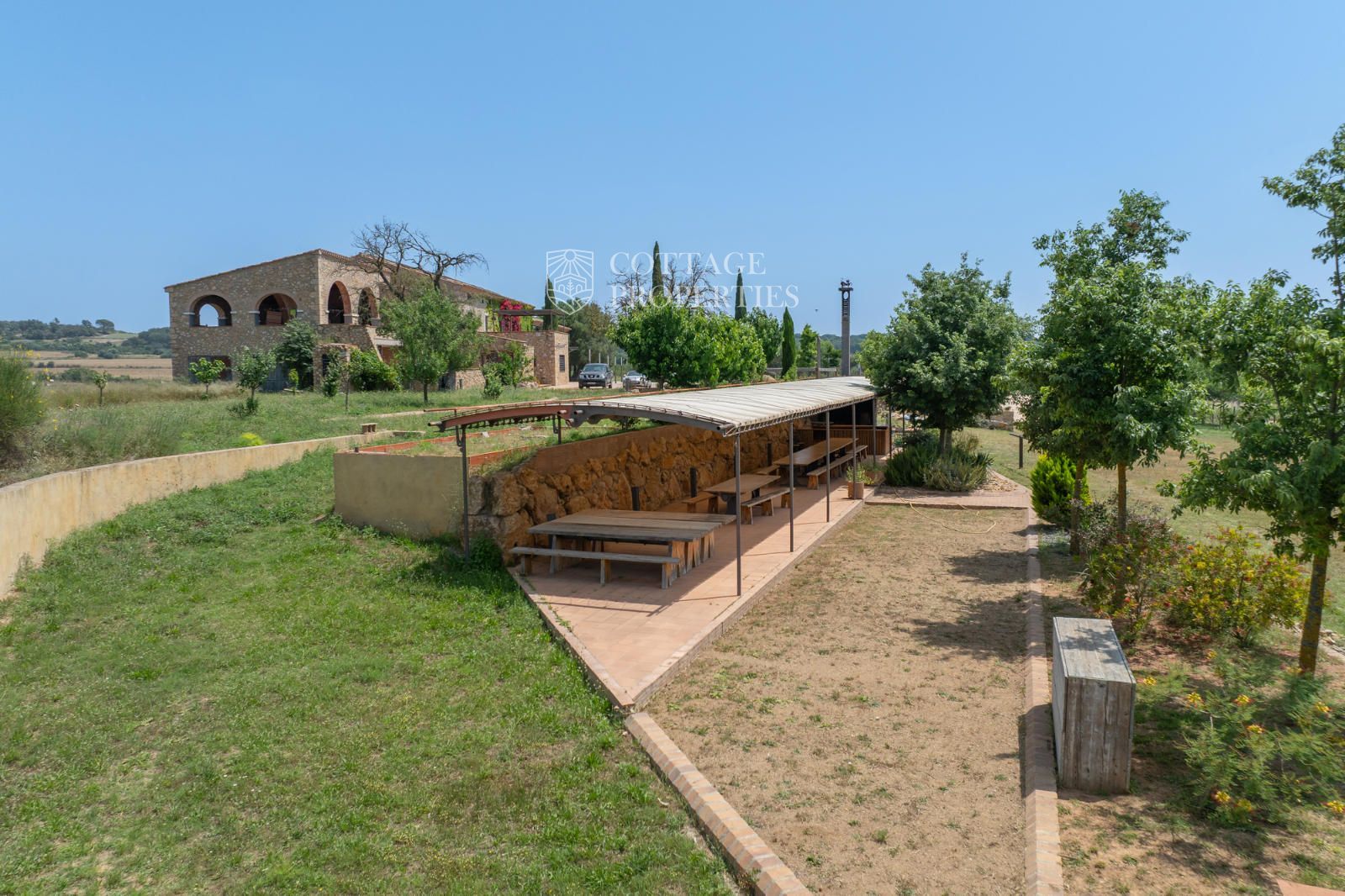 L'entorn exterior ofereix àmplies terrasses, dues zones de barbacoa, piscina amb pèrgola, solàrium i jardí. El garatge cobert inclou diverses places. Envoltada de boscos i camps de conreu sobre les seves 60 ha, garanteix un entorn natural sense elements contaminants i amb vistes panoràmiques al Pirineu.