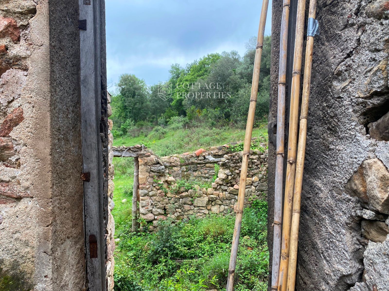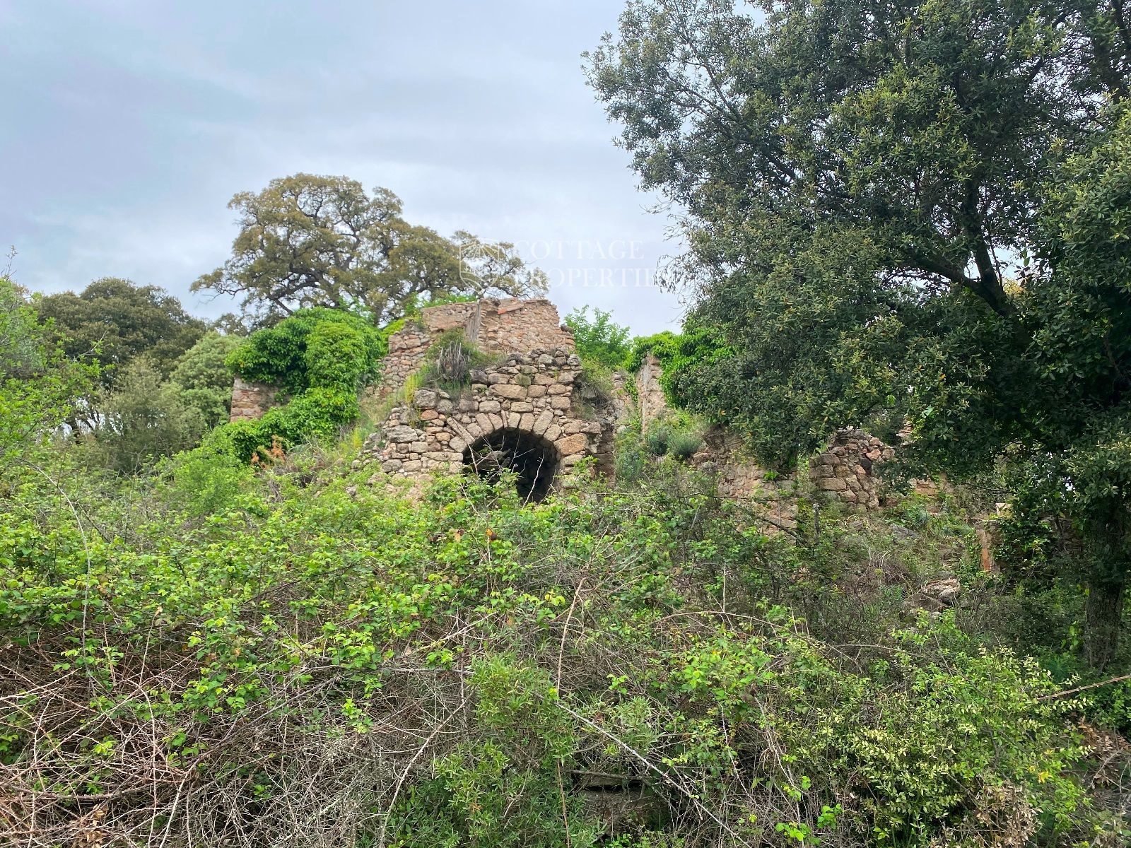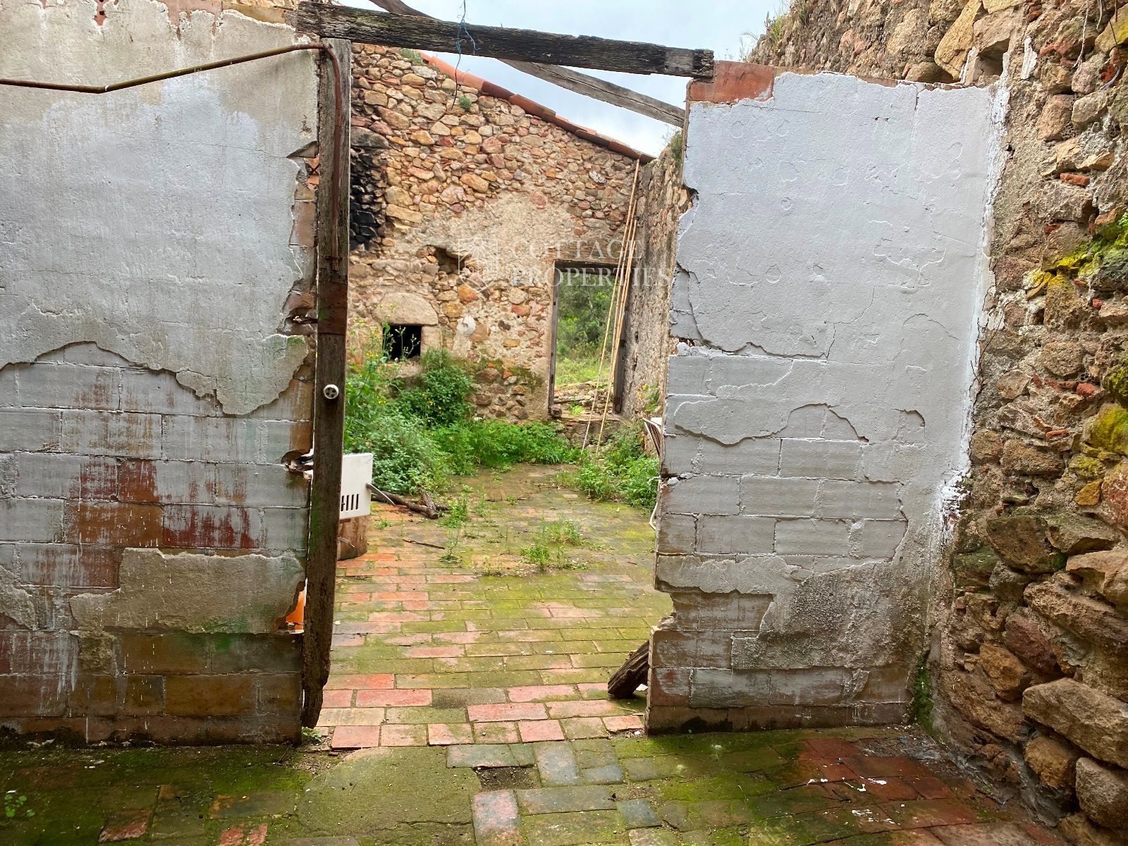 La ruïna es troba en un terreny d'aproximadament 160 hectàrees, predominantment amb boscos d'alzines sureres, camps cultivables i un ambient natural idíl·lic. La masia compta amb una planta baixa de 130 m² i una planta addicional de 300 m² a rehabilitar, oferint àmplies possibilitats per renovar segons el projecte desitjat.
