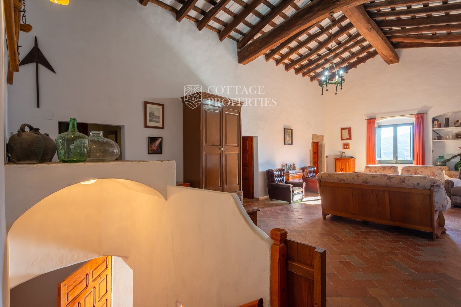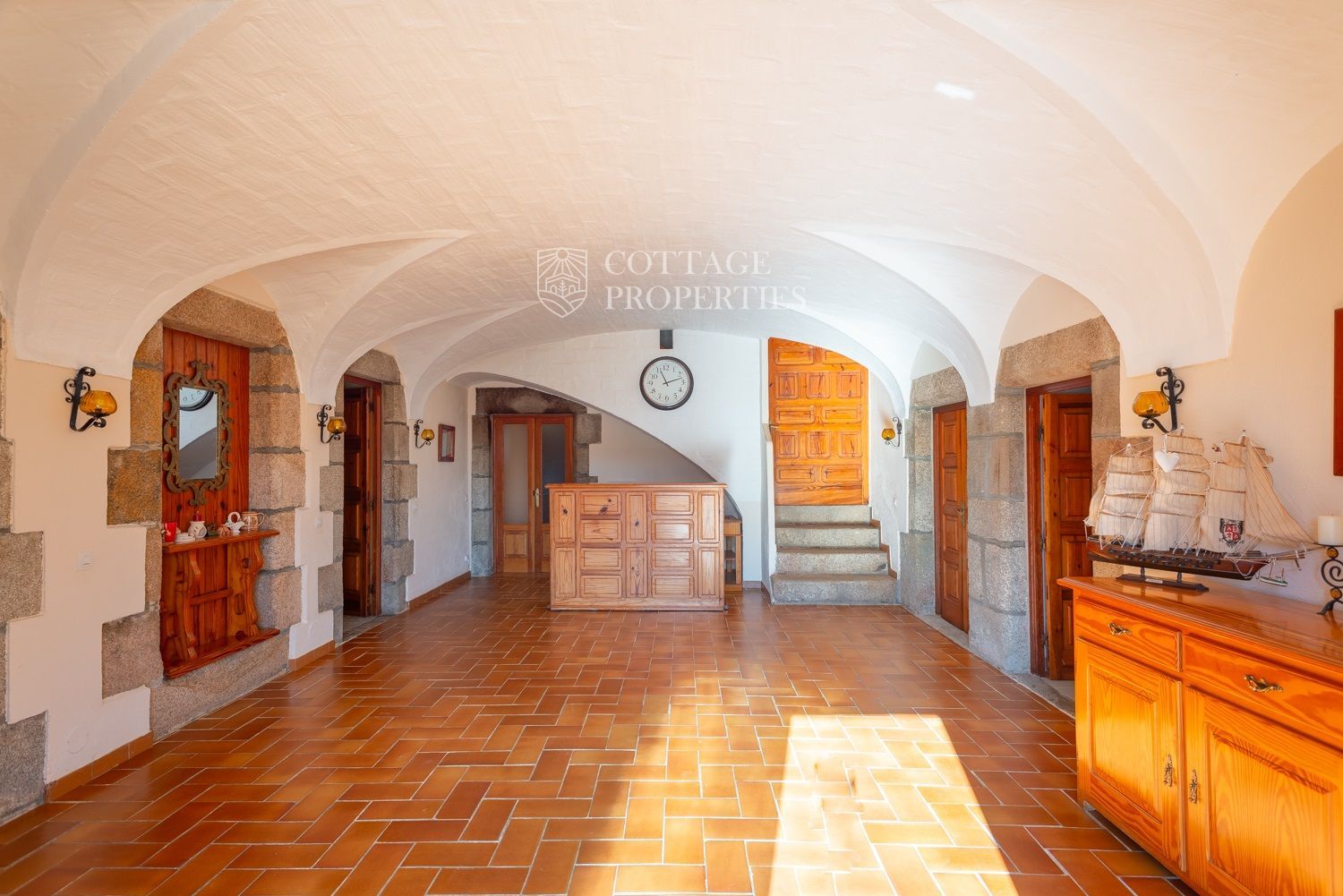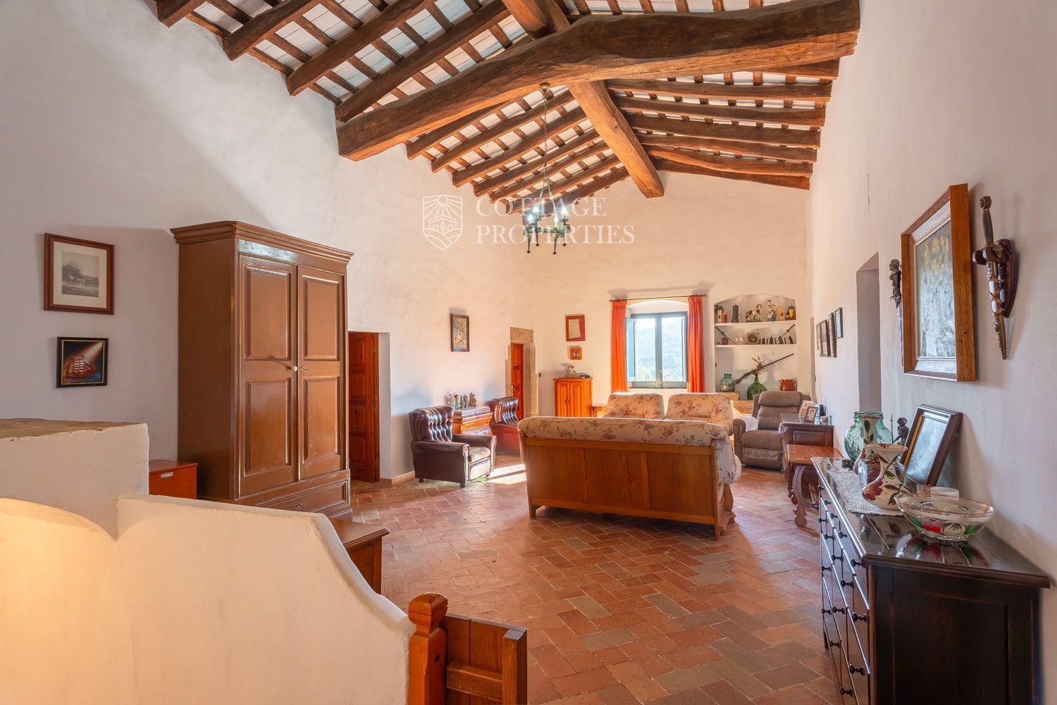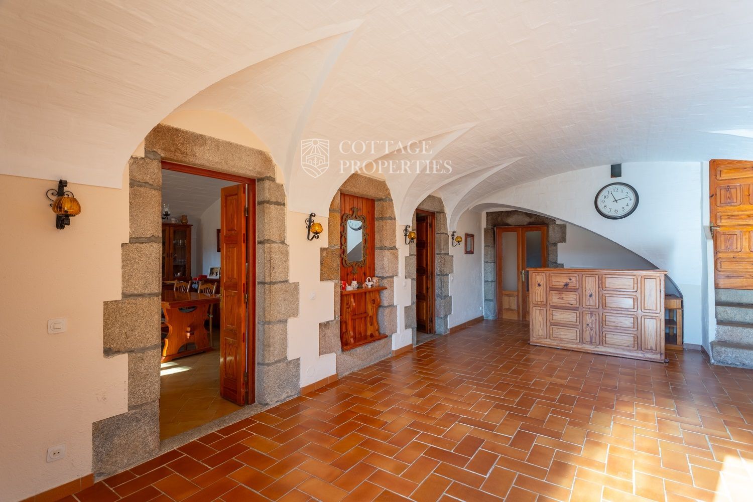 La casa compta amb una gran entrada a la planta baixa, un acollidor saló amb xemeneia, un menjador espaiós, un bany complet amb dutxa i una àmplia cuina amb xemeneia. Des de la cuina, s'accedeix a un pati posterior amb barbacoa i cuina de llenya, que ofereix opcions culinàries a l'aire lliure. A més, aquesta planta compta amb altres estances versàtils que podrien adaptar-se com a habitacions addicionals. A la planta superior es troba un gran saló amb sostres de bigues originals, set habitacions dobles, un bany complet i un lavabo, així com un altell amb potencial addicional. La propietat també disposa de diversos porxos oberts que podrien utilitzar-se com a garatge, dos pous d'aigua, xemeneies i elements originals que afegeixen caràcter.