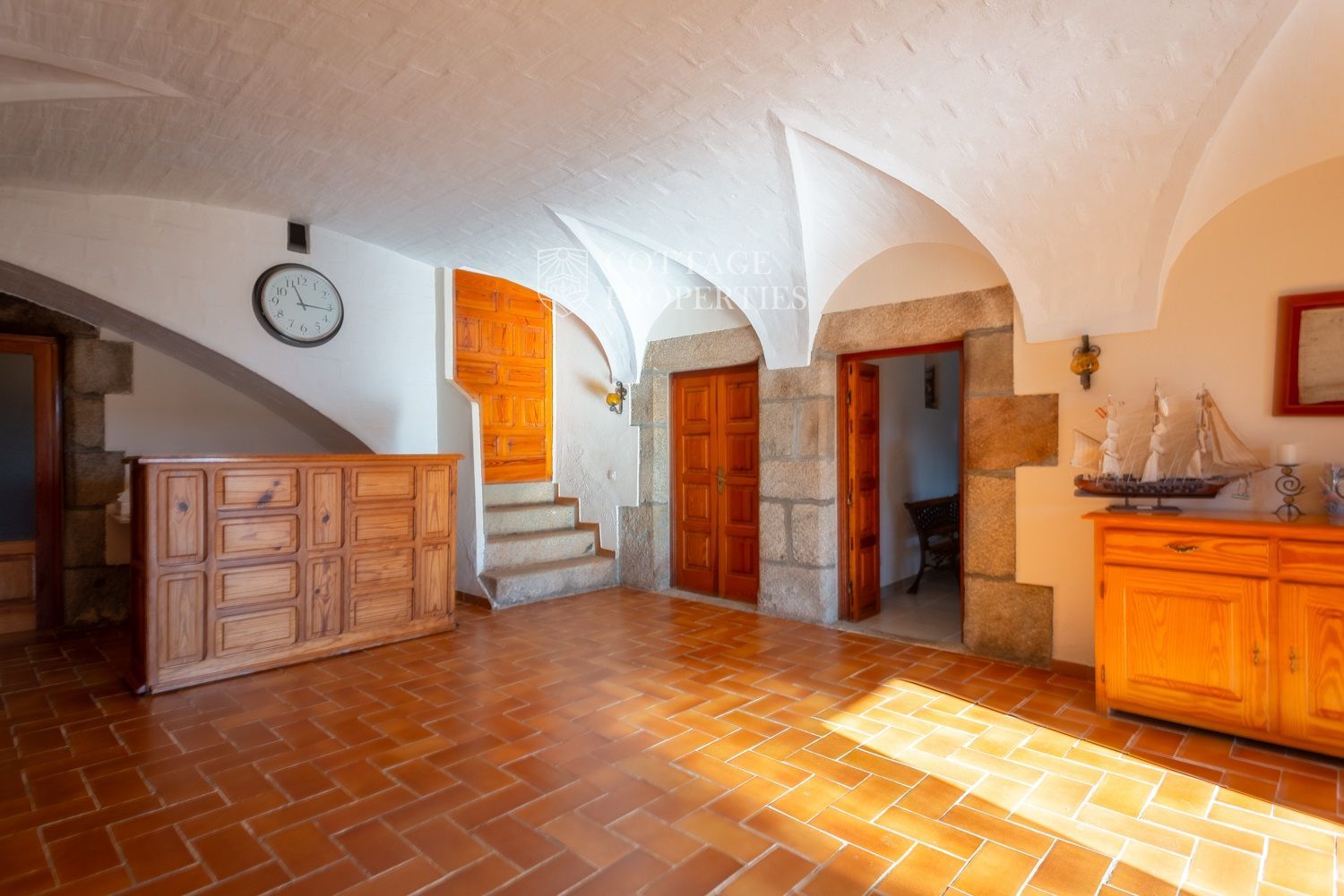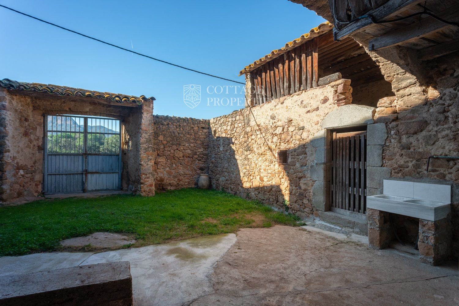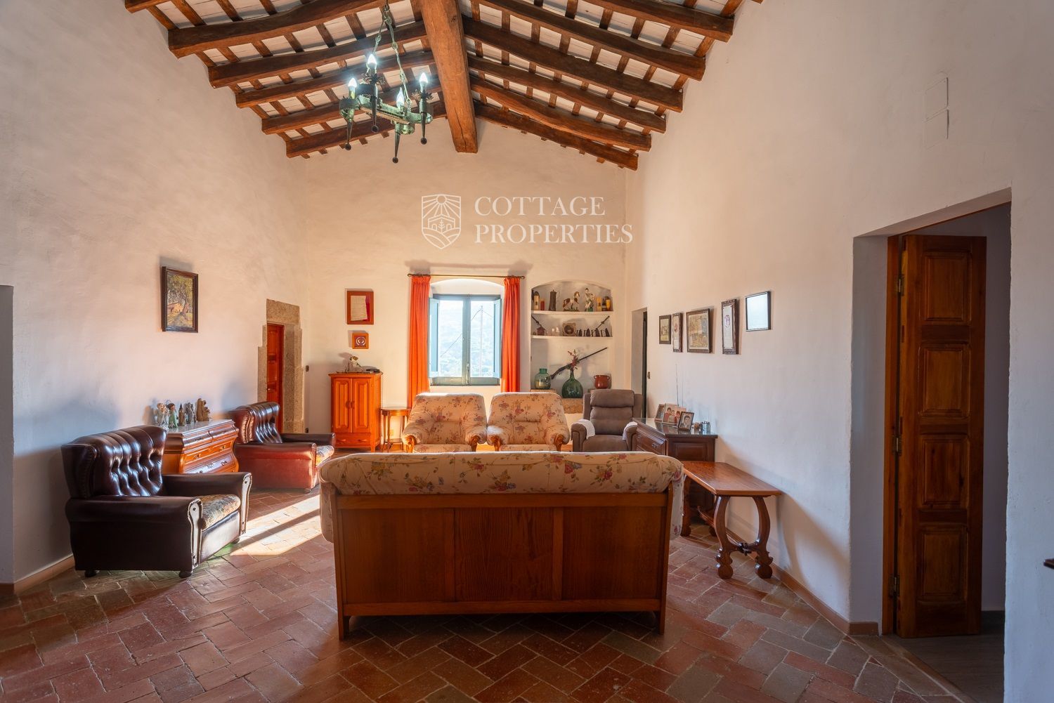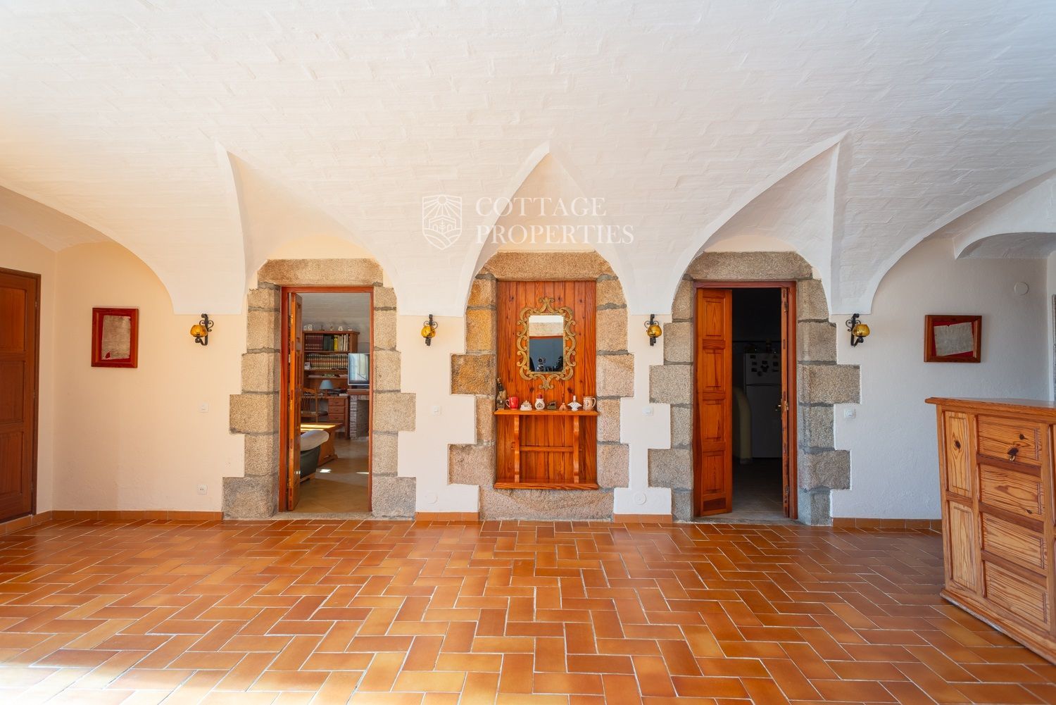 La casa compta amb una gran entrada a la planta baixa, un acollidor saló amb xemeneia, un menjador espaiós, un bany complet amb dutxa i una àmplia cuina amb xemeneia. Des de la cuina, s'accedeix a un pati posterior amb barbacoa i cuina de llenya, que ofereix opcions culinàries a l'aire lliure. A més, aquesta planta compta amb altres estances versàtils que podrien adaptar-se com a habitacions addicionals. A la planta superior es troba un gran saló amb sostres de bigues originals, set habitacions dobles, un bany complet i un lavabo, així com un altell amb potencial addicional. La propietat també disposa de diversos porxos oberts que podrien utilitzar-se com a garatge, dos pous d'aigua, xemeneies i elements originals que afegeixen caràcter.