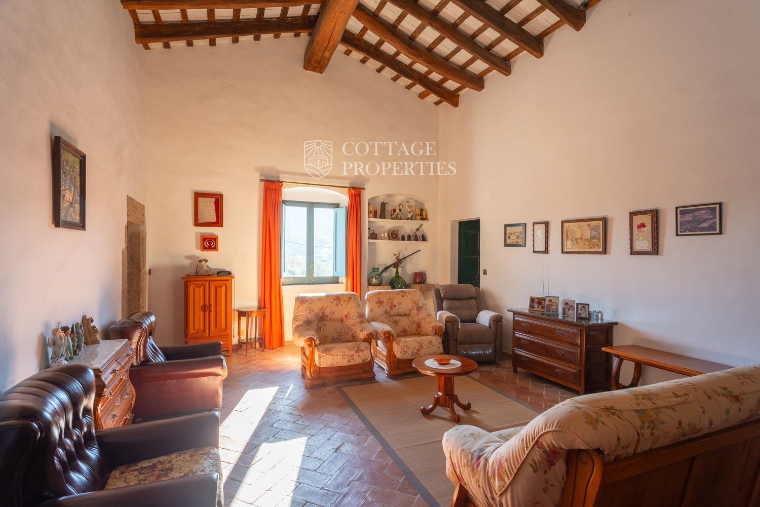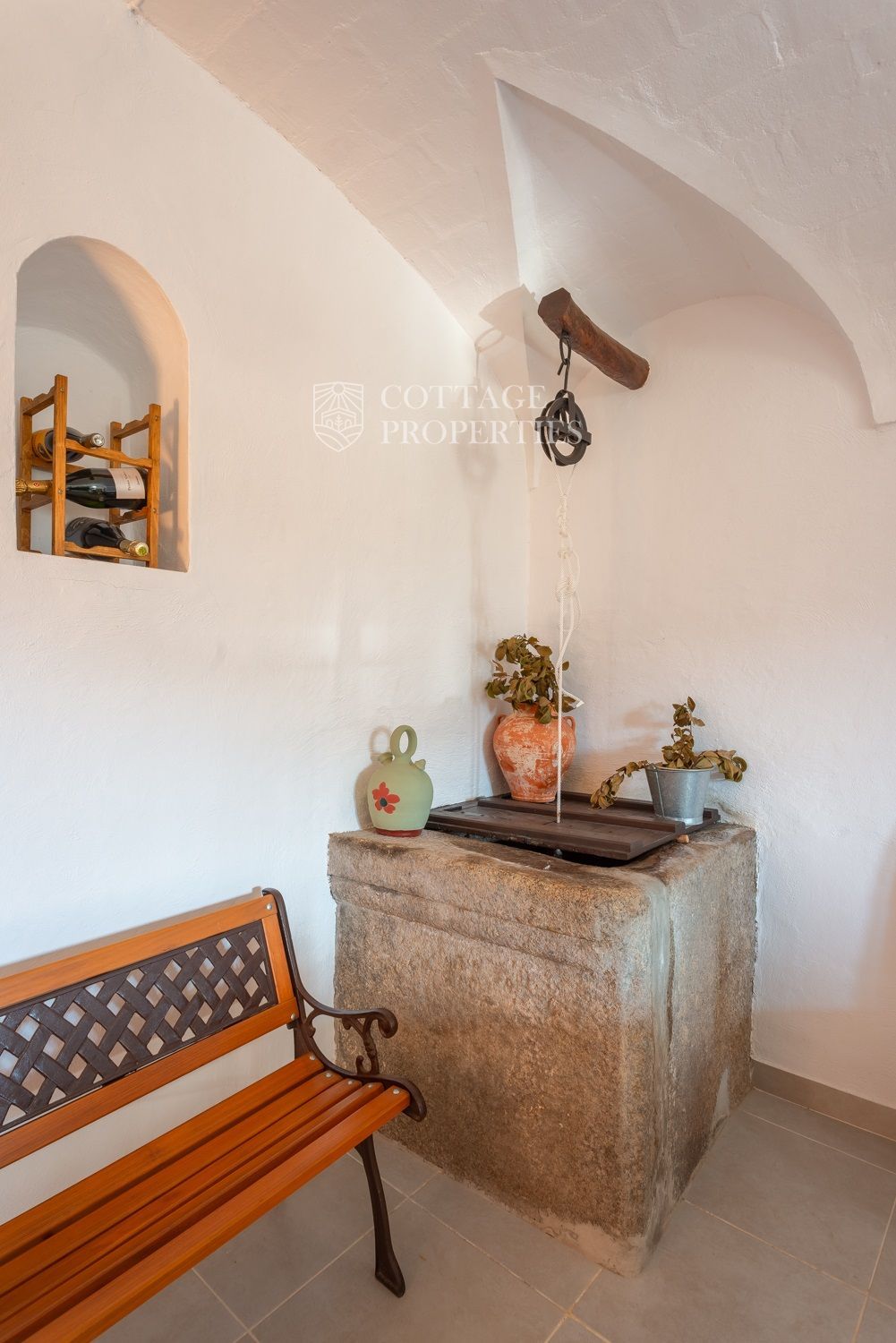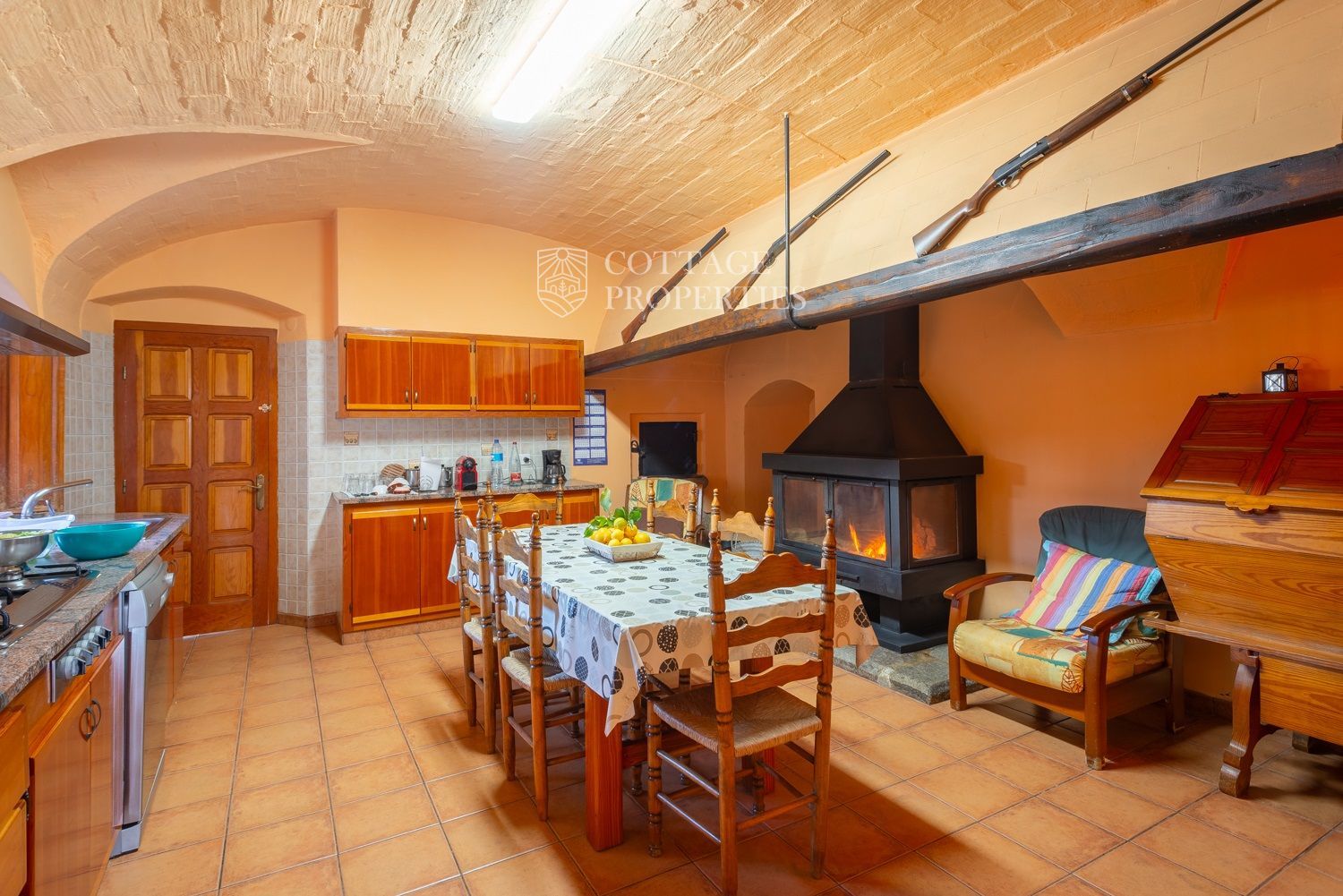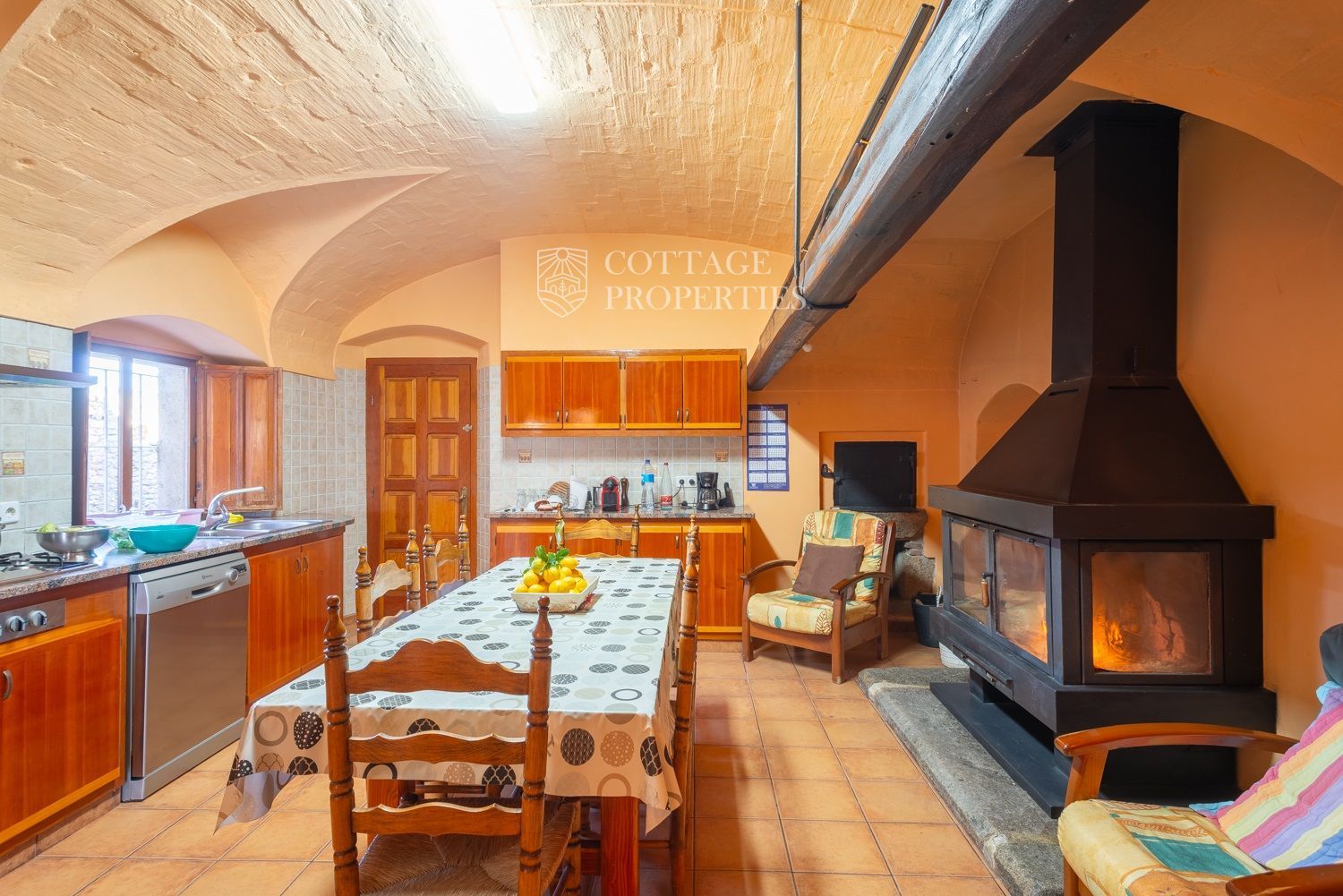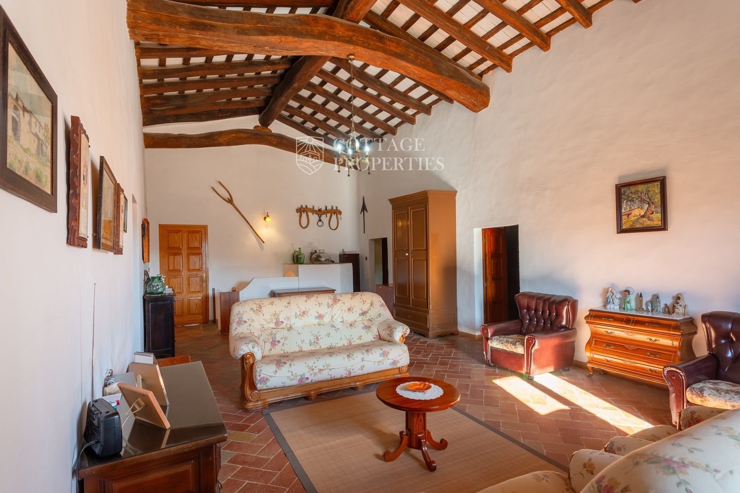 La casa compta amb una gran entrada a la planta baixa, un acollidor saló amb xemeneia, un menjador espaiós, un bany complet amb dutxa i una àmplia cuina amb xemeneia. Des de la cuina, s'accedeix a un pati posterior amb barbacoa i cuina de llenya, que ofereix opcions culinàries a l'aire lliure. A més, aquesta planta compta amb altres estances versàtils que podrien adaptar-se com a habitacions addicionals. A la planta superior es troba un gran saló amb sostres de bigues originals, set habitacions dobles, un bany complet i un lavabo, així com un altell amb potencial addicional. La propietat també disposa de diversos porxos oberts que podrien utilitzar-se com a garatge, dos pous d'aigua, xemeneies i elements originals que afegeixen caràcter.