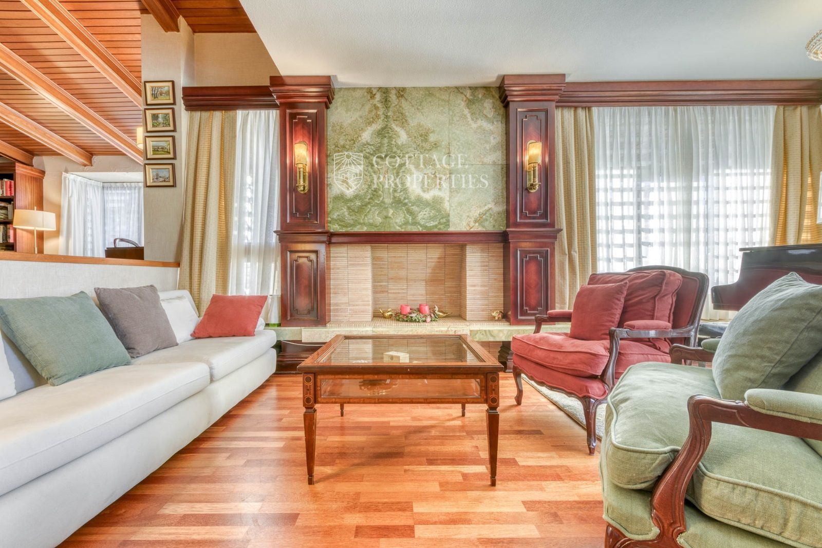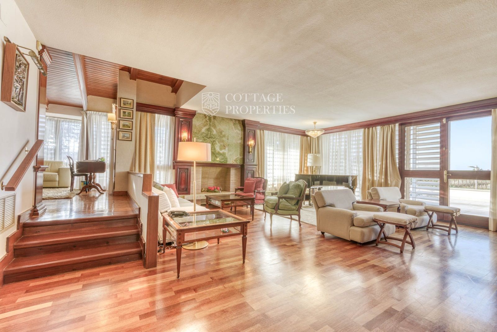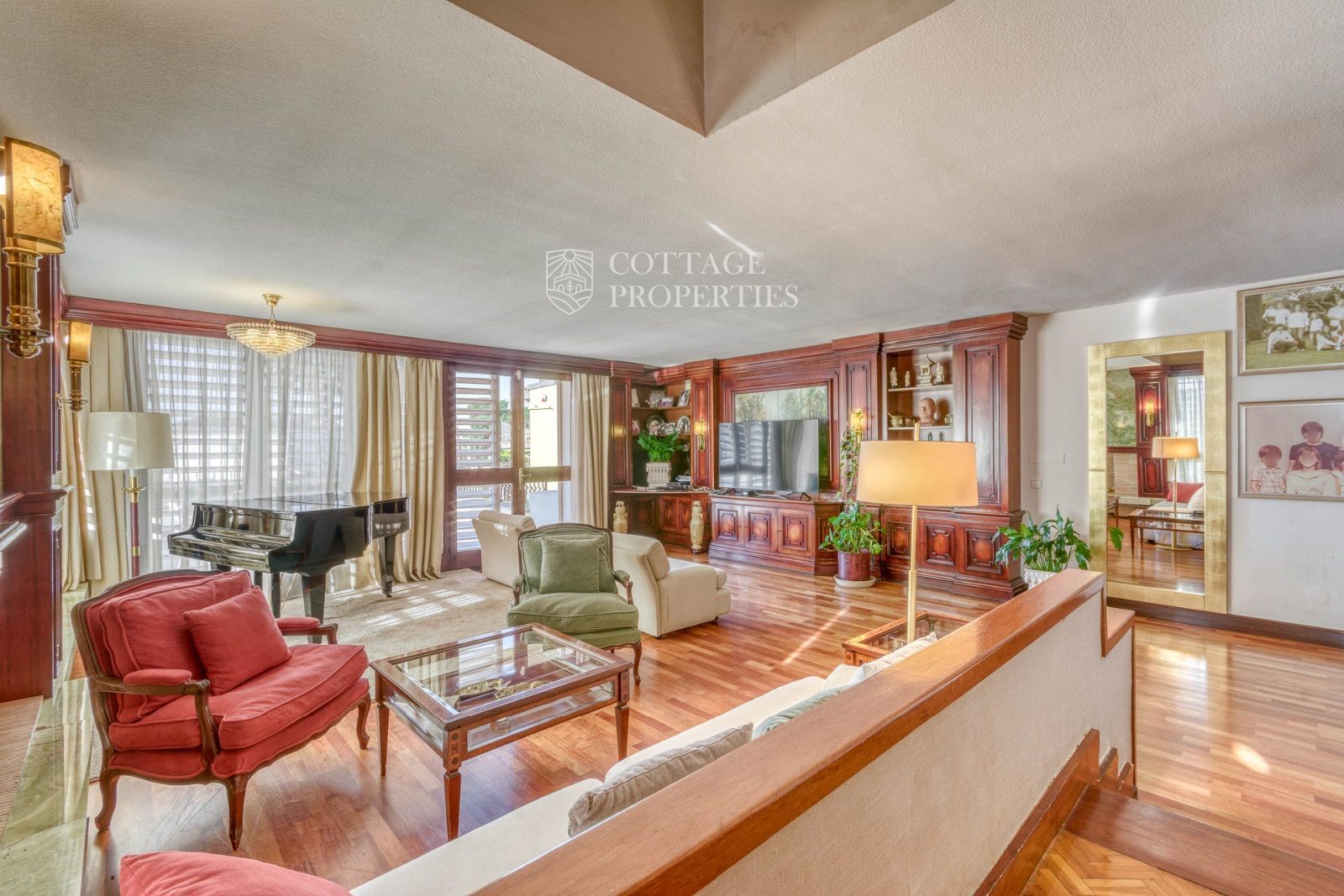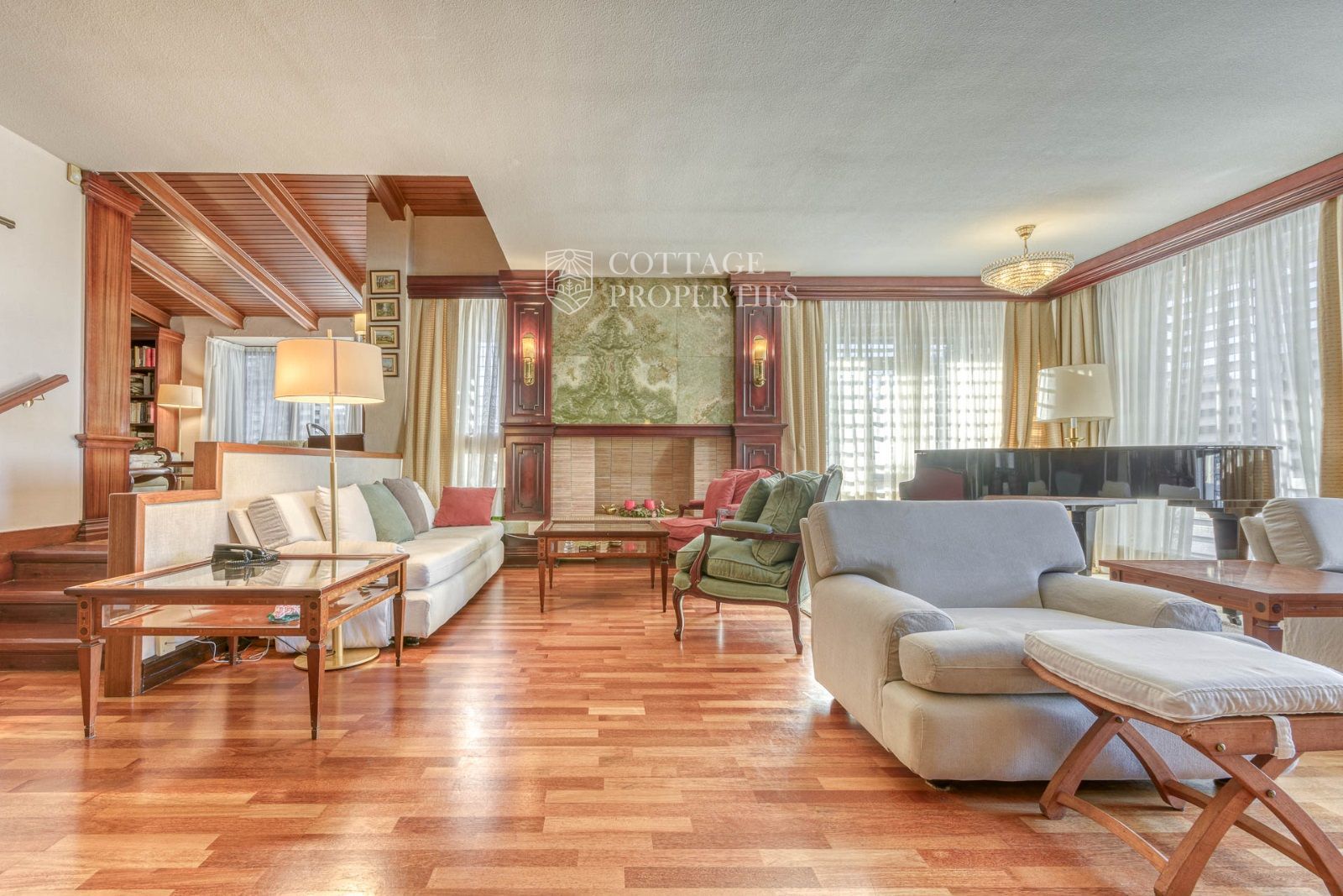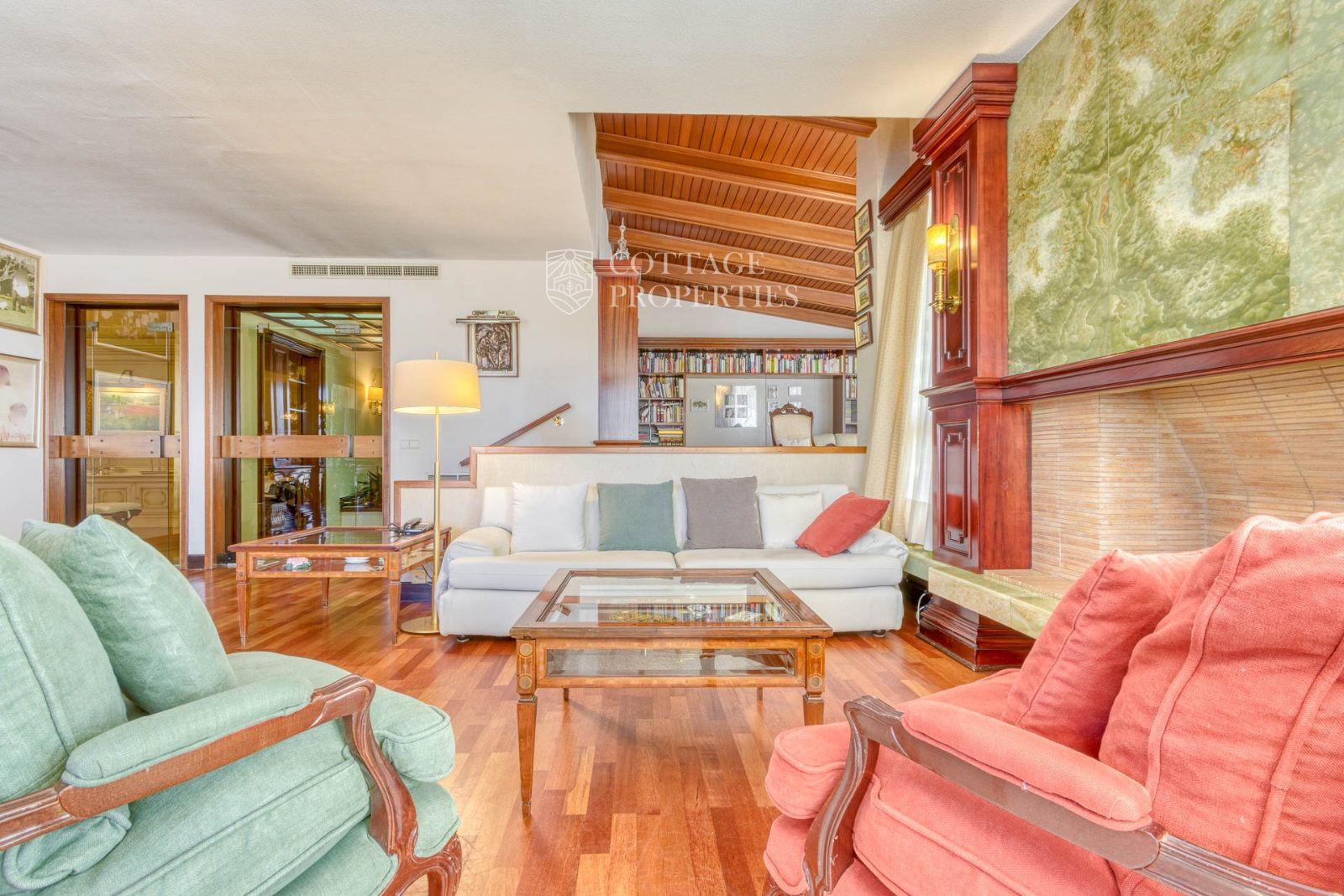 La planta principal inclou un elegant rebedor-distribuïdor i un gran saló lluminós que s'obre a una àmpliíssima terrassa-solàrium de més de 100 m². La xemeneia d'ònix i la acollidora sala de lectura amb bigues de fusta destaquen en aquesta planta. Les fustes nobles del Camerun són presents a tot arreu, incloent el parquet i les bigues als sostres. El saló connecta amb un menjador independent i una cuina d'estil tradicional amb mobles de fusta. També es troba un sumptuós despatx revestit de fusta i un lavabo per a convidats.