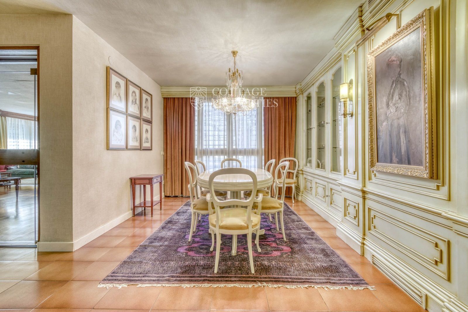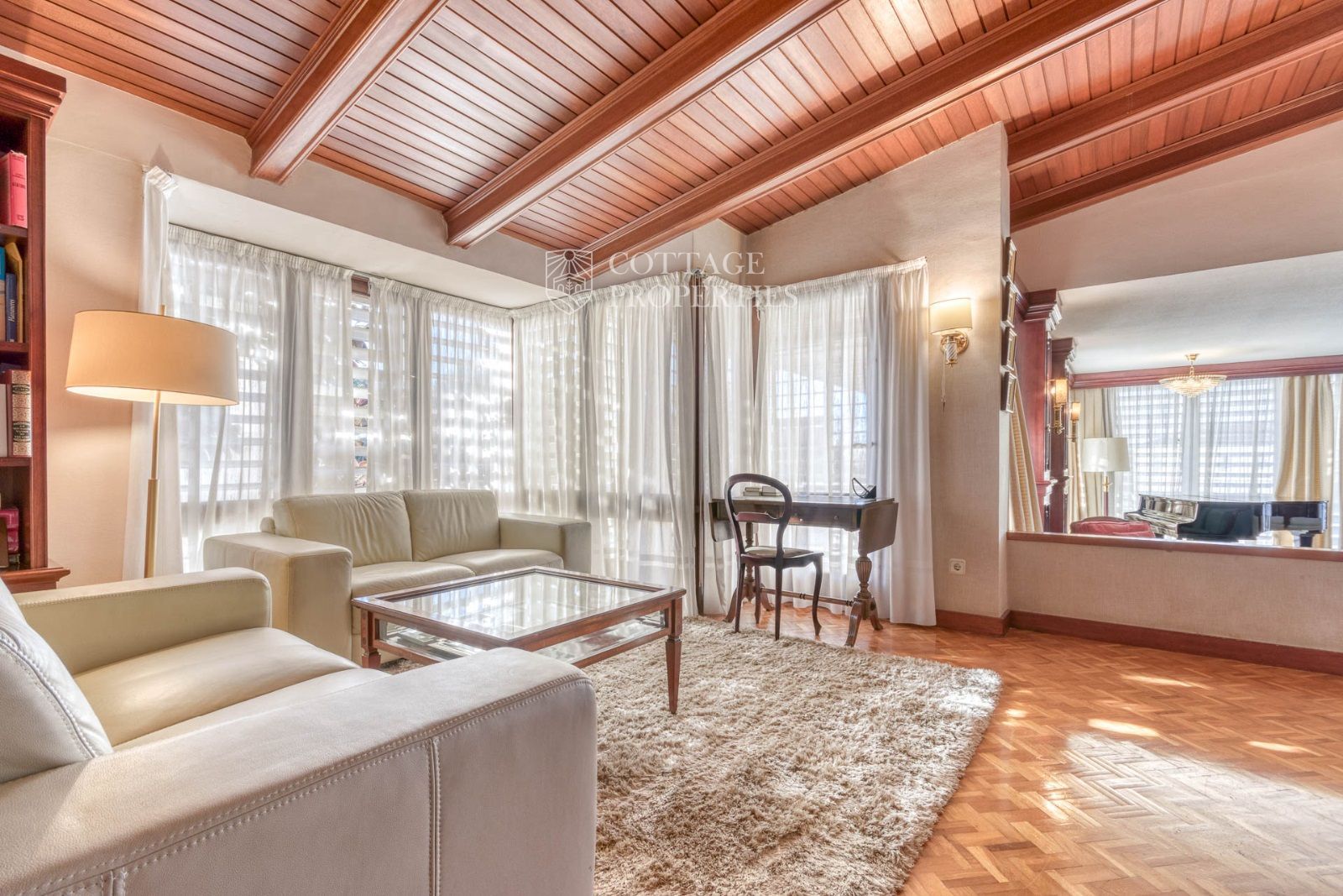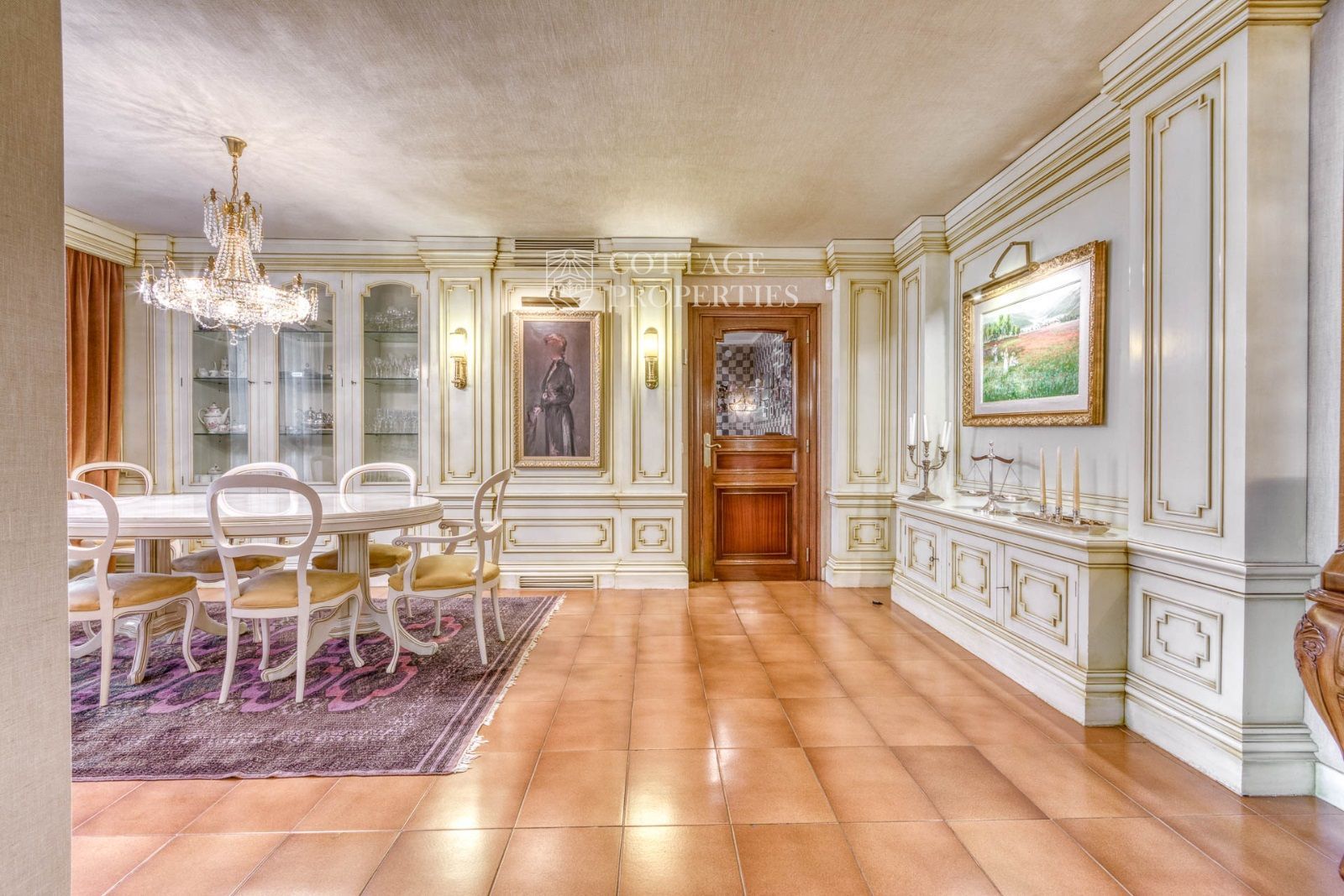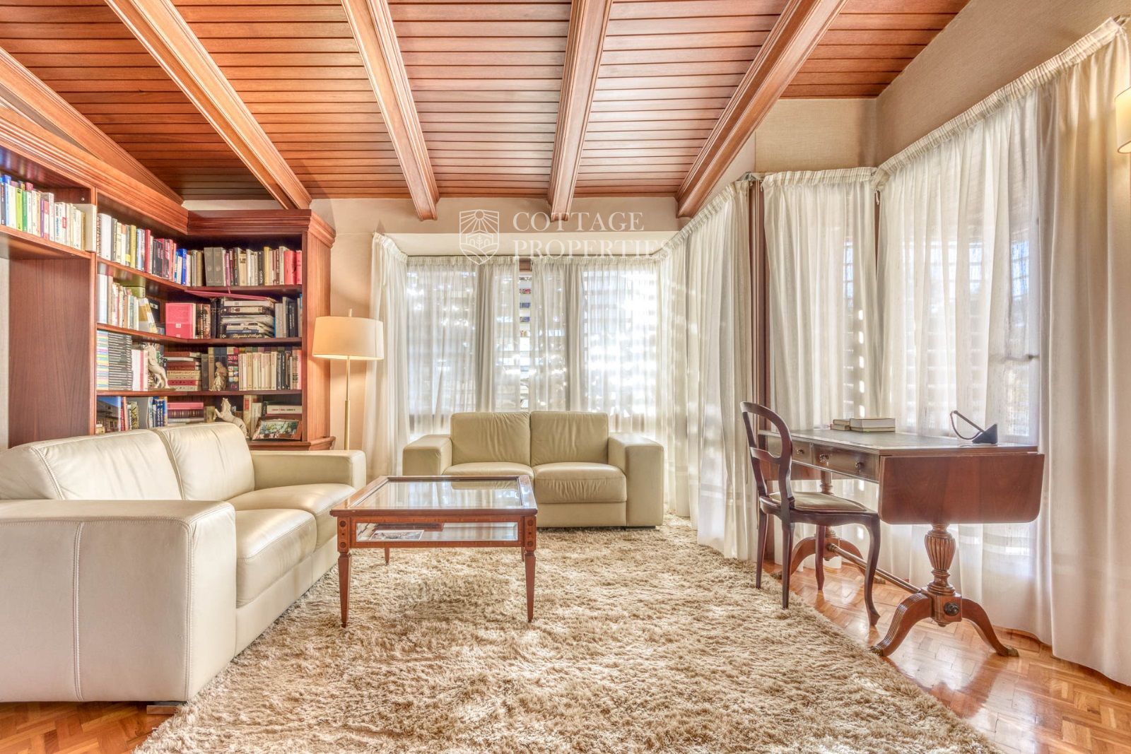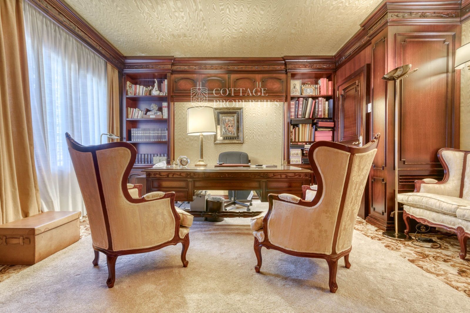 La planta principal inclou un elegant rebedor-distribuïdor i un gran saló lluminós que s'obre a una àmpliíssima terrassa-solàrium de més de 100 m². La xemeneia d'ònix i la acollidora sala de lectura amb bigues de fusta destaquen en aquesta planta. Les fustes nobles del Camerun són presents a tot arreu, incloent el parquet i les bigues als sostres. El saló connecta amb un menjador independent i una cuina d'estil tradicional amb mobles de fusta. També es troba un sumptuós despatx revestit de fusta i un lavabo per a convidats.