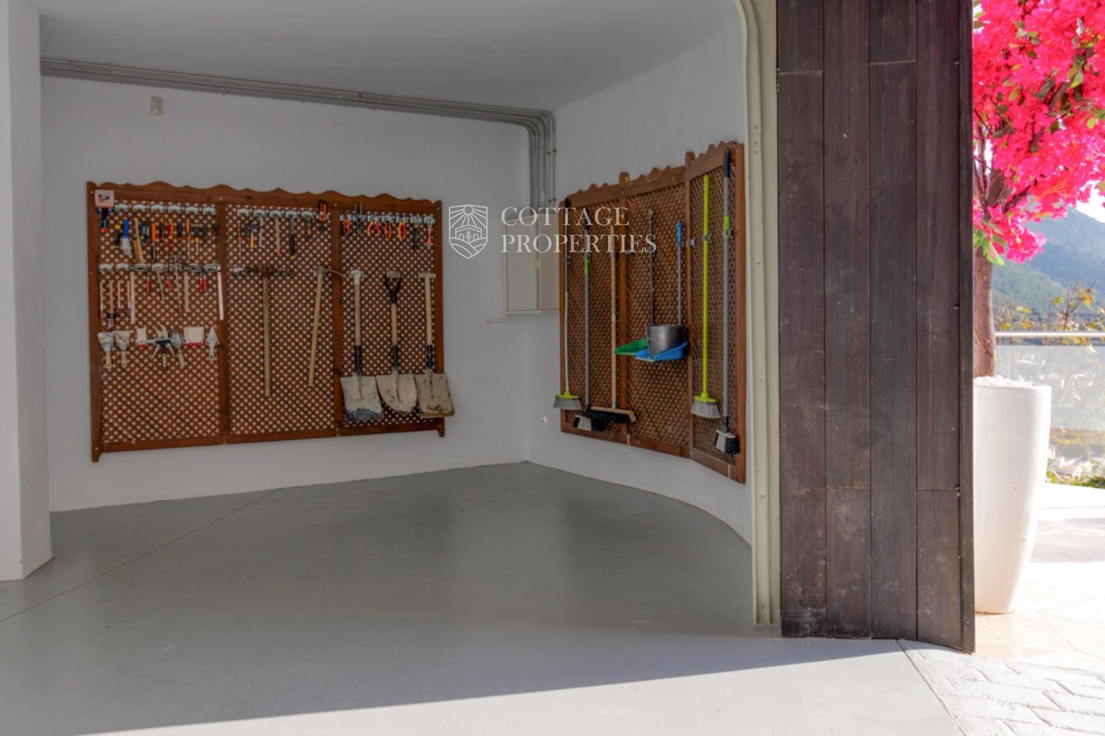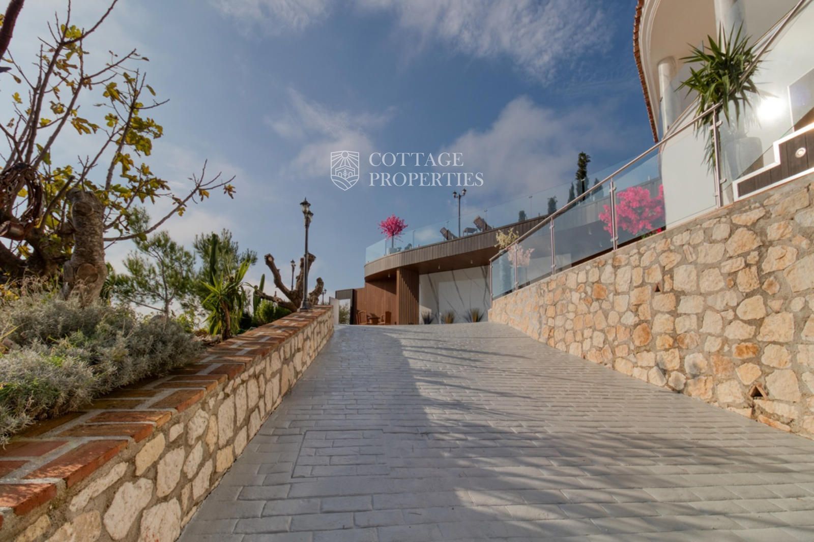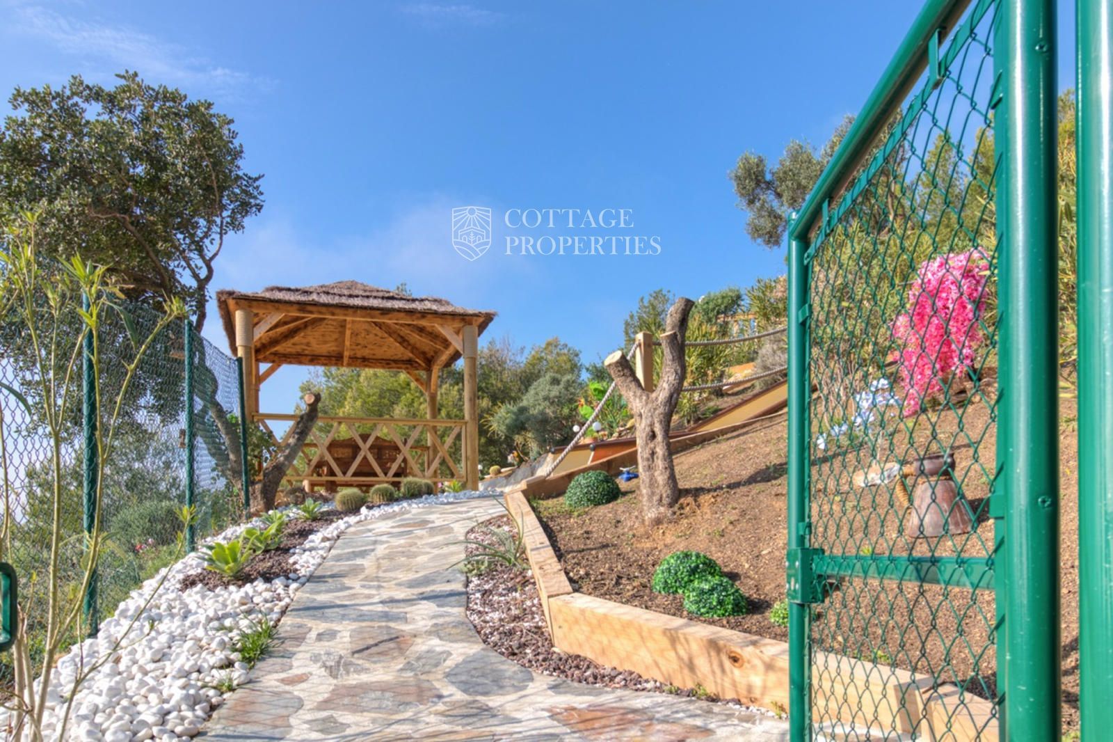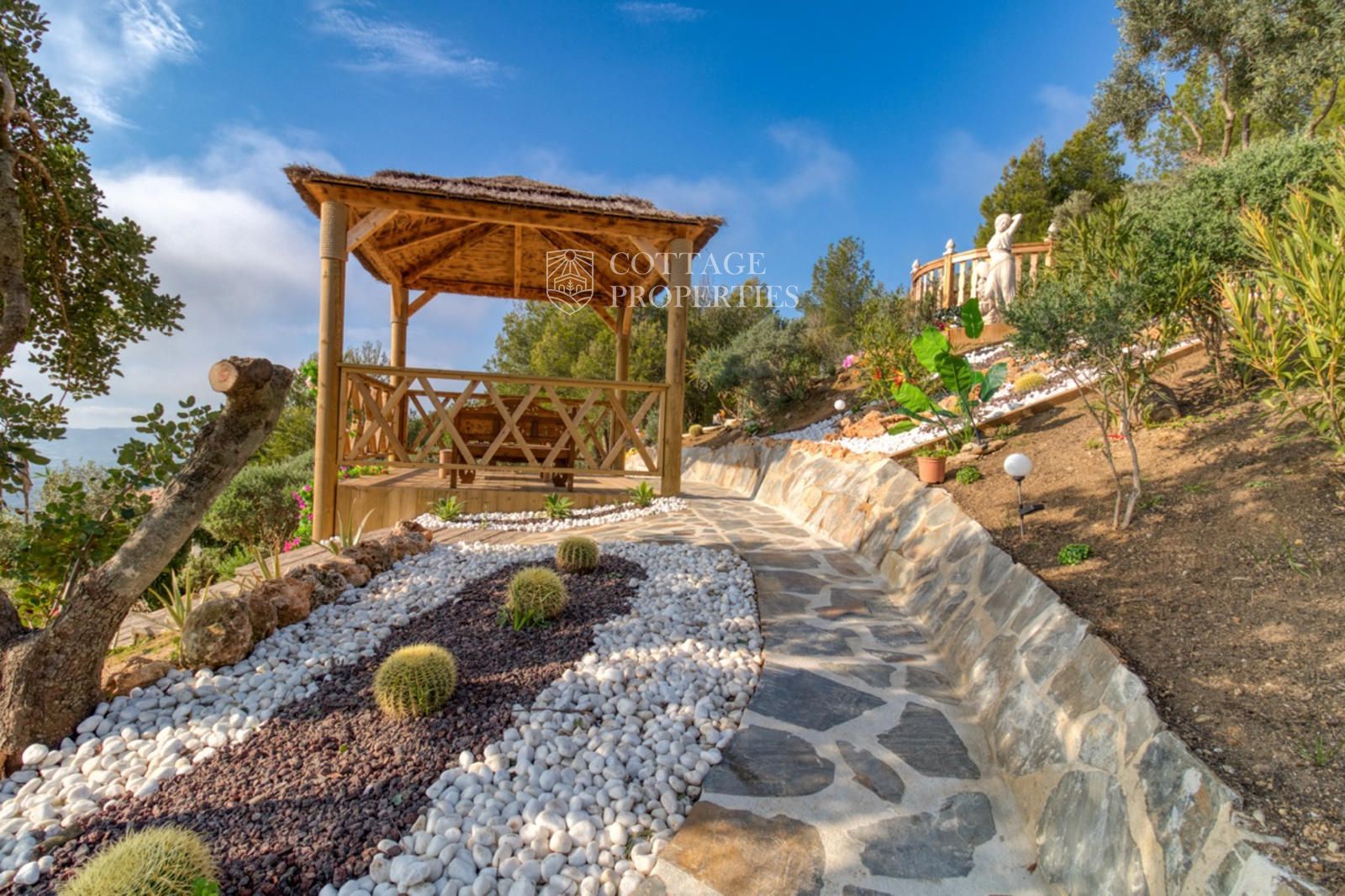 L'entorn exterior és un veritable paradís, amb jardins luxosament dissenyats que inclouen fonts ornamentals, estàtues, un tobogan i un cenador de fusta de 20 m², on es pot gaudir d'un sopar a l'aire lliure. També hi ha una barbacoa de carbó i dues zones àmplies equipades amb mobiliari de jardí, ideals per compartir moments inoblidables. Des del mirador de fusta, és possible contemplar vistes panoràmiques que s'estenen des del mar fins a les muntanyes. La propietat té accés directe a un dels camins més impressionants de la regió, oferint una connexió única amb la natura.