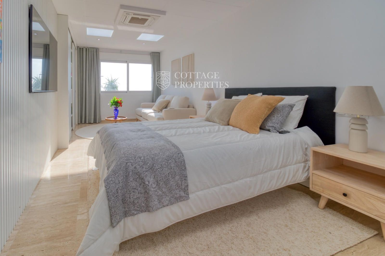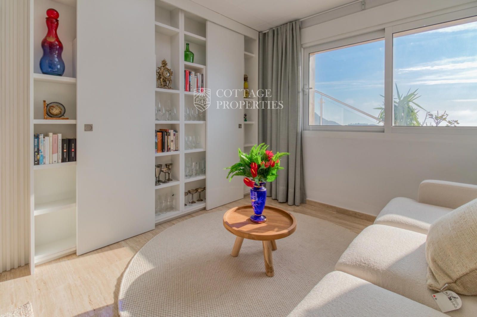 La planta principal de la vila compta amb un ampli saló-menjador que s'obre directament a una terrassa, des d'on es poden gaudir d'espectaculars vistes. La cuina, moderna i equipada amb electrodomèstics d'alta gamma, està dissenyada tant per a la funcionalitat com per ser un espai acollidor per a reunions familiars. En aquesta mateixa planta es troba el dormitori principal, que disposa d'un vestidor privat i un bany en suite de luxe, juntament amb un segon dormitori també en suite. L'àrea exterior inclou una terrassa àmplia, perfecta per relaxar-se, i una piscina infinita climatitzada de 50 m² amb coberta motoritzada, que complementa la bellesa del paisatge i ofereix un espai idoni per gaudir del clima mediterrani.