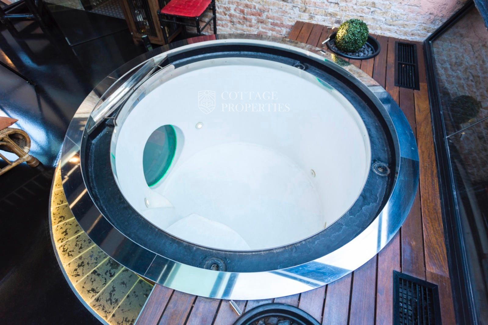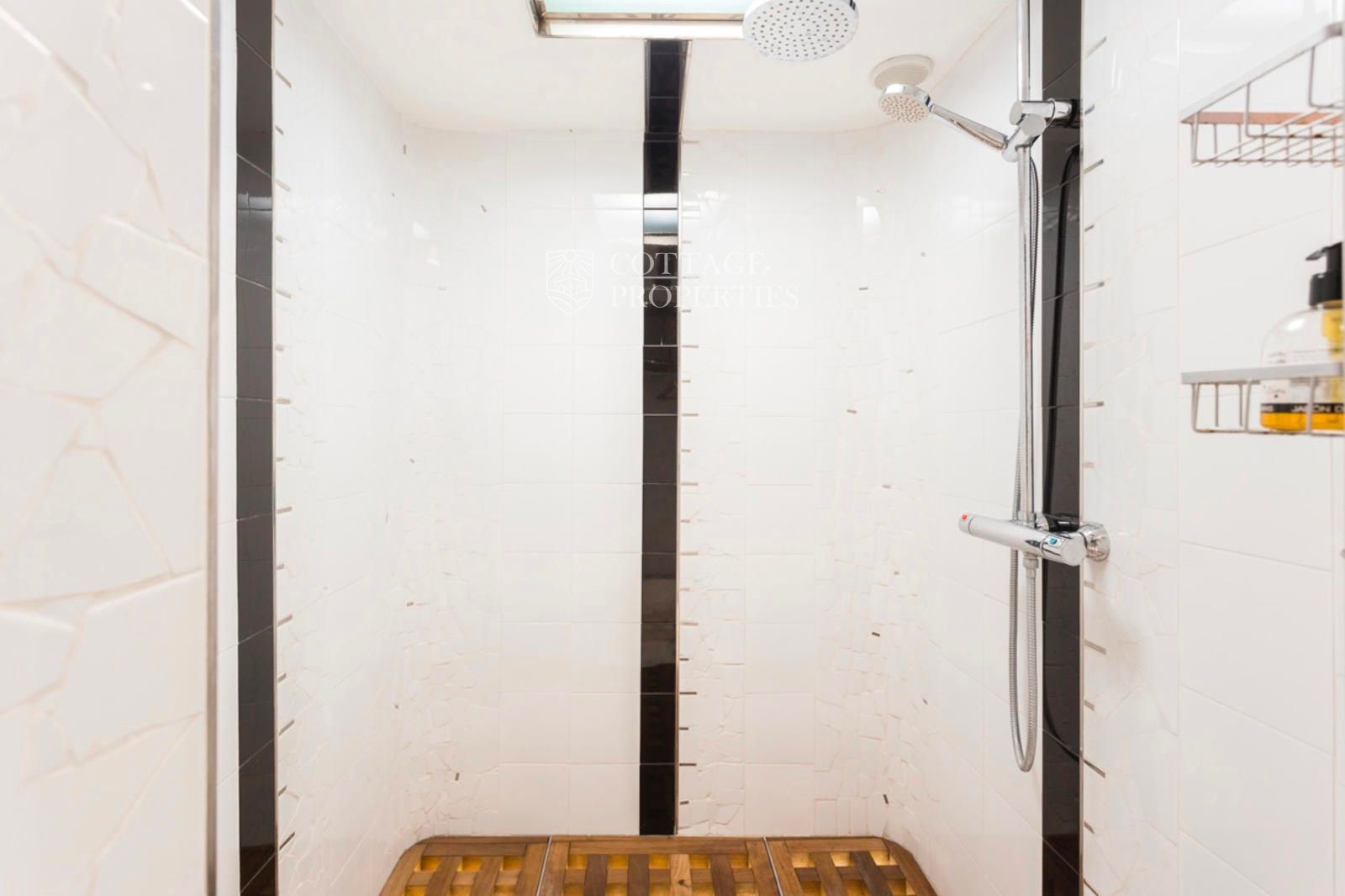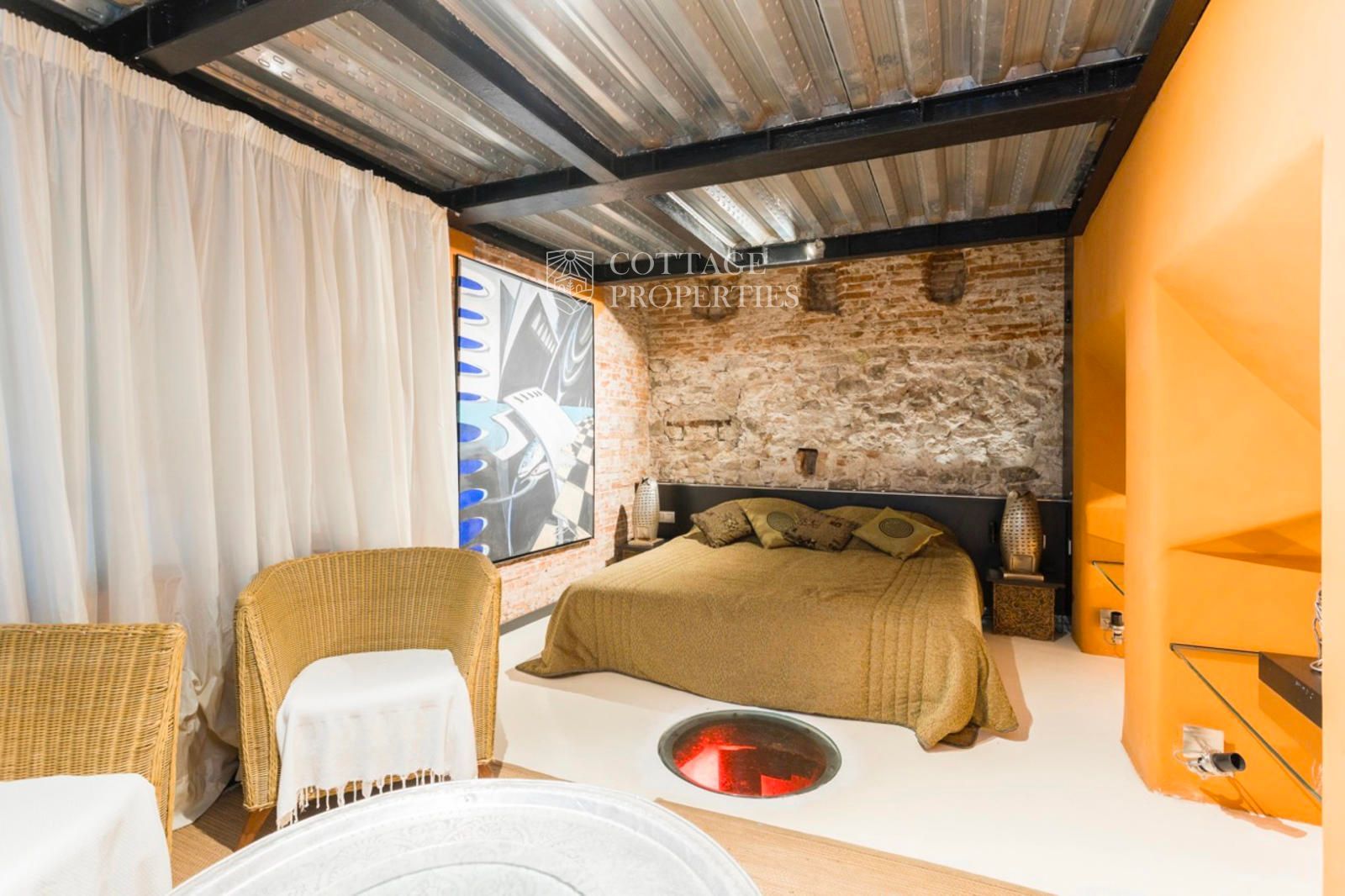 A la planta principal, un ampli saló amb grans finestrals i elements originals restaurats crea un ambient elegant i acollidor la cuina de disseny contemporani, amb acabats industrials, s'integra perfectament a l'espai, mentre que un spa climatitzat aporta un toc de luxe i benestar