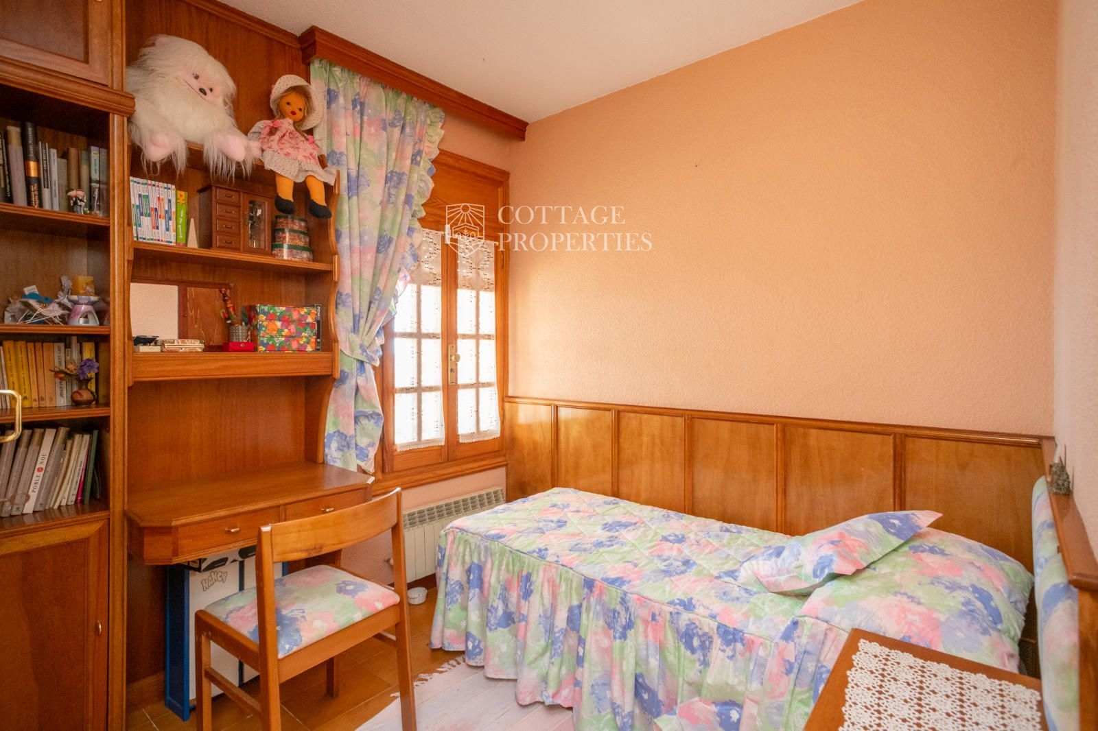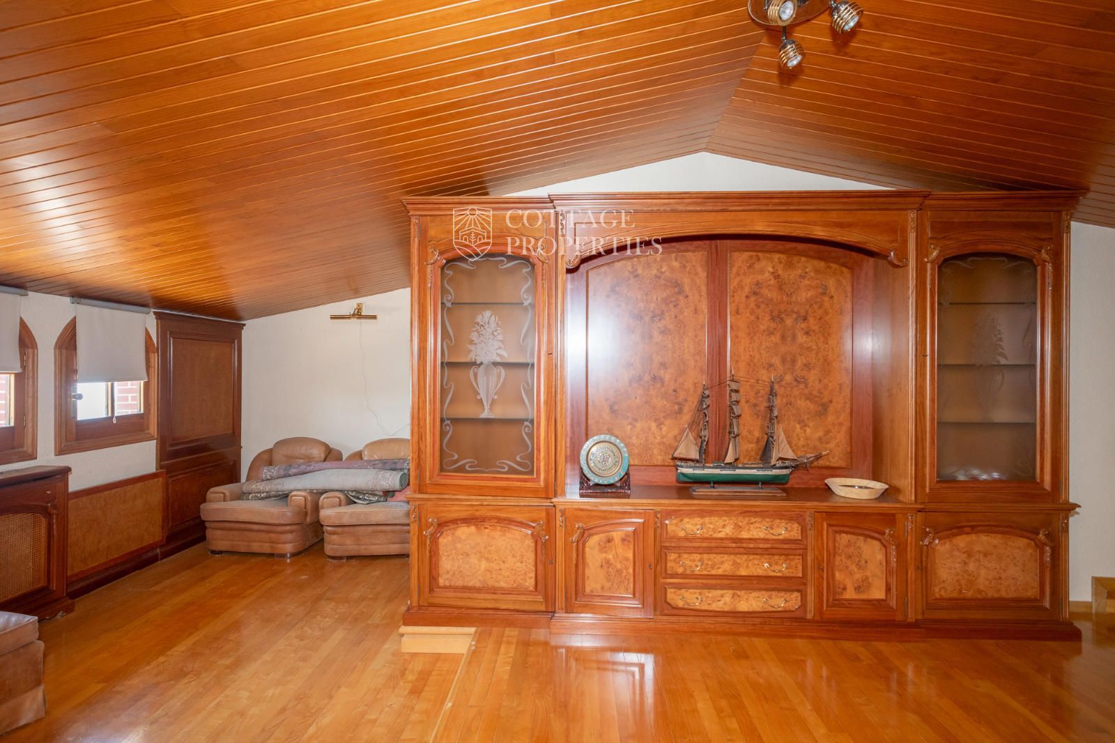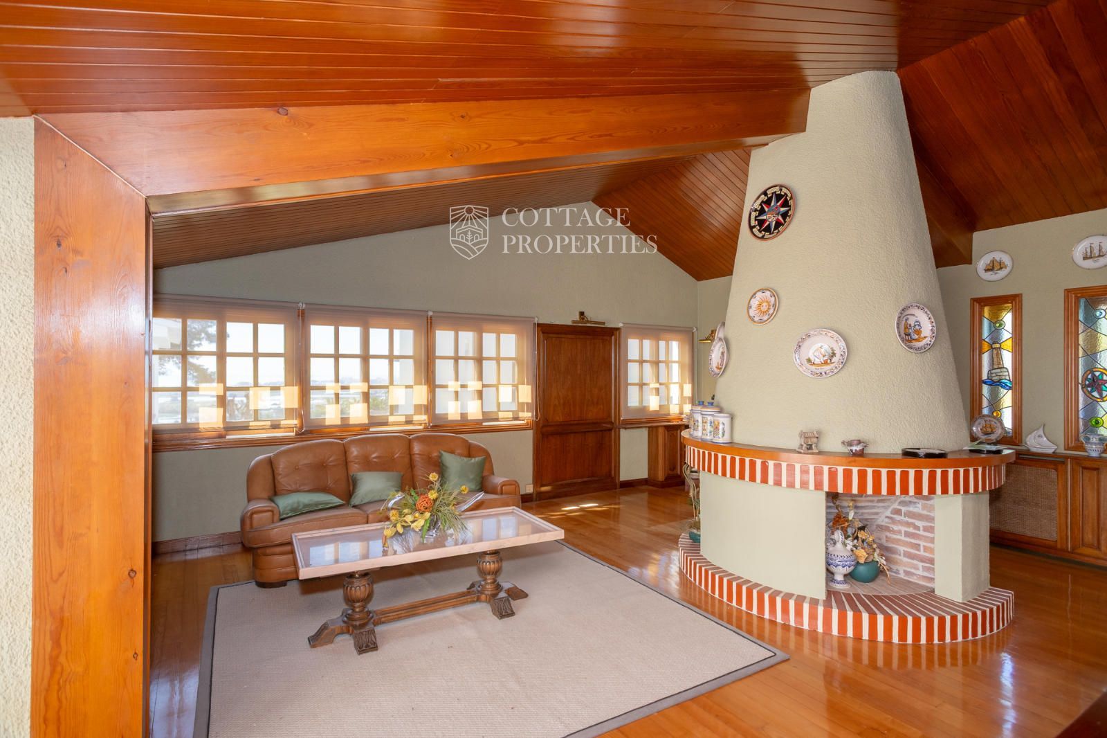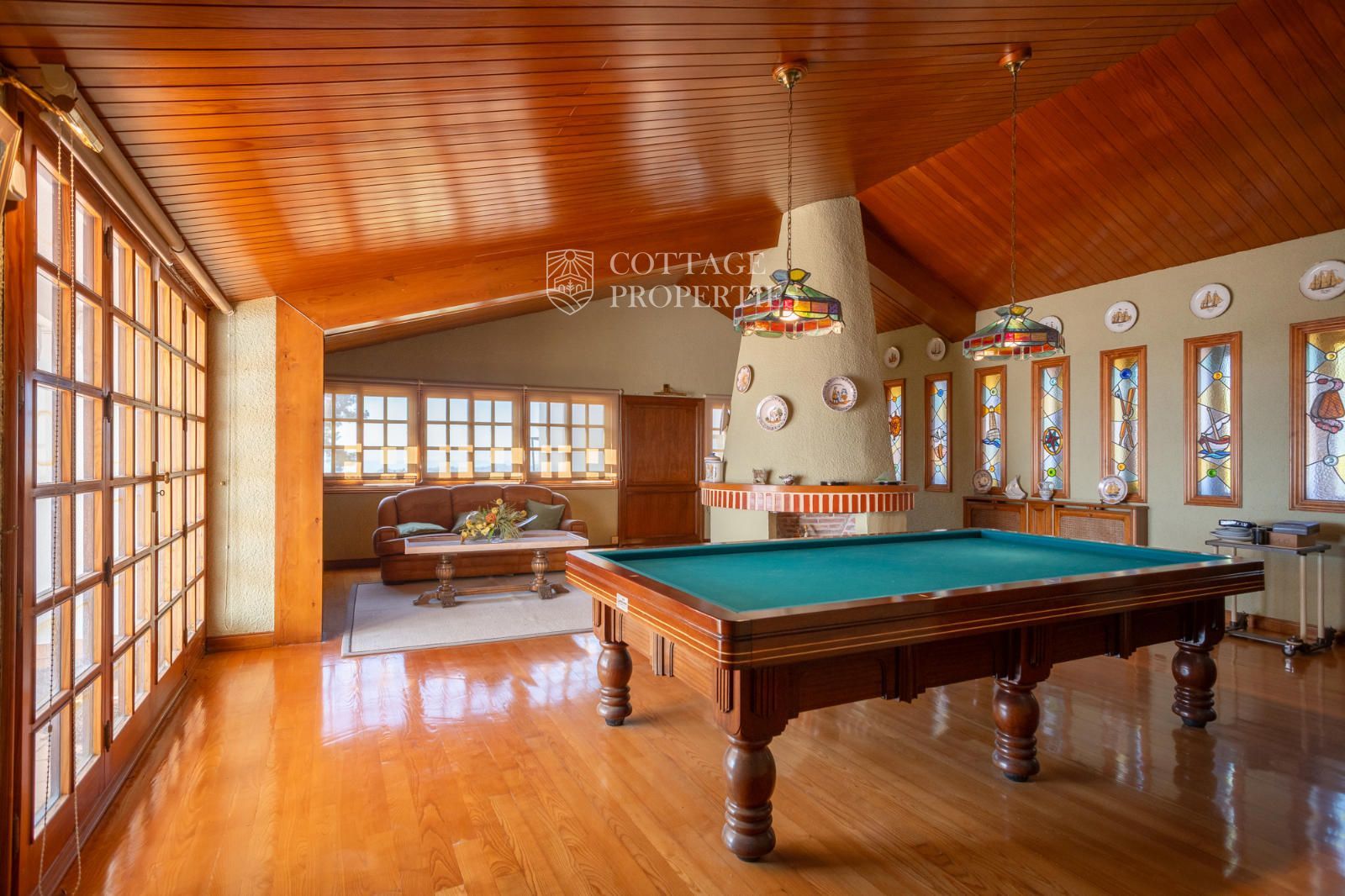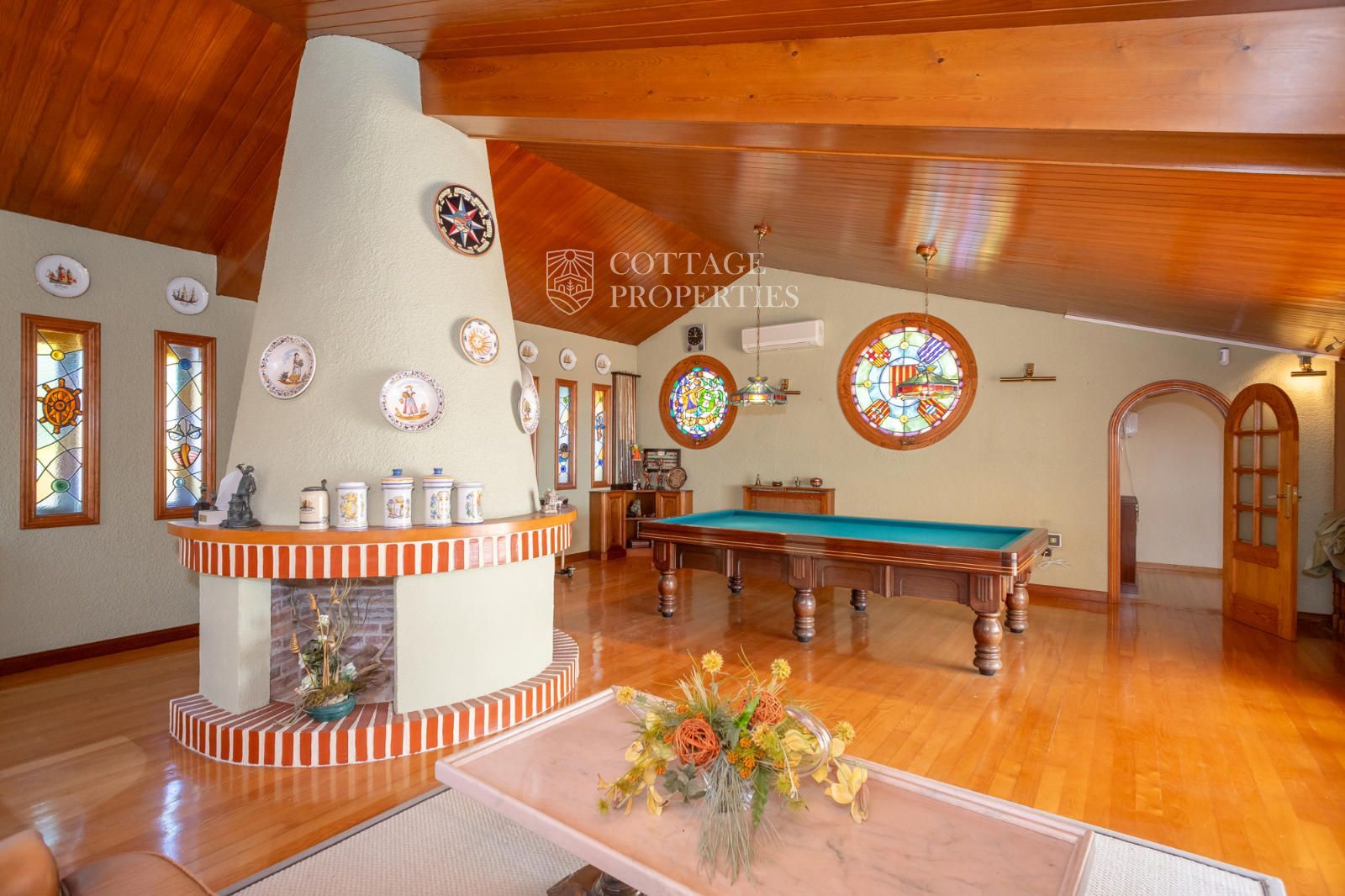 The upper floor features a bright multipurpose room with central fireplace and colorful stained glass windows, a billiards area, and access to a terrace with sea views. There is also a second room that can be used as a bedroom, along with two more bedrooms and a full bathroom—ideal for hosting guests or creating private spaces.