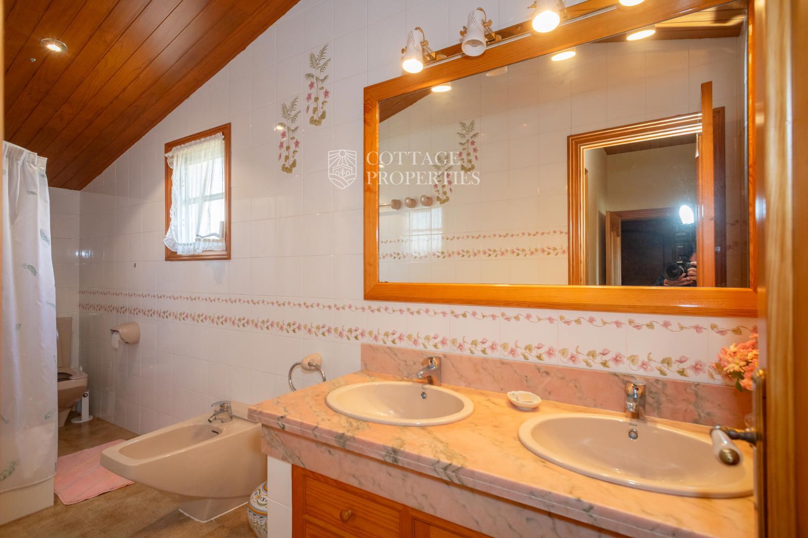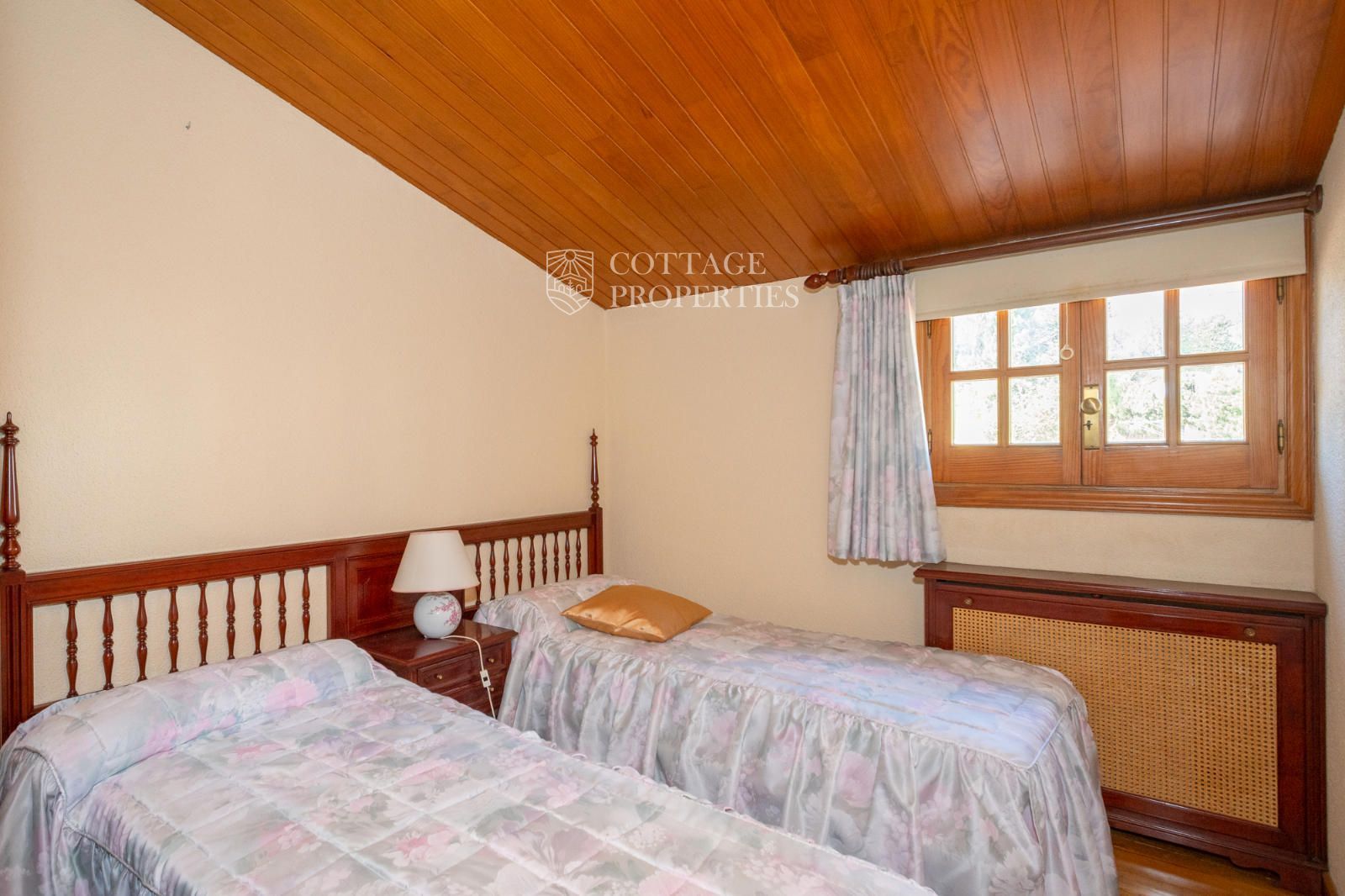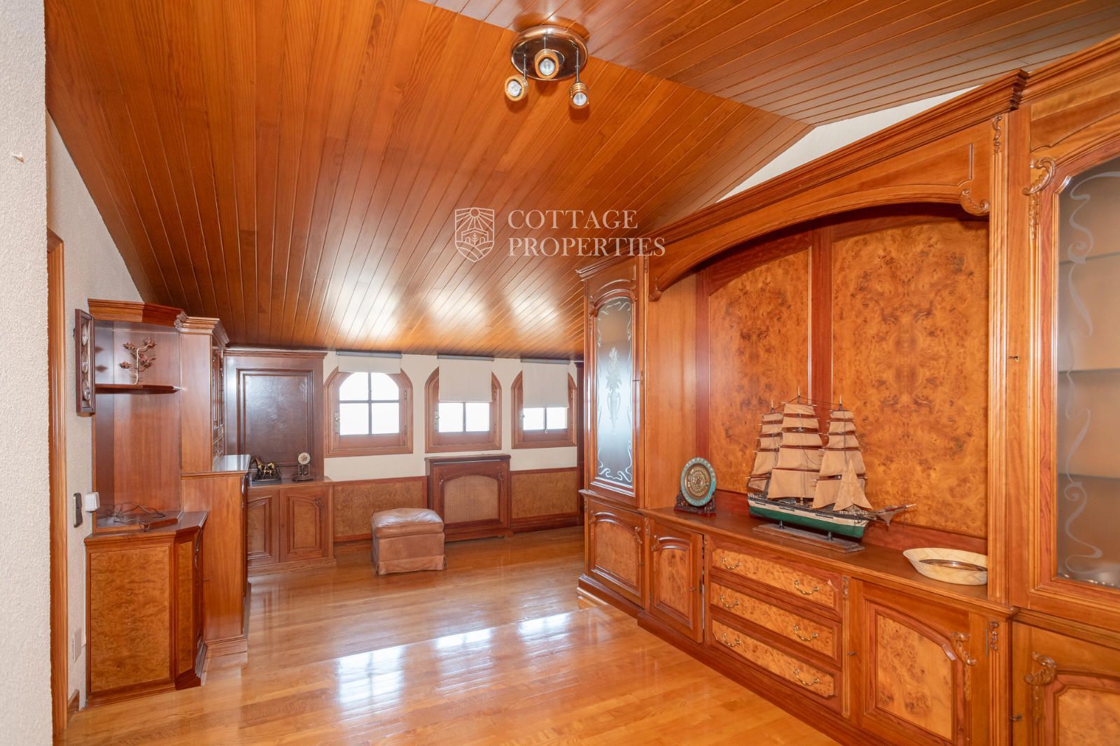 The villa includes an elegant entrance hall, a wine cellar for connoisseurs, a party room, a large garage with lift, and a technical room. On the main floor there are four bedrooms, one of them en suite, as well as a double living-dining room with fireplace, a fully equipped independent kitchen, pantry, and laundry room. All rooms have access to the main terrace, which offers stunning views and connects to the indoor pool with hydromassage.