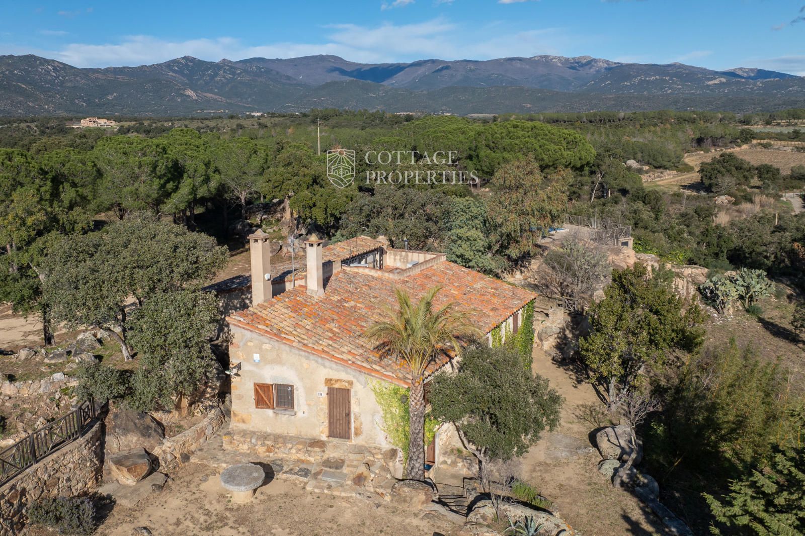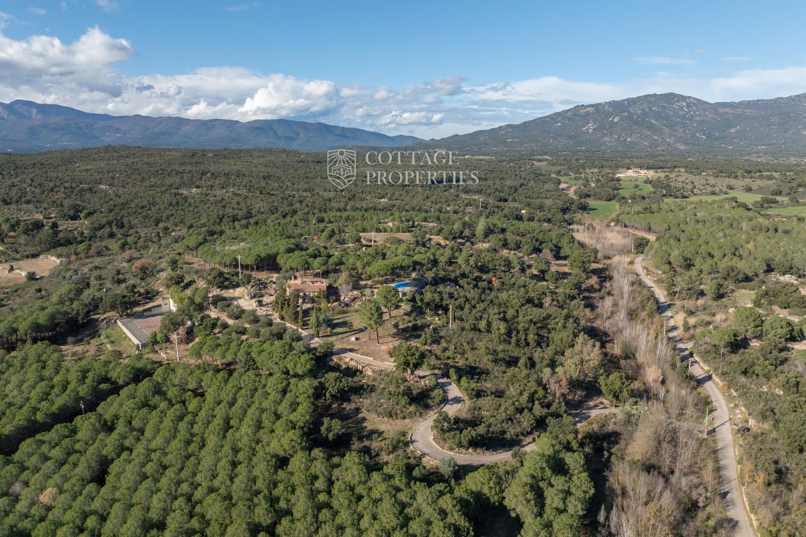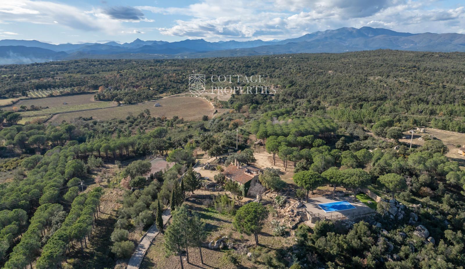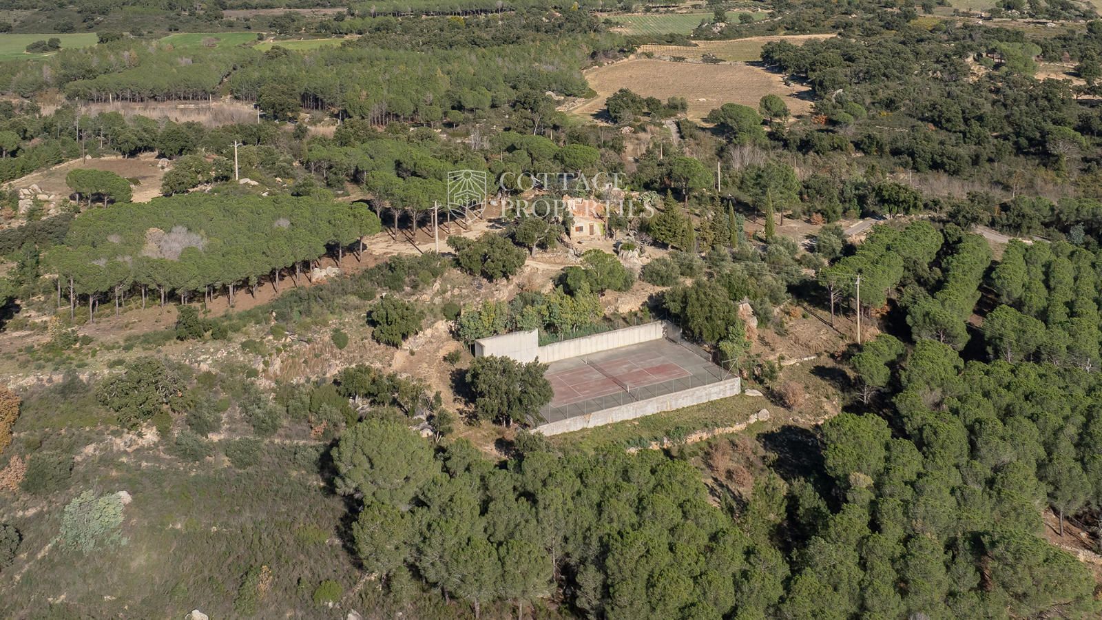 protect, and with extraordinary views of the town and the Albera mountain range. Also, close to the house, taking advantage of the unevenness of the old vineyards, we find the tennis court, protected by a concrete wall that is used as a pediment.