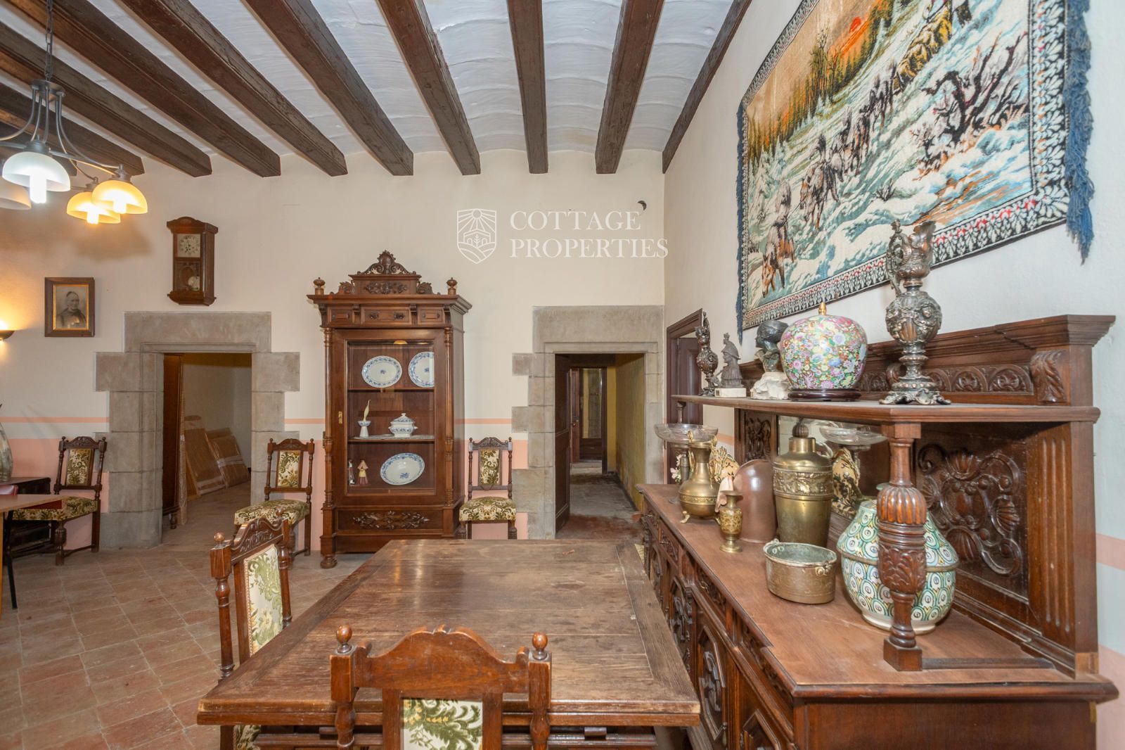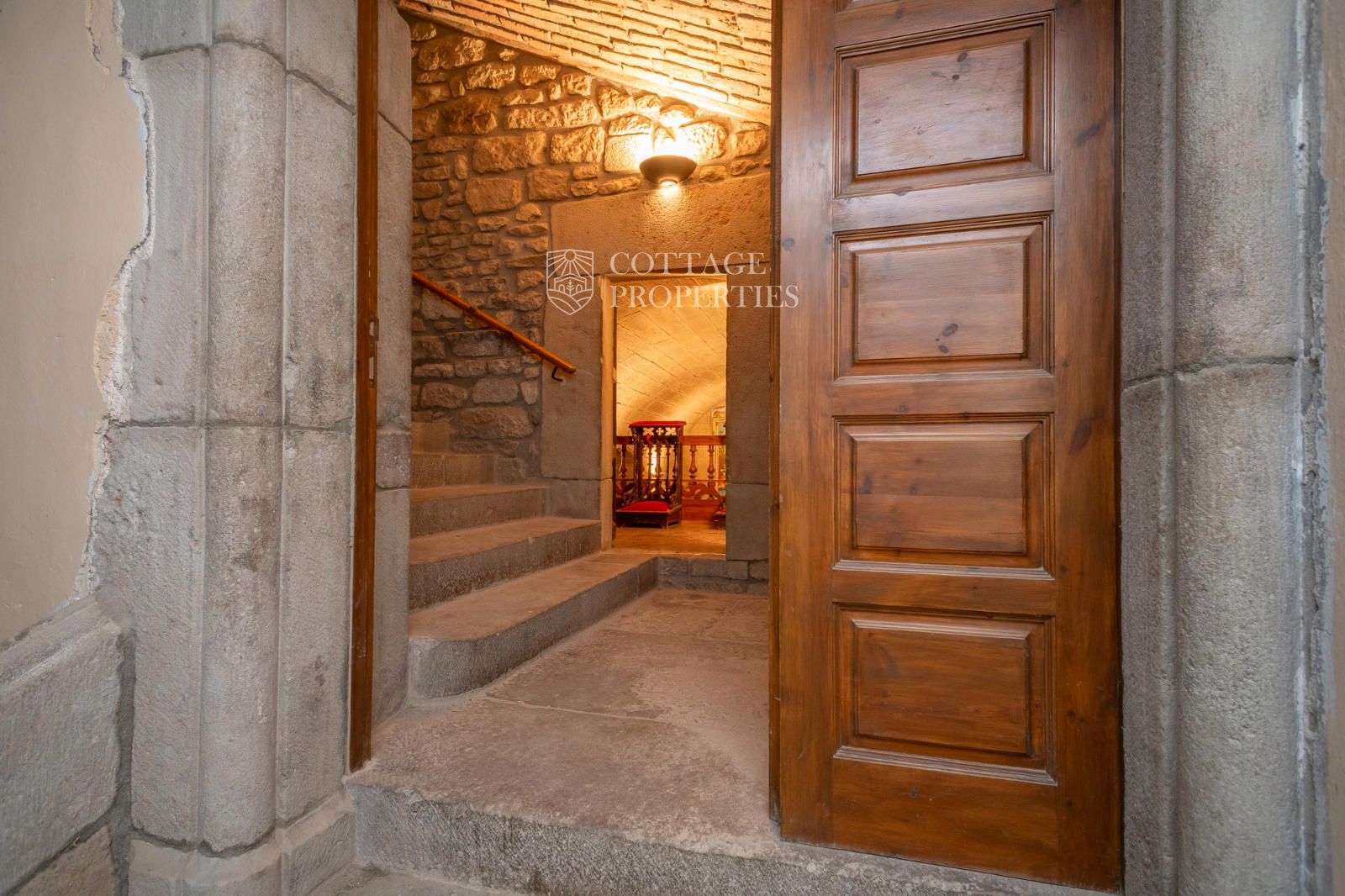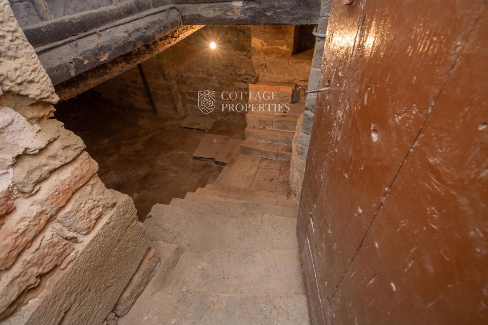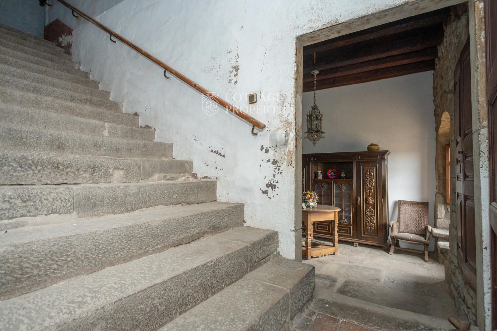 The property includes the main house, a chapel, and several covered spaces and storage areas, totaling approximately 1,200 m². The main house is distributed over the ground floor, two upper floors, and an attic. The first floor has been recently restored, maintaining original architectural elements such as the original flooring and wooden beams in the ceiling. The stone entrance with direct access to the chapel and the original central staircase are notable features of this floor.