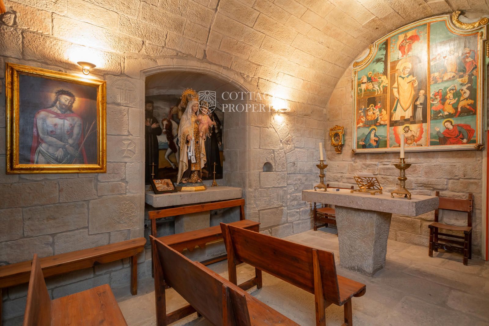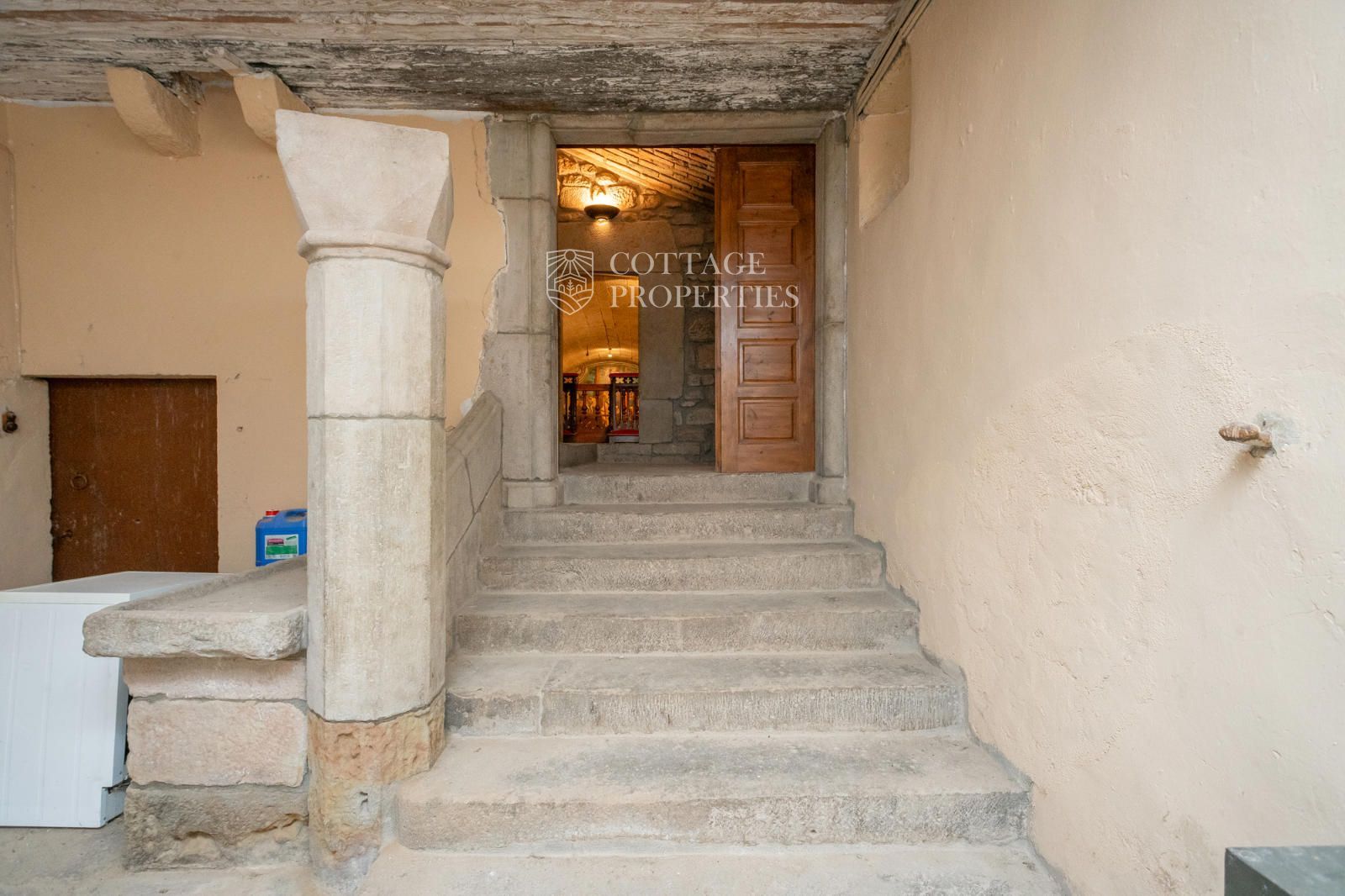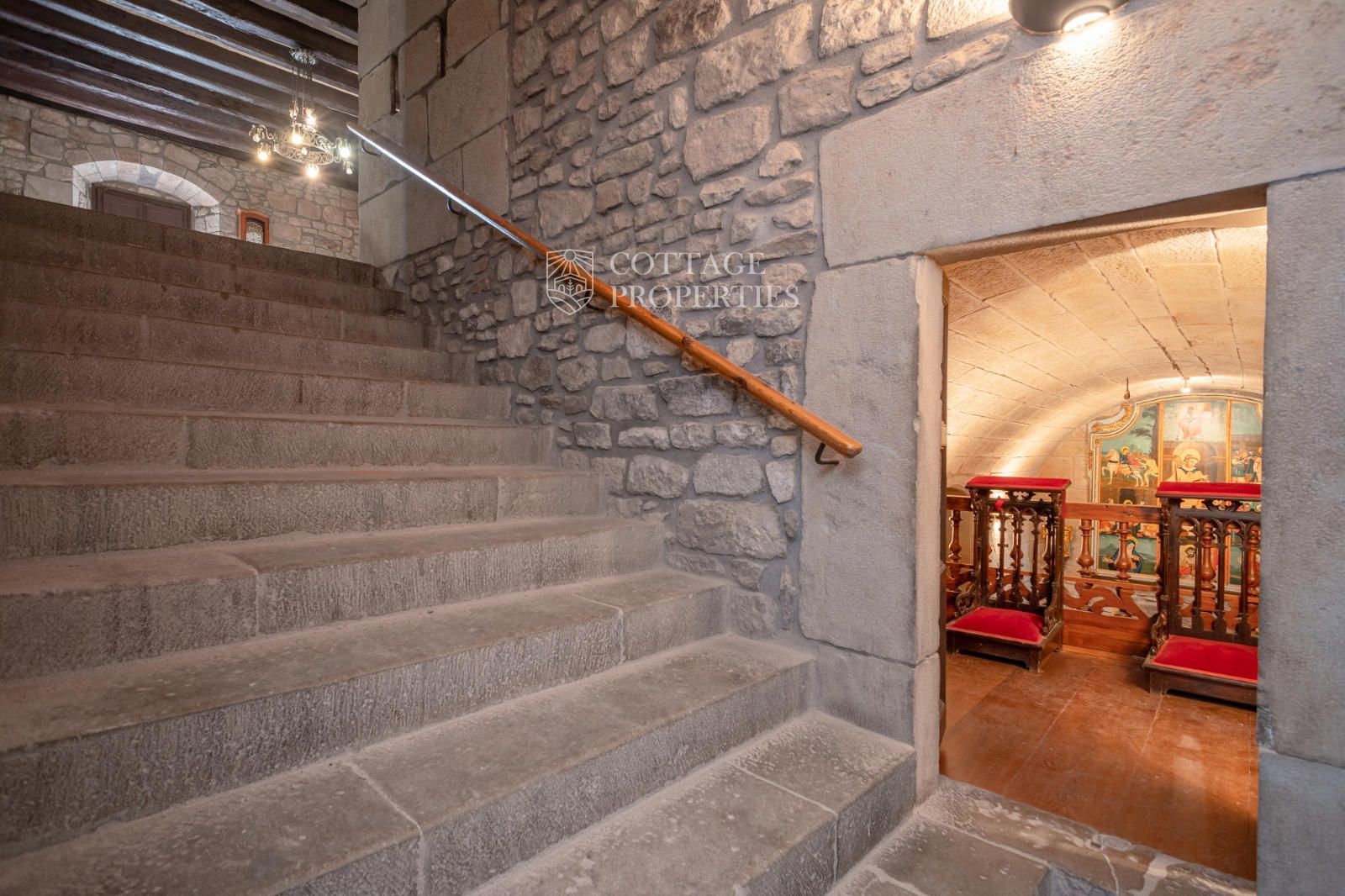 The property includes the main house, a chapel, and several covered spaces and storage areas, totaling approximately 1,200 m². The main house is distributed over the ground floor, two upper floors, and an attic. The first floor has been recently restored, maintaining original architectural elements such as the original flooring and wooden beams in the ceiling. The stone entrance with direct access to the chapel and the original central staircase are notable features of this floor.