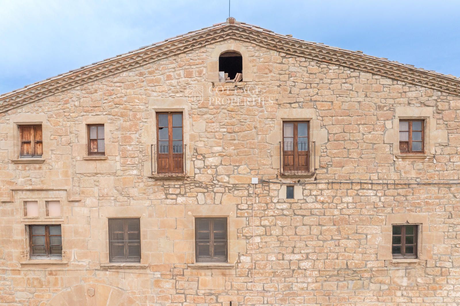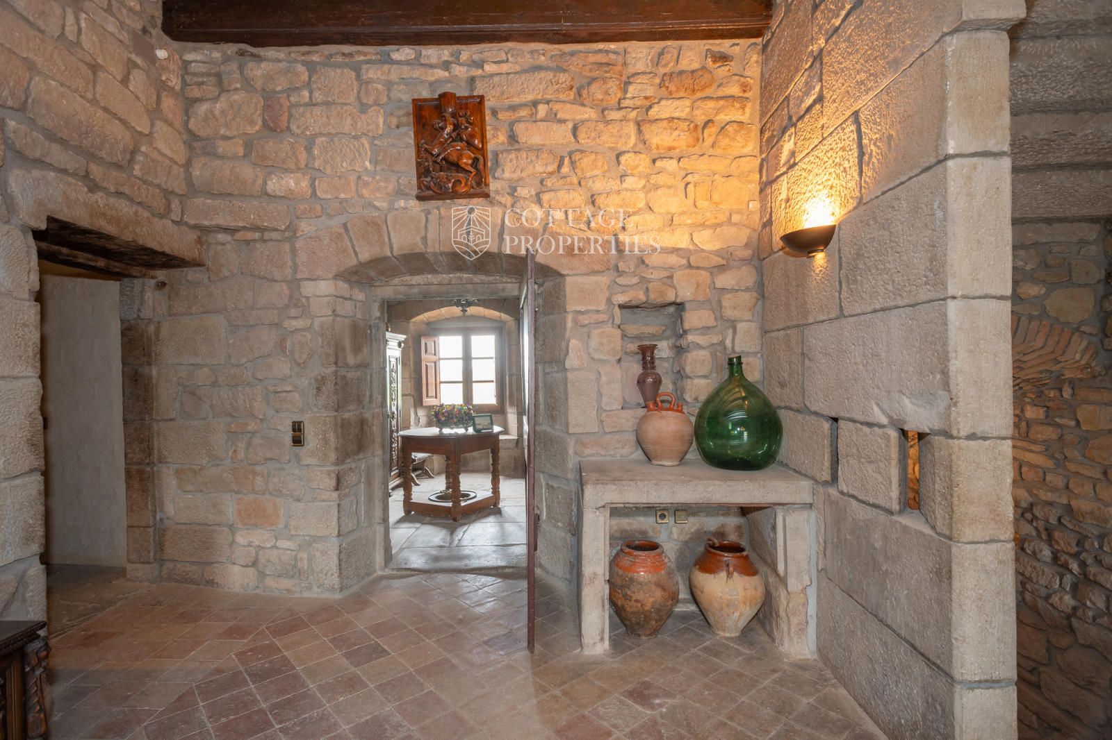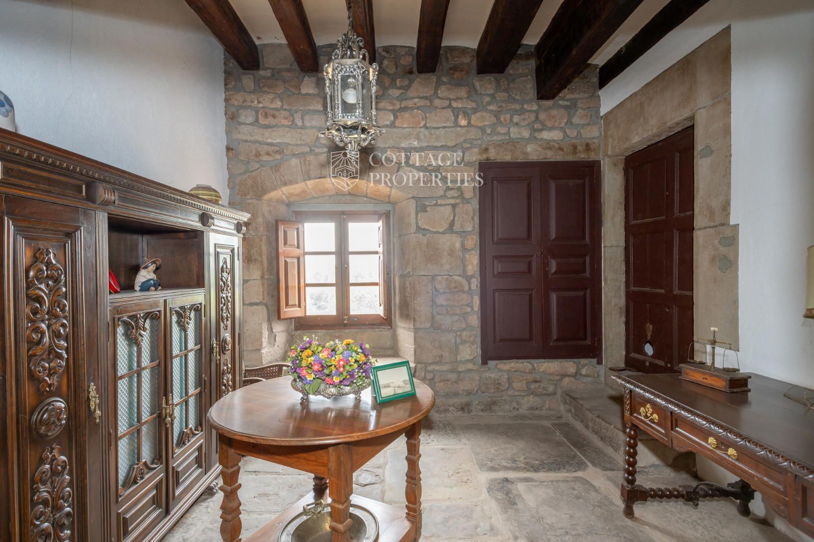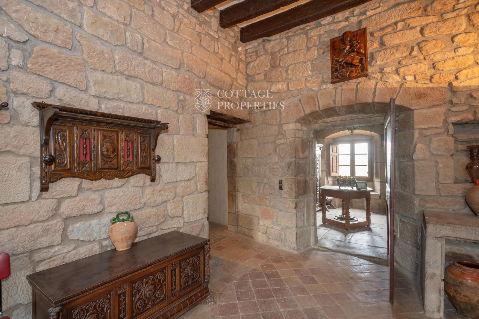 The property includes the main house, a chapel, and several covered spaces and storage areas, totaling approximately 1,200 m². The main house is distributed over the ground floor, two upper floors, and an attic. The first floor has been recently restored, maintaining original architectural elements such as the original flooring and wooden beams in the ceiling. The stone entrance with direct access to the chapel and the original central staircase are notable features of this floor.
