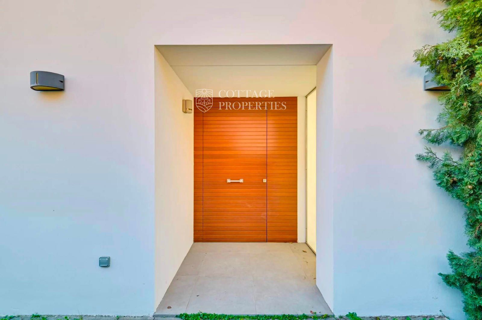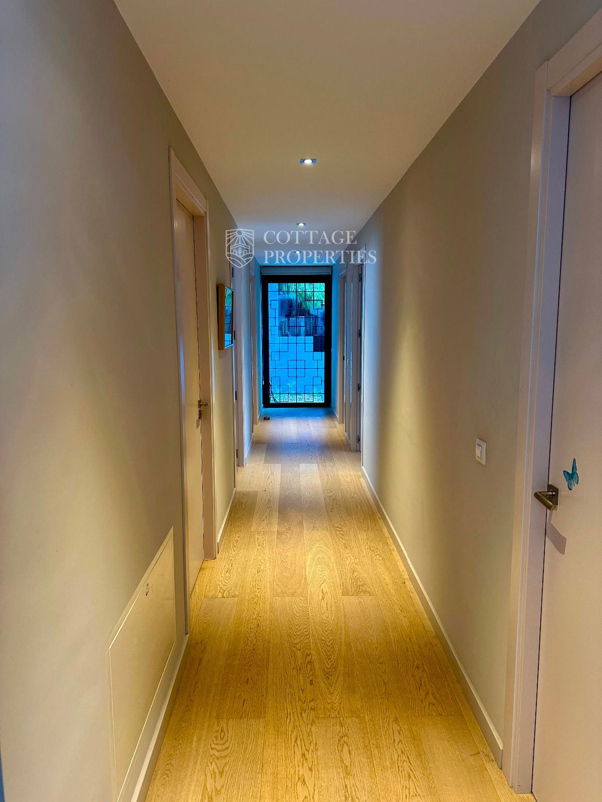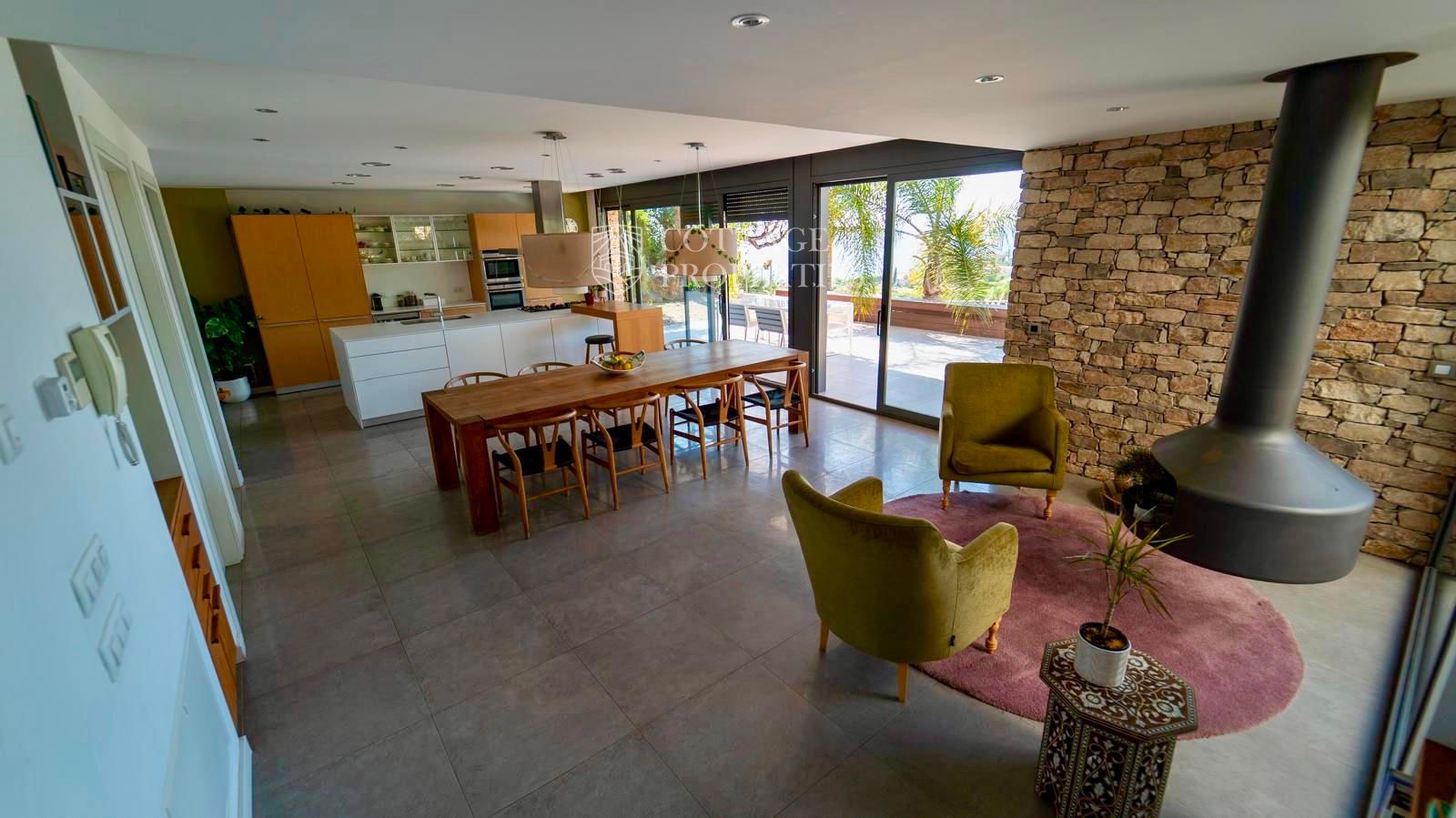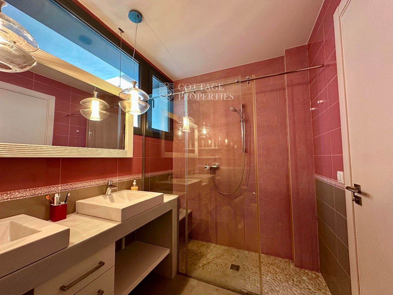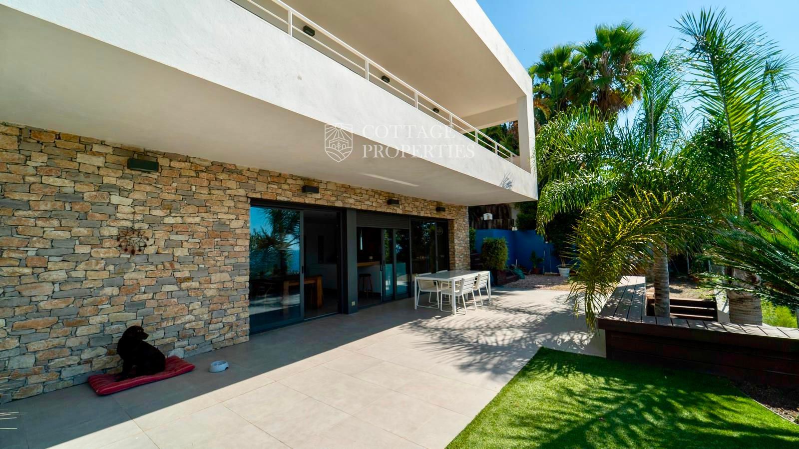 The outdoor areas include a private garden with an automated irrigation system, a designer pool with panoramic views of Cala San Francesc, and spacious terraces on all floors to enjoy the sea breeze