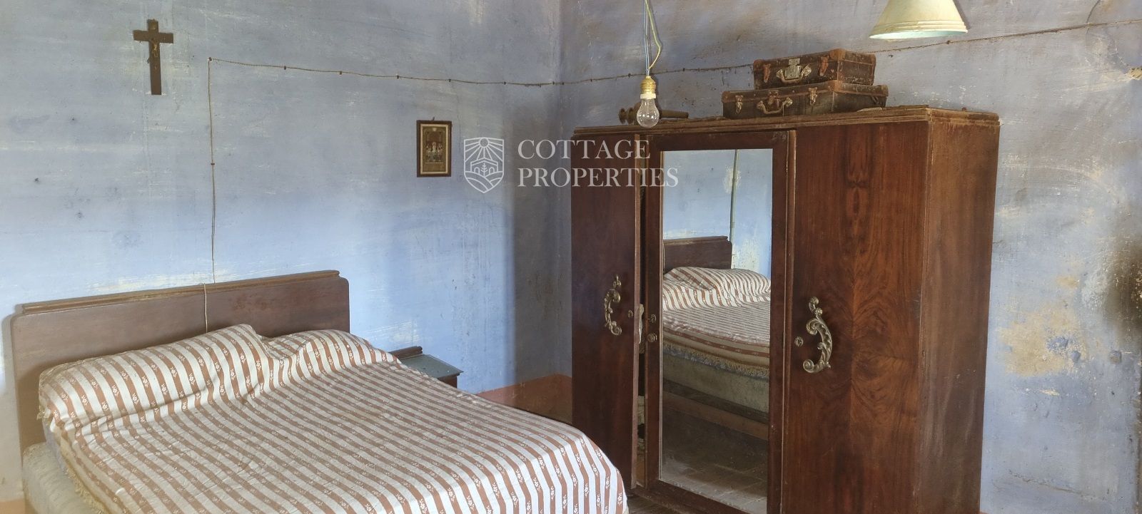 The farmhouse features a cozy entrance hall and an interior staircase connecting the two floors. Although the property is in need of renovation, the spaces allow for flexible distribution according to the future owner's needs. The main floor offers ample opportunities to design a living-dining area and a kitchen connected to the outdoor spaces. The views from all the rooms and from the main terrace promise to be impressive.