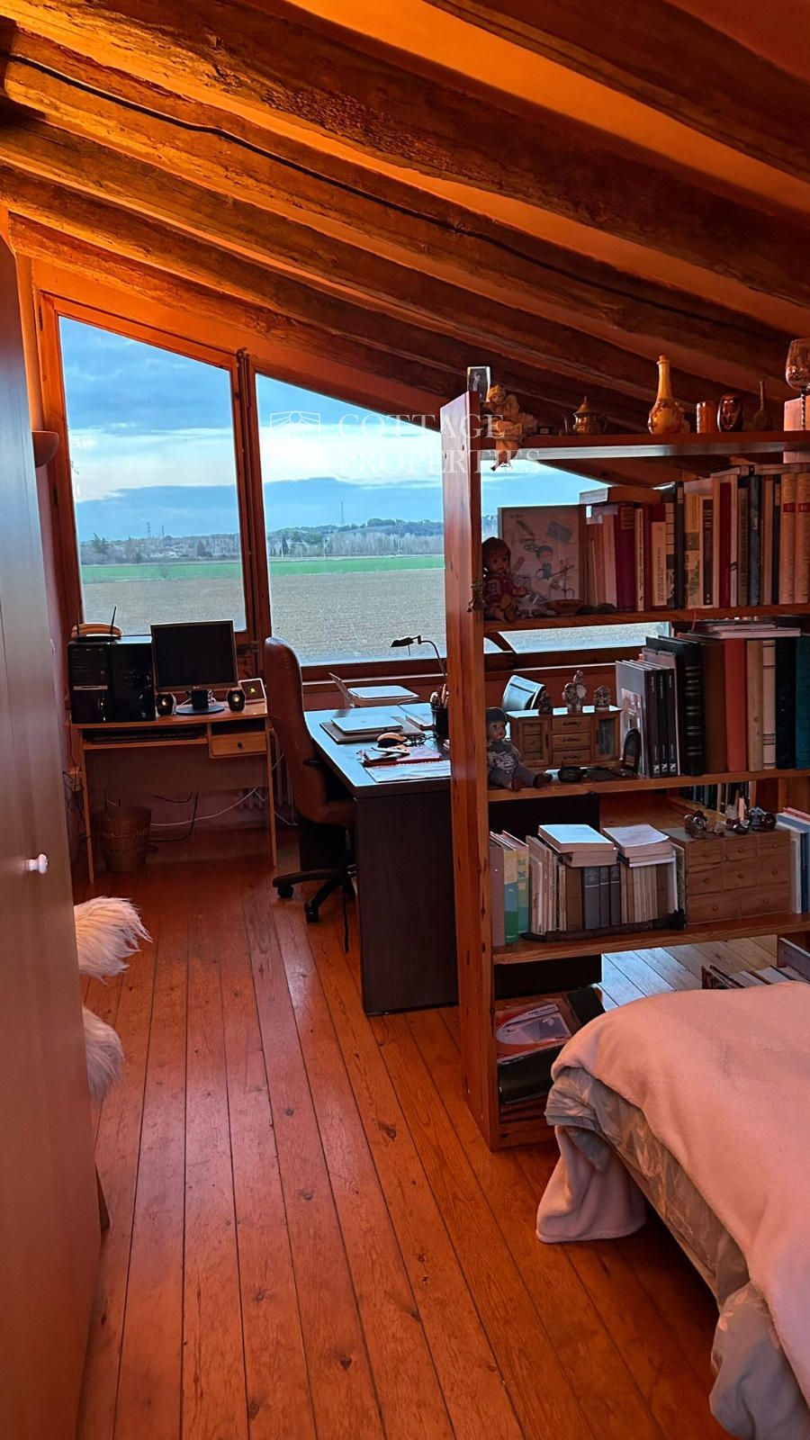 First Floor: Features a suite with an adjoining bathroom with a bathtub, two 12 m² bedrooms, a full bathroom with a bathtub, a dressing room, and a corridor-library. From the library, there is access to a large study-bedroom with views of the wheat fields.