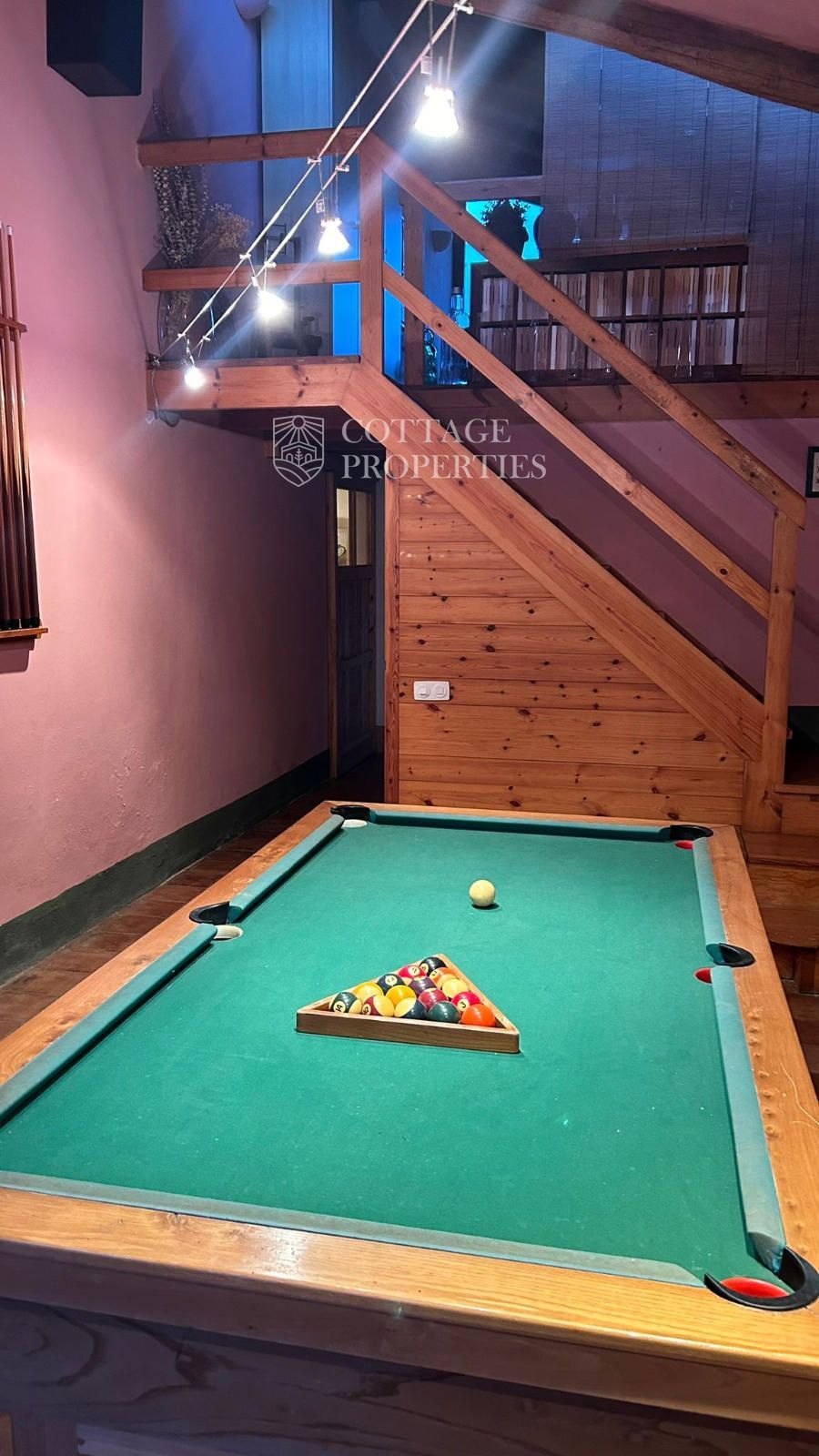 Ground Floor: Includes a reception area, kitchen-living room with fireplace and bread oven, dining room, living room with access to a porch with both interior and exterior fireplaces, library-billiard room, full WC with shower, storage room, freezer, laundry area, machine room with 500-liter hot water accumulator, oil heating, alarm system, water softener, and automatic irrigation.
