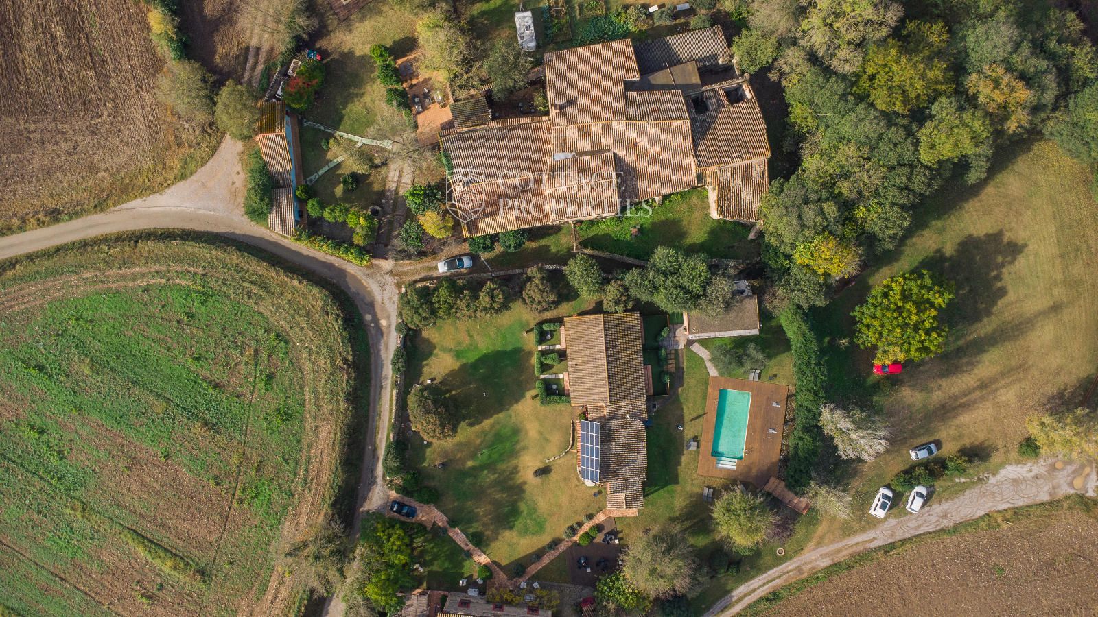 The building stands on a large plot with a garden, swimming pool, and chill-out area, within a small neighborhood of three properties, with the possibility of acquiring the adjacent ones to expand the complex.