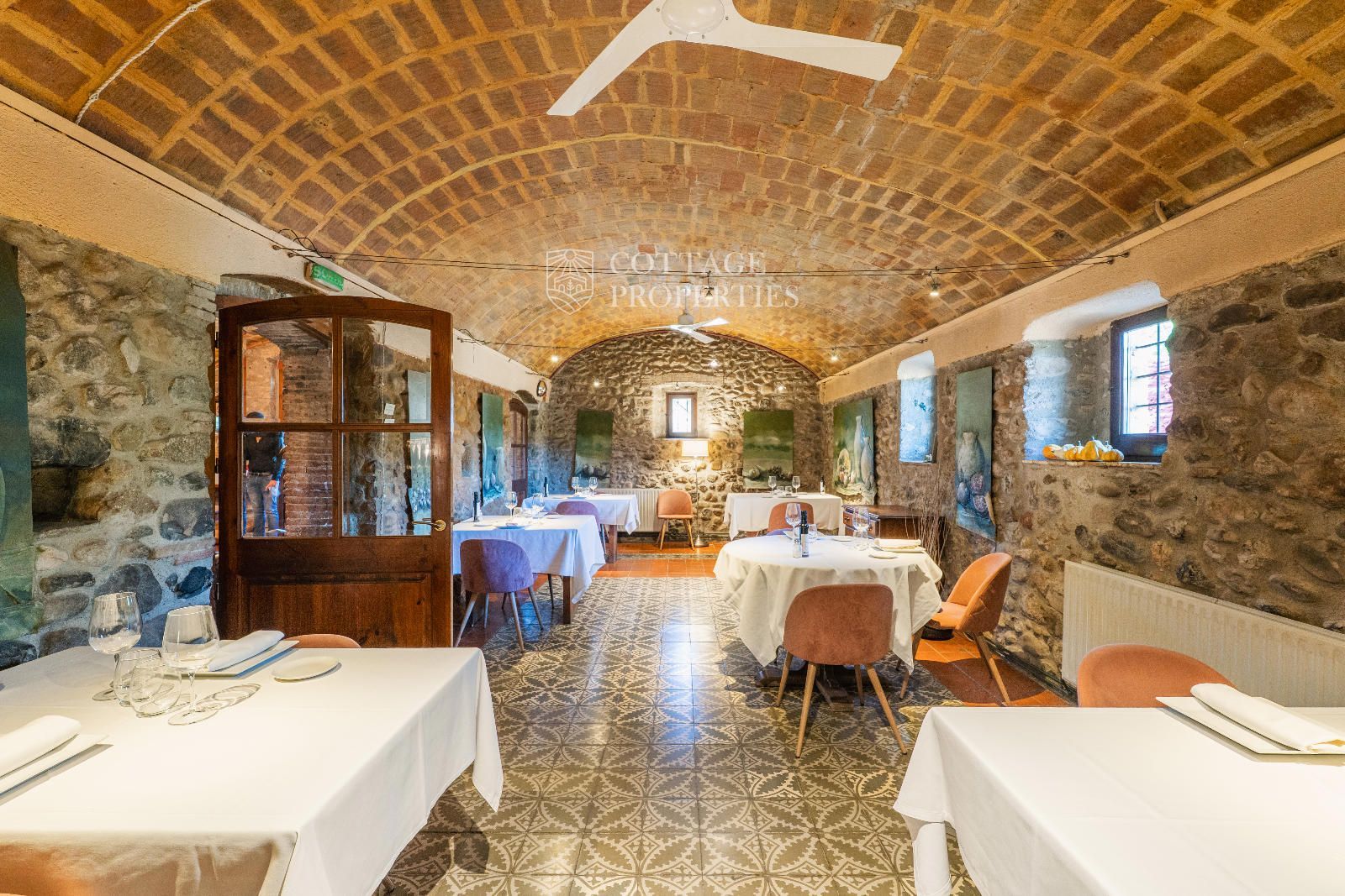 The ground floor houses the reception, a fully equipped industrial kitchen, two dining rooms with fireplaces, and a guest bathroom. The upper floors feature eight suites, four per level, with a cozy common lounge on the second floor. Additionally, the property offers three independent rooms, a fully equipped spa, and a private meeting or activity room.