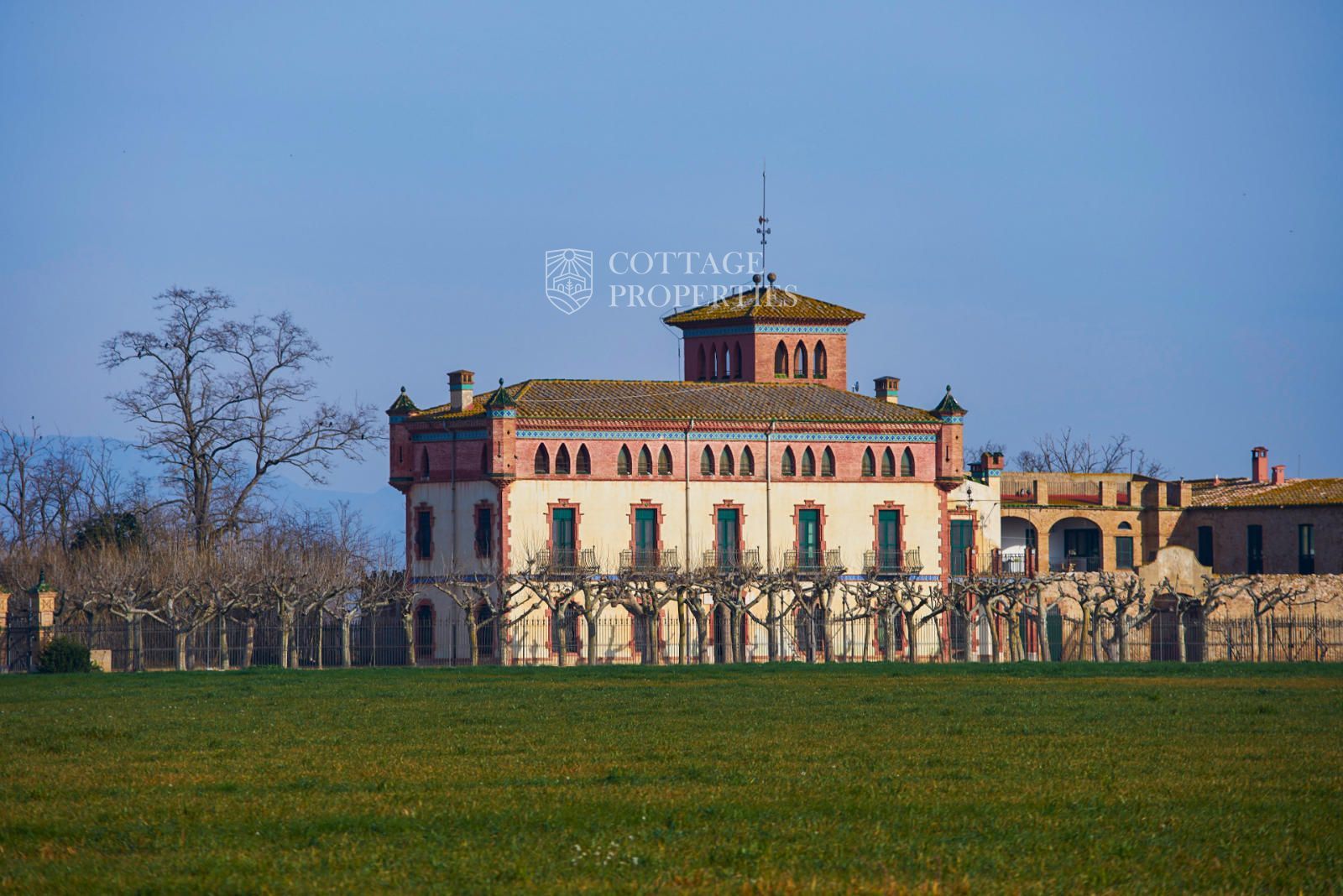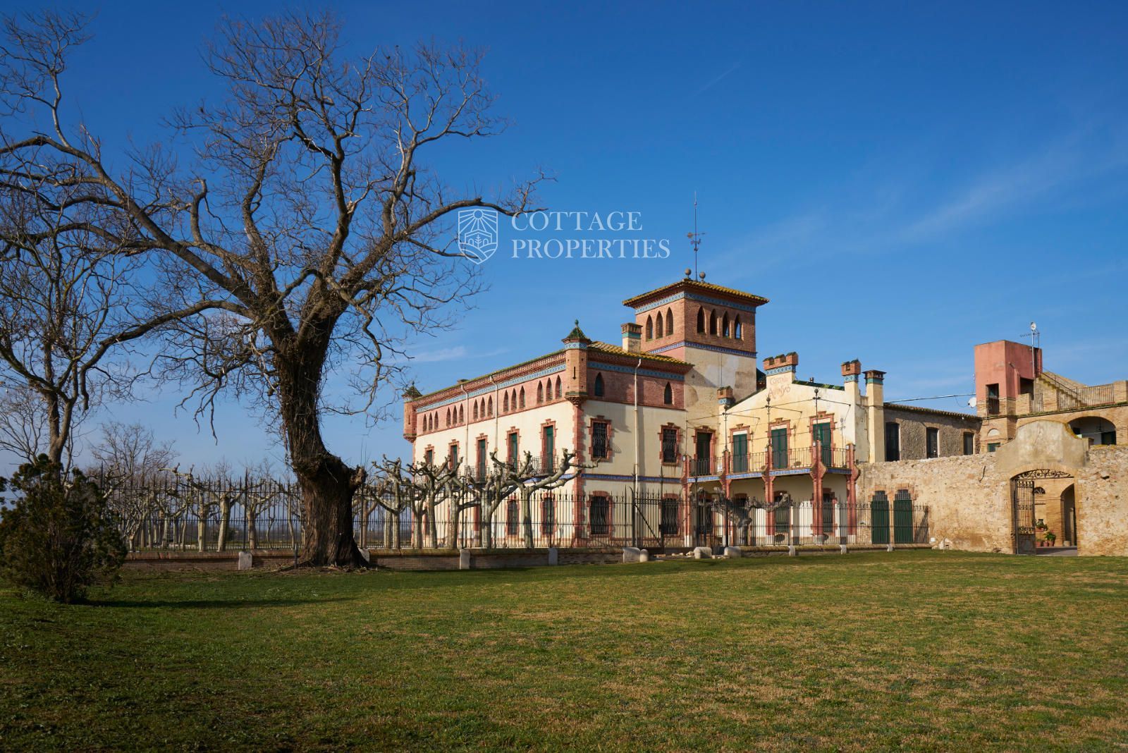 Majestuoso castillo histórico modernista bien conservado con jardines paisajísticos y torre imponente en Castelló d'Empúries