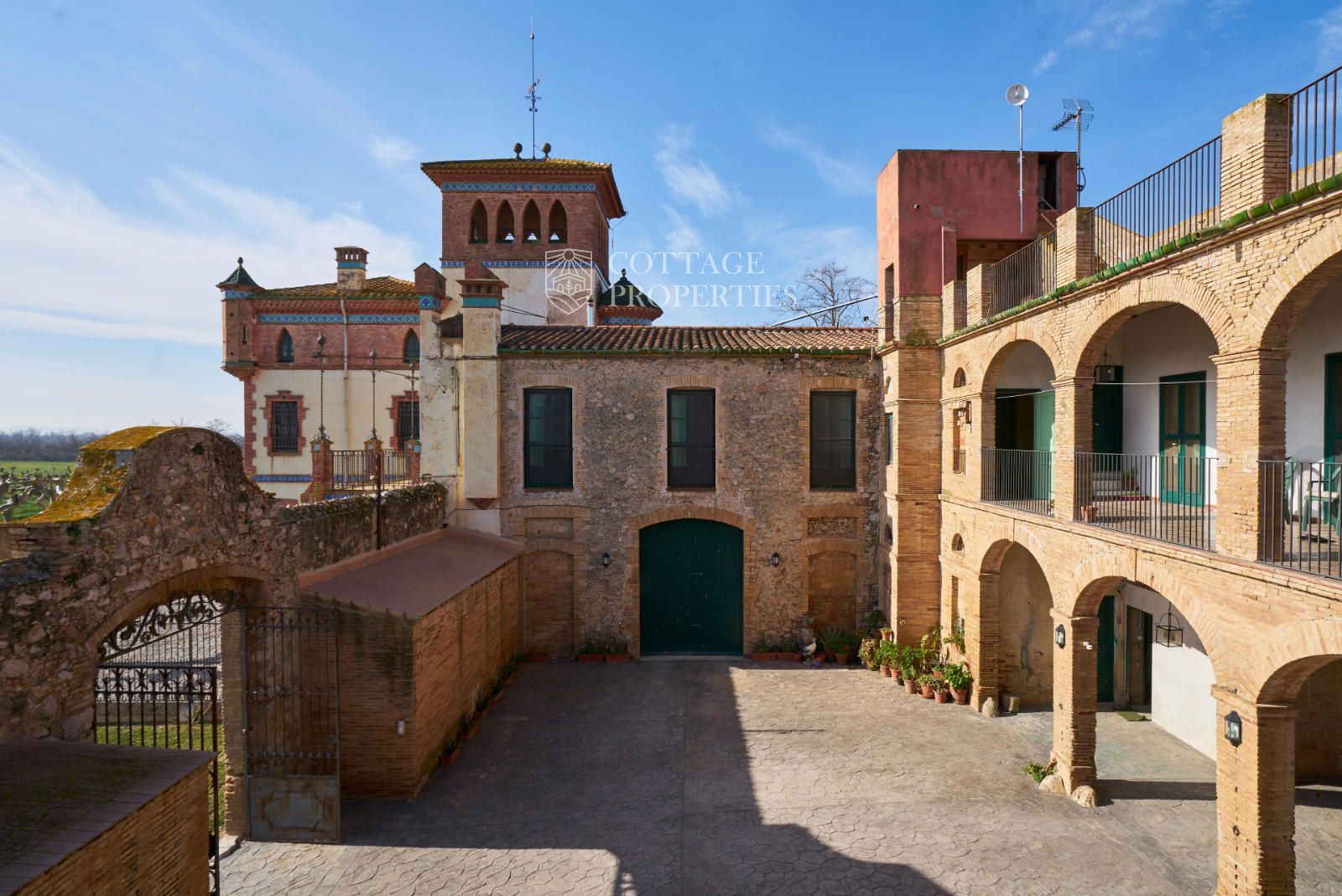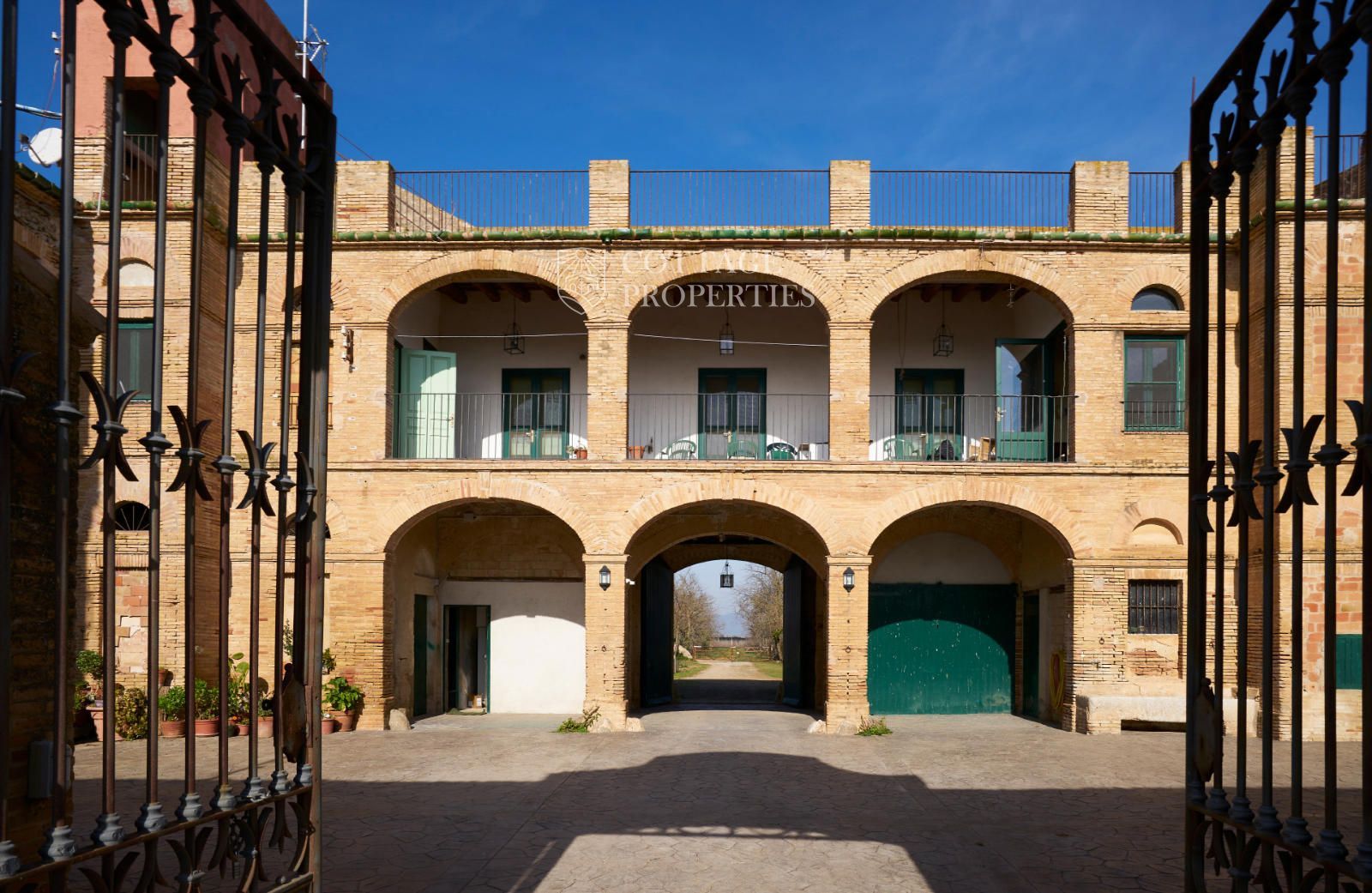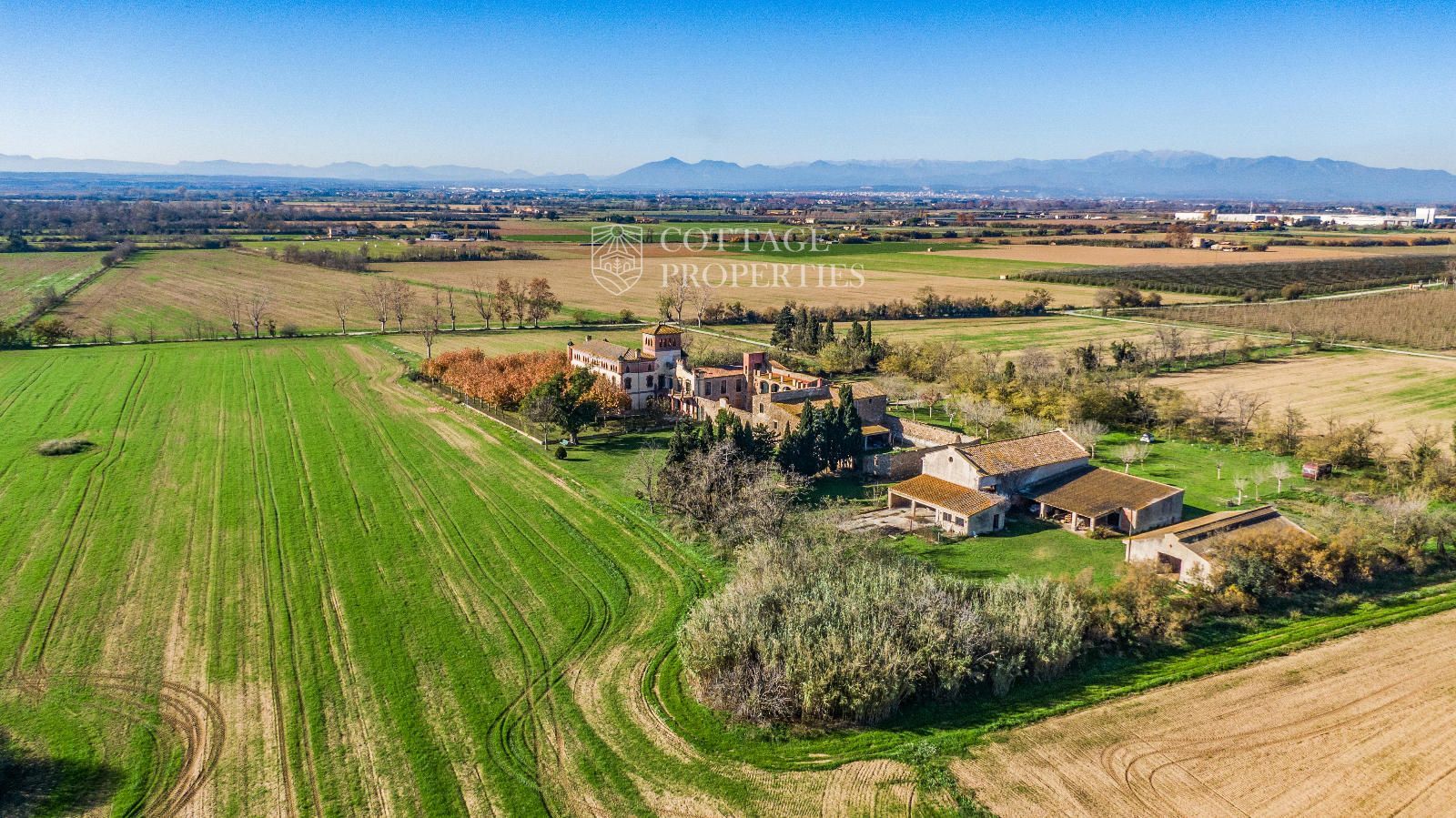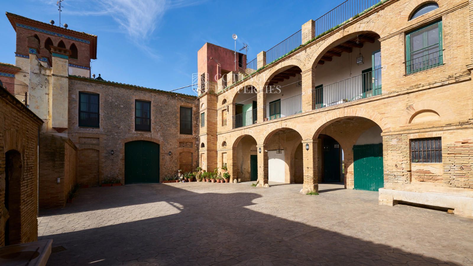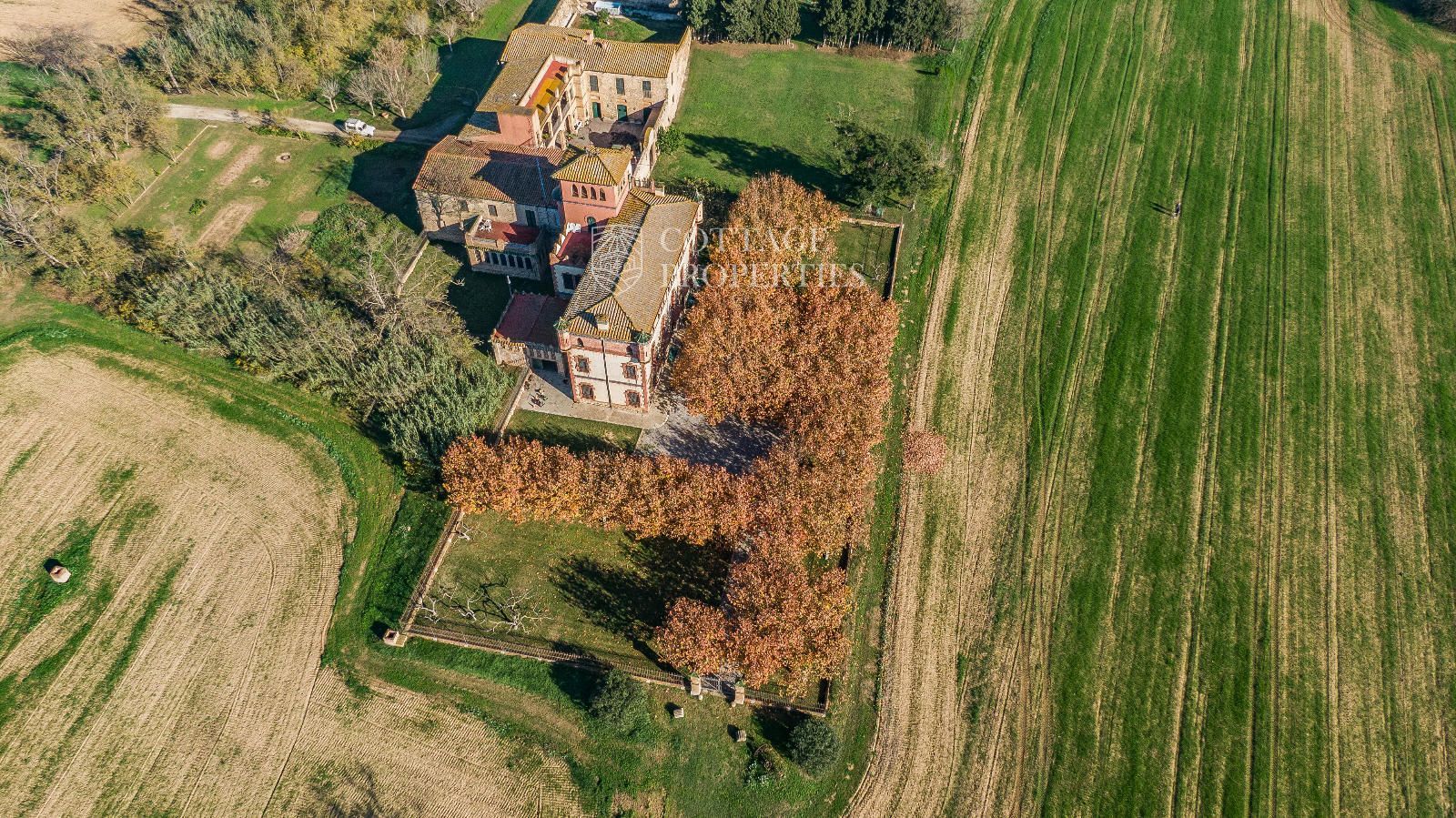 La propiedad cuenta con una superficie construida de 2.100 m² distribuidos en tres edificaciones: pajar, corral y el Cortal inicial, además del edificio modernista con tres garitas, una magnífica torre y vistas panorámicas de toda la comarca. El terreno de 23,26 hectáreas garantiza privacidad absoluta y un entorno espectacular.