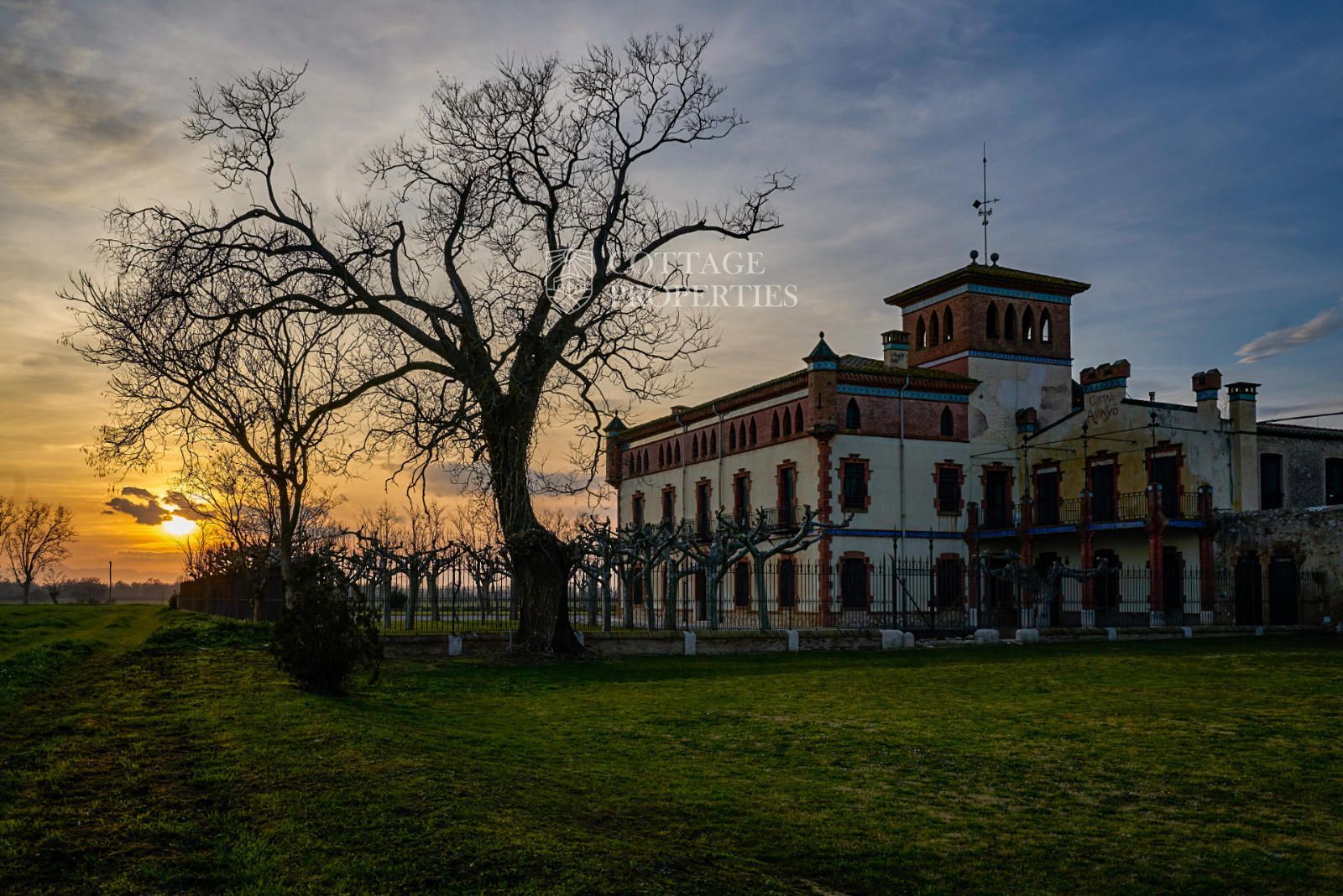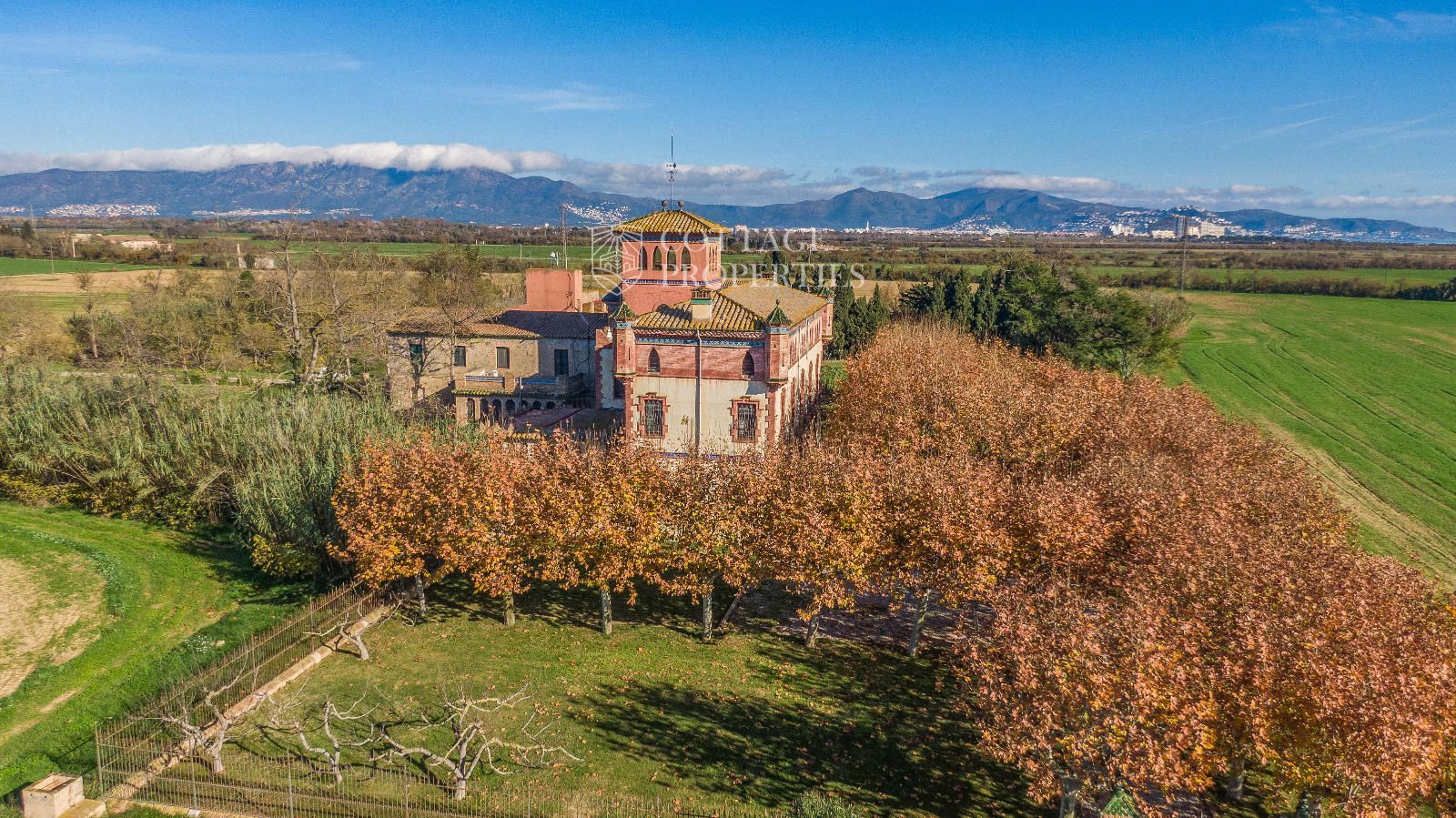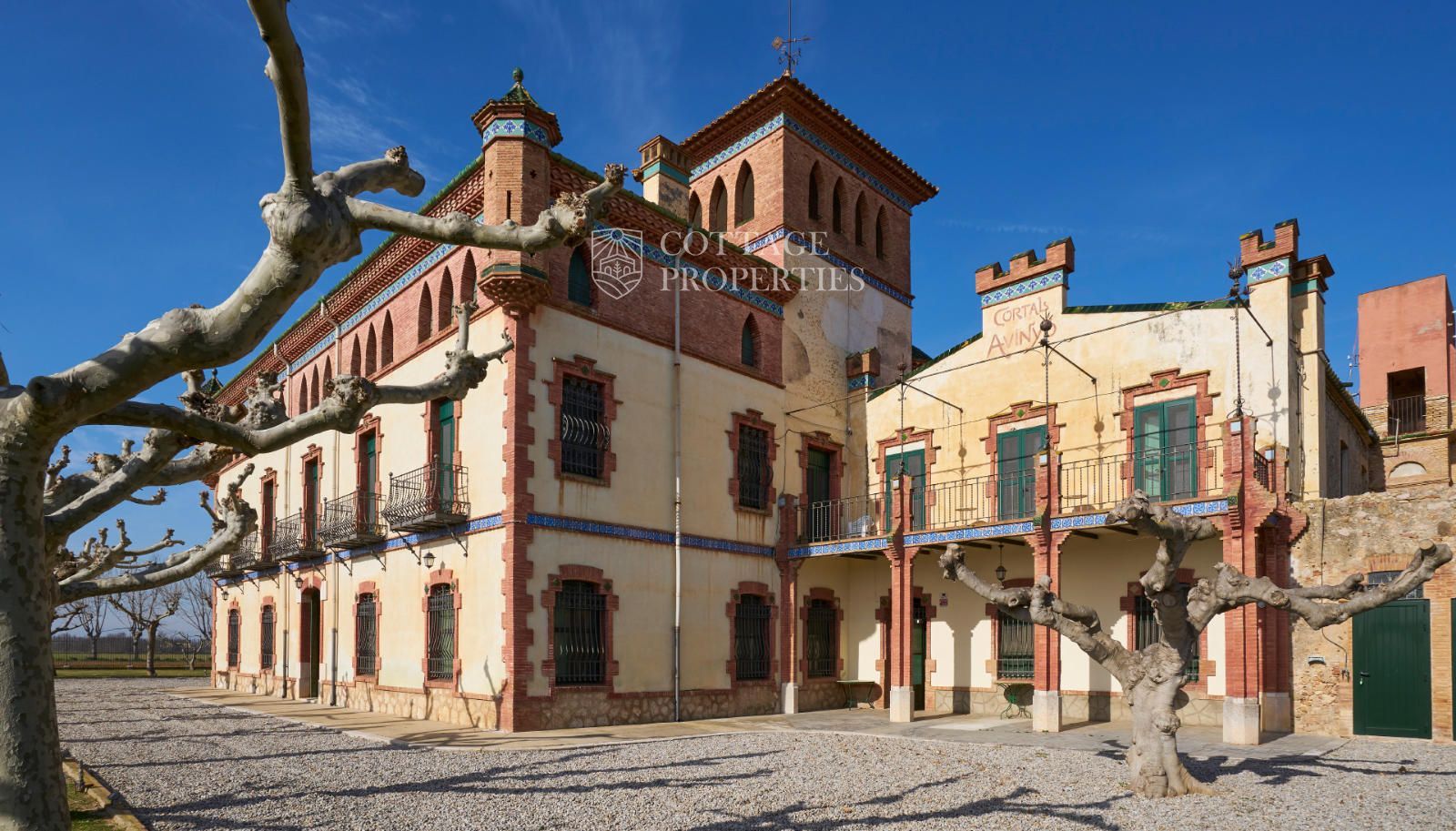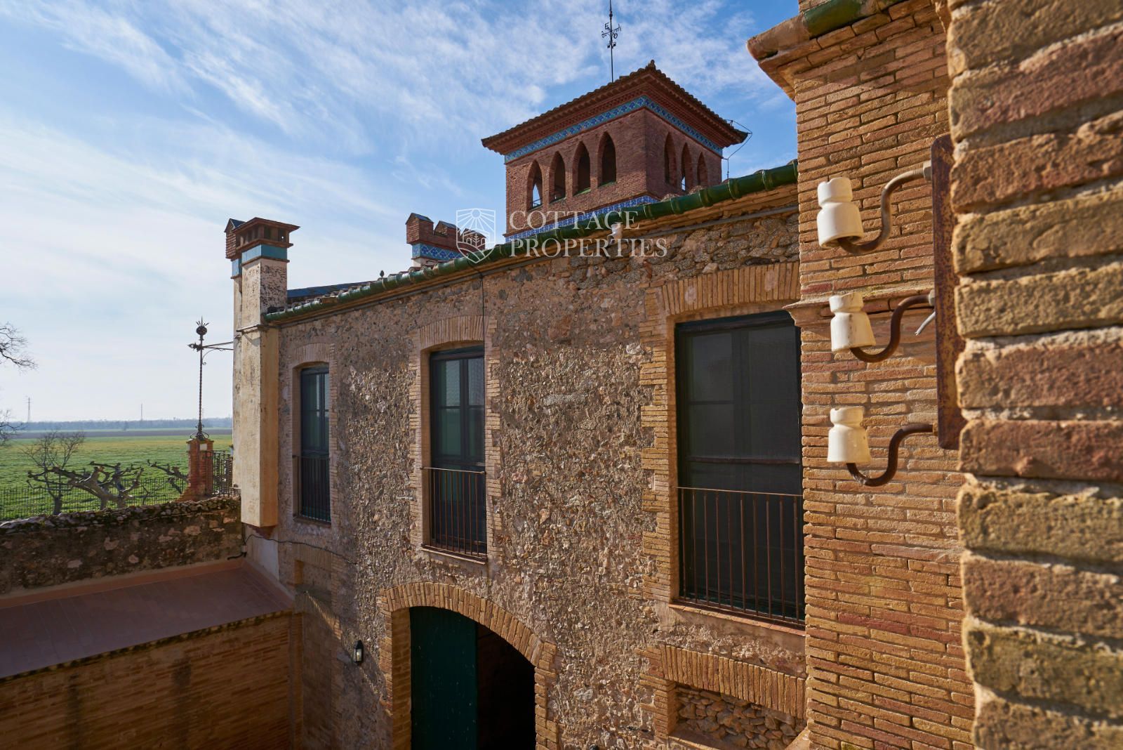 La propiedad cuenta con una superficie construida de 2.100 m² distribuidos en tres edificaciones: pajar, corral y el Cortal inicial, además del edificio modernista con tres garitas, una magnífica torre y vistas panorámicas de toda la comarca. El terreno de 23,26 hectáreas garantiza privacidad absoluta y un entorno espectacular.