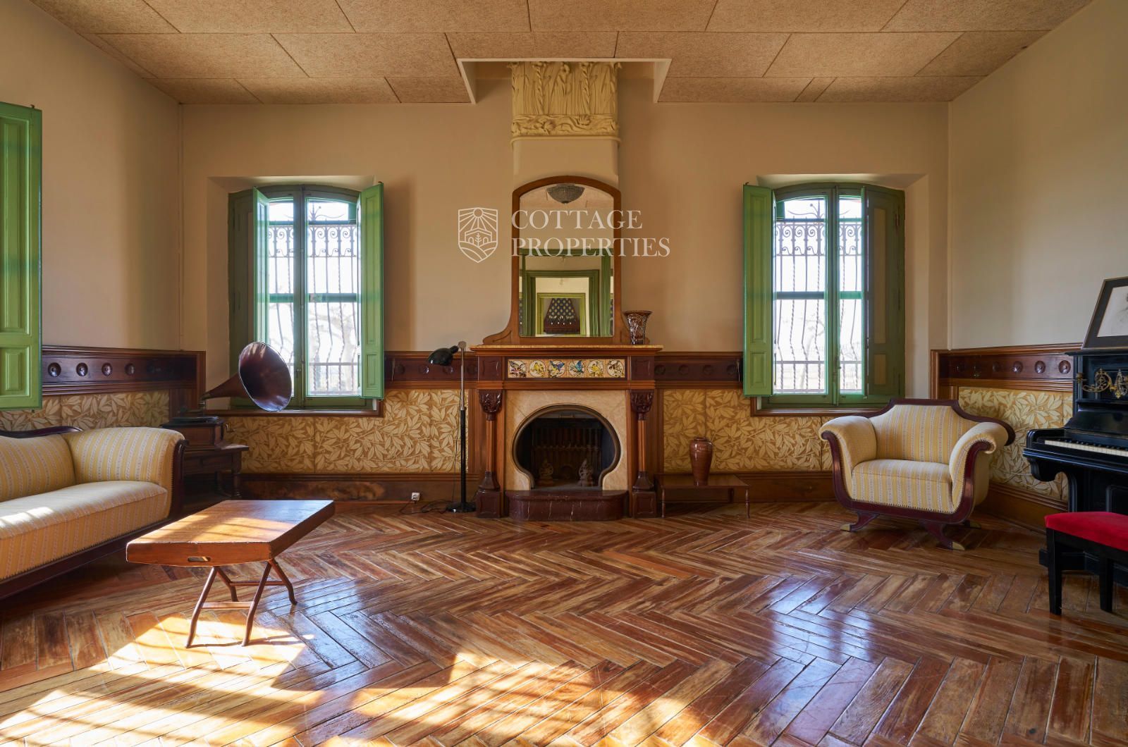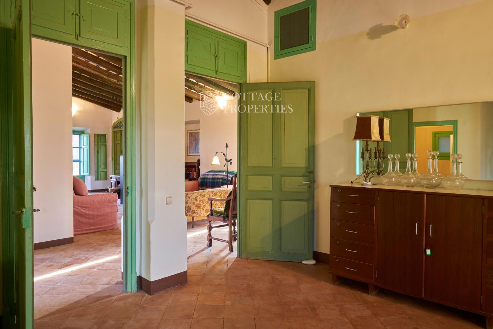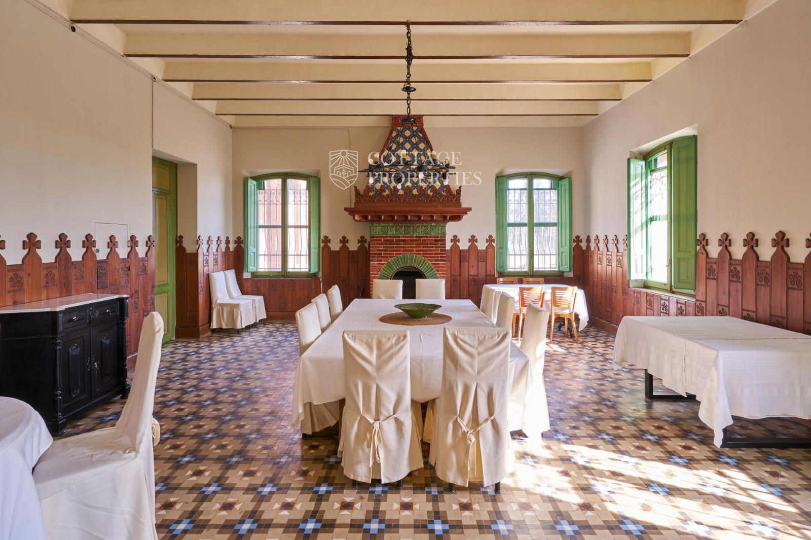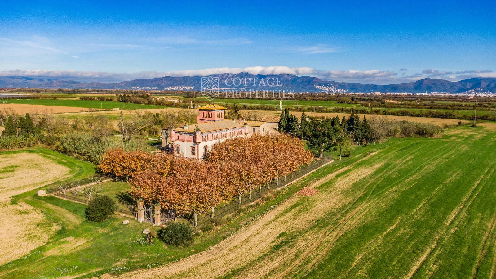 La propiedad cuenta con una superficie construida de 2.100 m² distribuidos en tres edificaciones: pajar, corral y el Cortal inicial, además del edificio modernista con tres garitas, una magnífica torre y vistas panorámicas de toda la comarca. El terreno de 23,26 hectáreas garantiza privacidad absoluta y un entorno espectacular.
