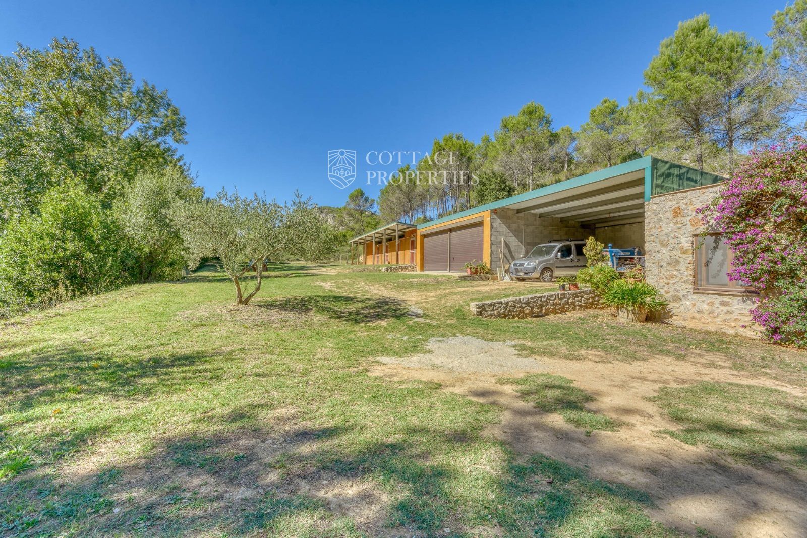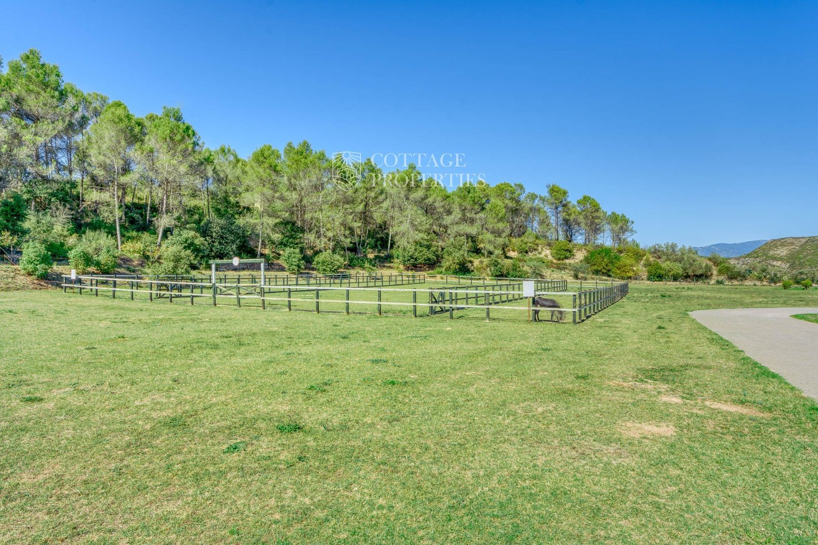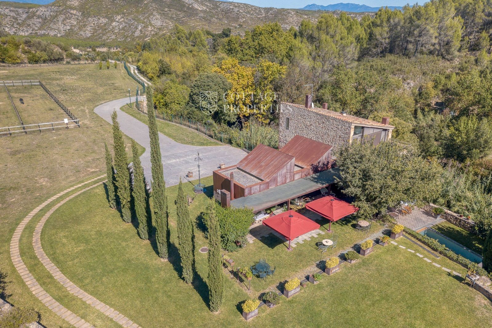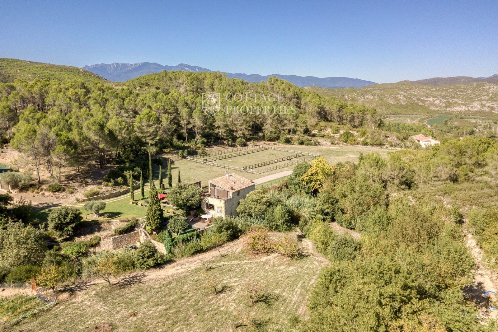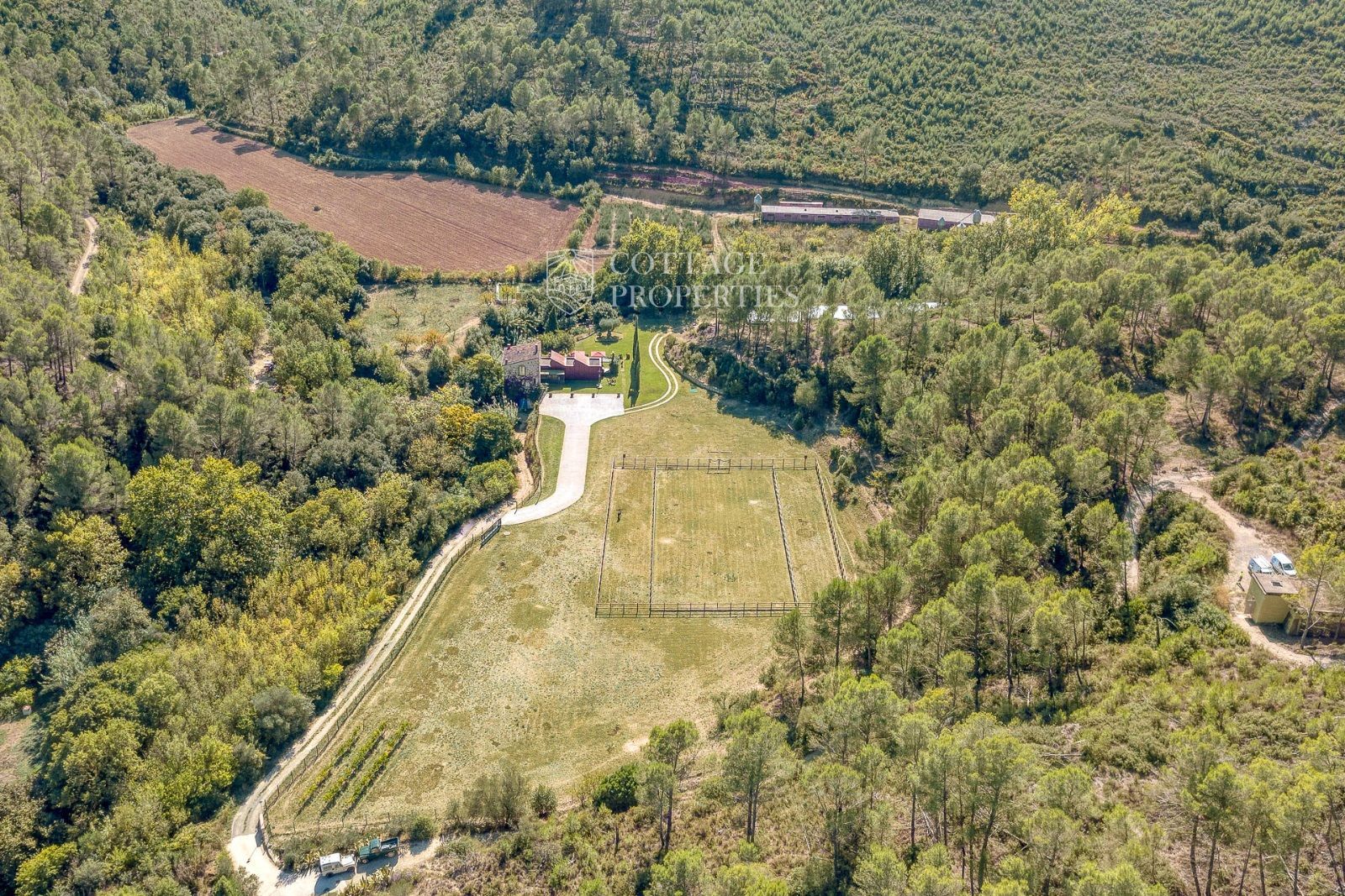 El exterior de la masía está diseñado para maximizar el disfrute del entorno natural. Incluye un jardín espacioso, una piscina refrescante y una terraza perfecta para relajarse al aire libre. También cuenta con boxes y una pista para caballos, lo que la convierte en un lugar ideal para los amantes de la equitación y la vida al aire libre.