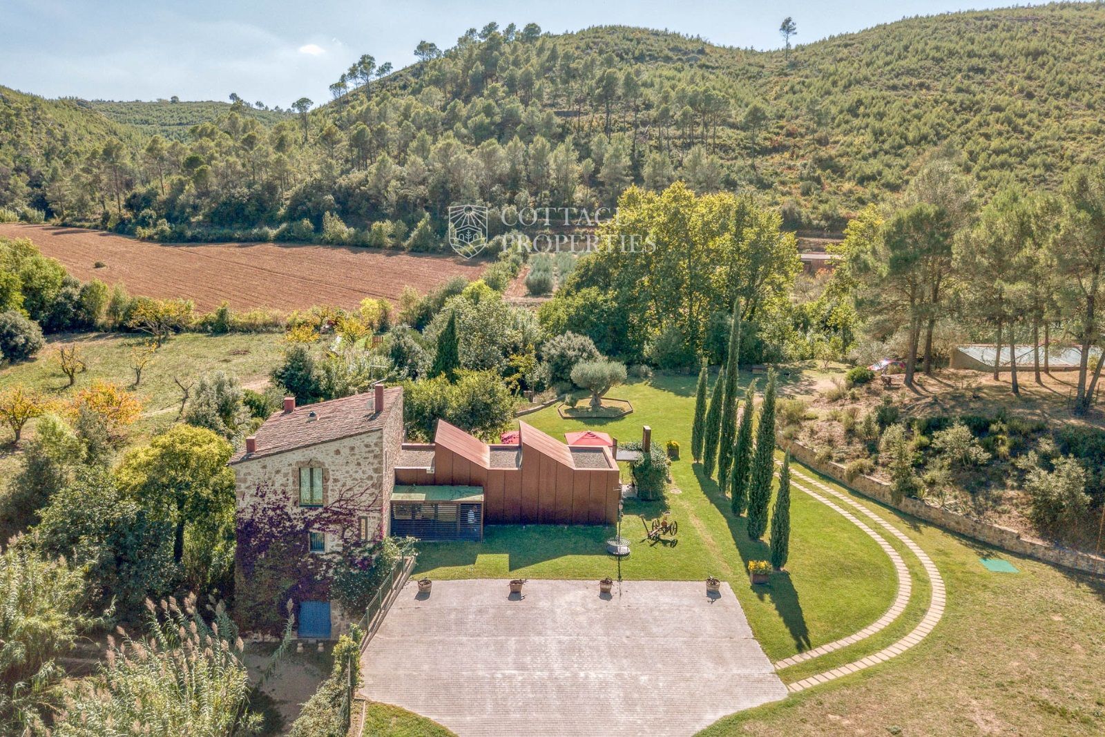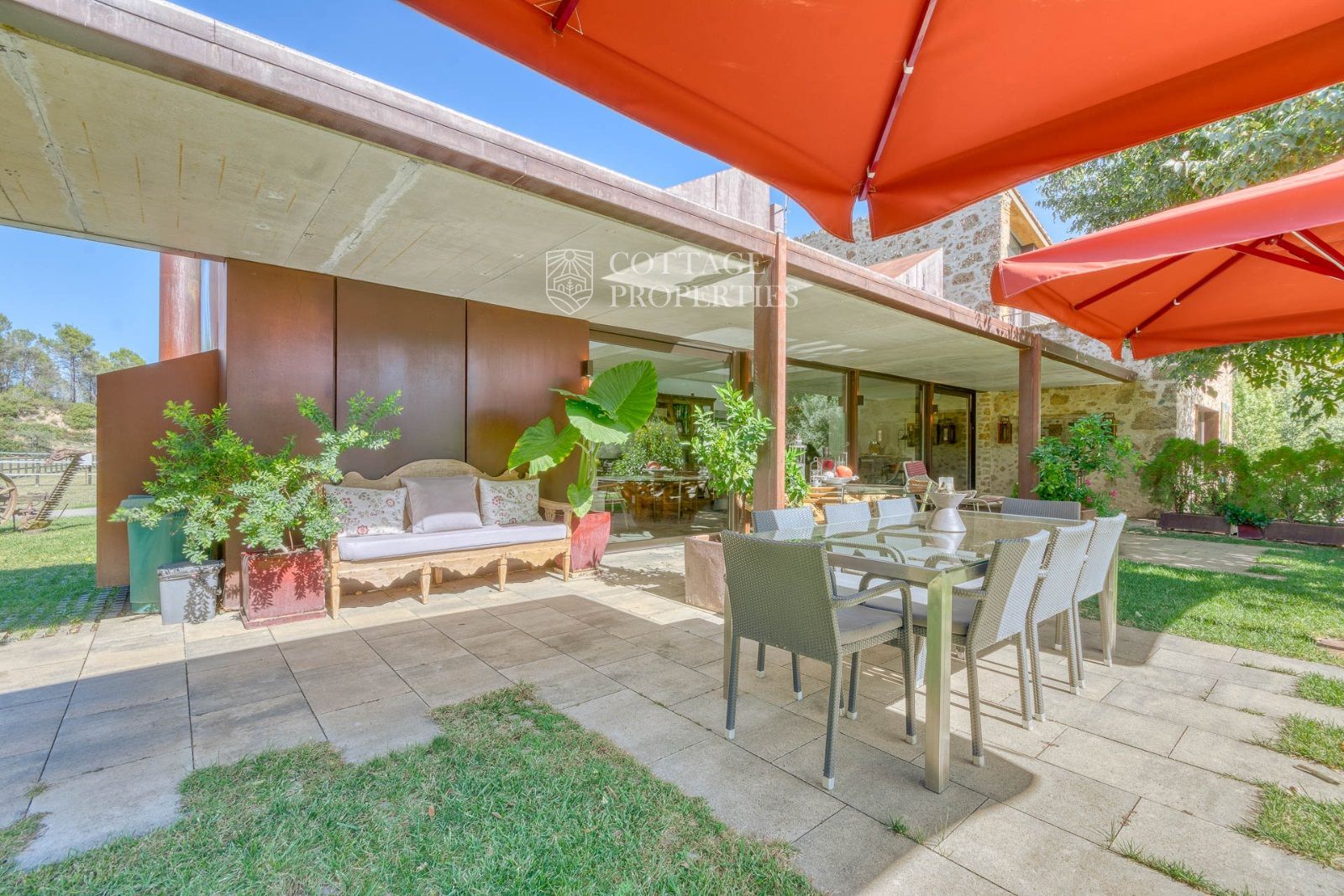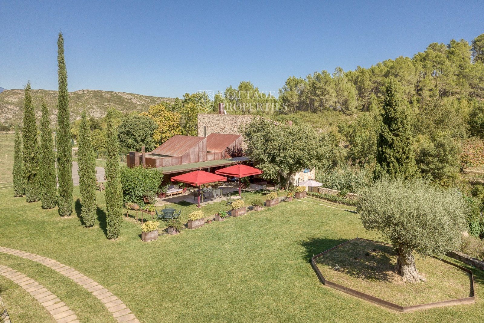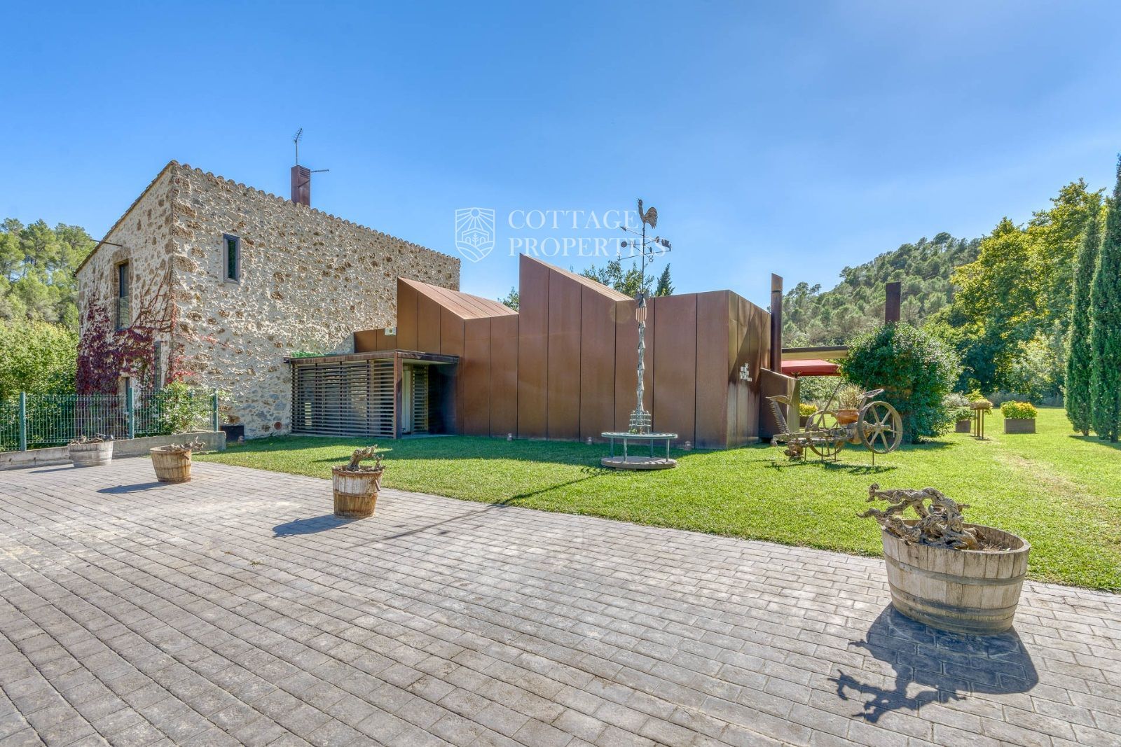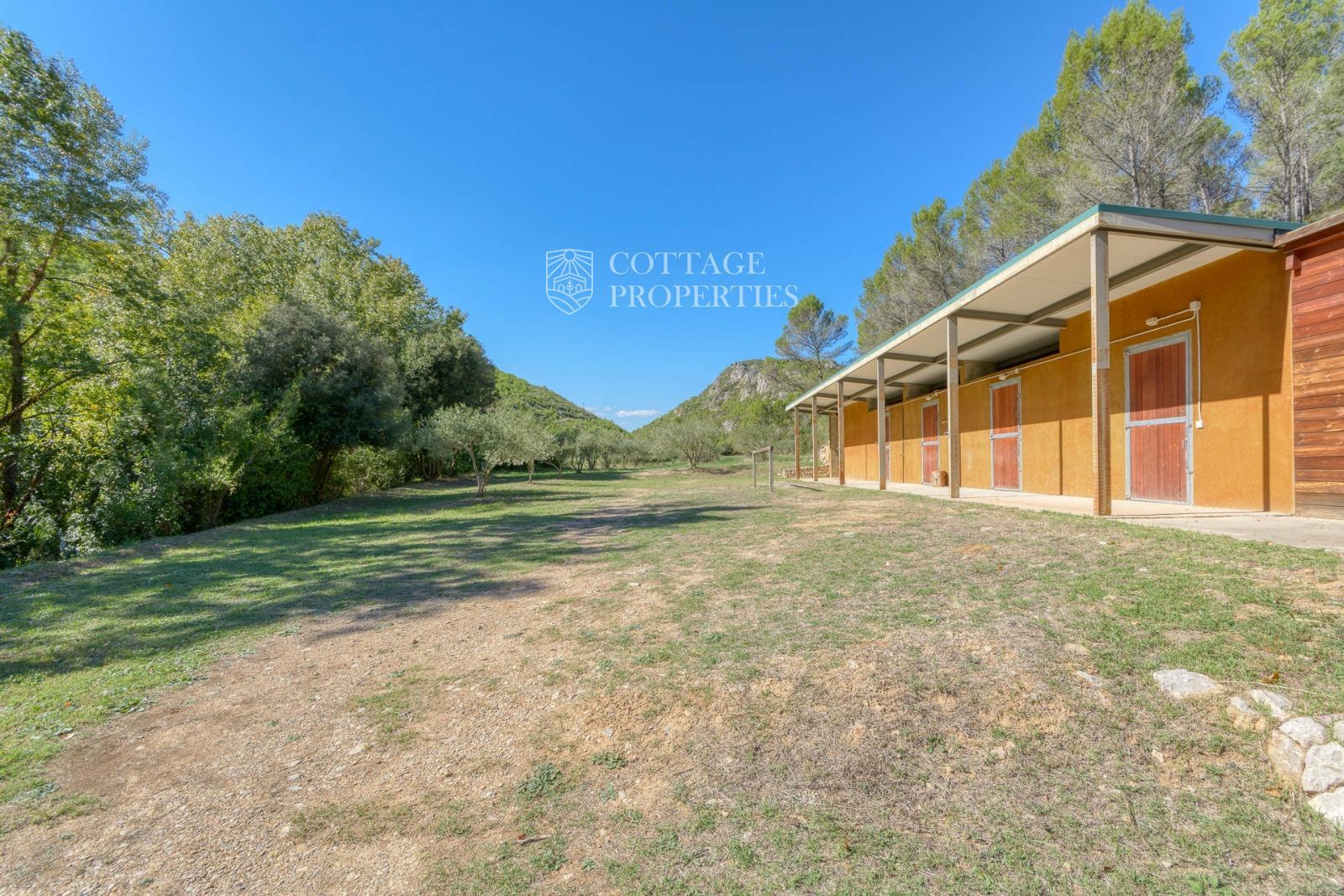 El exterior de la masía está diseñado para maximizar el disfrute del entorno natural. Incluye un jardín espacioso, una piscina refrescante y una terraza perfecta para relajarse al aire libre. También cuenta con boxes y una pista para caballos, lo que la convierte en un lugar ideal para los amantes de la equitación y la vida al aire libre.