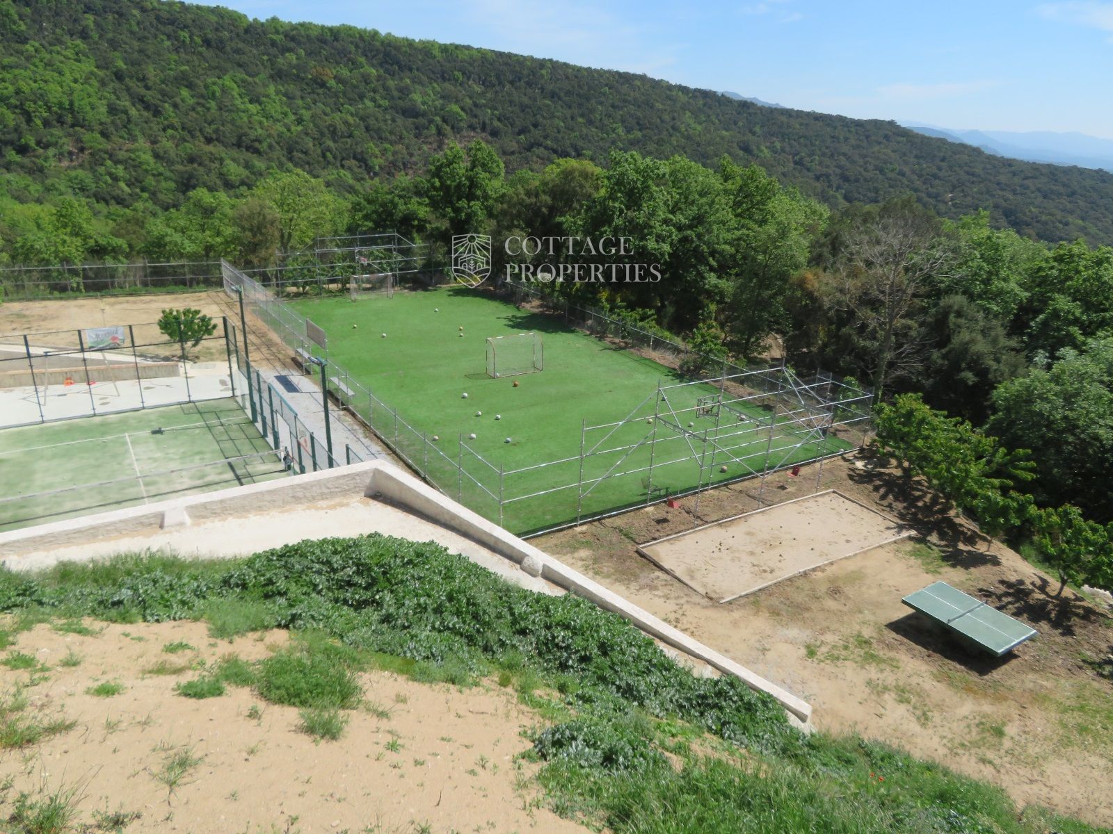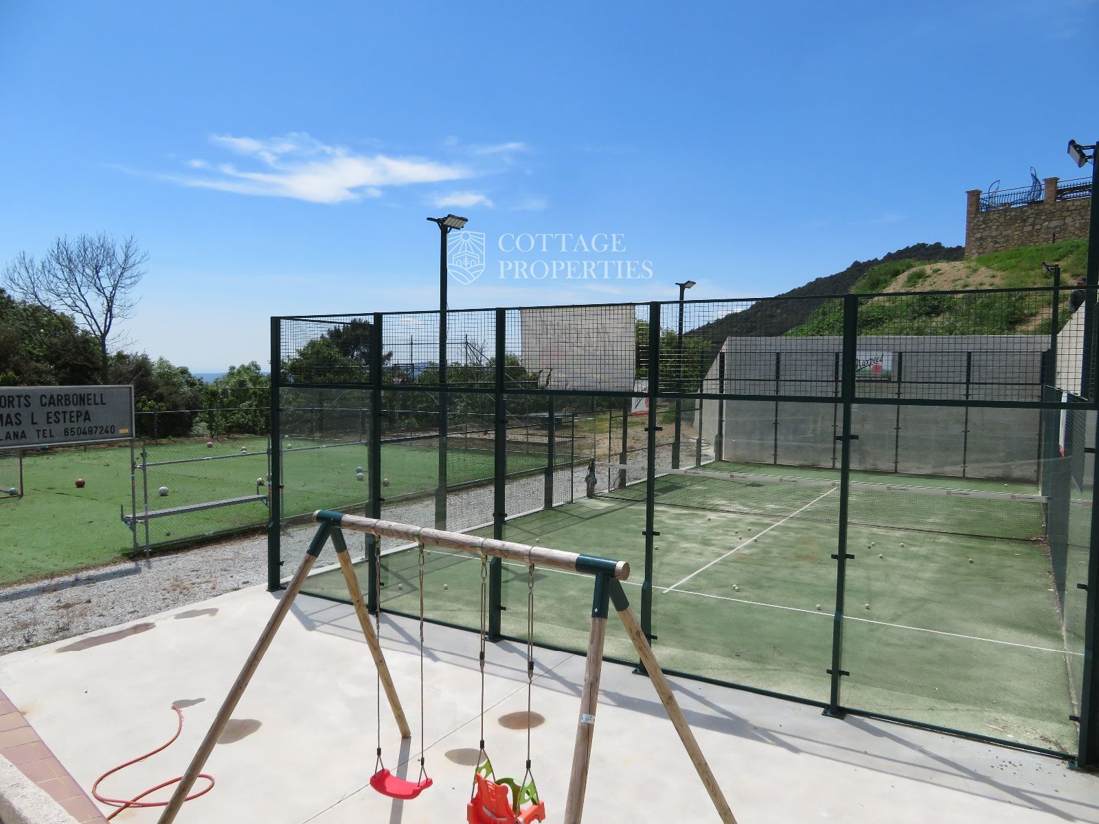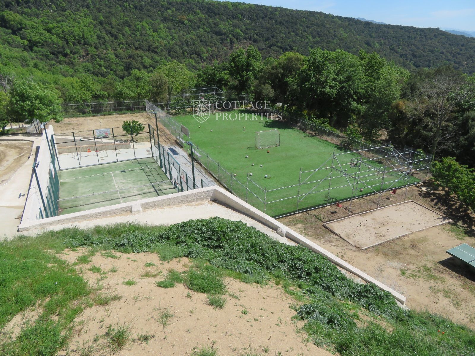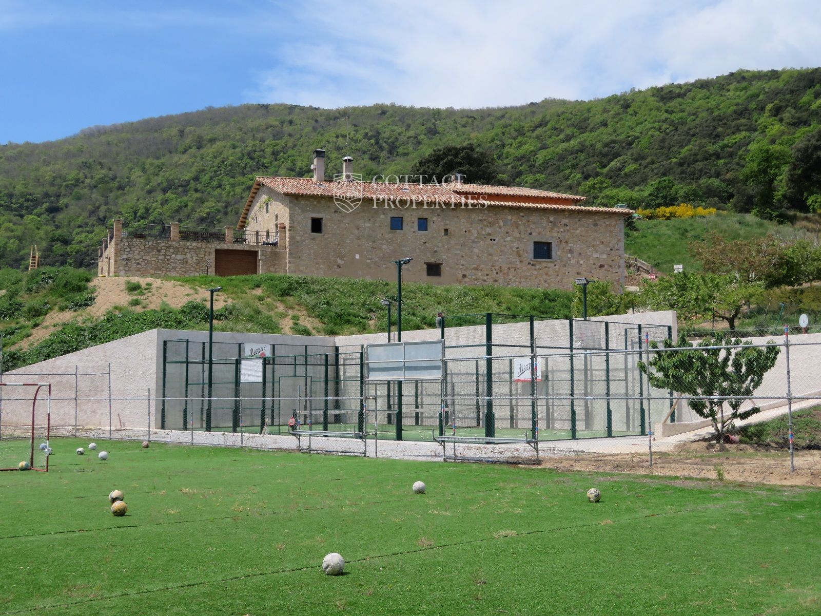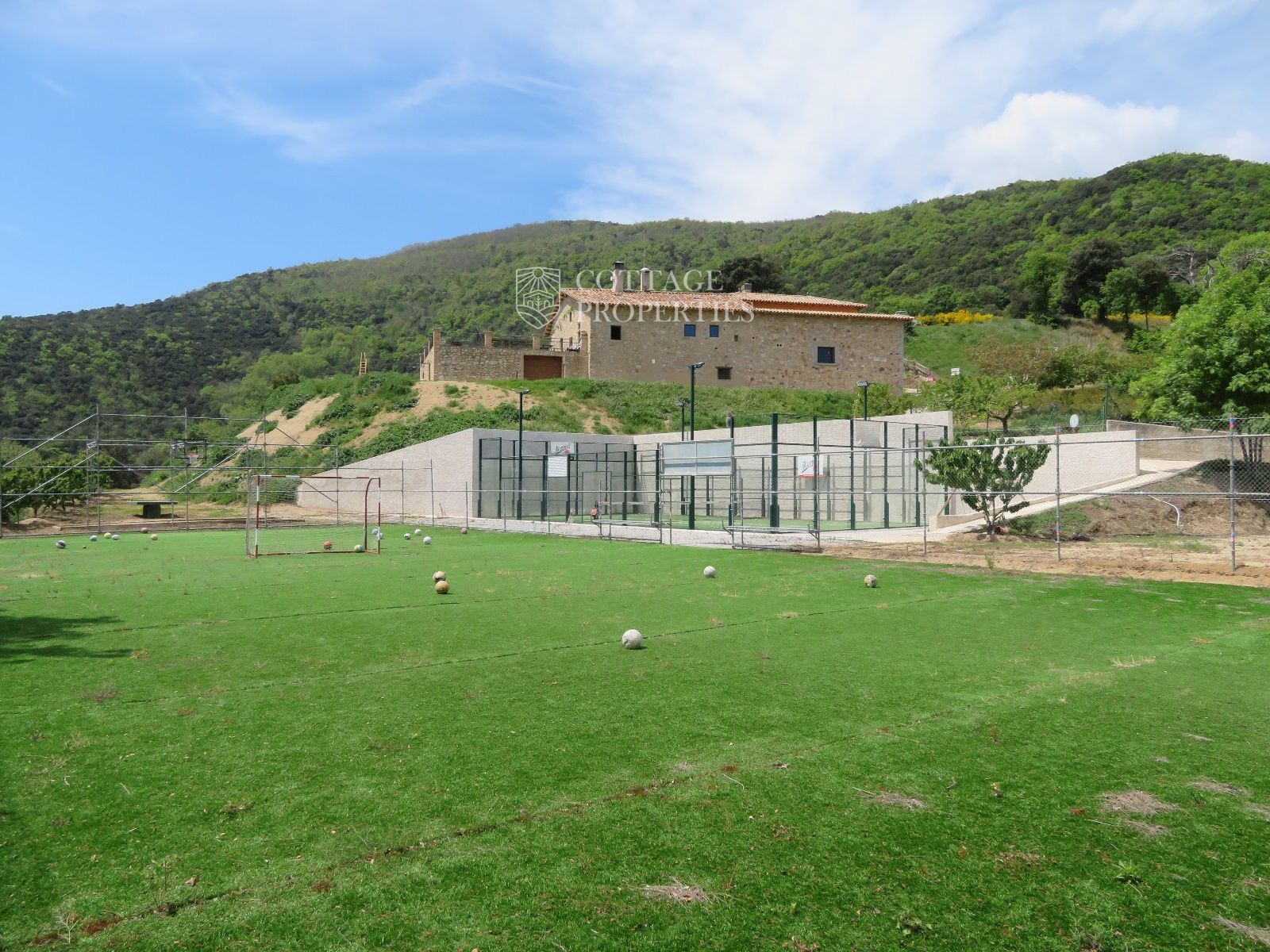La masía cuenta con 12 habitaciones, 4 baños completos, una cocina comedor, chimenea, jacuzzi, sauna y una piscina con bomba de calor y agua salada. Además, la finca incluye un pequeño lago, un huerto ecológico y una amplia variedad de instalaciones recreativas, como una pista de tenis, campo de fútbol, pista de básquet, minigolf, petanca, ping-pong y circuitos para bicicleta y moto.