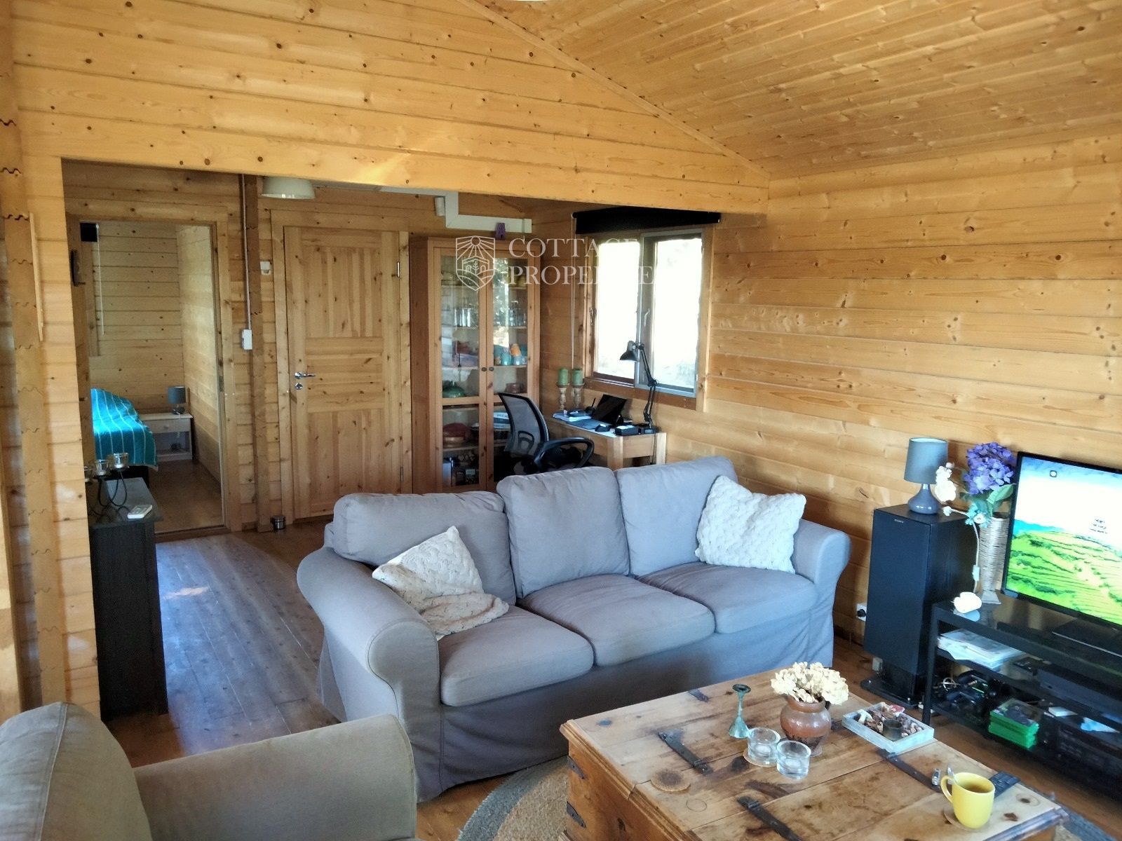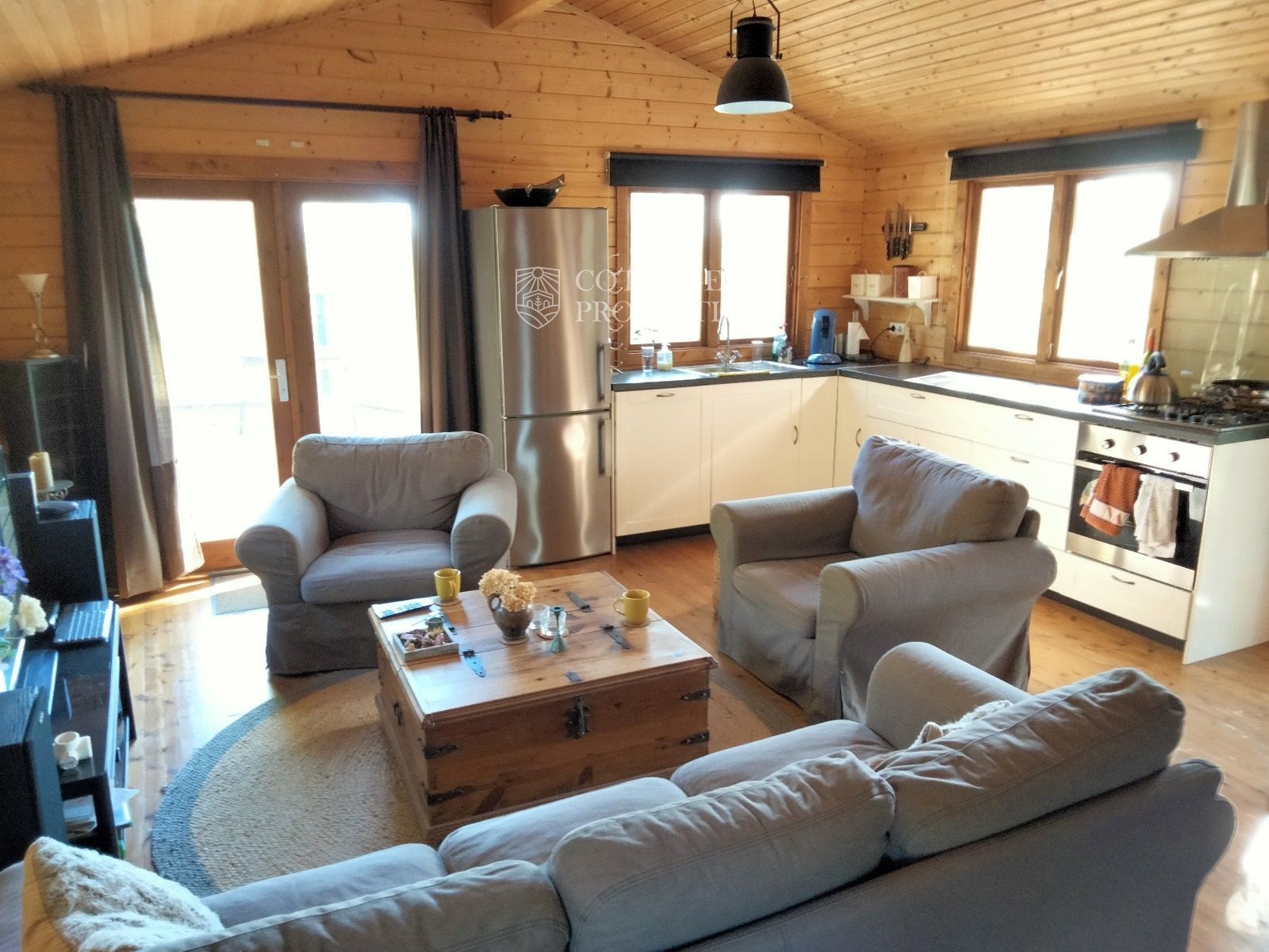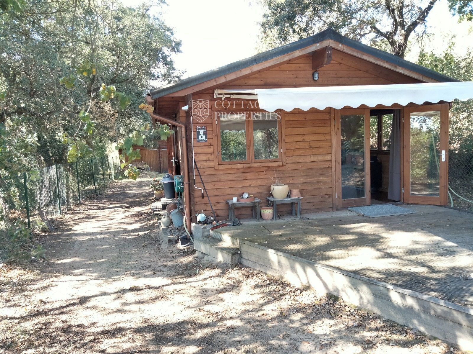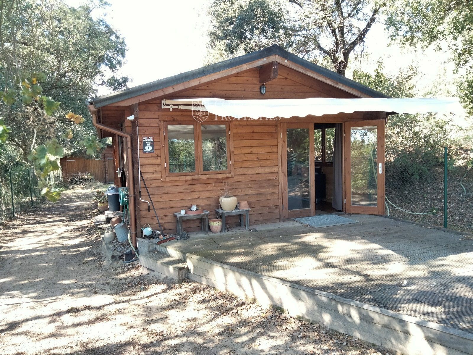 La propiedad cuenta con dos construcciones adicionales: un chalet de madera de aproximadamente 50 m², equipado con dos dormitorios, cocina, baño y garaje doble, así como una sala de caldera.