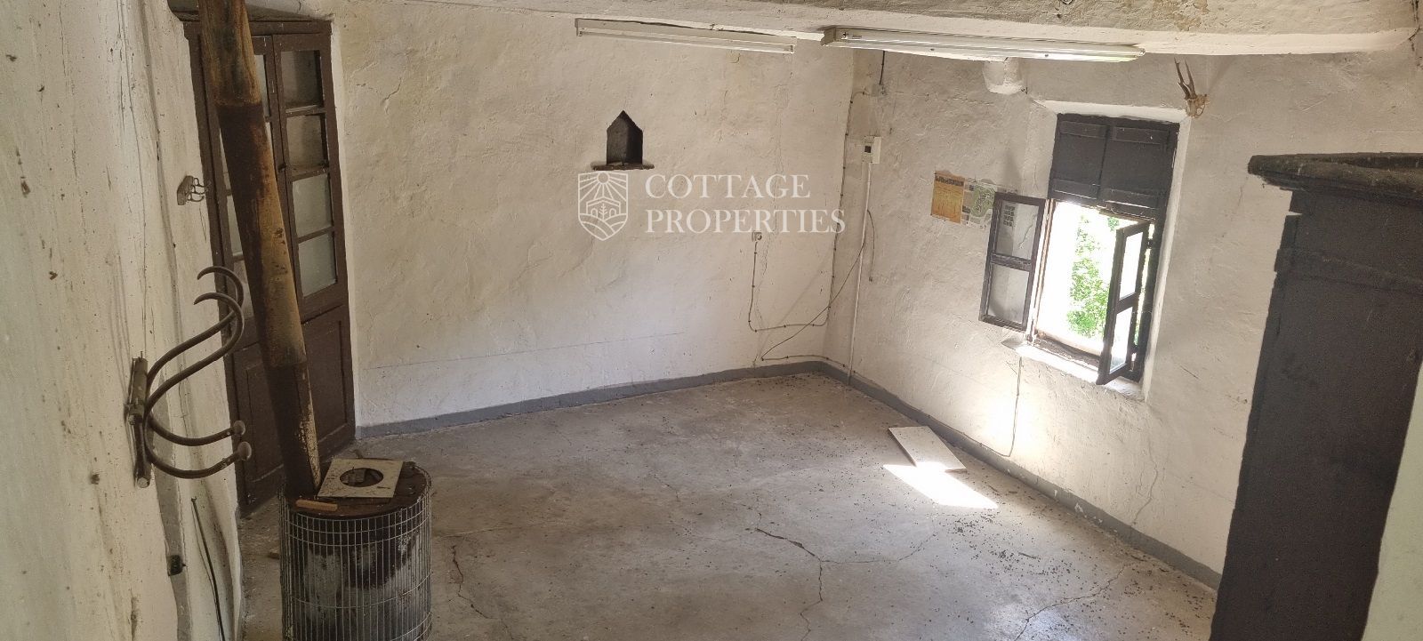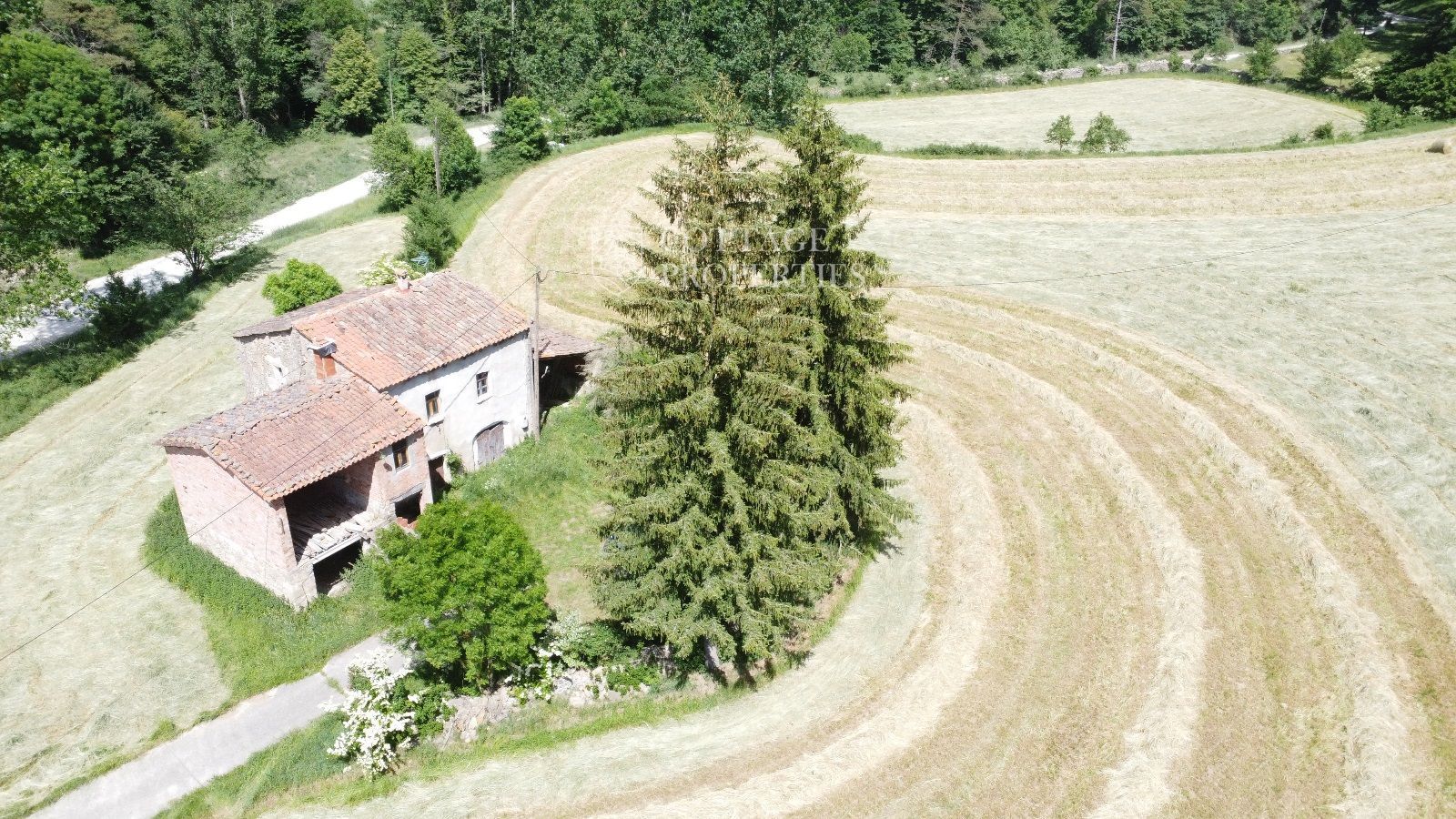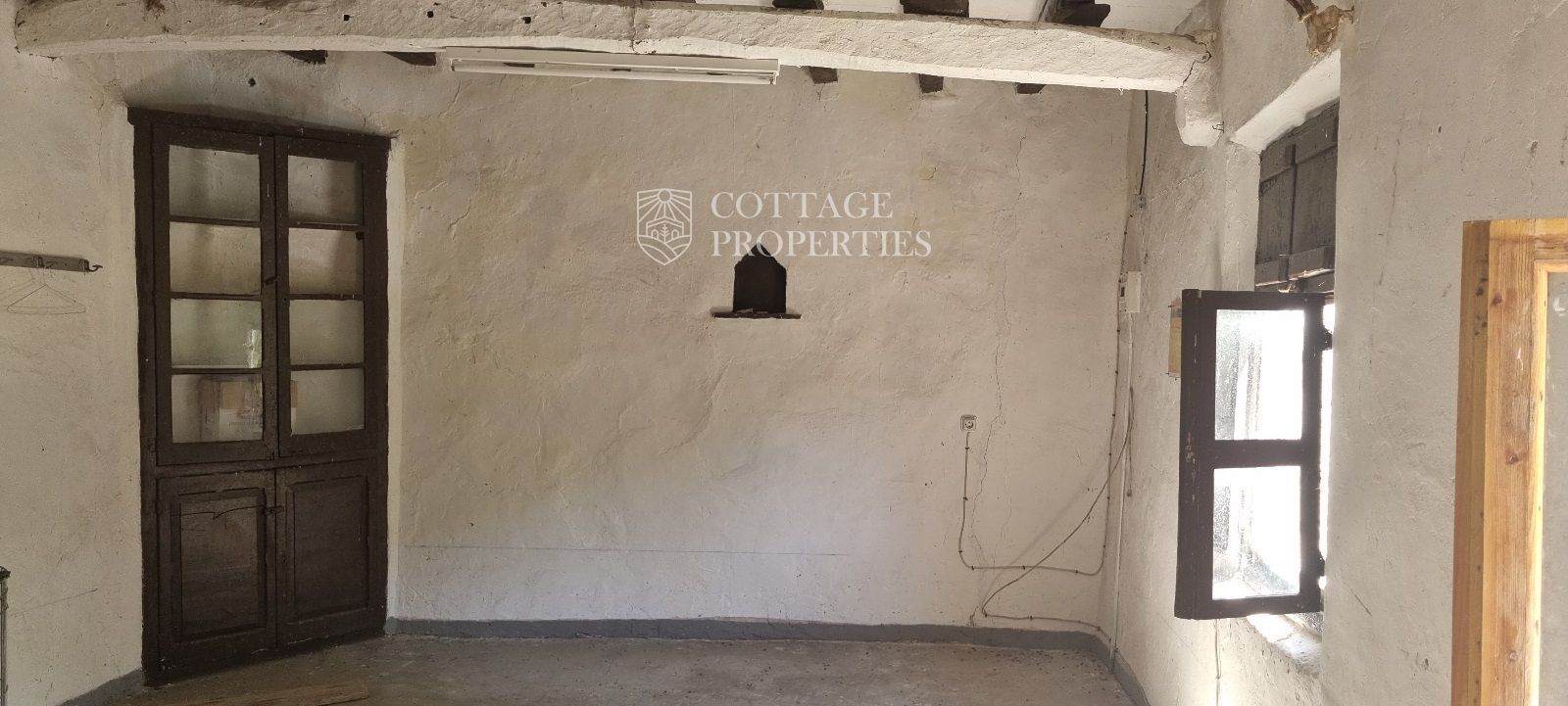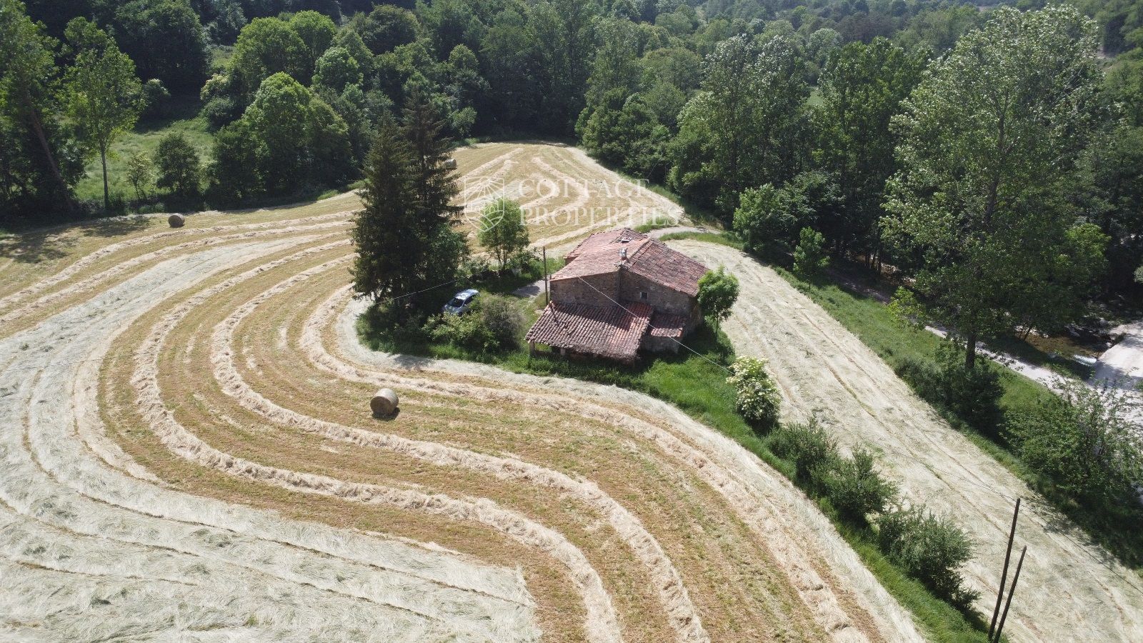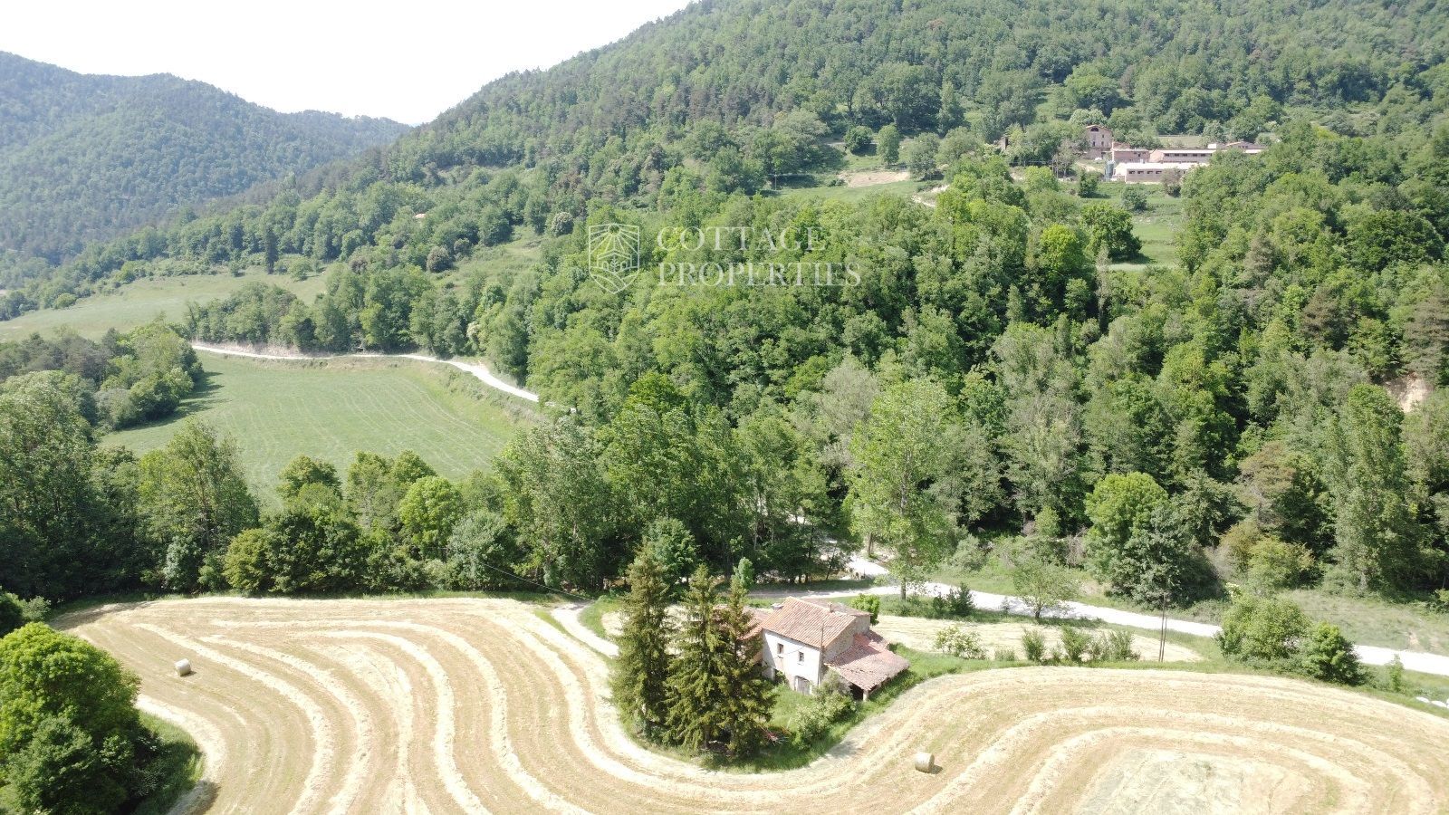 La propiedad cuenta con una masía de aproximadamente 300 m² de construcción, dividida en planta baja y planta superior. El terreno total es de 5 hectáreas, de las cuales 3,5 hectáreas están destinadas a campos. La finca dispone de agua de red, pozo y luz eléctrica. La carretera asfaltada asegura un acceso cómodo a la propiedad.