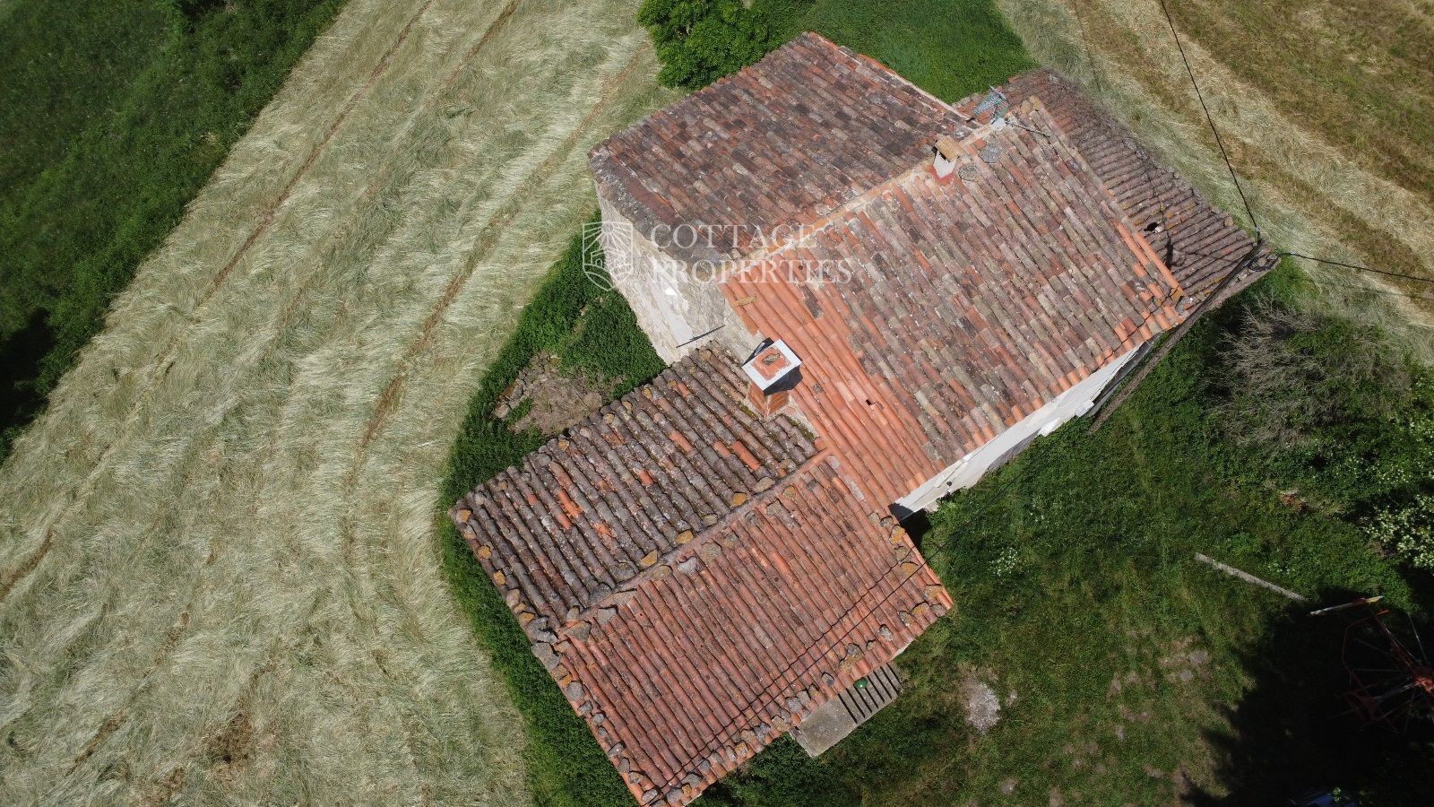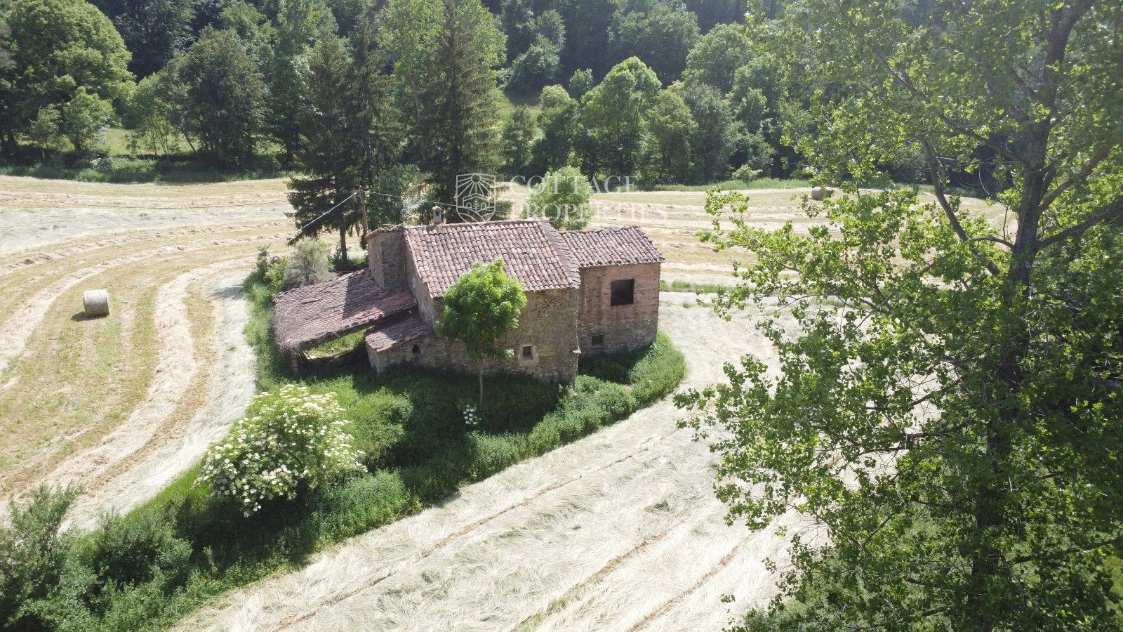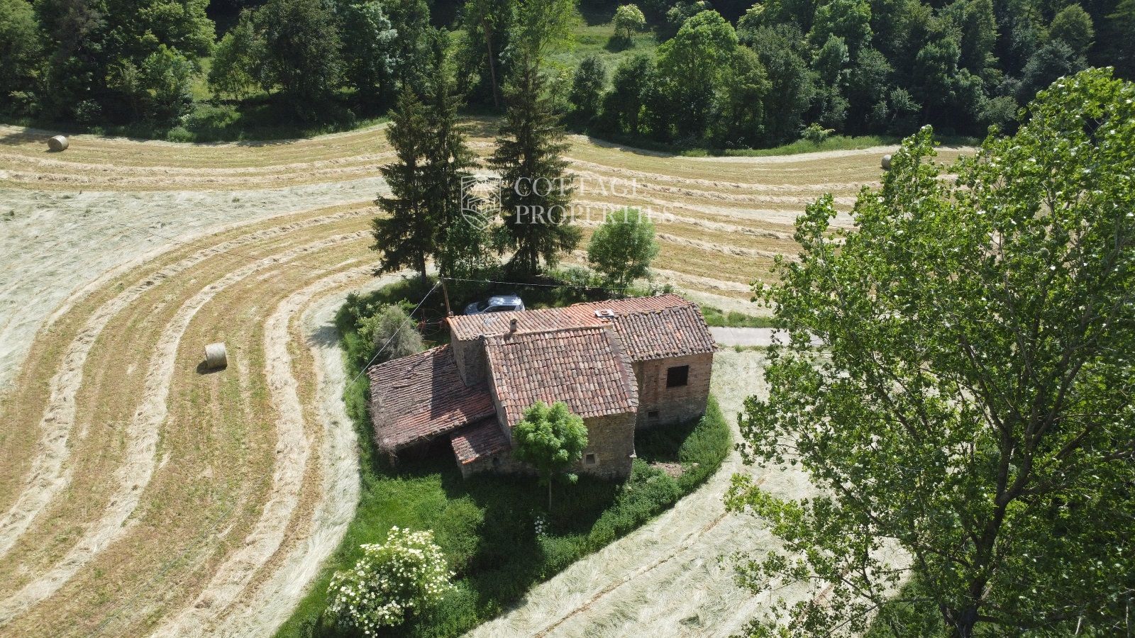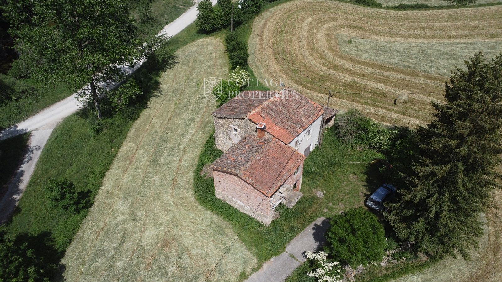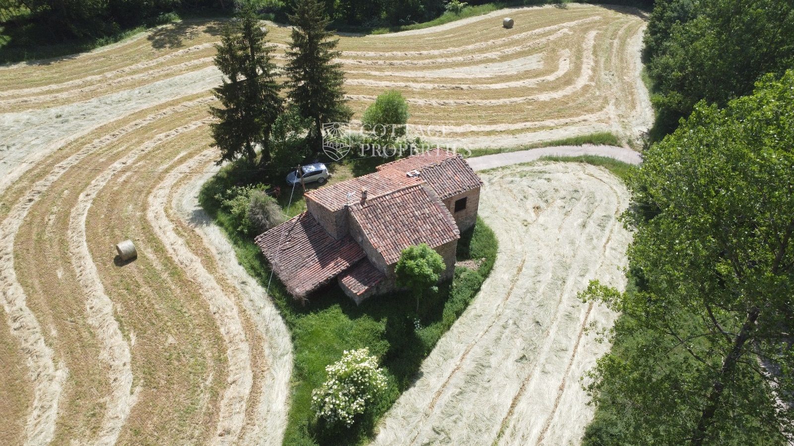 La propiedad cuenta con una masía de aproximadamente 300 m² de construcción, dividida en planta baja y planta superior. El terreno total es de 5 hectáreas, de las cuales 3,5 hectáreas están destinadas a campos. La finca dispone de agua de red, pozo y luz eléctrica. La carretera asfaltada asegura un acceso cómodo a la propiedad.