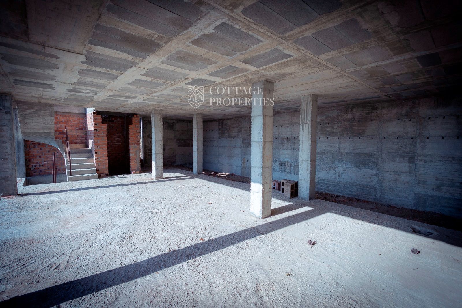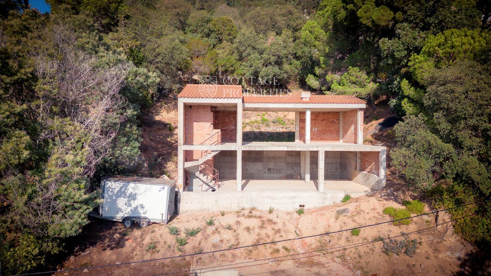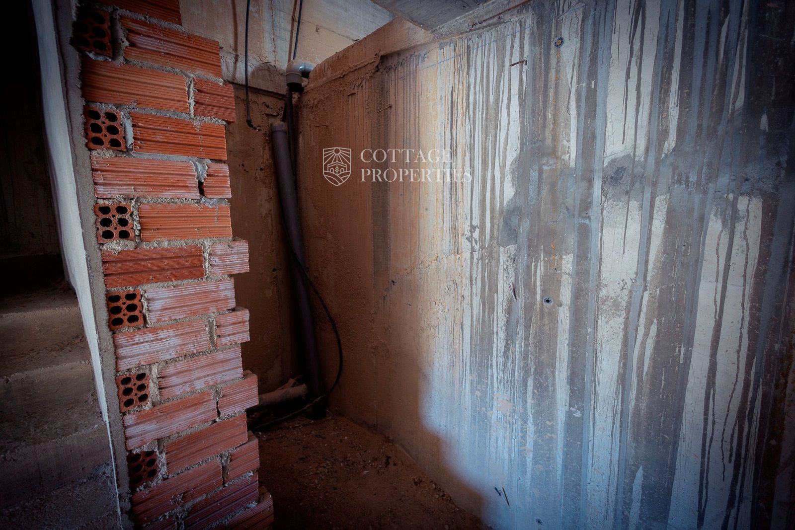 La masía se distribuye en tres niveles. La planta baja, originalmente destinada a ganado, incluye una entrada con un imponente portón de madera, varias habitaciones con muros de piedra a la vista, techos abovedados, una prensa de aceite, un horno de leña y un patio interior. En la primera planta, parcialmente restaurada, se encuentran una espaciosa sala central, una cocina con comedor y chimenea, un dormitorio doble, un dormitorio individual y un gran baño. Esta planta también incluye una terraza cubierta con vistas a los campos. La segunda planta, pendiente de restauración, consta de tres grandes estancias diáfanas. El pajar adyacente ofrece potencial para restauración adicional.