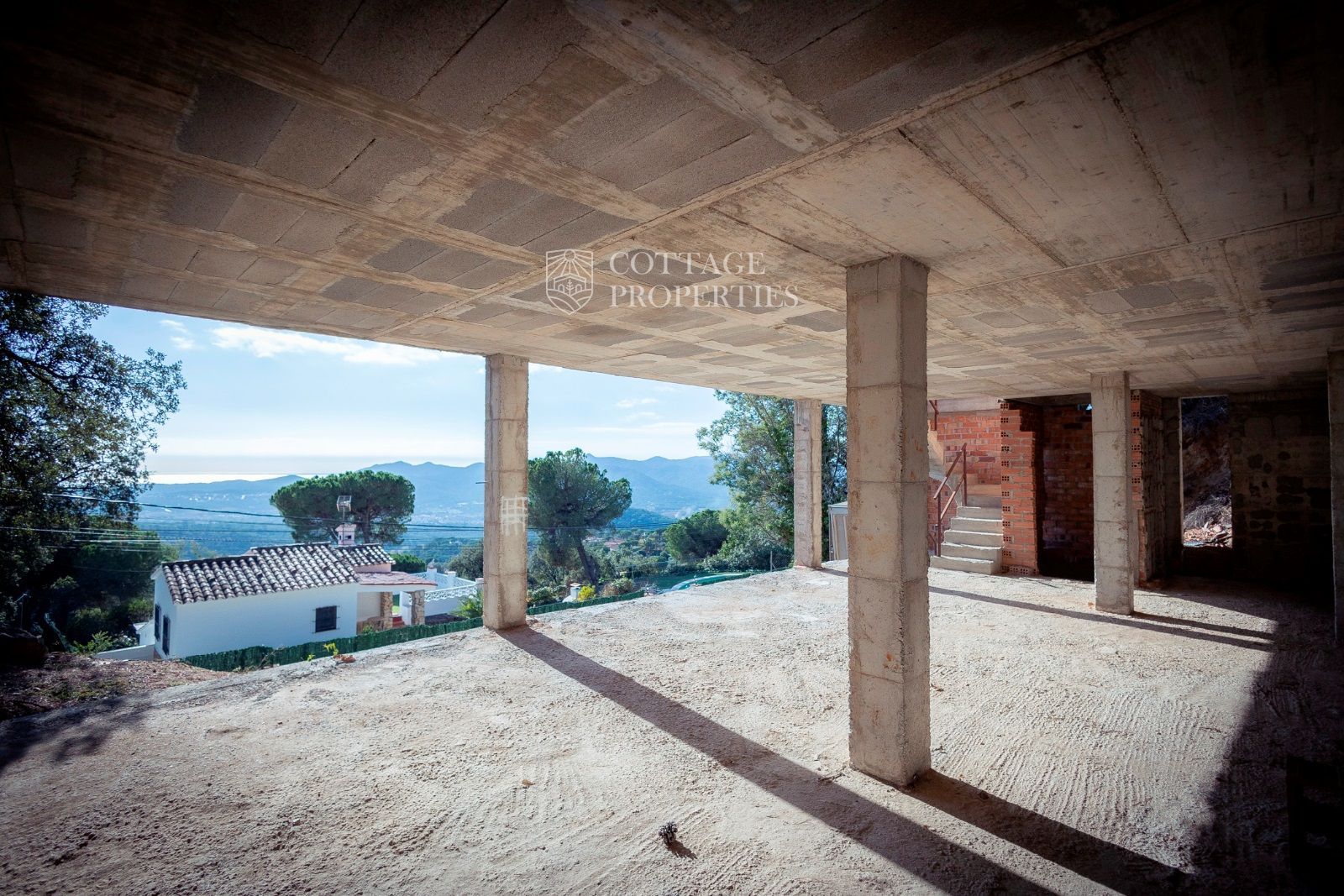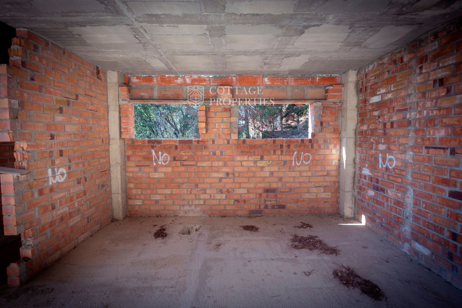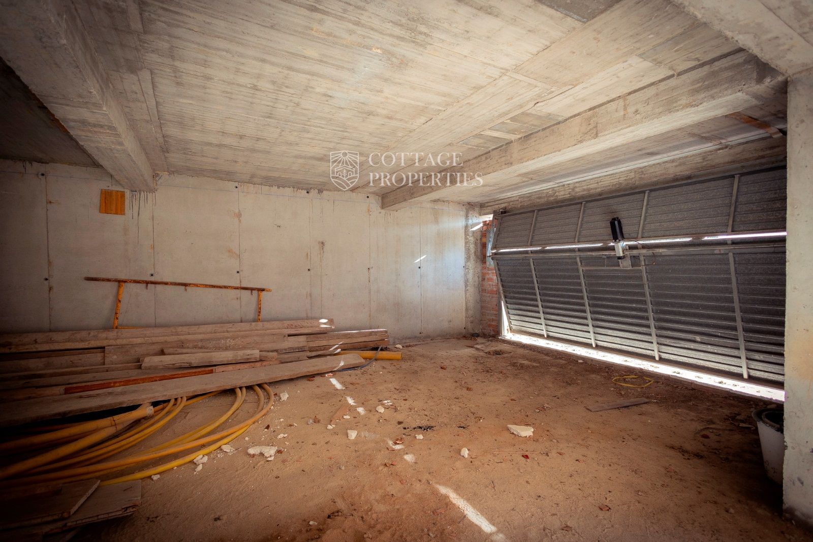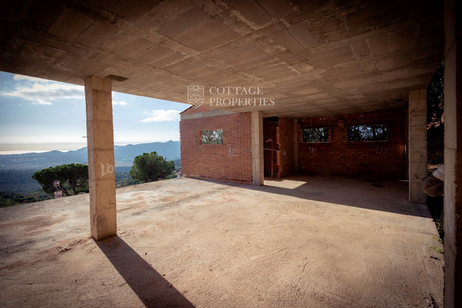 La masía se distribuye en tres niveles. La planta baja, originalmente destinada a ganado, incluye una entrada con un imponente portón de madera, varias habitaciones con muros de piedra a la vista, techos abovedados, una prensa de aceite, un horno de leña y un patio interior. En la primera planta, parcialmente restaurada, se encuentran una espaciosa sala central, una cocina con comedor y chimenea, un dormitorio doble, un dormitorio individual y un gran baño. Esta planta también incluye una terraza cubierta con vistas a los campos. La segunda planta, pendiente de restauración, consta de tres grandes estancias diáfanas. El pajar adyacente ofrece potencial para restauración adicional.