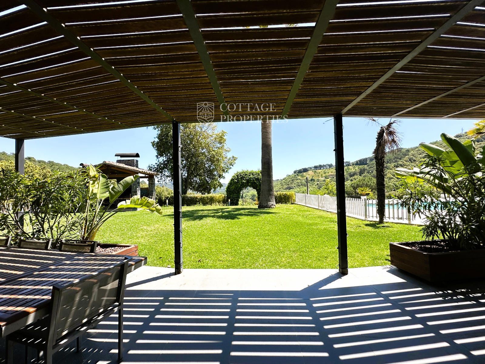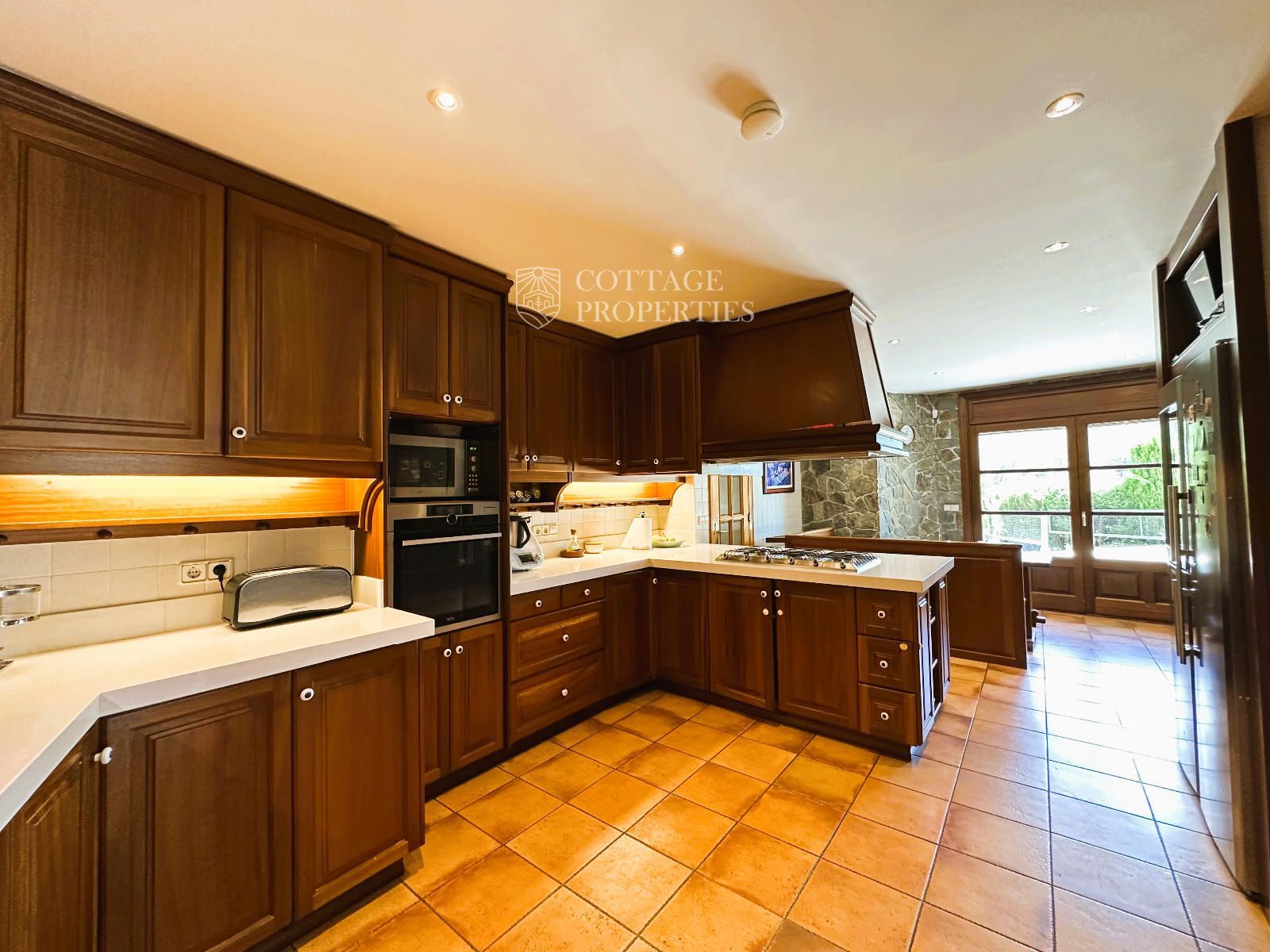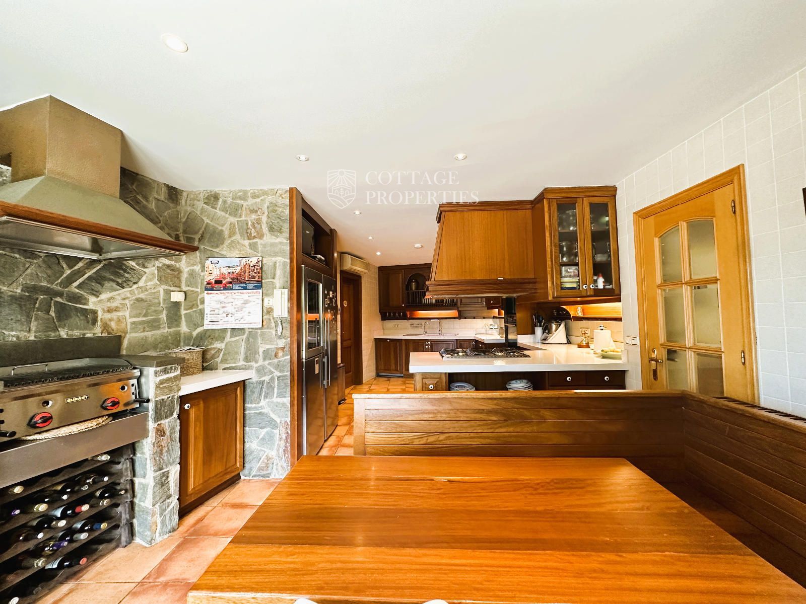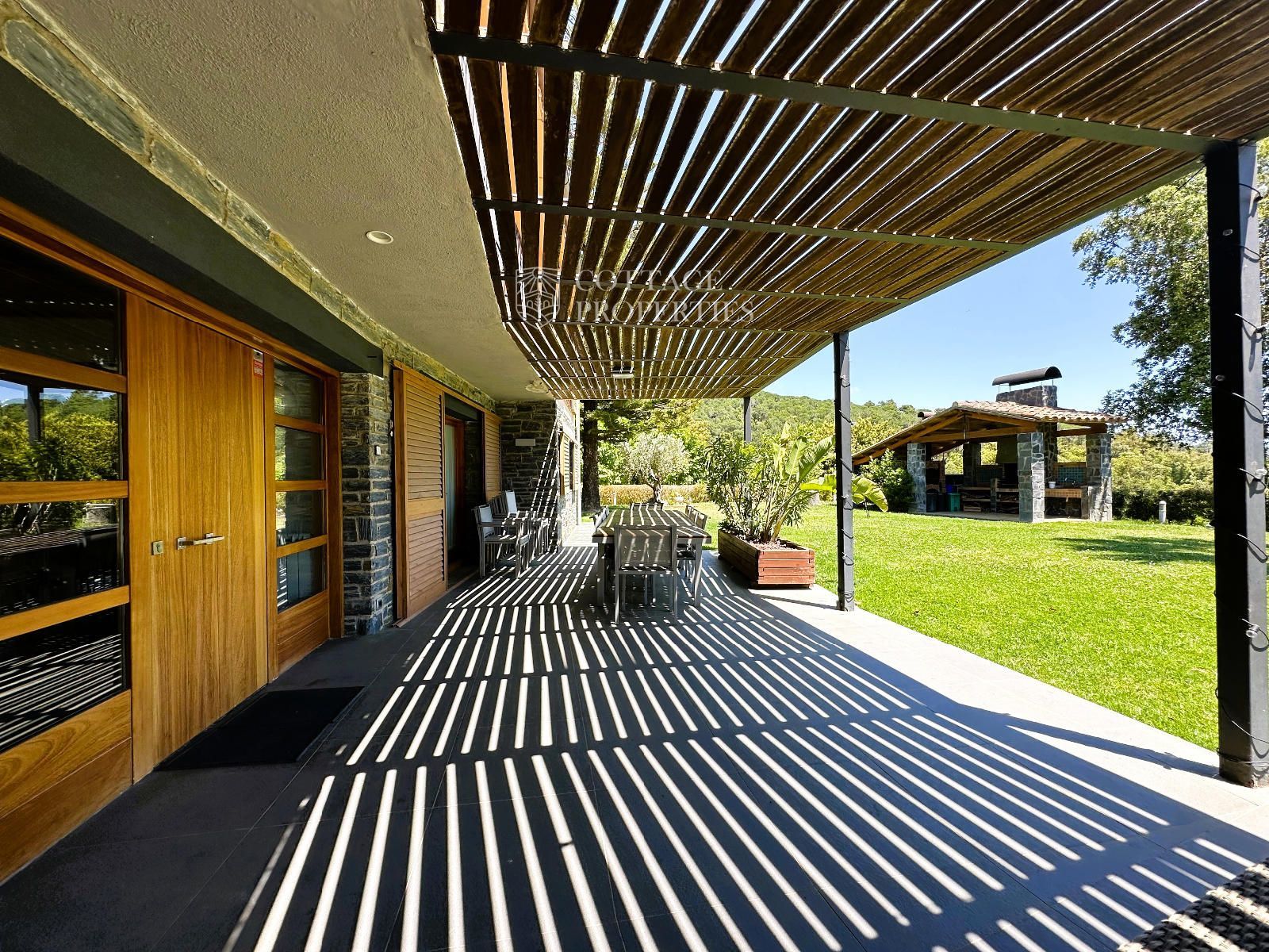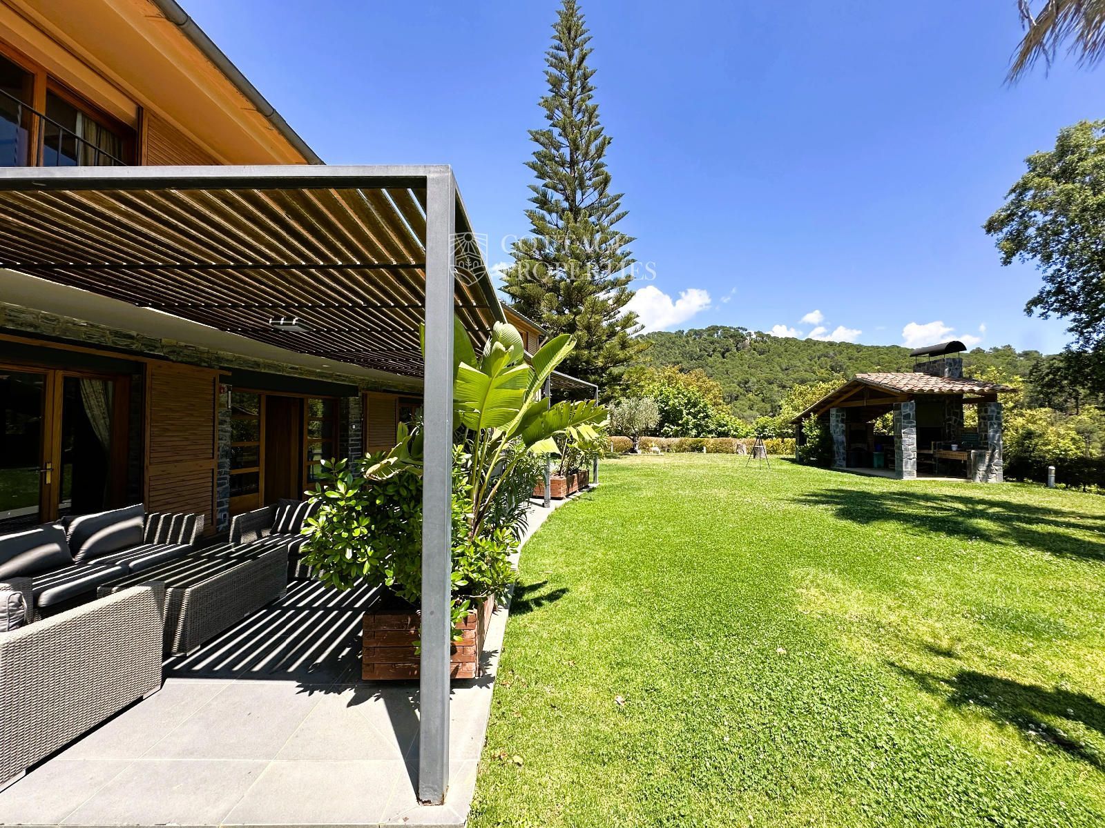L'extérieur dispose d'un magnifique jardin paysager avec de vastes pelouses, différentes terrasses tirant parti de la topographie naturelle et des espaces de loisirs parfaitement intégrés à l'environnement. La piscine privée, entourée de végétation et d'un espace barbecue, crée une atmosphère de paix et de beauté naturelle.