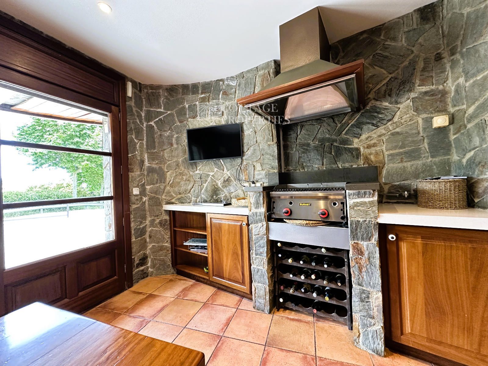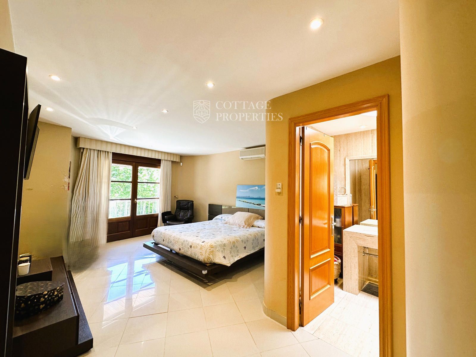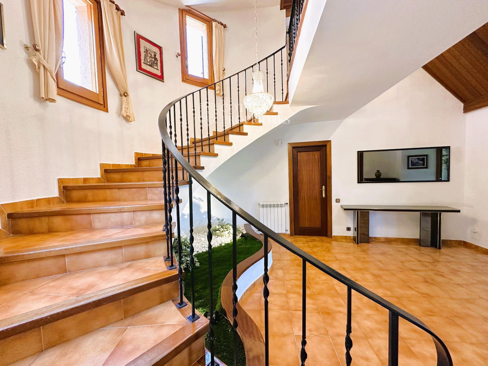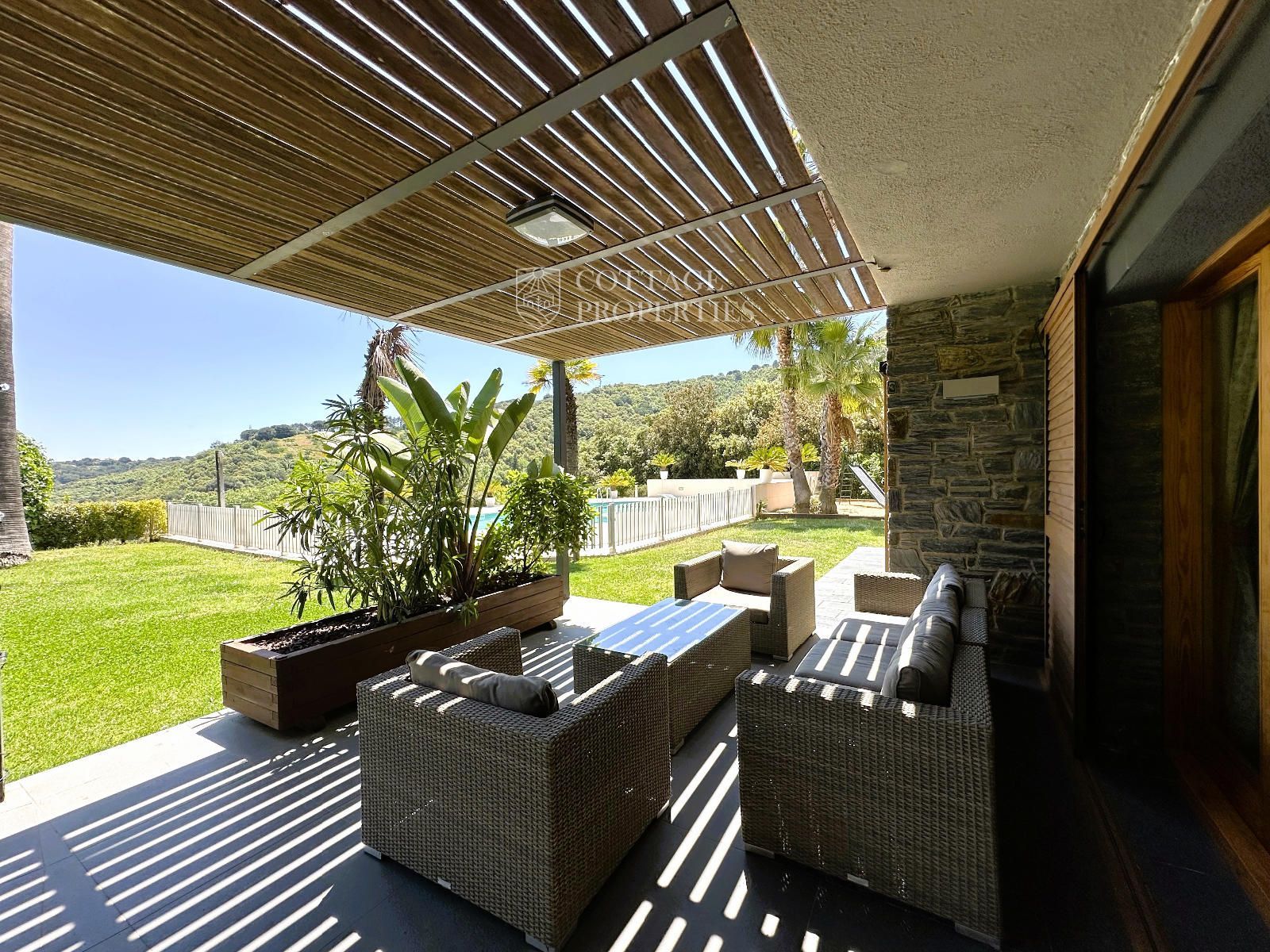 L'extérieur dispose d'un magnifique jardin paysager avec de vastes pelouses, différentes terrasses tirant parti de la topographie naturelle et des espaces de loisirs parfaitement intégrés à l'environnement. La piscine privée, entourée de végétation et d'un espace barbecue, crée une atmosphère de paix et de beauté naturelle.