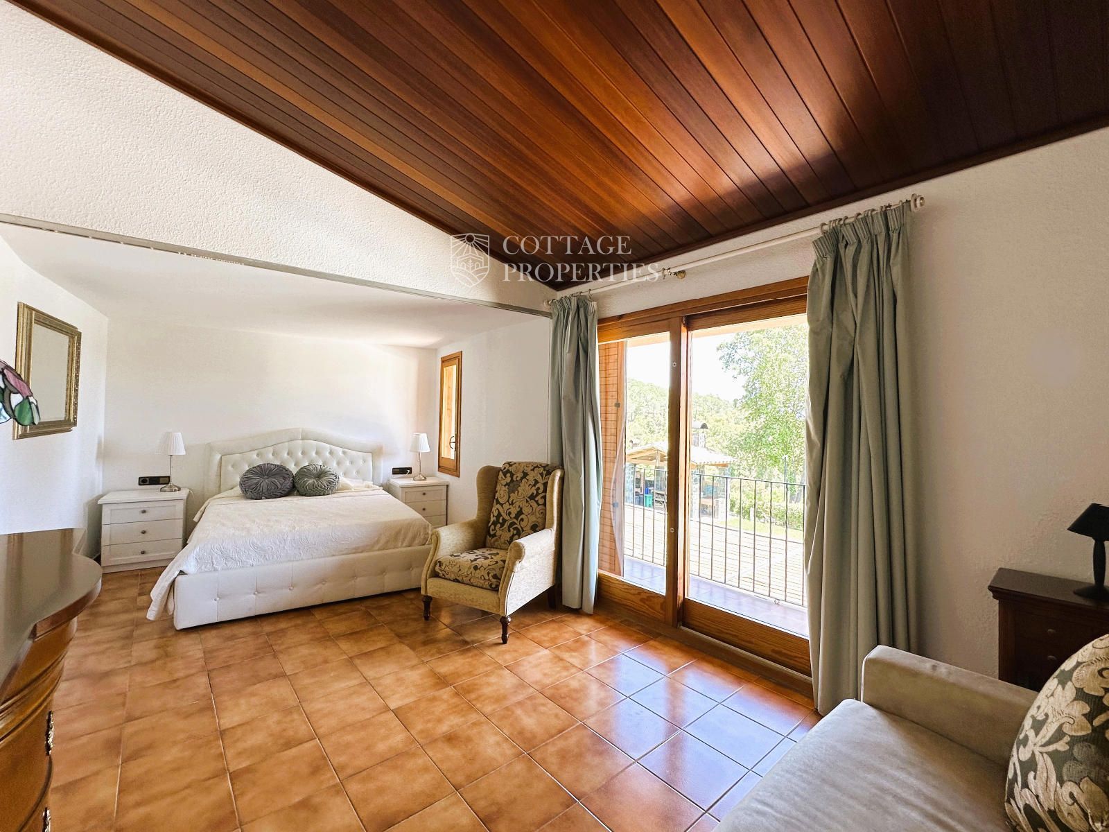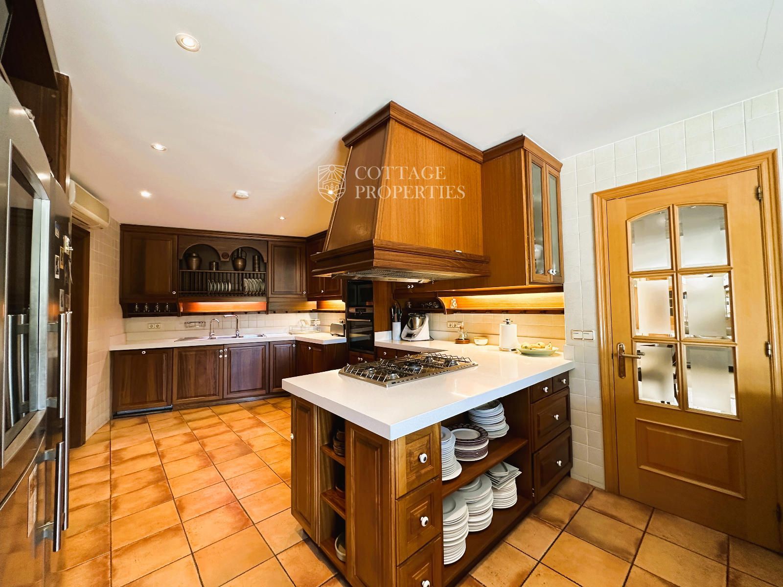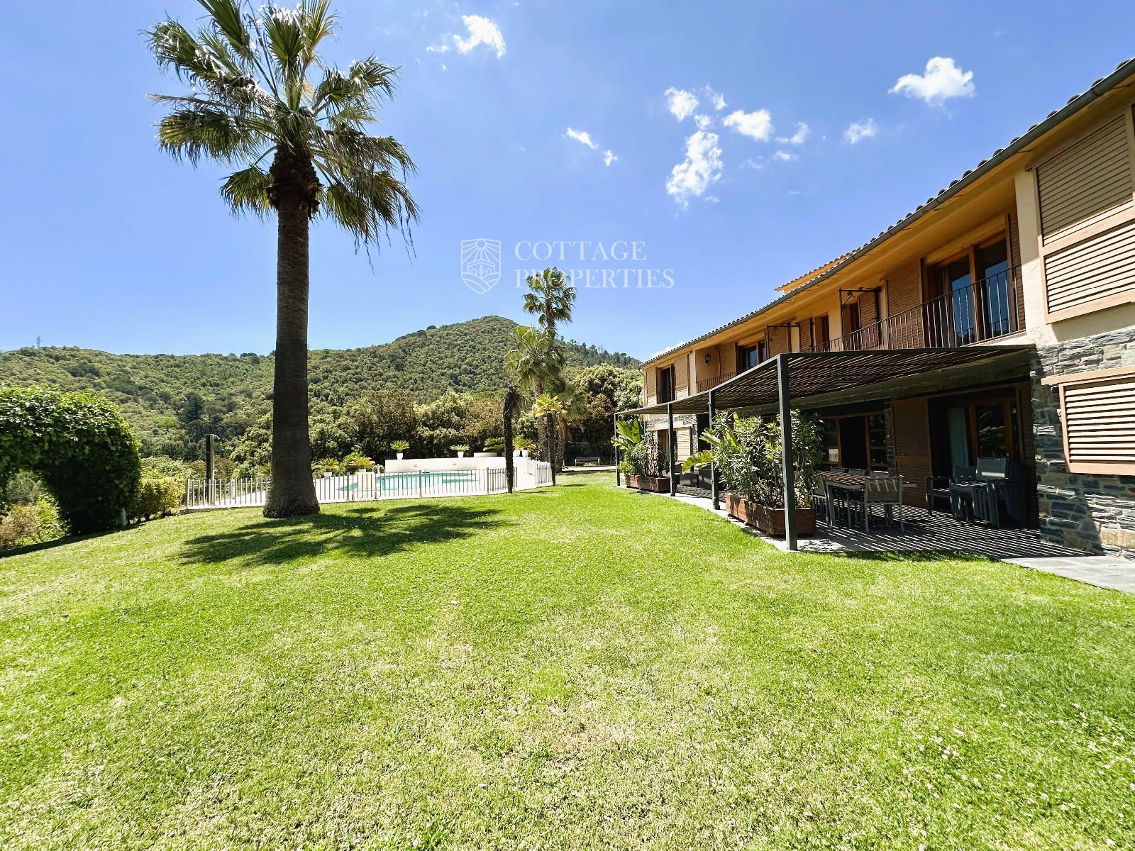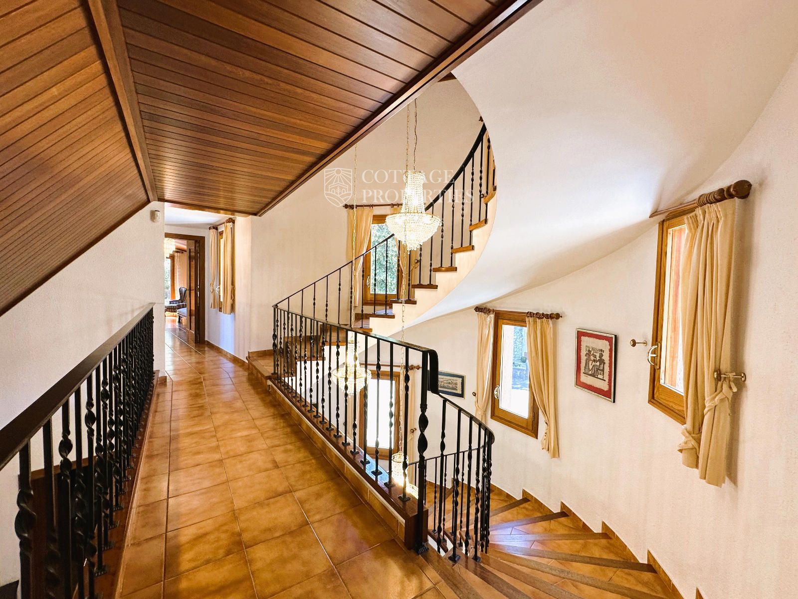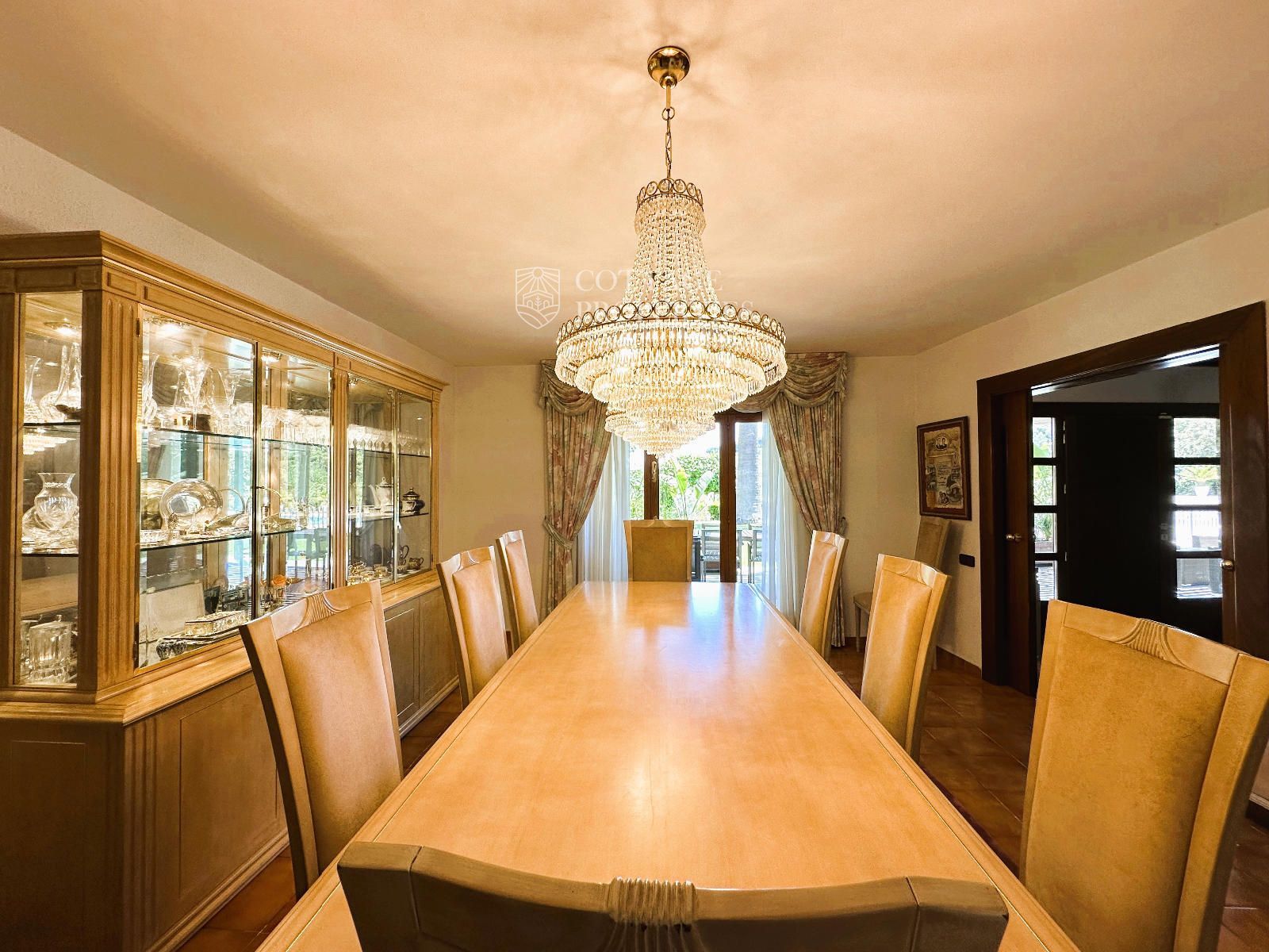 L'extérieur dispose d'un magnifique jardin paysager avec de vastes pelouses, différentes terrasses tirant parti de la topographie naturelle et des espaces de loisirs parfaitement intégrés à l'environnement. La piscine privée, entourée de végétation et d'un espace barbecue, crée une atmosphère de paix et de beauté naturelle.