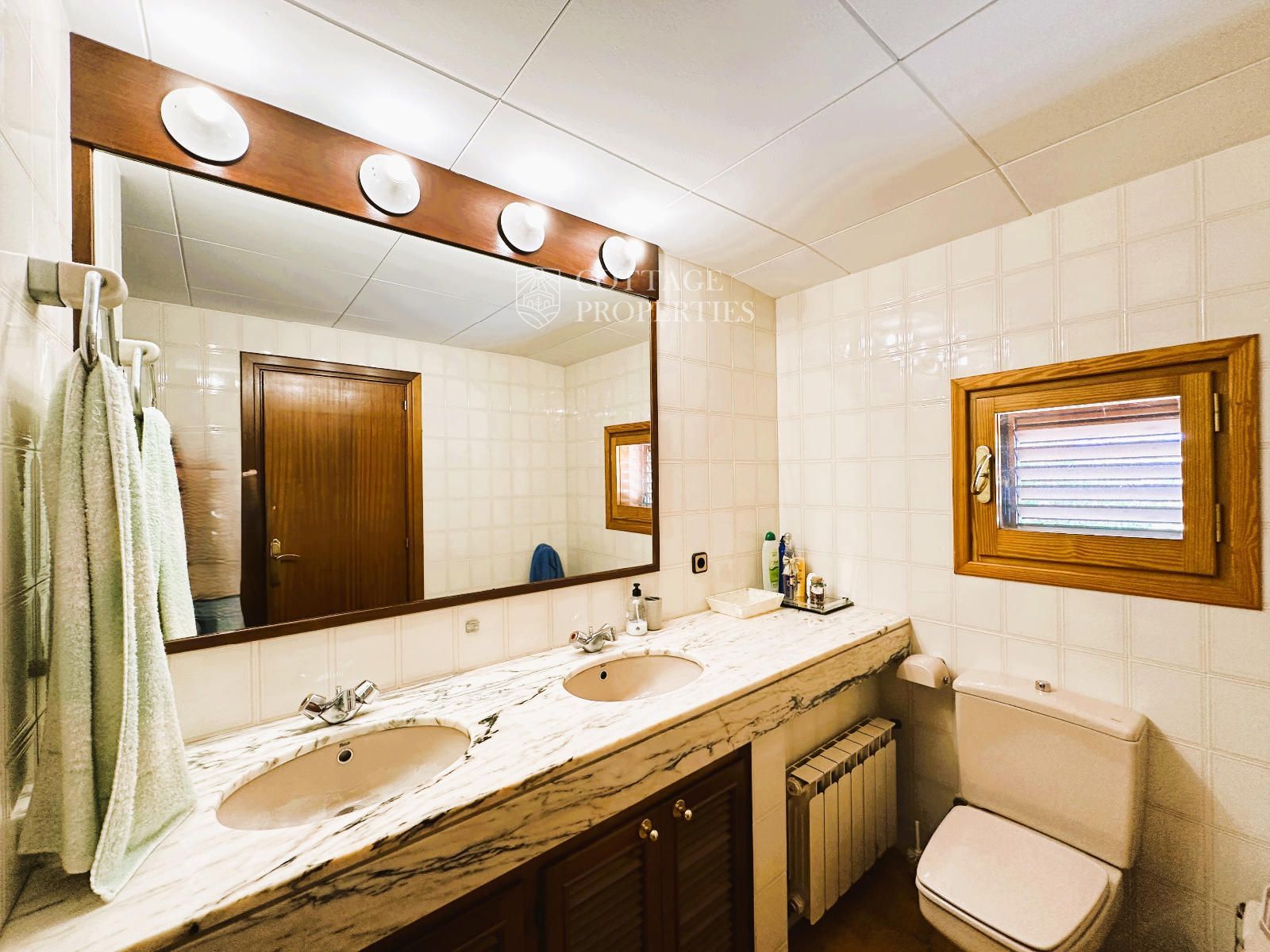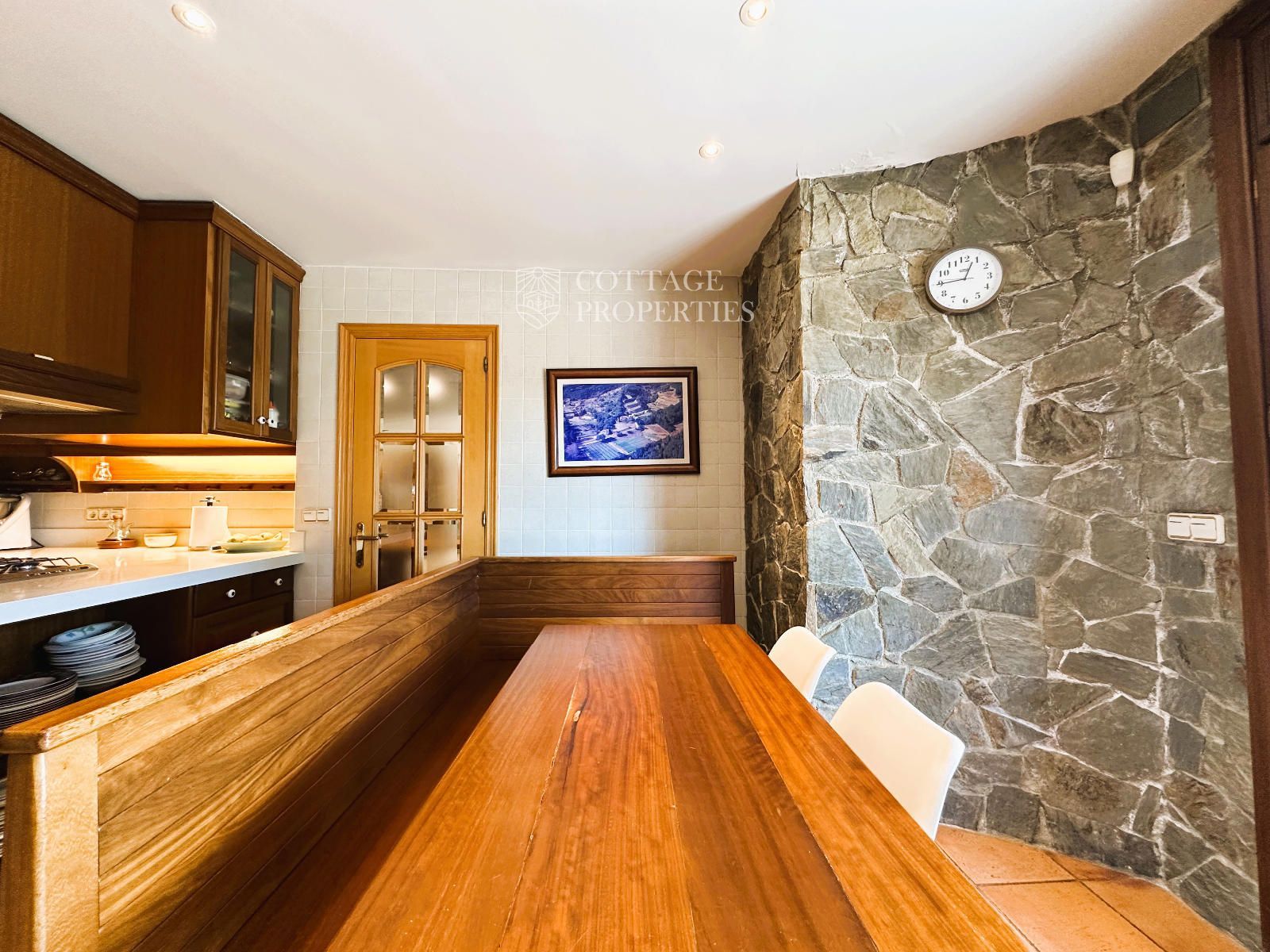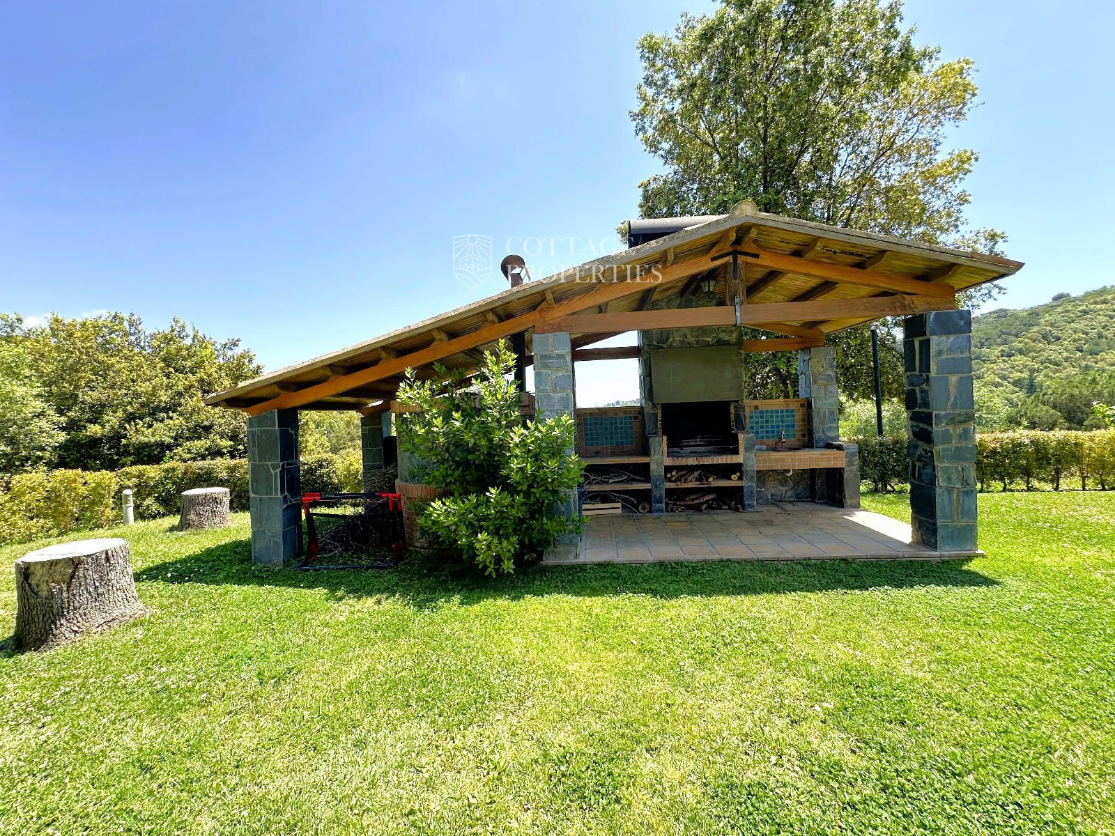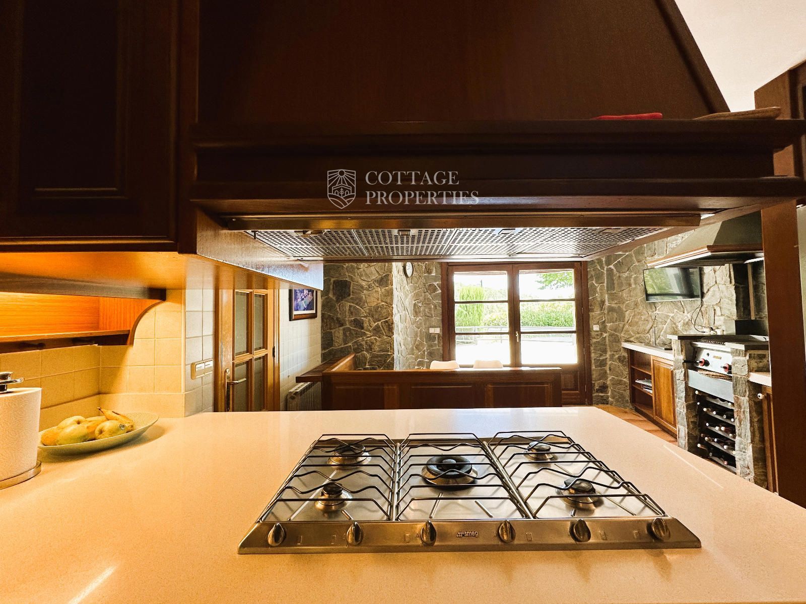 L'extérieur dispose d'un magnifique jardin paysager avec de vastes pelouses, différentes terrasses tirant parti de la topographie naturelle et des espaces de loisirs parfaitement intégrés à l'environnement. La piscine privée, entourée de végétation et d'un espace barbecue, crée une atmosphère de paix et de beauté naturelle.