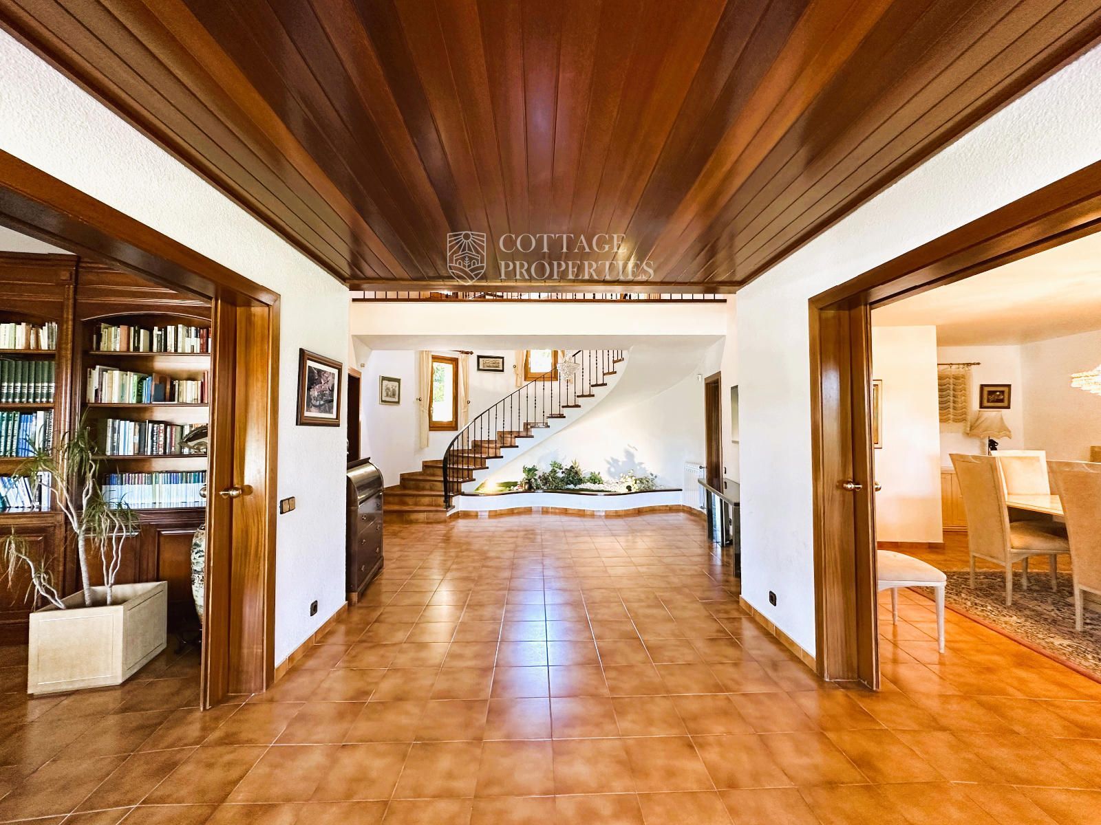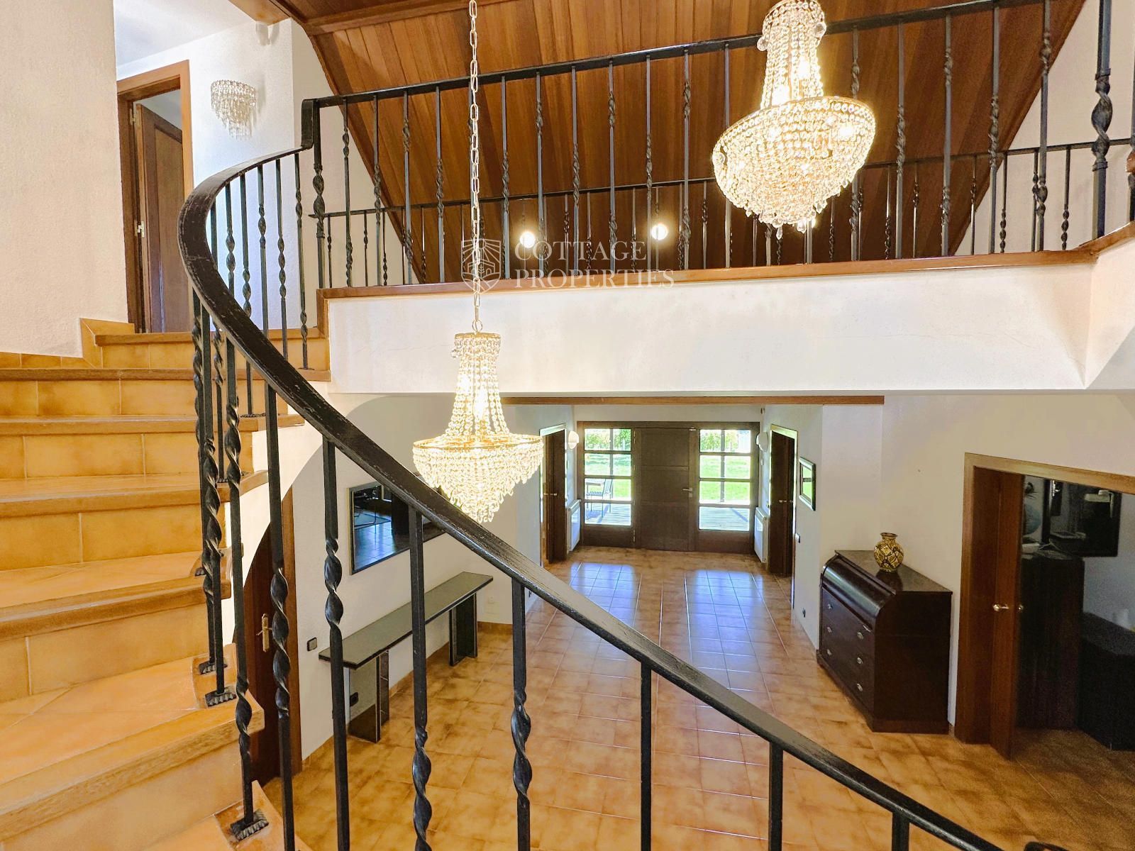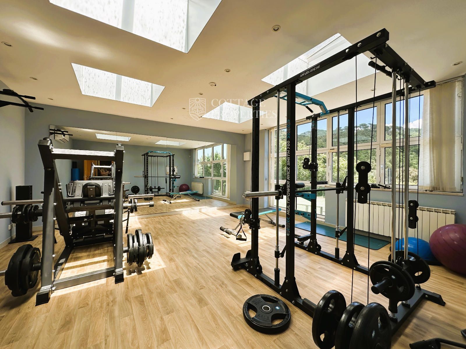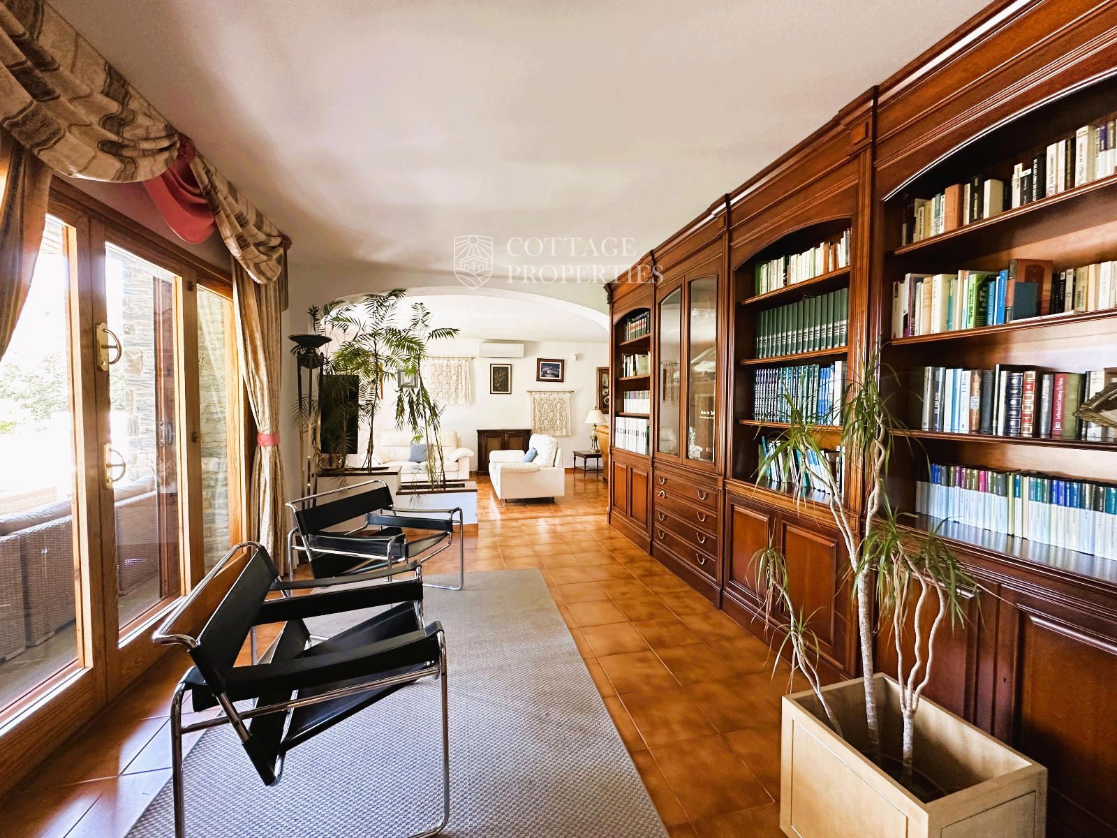 La seconde résidence, rénovée et en excellent état, offre un grand salon-salle à manger avec baies vitrées du sol au plafond et accès direct au jardin, une cuisine spacieuse et lumineuse, une bibliothèque, une salle de sport, une salle de bain supplémentaire et 4 chambres en suite, ainsi qu'une buanderie et un garage indépendant.