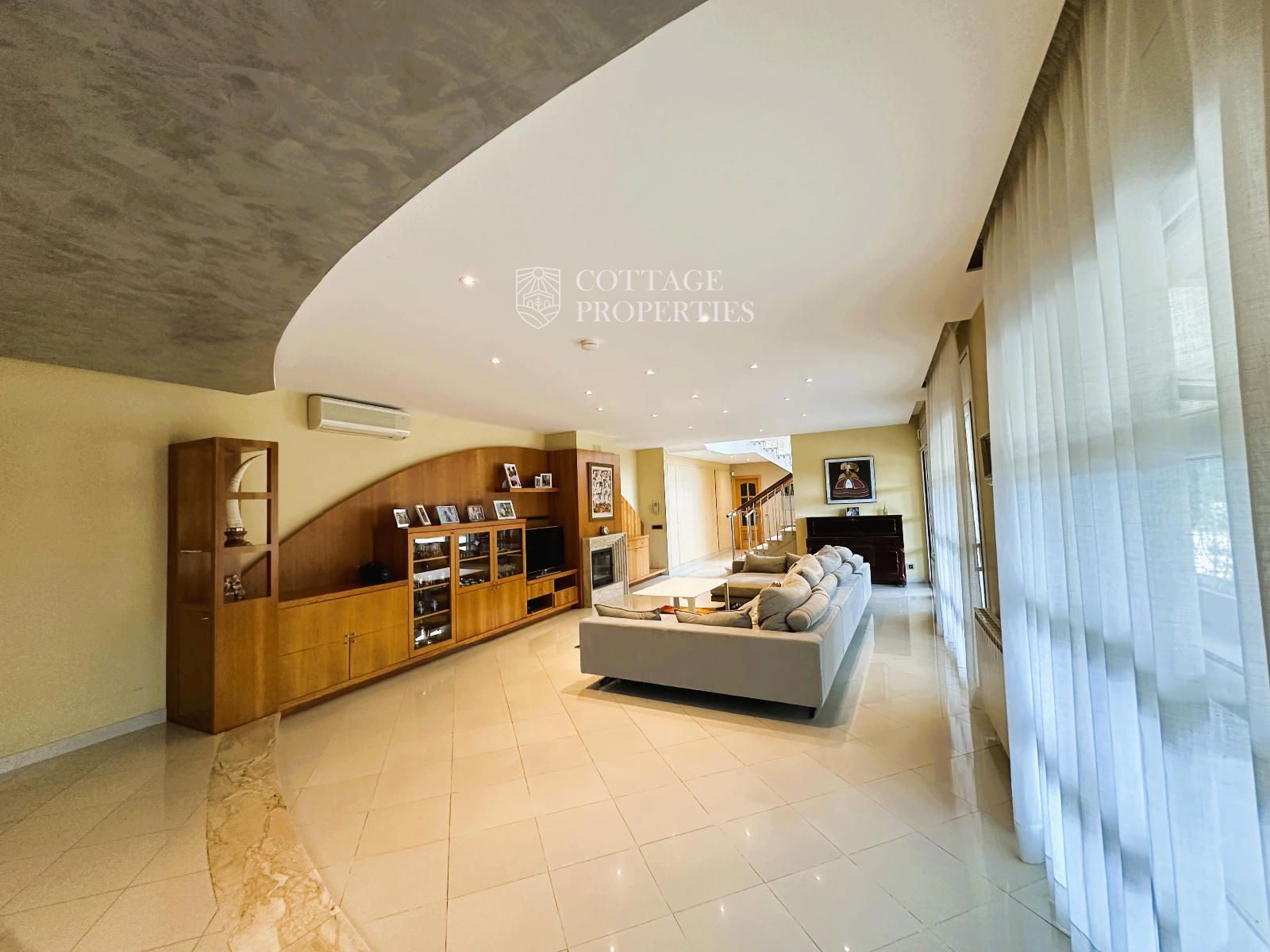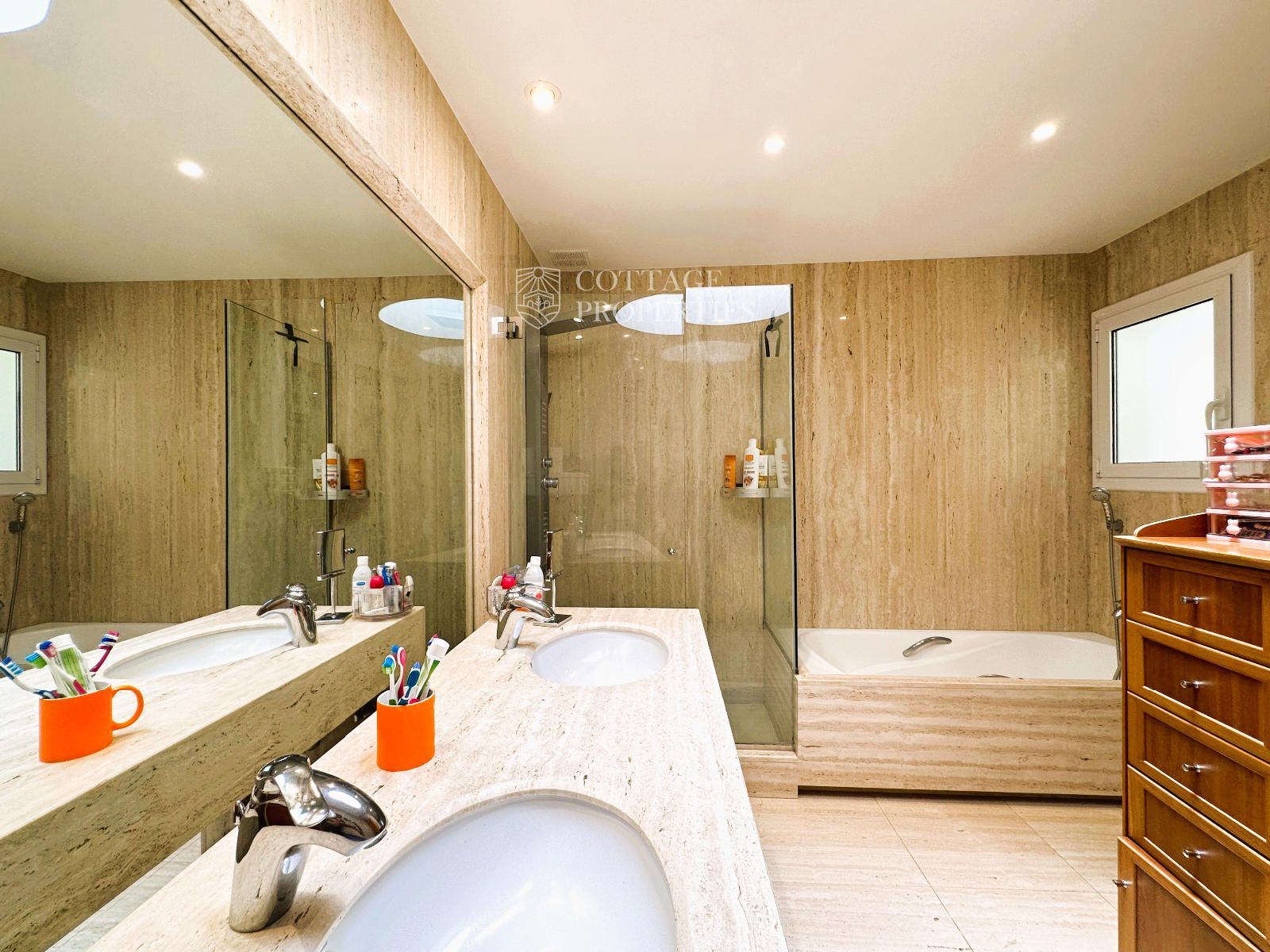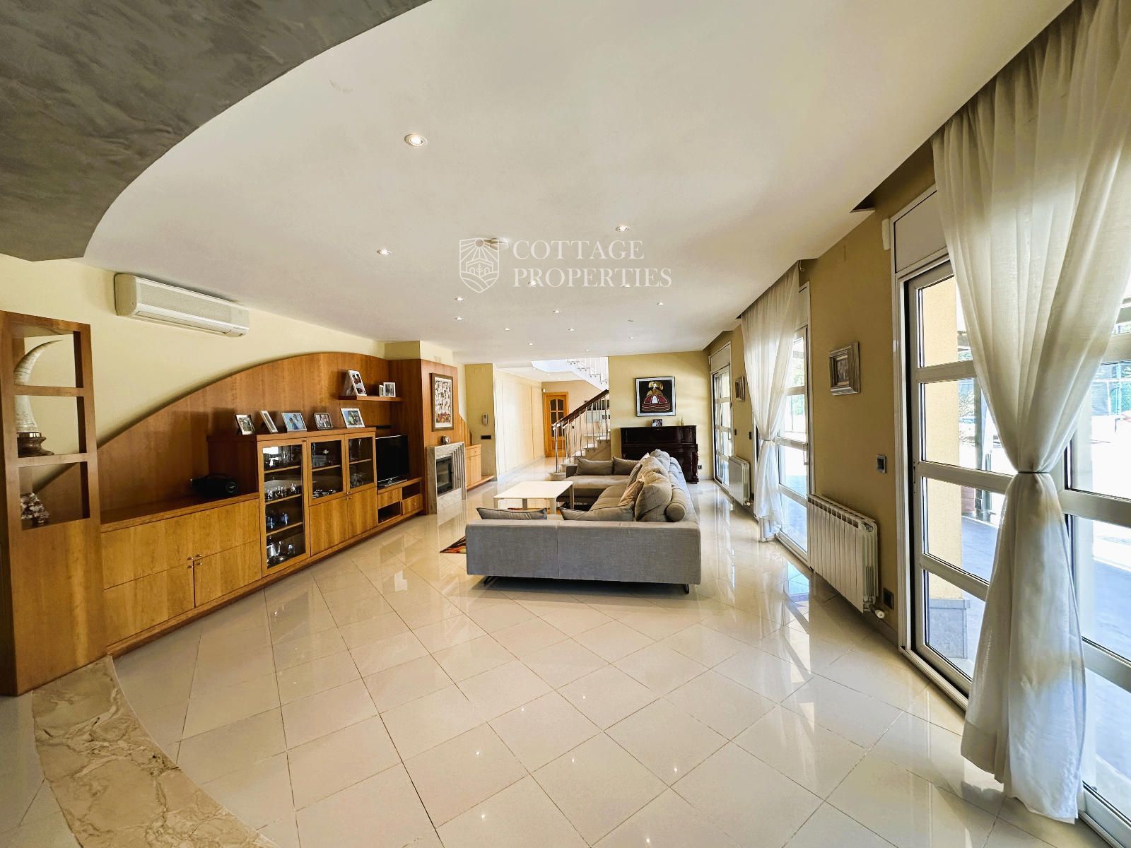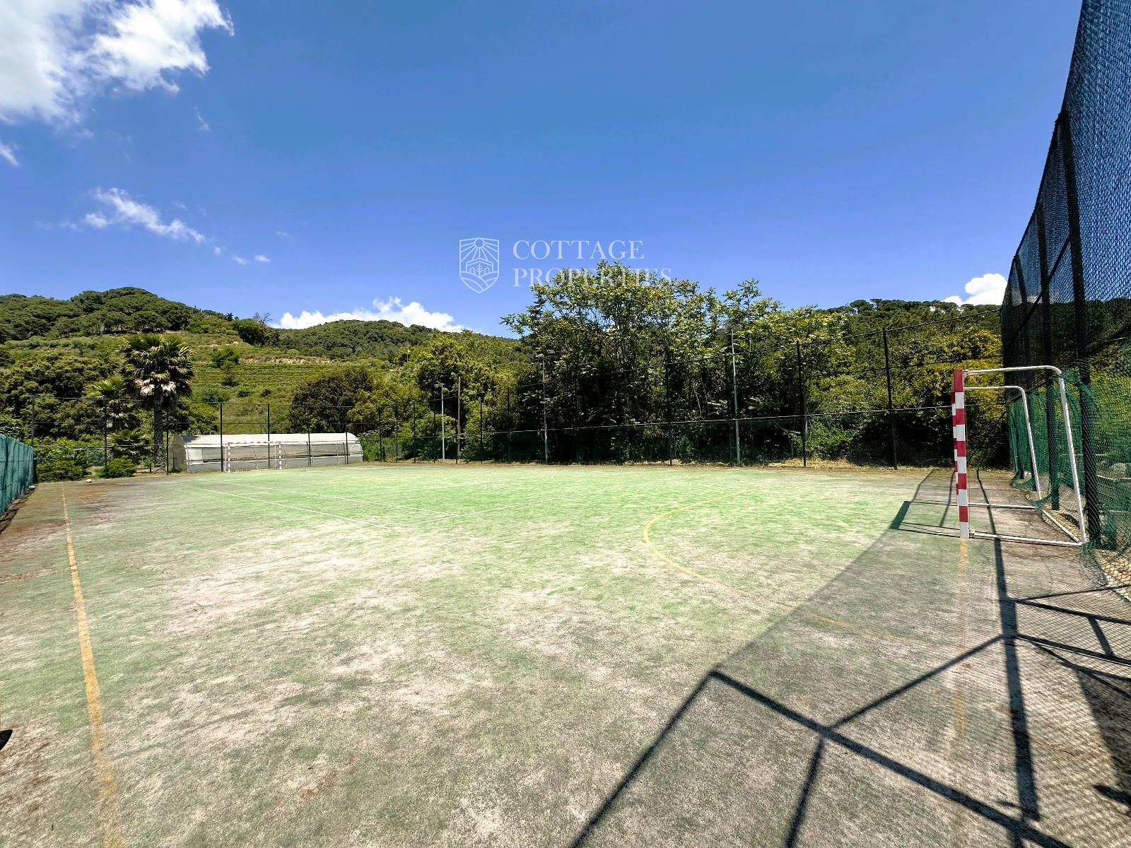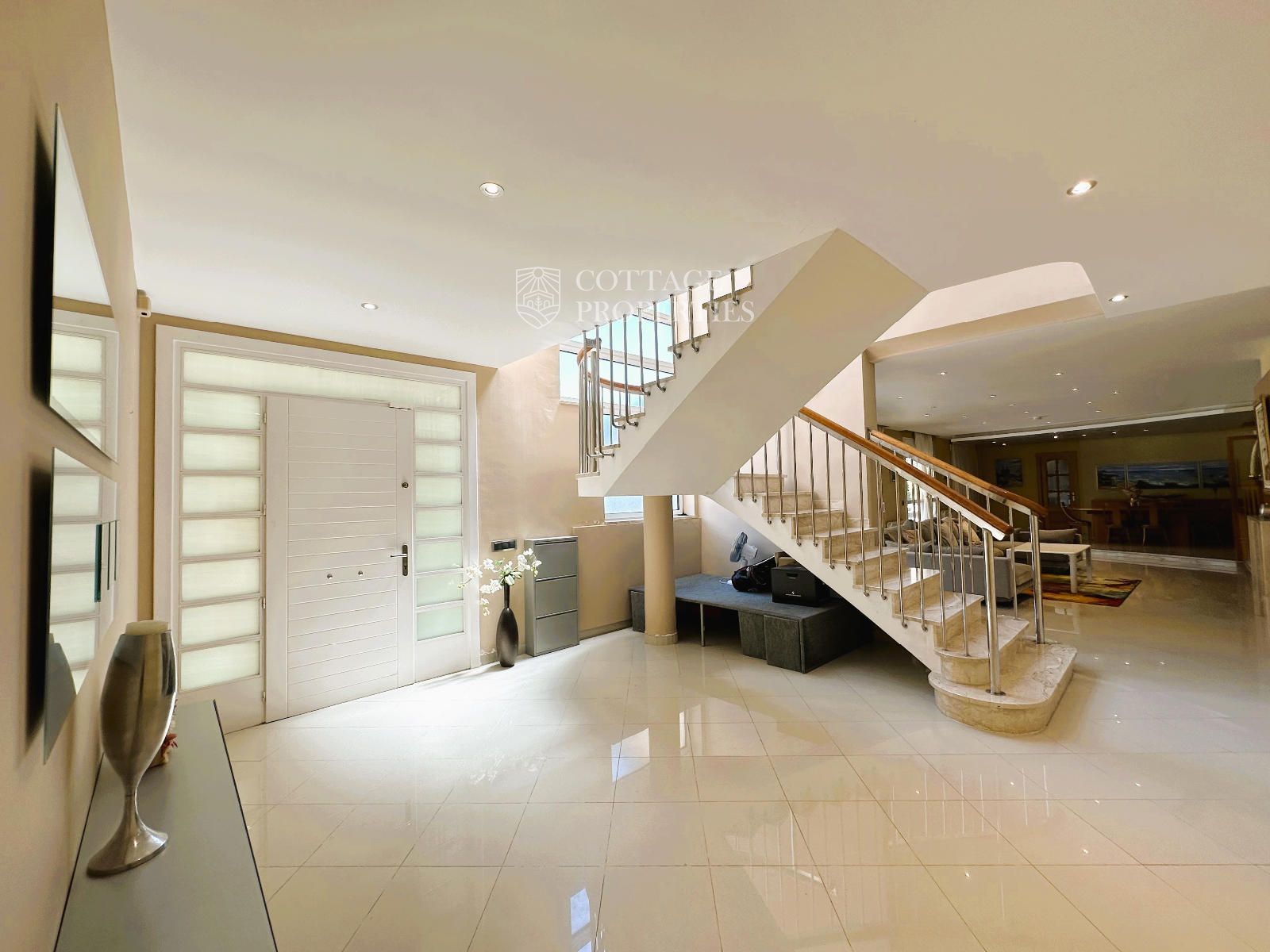 La seconde résidence, rénovée et en excellent état, offre un grand salon-salle à manger avec baies vitrées du sol au plafond et accès direct au jardin, une cuisine spacieuse et lumineuse, une bibliothèque, une salle de sport, une salle de bain supplémentaire et 4 chambres en suite, ainsi qu'une buanderie et un garage indépendant.