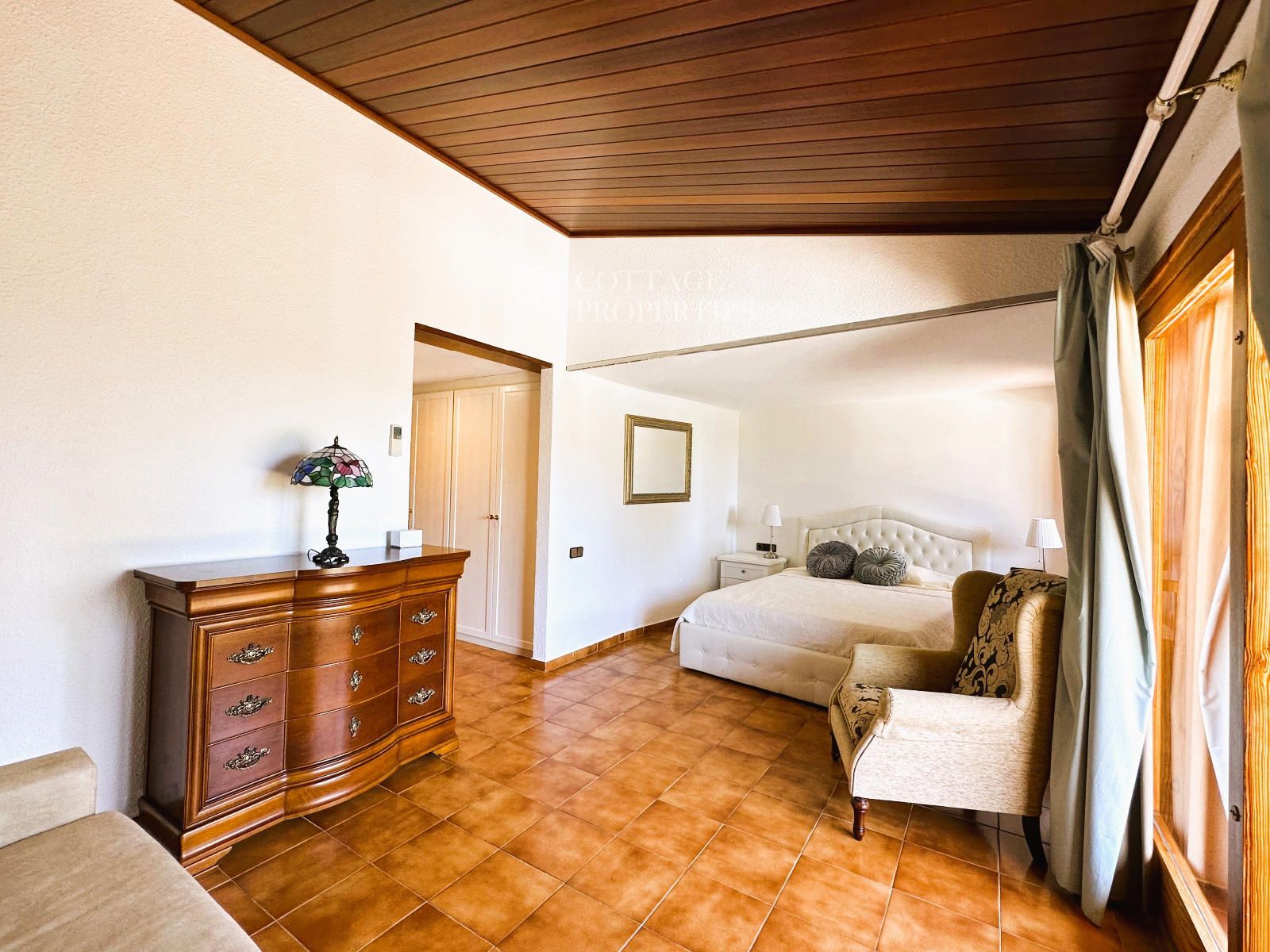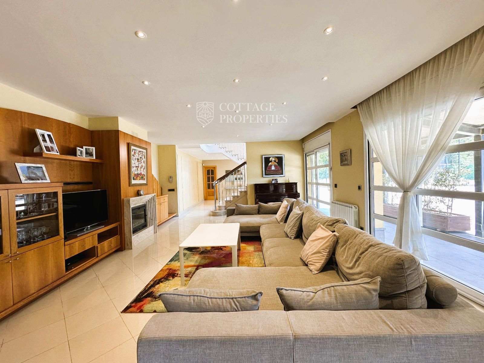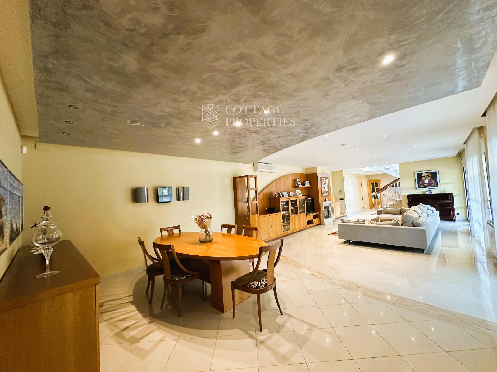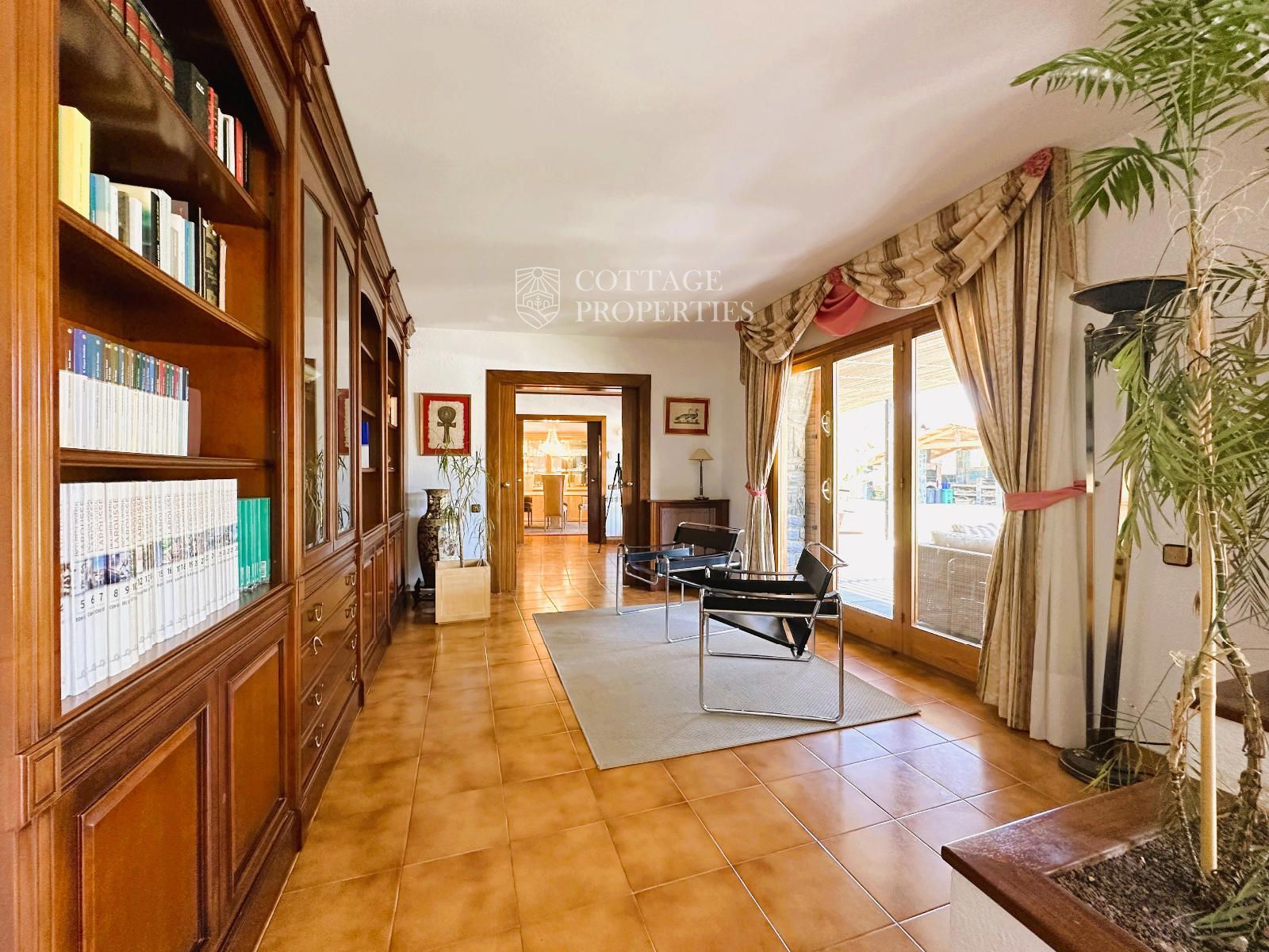La seconde résidence, rénovée et en excellent état, offre un grand salon-salle à manger avec baies vitrées du sol au plafond et accès direct au jardin, une cuisine spacieuse et lumineuse, une bibliothèque, une salle de sport, une salle de bain supplémentaire et 4 chambres en suite, ainsi qu'une buanderie et un garage indépendant.