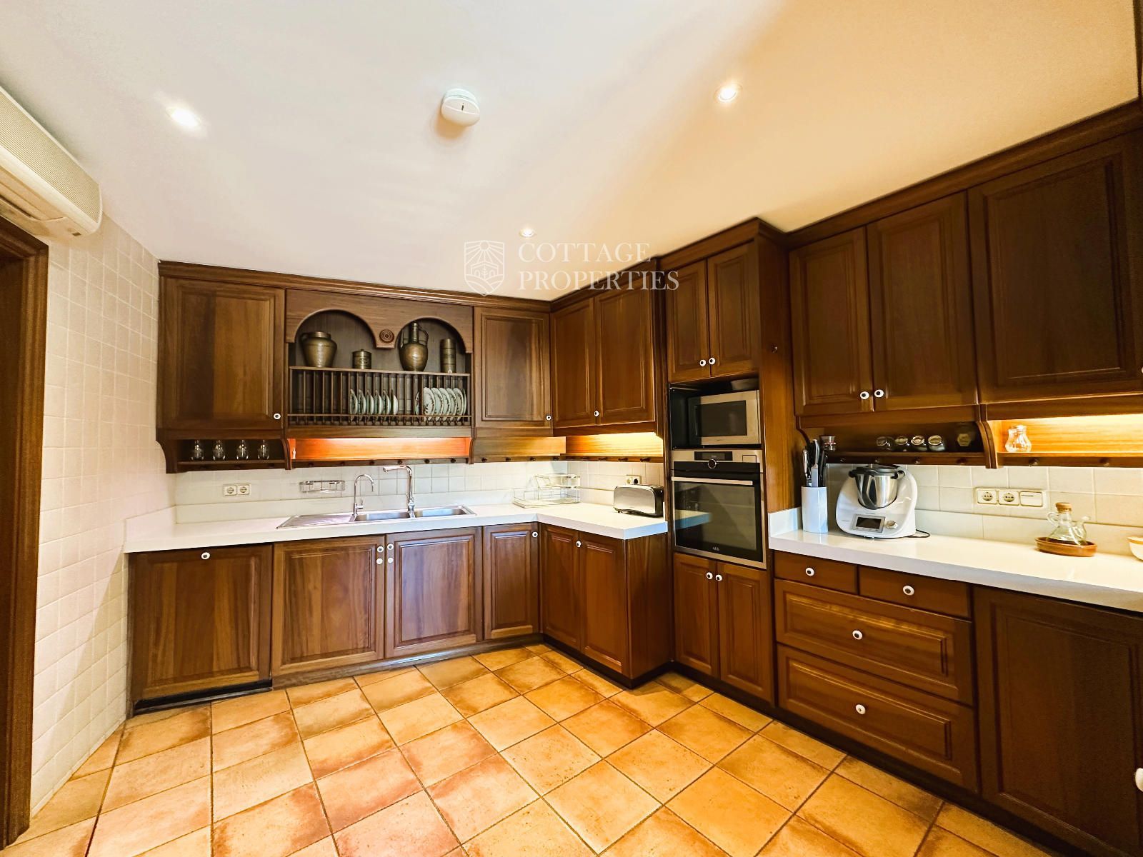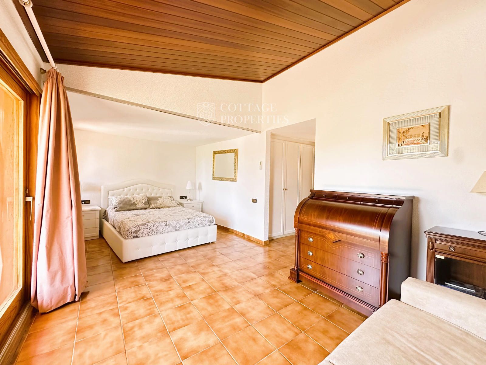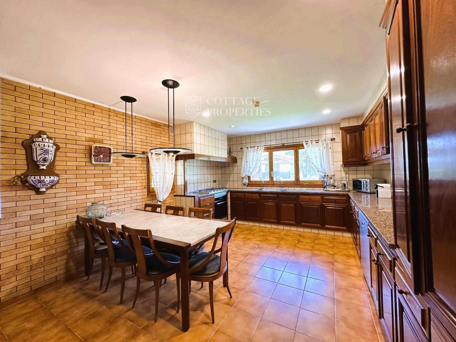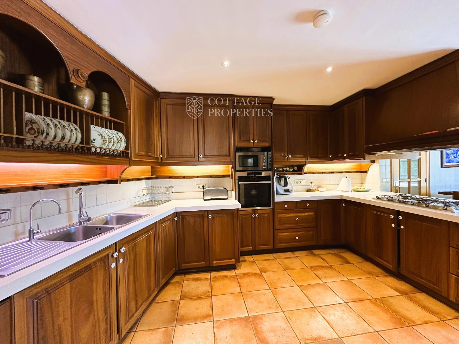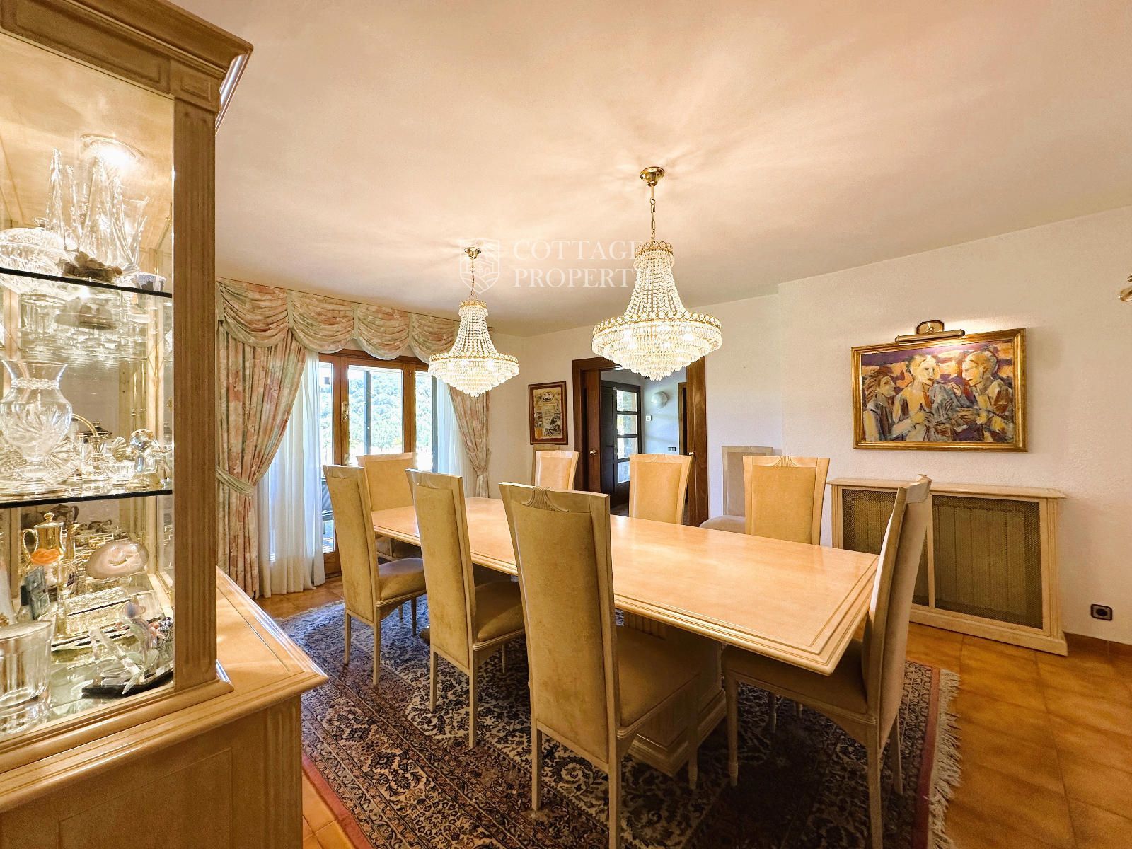 La seconde résidence, rénovée et en excellent état, offre un grand salon-salle à manger avec baies vitrées du sol au plafond et accès direct au jardin, une cuisine spacieuse et lumineuse, une bibliothèque, une salle de sport, une salle de bain supplémentaire et 4 chambres en suite, ainsi qu'une buanderie et un garage indépendant.